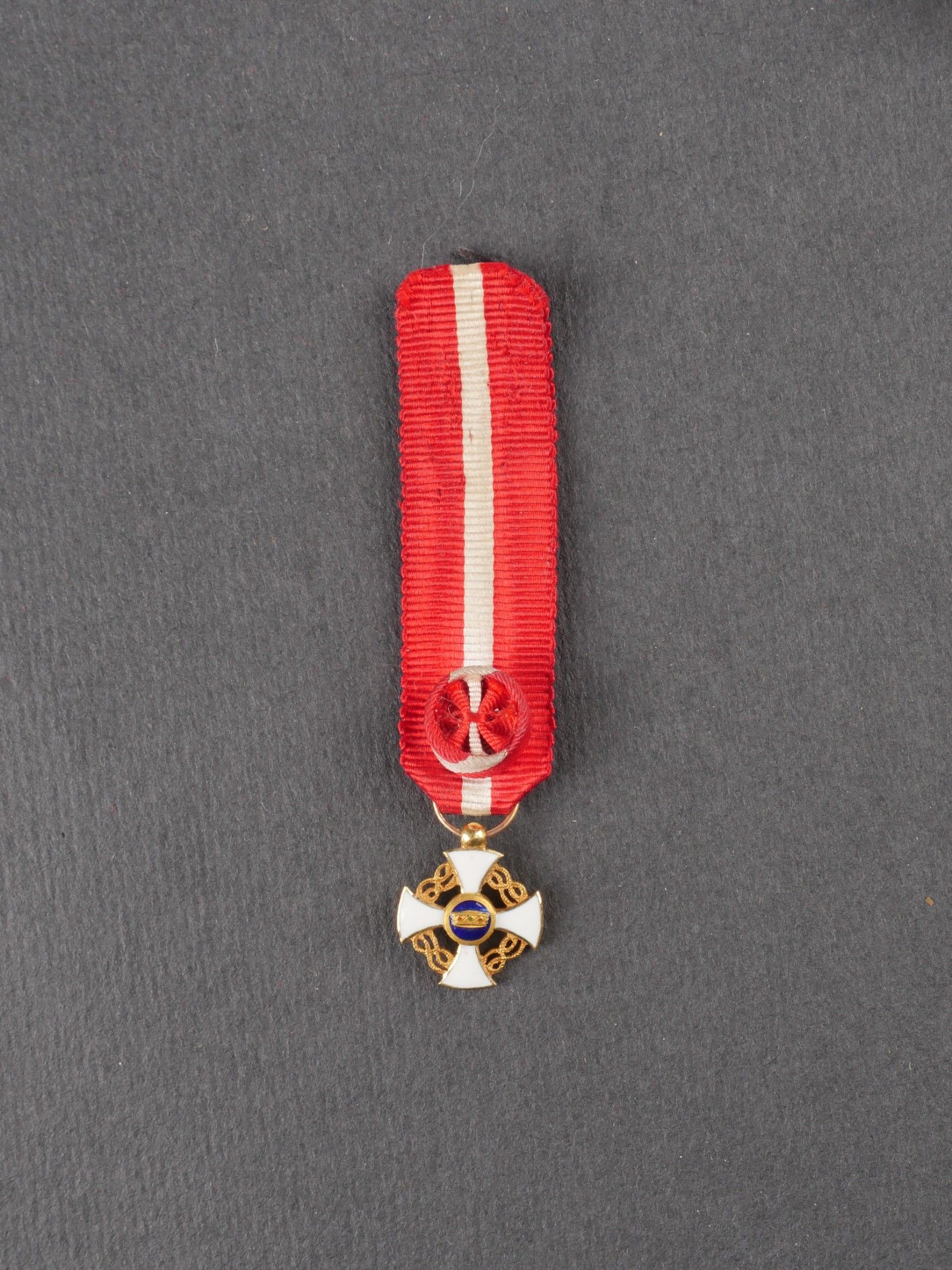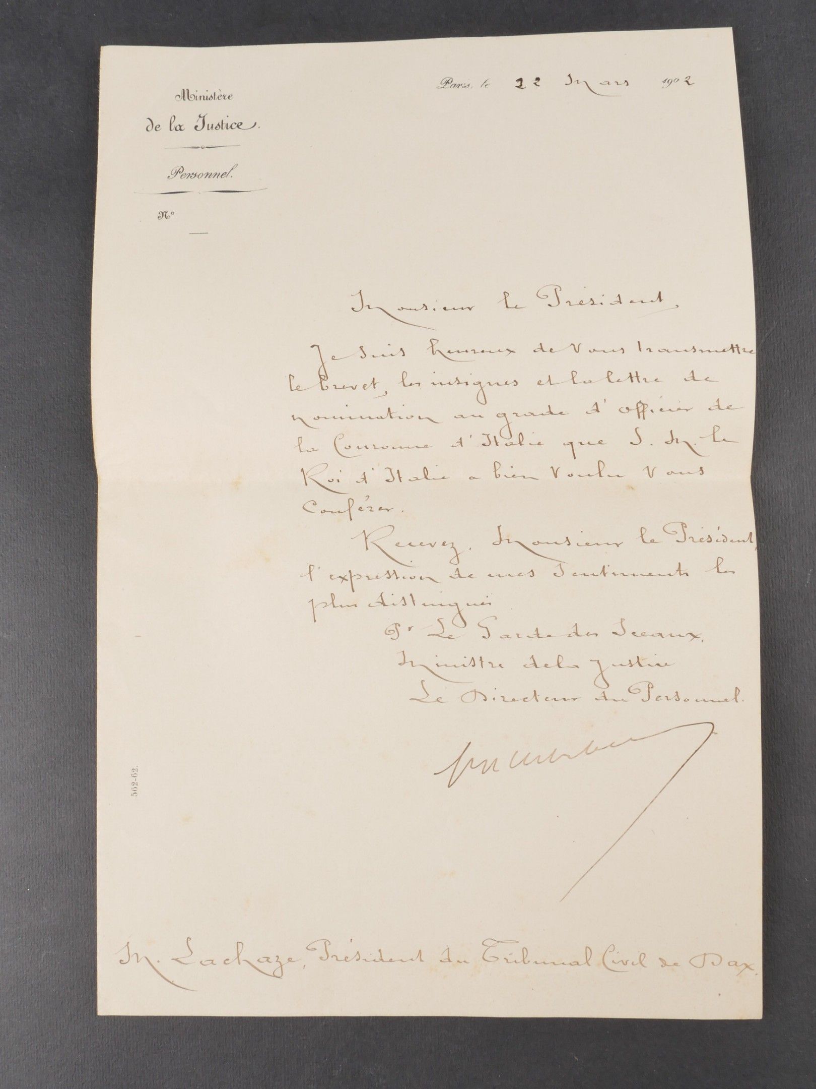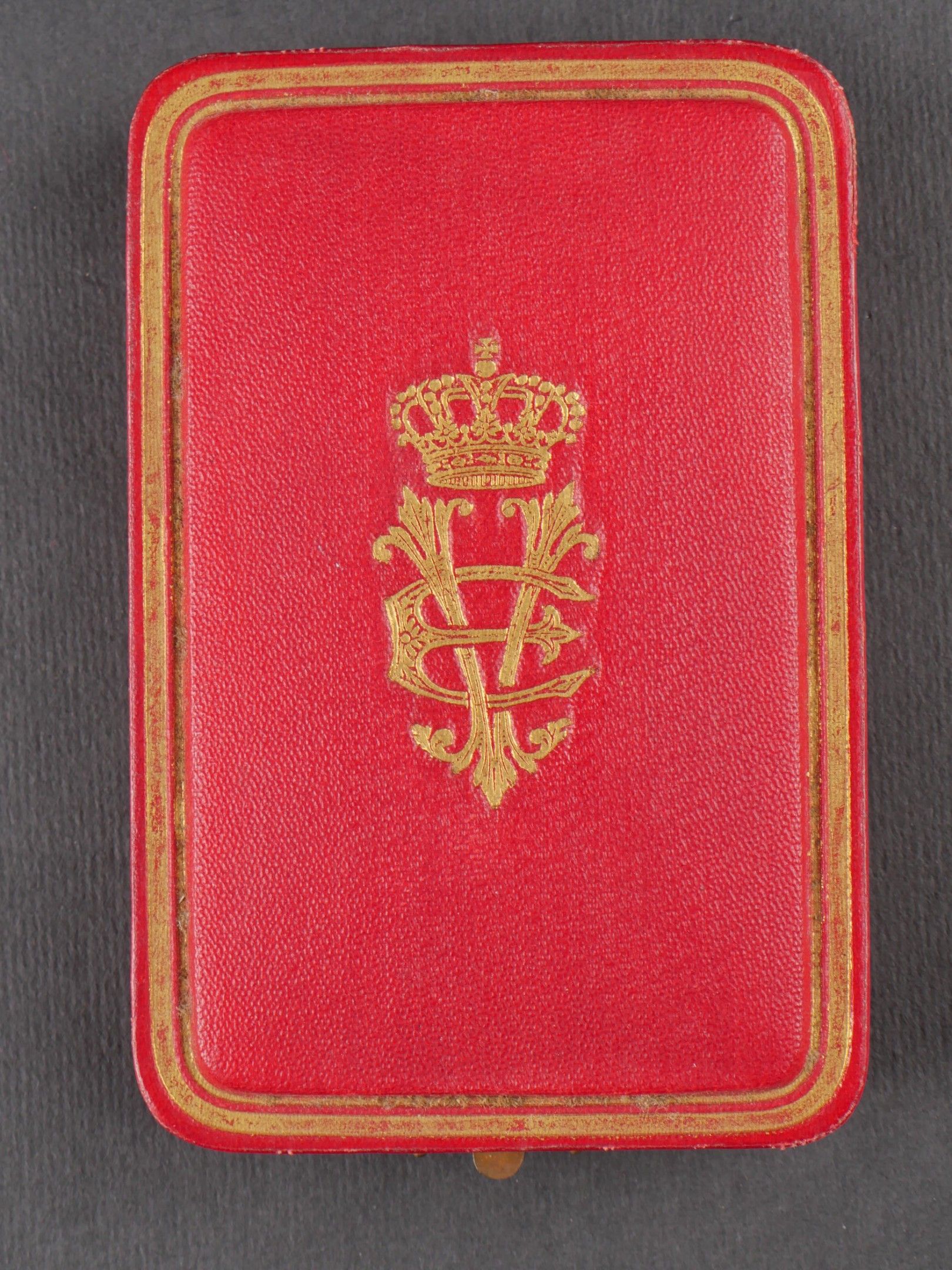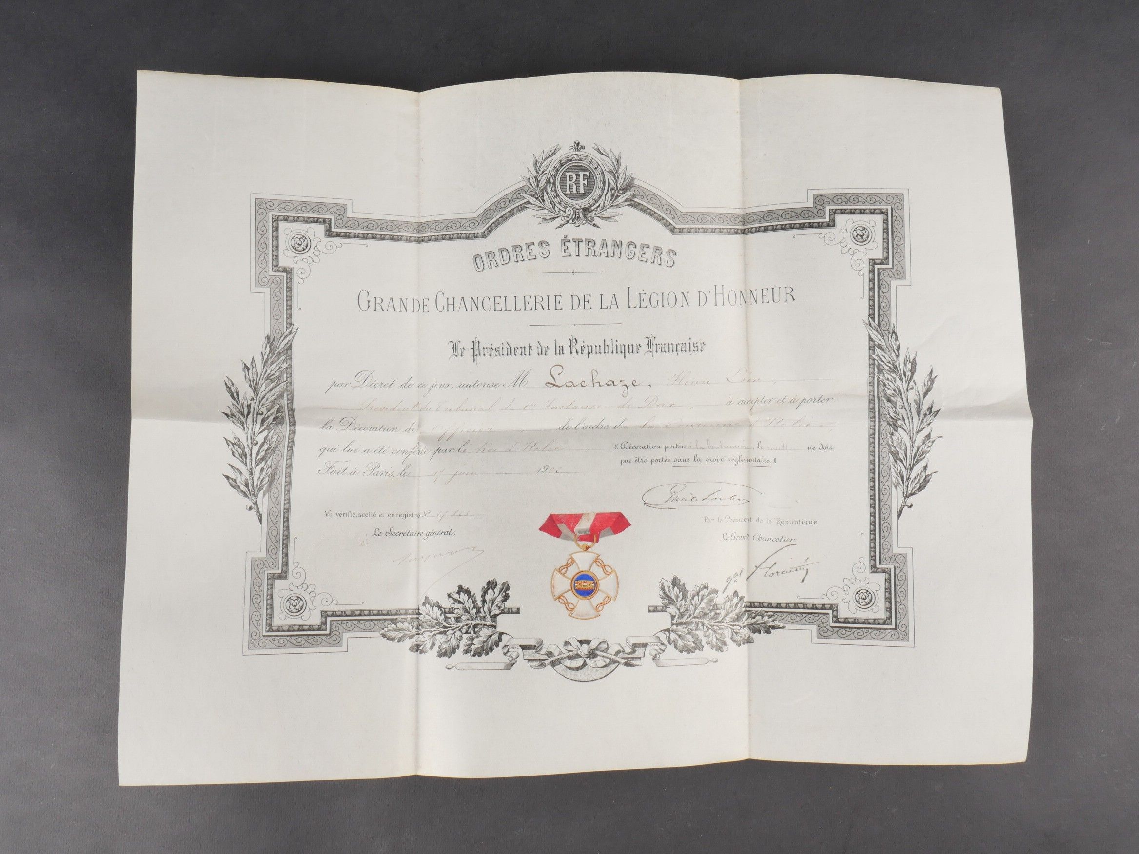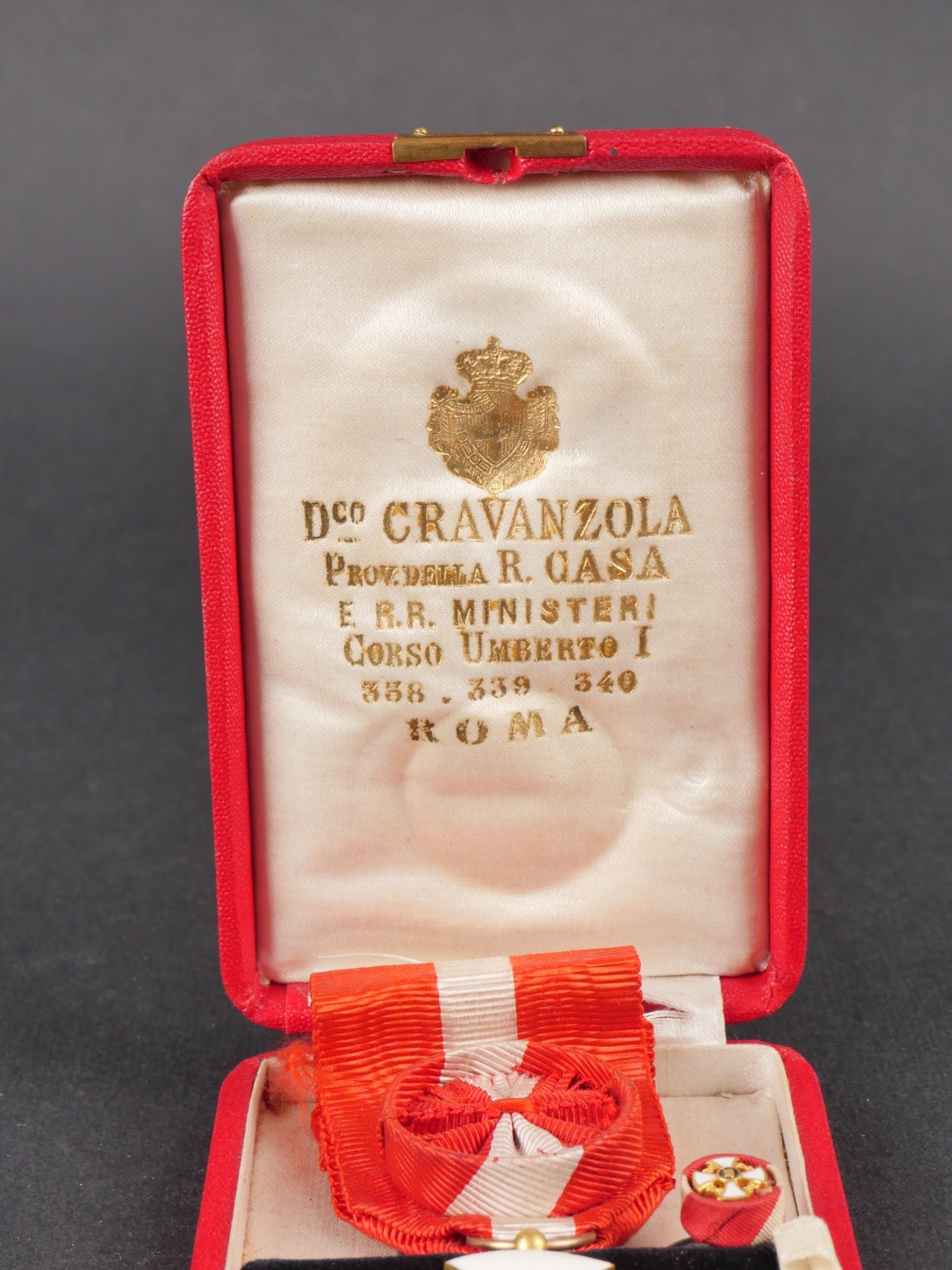 Officer's cross of the Crown of Italy with diplomas awarded to Léon Lachaze, French. The gold cross pattée is covered in white enamel. The arms of the cross are linked by four Savoy knot love lakes in braided gold wire. In the centre of the cross, on the obverse, is a gold medallion enamelled blue, featuring the crown of the King of the Lombards. The gold medallion on the reverse features a black-enamelled eagle with the enamelled Savoy cross in its mandorla, heraldic symbols taken from the great arms of the sovereigns of the House of Savoy. The ribbon is tierced with a white stripe between two red stripes, with a rosette. Miniature present. Beautiful complete box from the manufacturer DCO Cravanzola ROMA. Buttonhole and miniature of the same decoration also present. A handwritten letter from the Ministero degli affari esteri, dated 3 March 1902, awarding this decoration in the grade of officer to Enrico Leone Lachaze, President of the Civil Court of Dax. A handwritten letter from the Ministry of Justice, dated 1902, awarding him the insignia of the Crown of Italy. A parchment from the Grand Chancellery of the Legion of Honour authorising the wearing of this decoration. Some wear and patina. Condition II+. Officer's Cross of the Crown of Italy With accompanying diplomas awarded to Léon Lachaze, a French national. Rounded gilt cross pattée covered in white enamel. The arms of the cross are connected by four interlaced love knots Savoy knots in twisted gold wire. At the centre of the cross, on the obverse, a gilt and blue-enamel medallion depicting the crown of the Lombard kings, on the reverse, a gilt medallion showing a black-enamelled eagle bearing the Savoy cross, heraldic symbols of the House of Savoy. Ribbon composed of a white band between two red bands, with rosette. Miniature present. Fine, complete case by DCO Cravanzola, Rome. Buttonhole and miniature decorations of the same order also present. Includes a handwritten letter from the Ministero degli Affari Esteri dated March 3, 1902, granting the Officer grade to Enrico Leone Lachaze, President of the Civil Court of Dax, a handwritten letter from the Ministry of Justice 1902 transmitting the insignia, and a parchment from the Grand Chancellery of the Légion d'Honneur authorizing the wearing of the decoration. Some wear and patina noted. Condition II+.