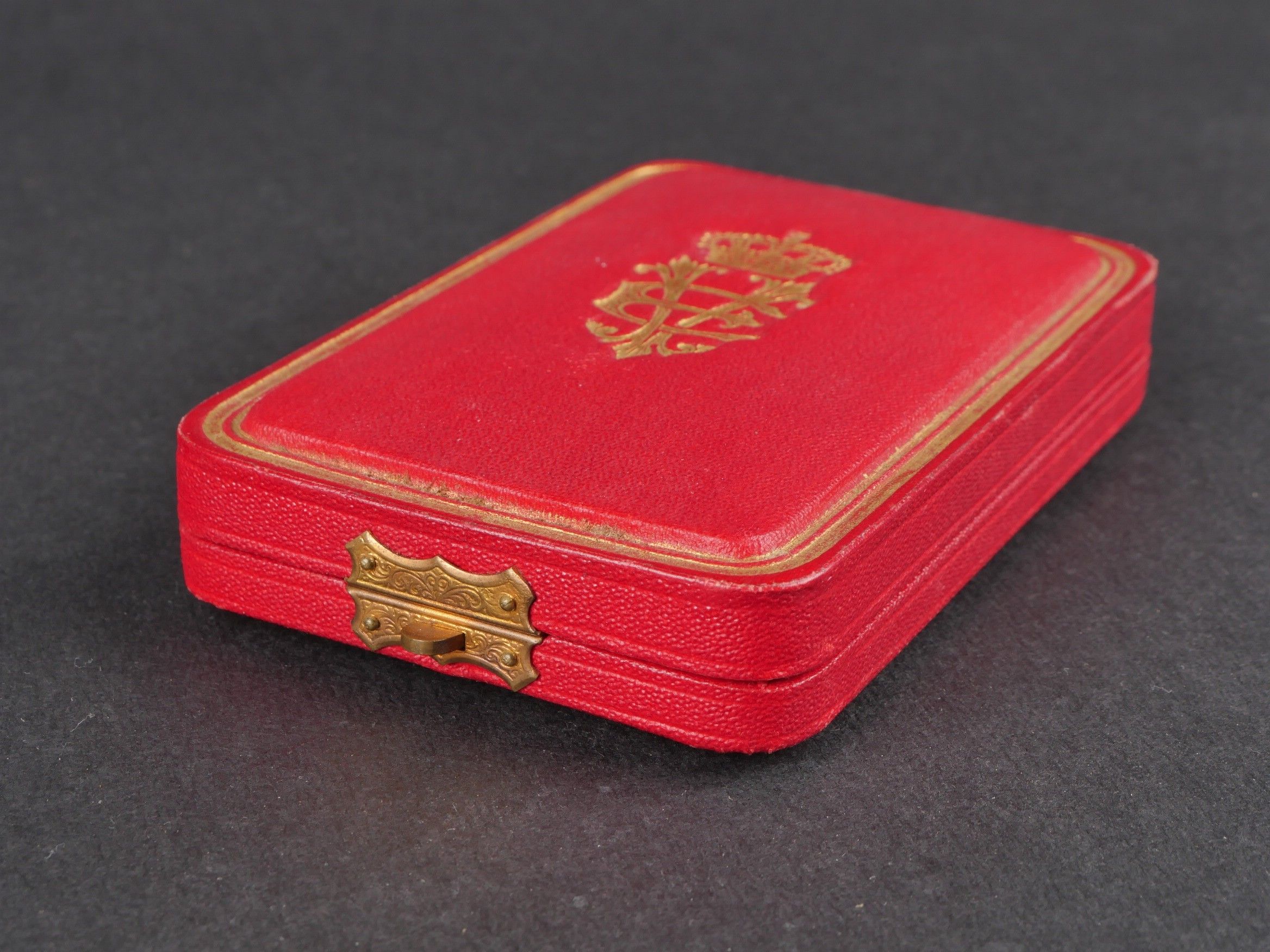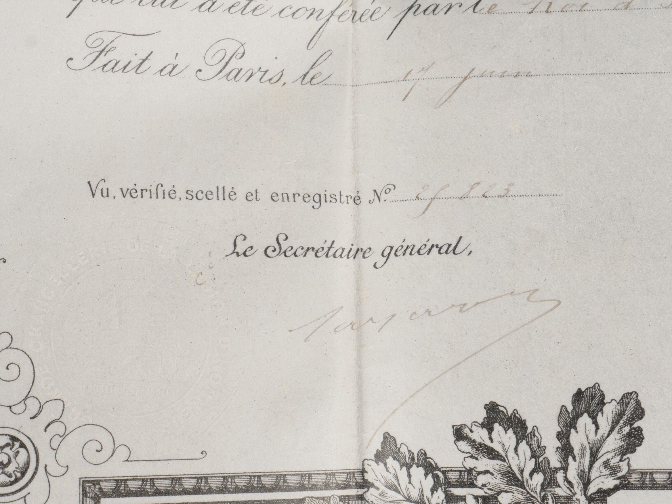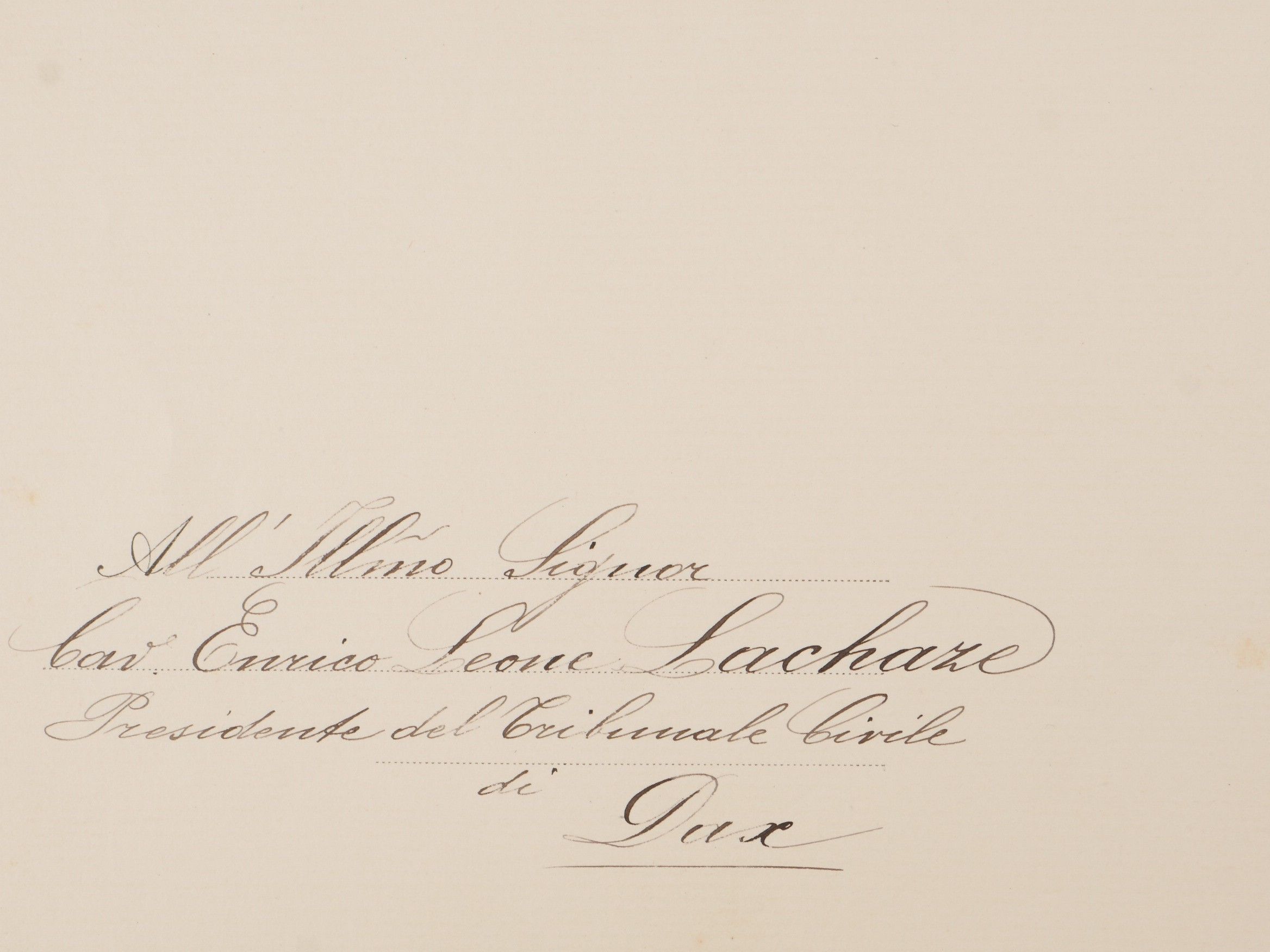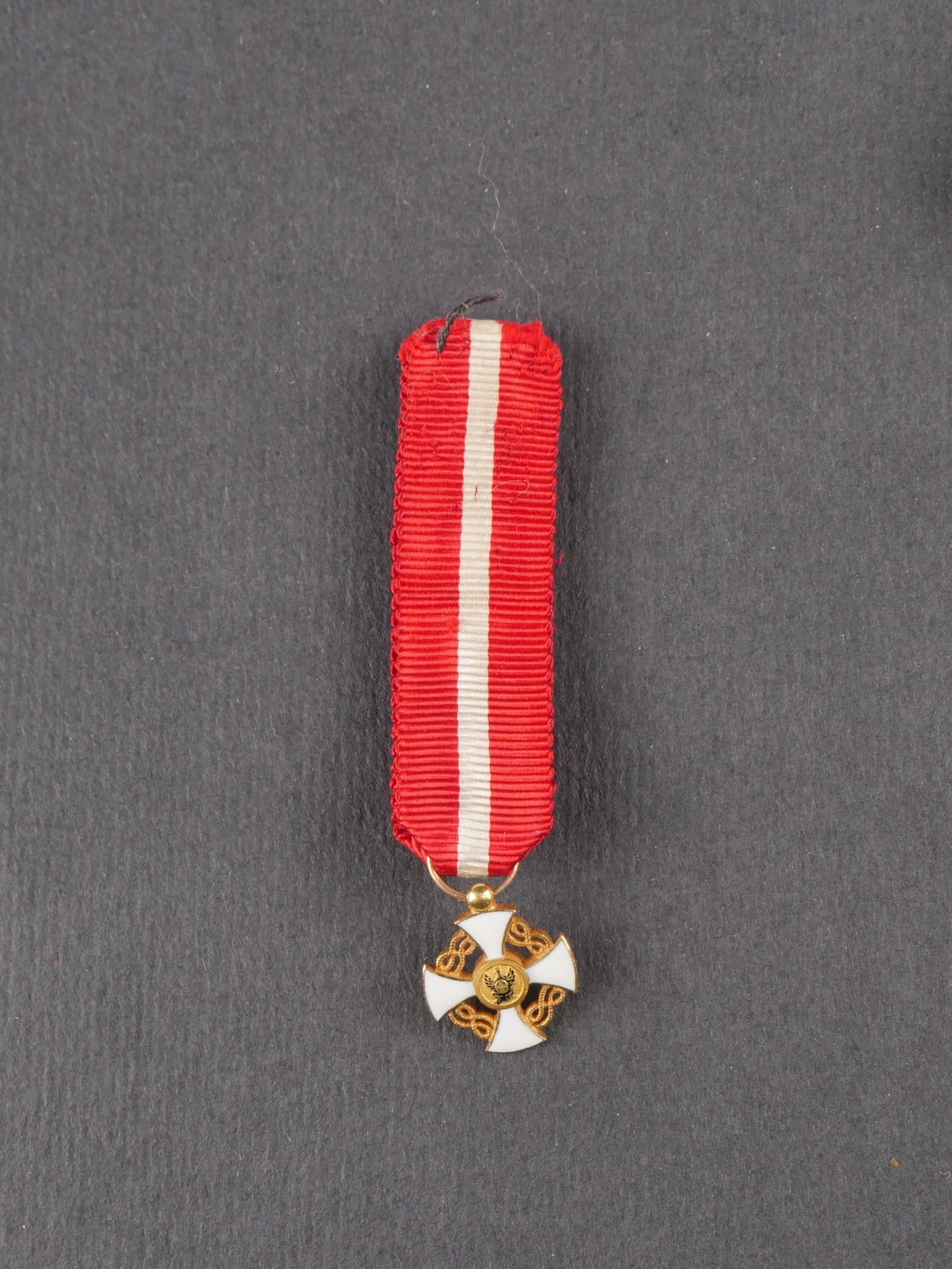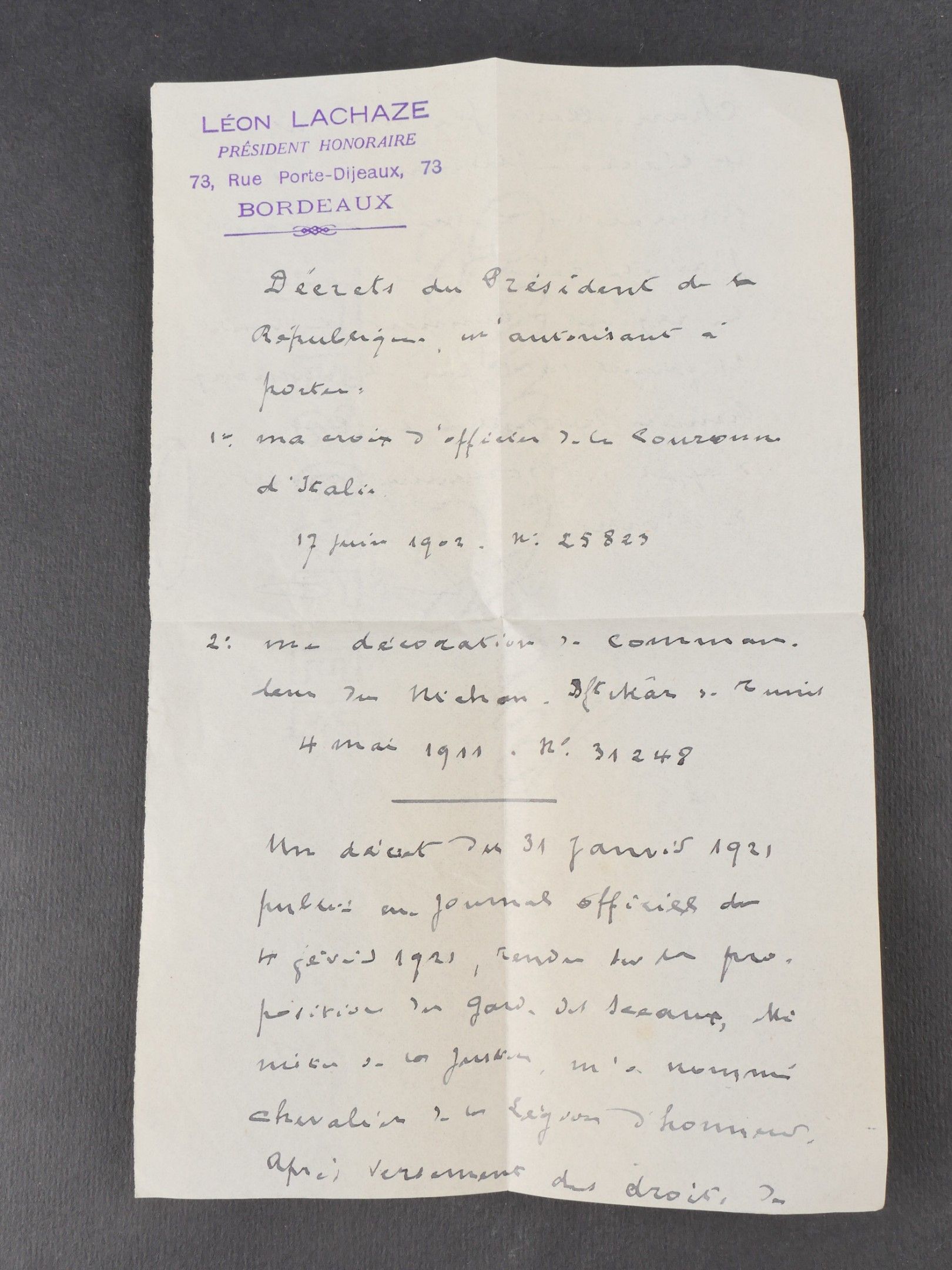 Officer's cross of the Crown of Italy with diplomas awarded to Léon Lachaze, French. The gold cross pattée is covered in white enamel. The arms of the cross are linked by four Savoy knot love lakes in braided gold wire. In the centre of the cross, on the obverse, is a gold medallion enamelled blue, featuring the crown of the King of the Lombards. The gold medallion on the reverse features a black-enamelled eagle with the enamelled Savoy cross in its mandorla, heraldic symbols taken from the great arms of the sovereigns of the House of Savoy. The ribbon is tierced with a white stripe between two red stripes, with a rosette. Miniature present. Beautiful complete box from the manufacturer DCO Cravanzola ROMA. Buttonhole and miniature of the same decoration also present. A handwritten letter from the Ministero degli affari esteri, dated 3 March 1902, awarding this decoration in the grade of officer to Enrico Leone Lachaze, President of the Civil Court of Dax. A handwritten letter from the Ministry of Justice, dated 1902, awarding him the insignia of the Crown of Italy. A parchment from the Grand Chancellery of the Legion of Honour authorising the wearing of this decoration. Some wear and patina. Condition II+. Officer's Cross of the Crown of Italy With accompanying diplomas awarded to Léon Lachaze, a French national. Rounded gilt cross pattée covered in white enamel. The arms of the cross are connected by four interlaced love knots Savoy knots in twisted gold wire. At the centre of the cross, on the obverse, a gilt and blue-enamel medallion depicting the crown of the Lombard kings, on the reverse, a gilt medallion showing a black-enamelled eagle bearing the Savoy cross, heraldic symbols of the House of Savoy. Ribbon composed of a white band between two red bands, with rosette. Miniature present. Fine, complete case by DCO Cravanzola, Rome. Buttonhole and miniature decorations of the same order also present. Includes a handwritten letter from the Ministero degli Affari Esteri dated March 3, 1902, granting the Officer grade to Enrico Leone Lachaze, President of the Civil Court of Dax, a handwritten letter from the Ministry of Justice 1902 transmitting the insignia, and a parchment from the Grand Chancellery of the Légion d'Honneur authorizing the wearing of the decoration. Some wear and patina noted. Condition II+.