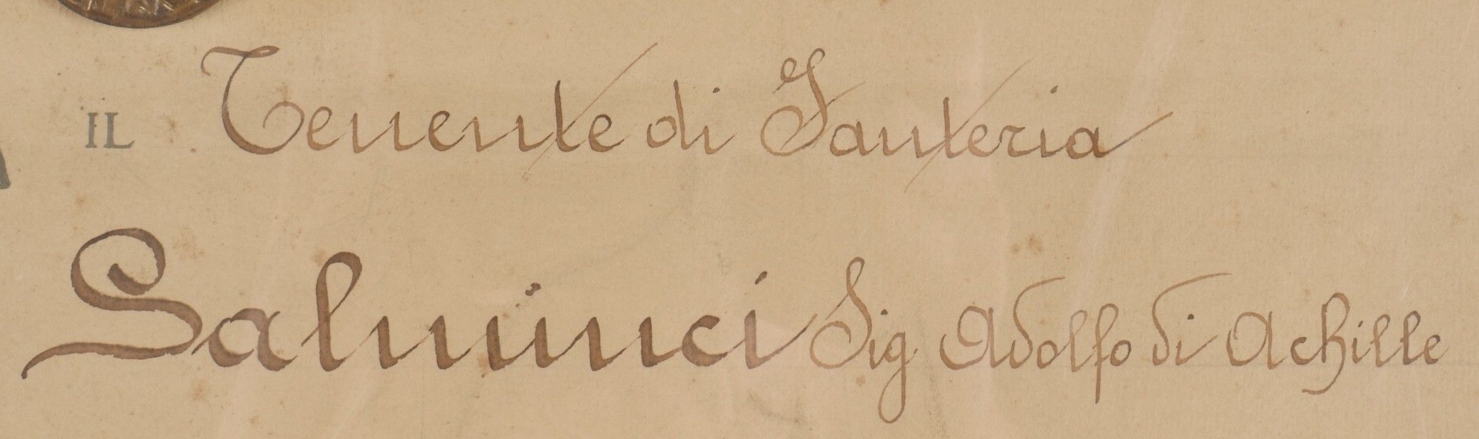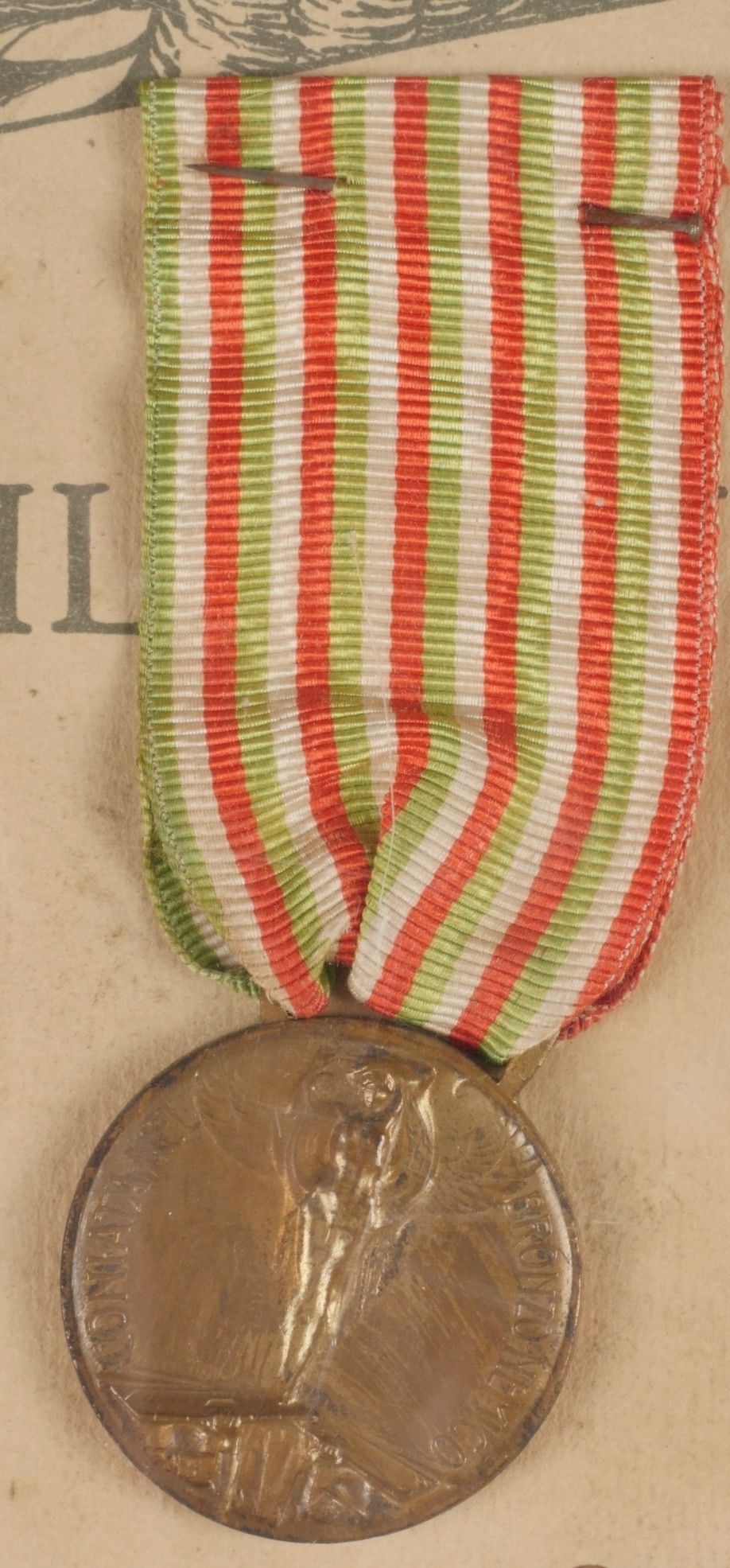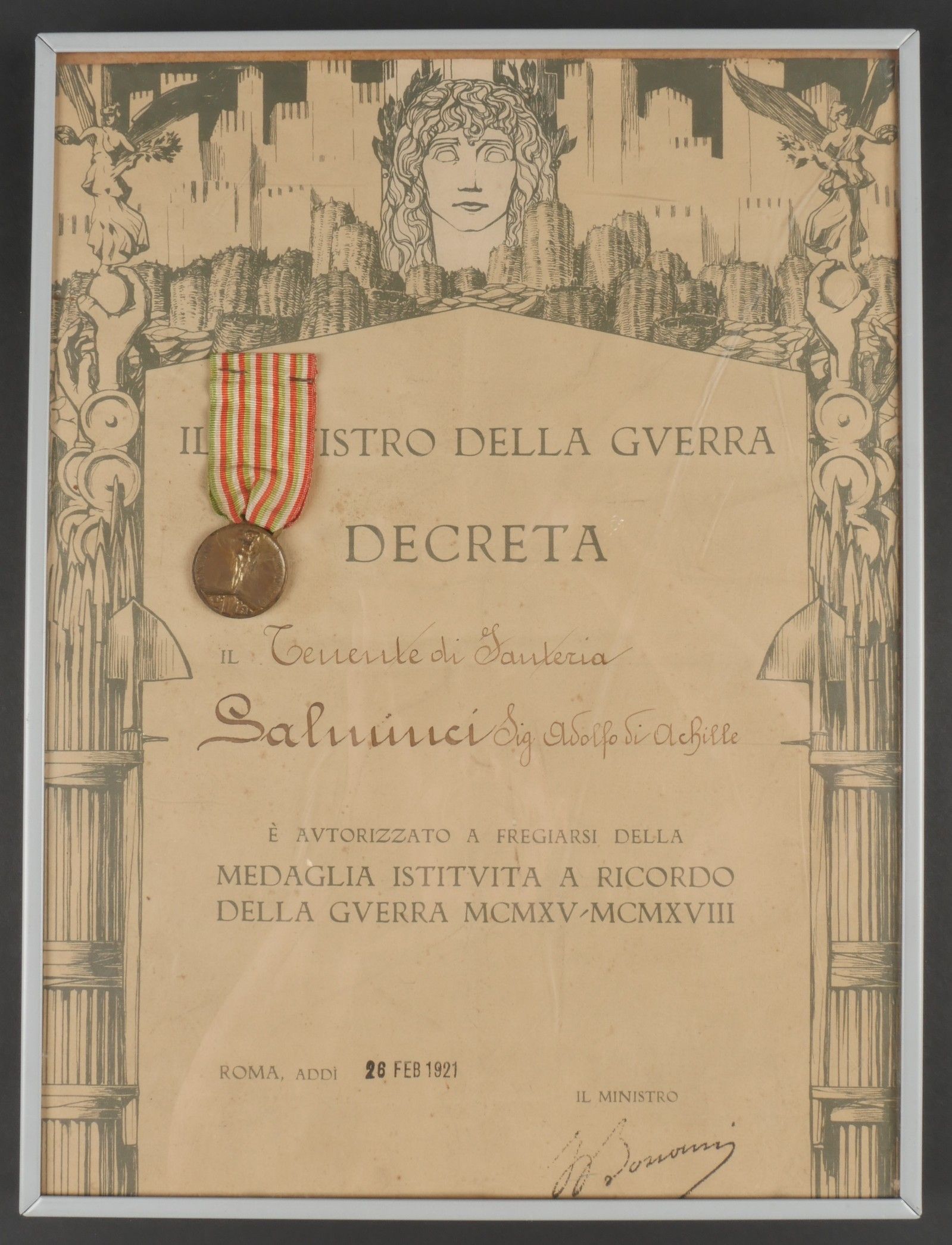 Diploma and medal commemorating the Great War. Paper diploma awarded to Sig Adolfi Di Achille. 28 February 1921. Medal stapled on the diploma with its ribbon. In a modern frame. Size 30 x 40 cm. Some wear and patina. Condition II+. Diploma and Commemorative Medal of the Great War Paper diploma awarded to Sig. Adolfi Di Achille, dated February 28, 1921. Medal affixed to the diploma with its ribbon. Mounted in a modern frame measuring 30 × 40 cm. Some wear and patina noted. Condition II+.