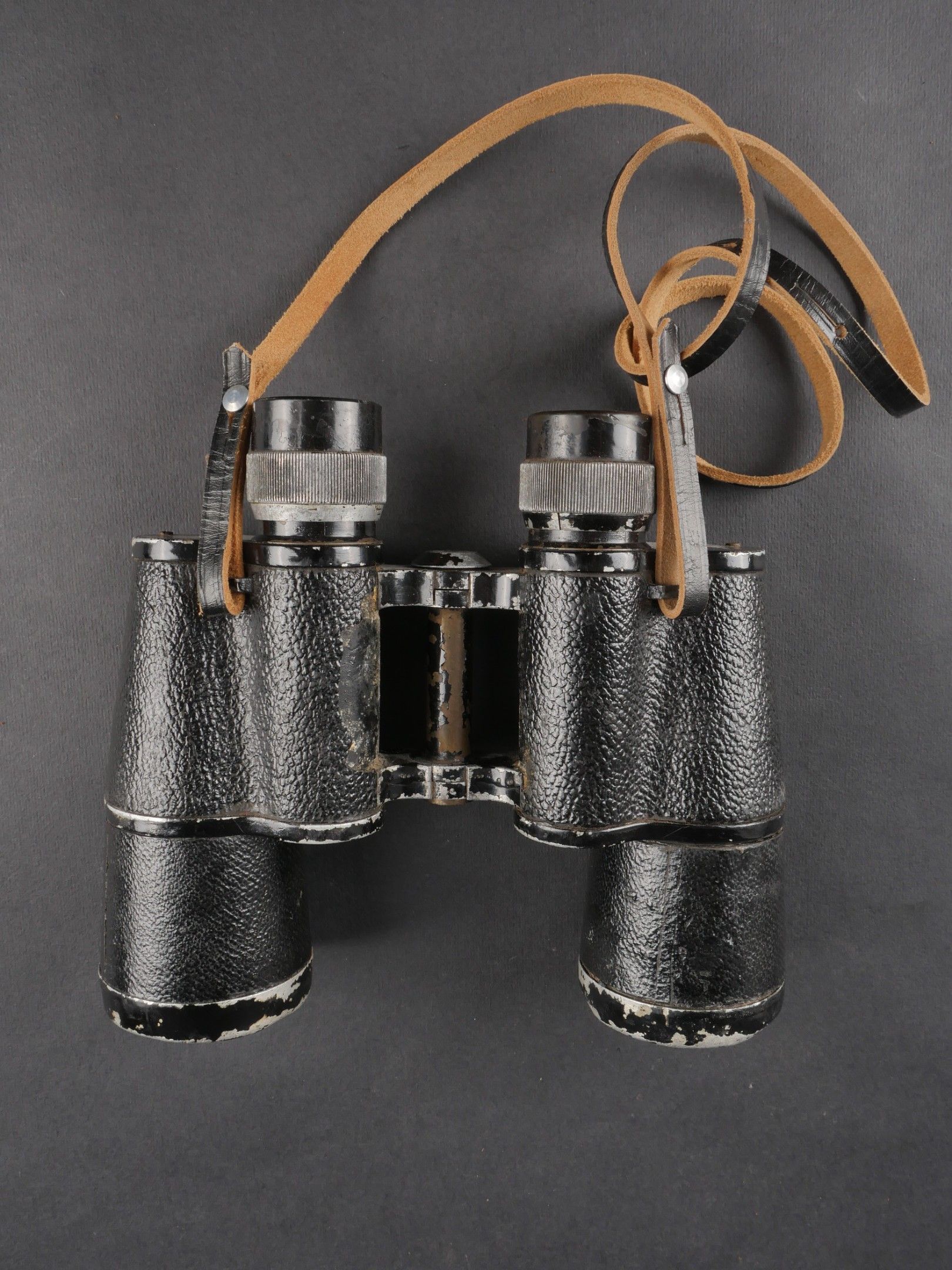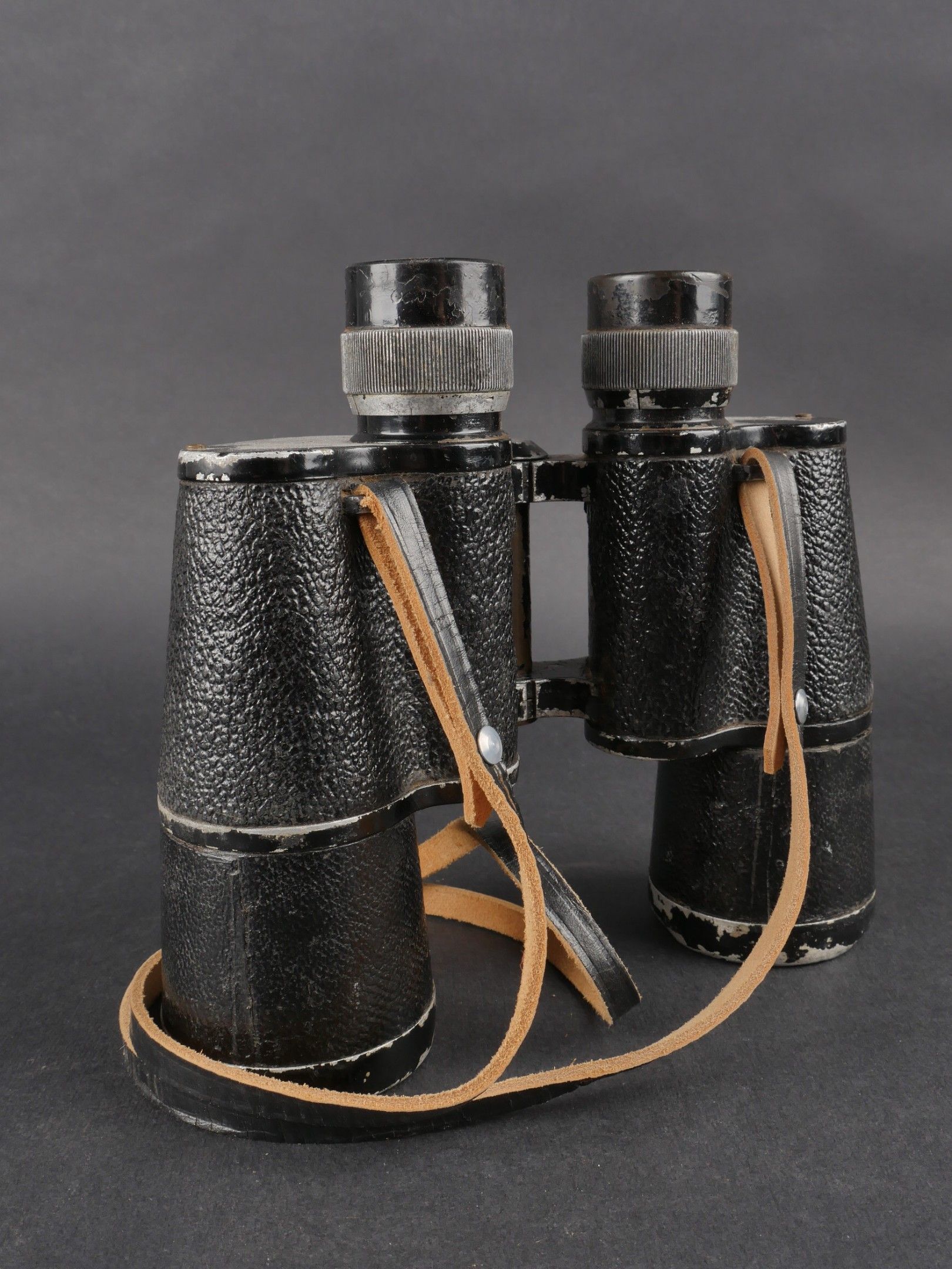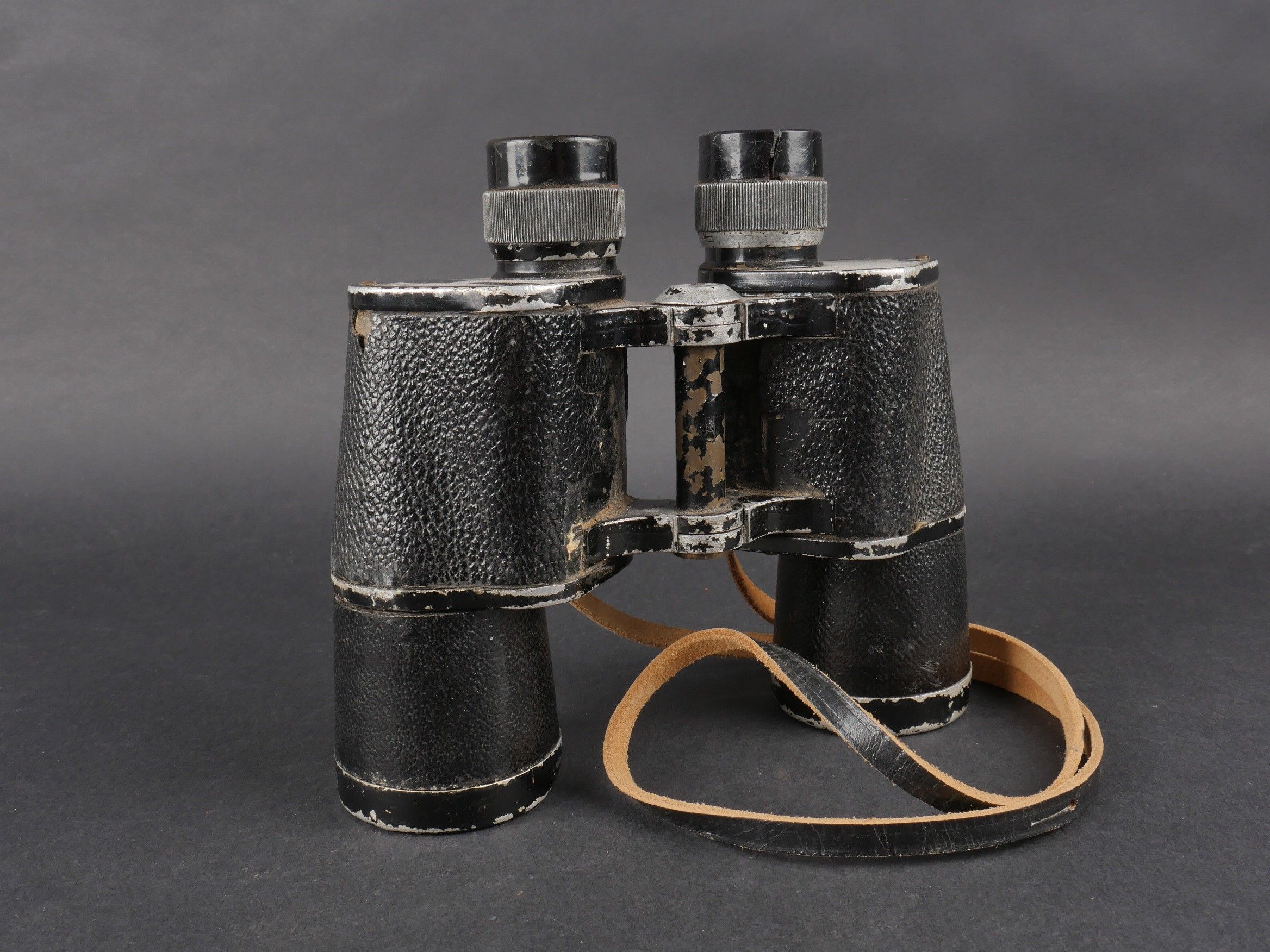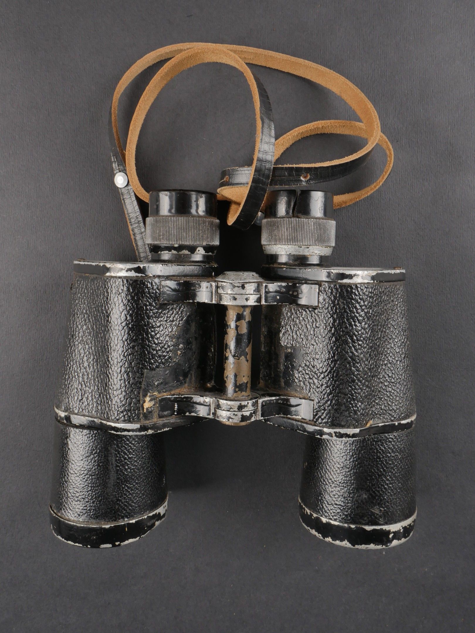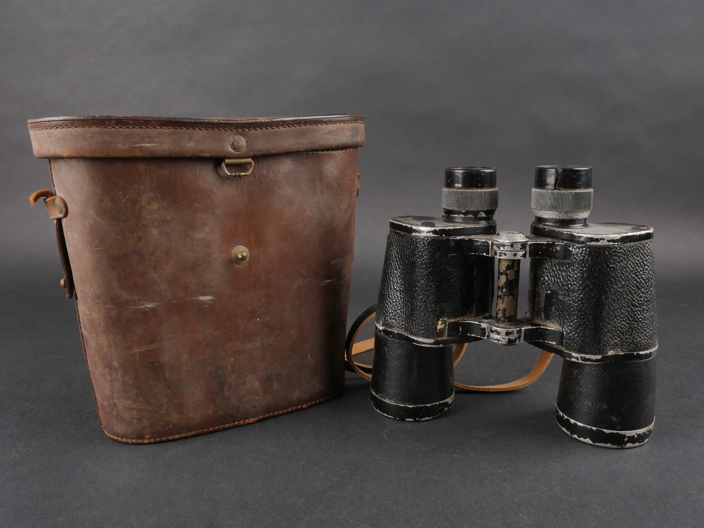 Regia Marine binoculars. Brown leather case. Carrying and closing straps are missing. Coating in very poor condition. Markings are illegible. Later leather carrying strap. Clear optics with a few stains. Some wear and patina. Condition II+. Regia Marina Binoculars Brown leather case. Carrying and closure straps missing. Outer covering in poor condition. Markings illegible. Later replacement leather carrying strap. Clear optics with some stains. Some wear and patina noted. Condition II+.