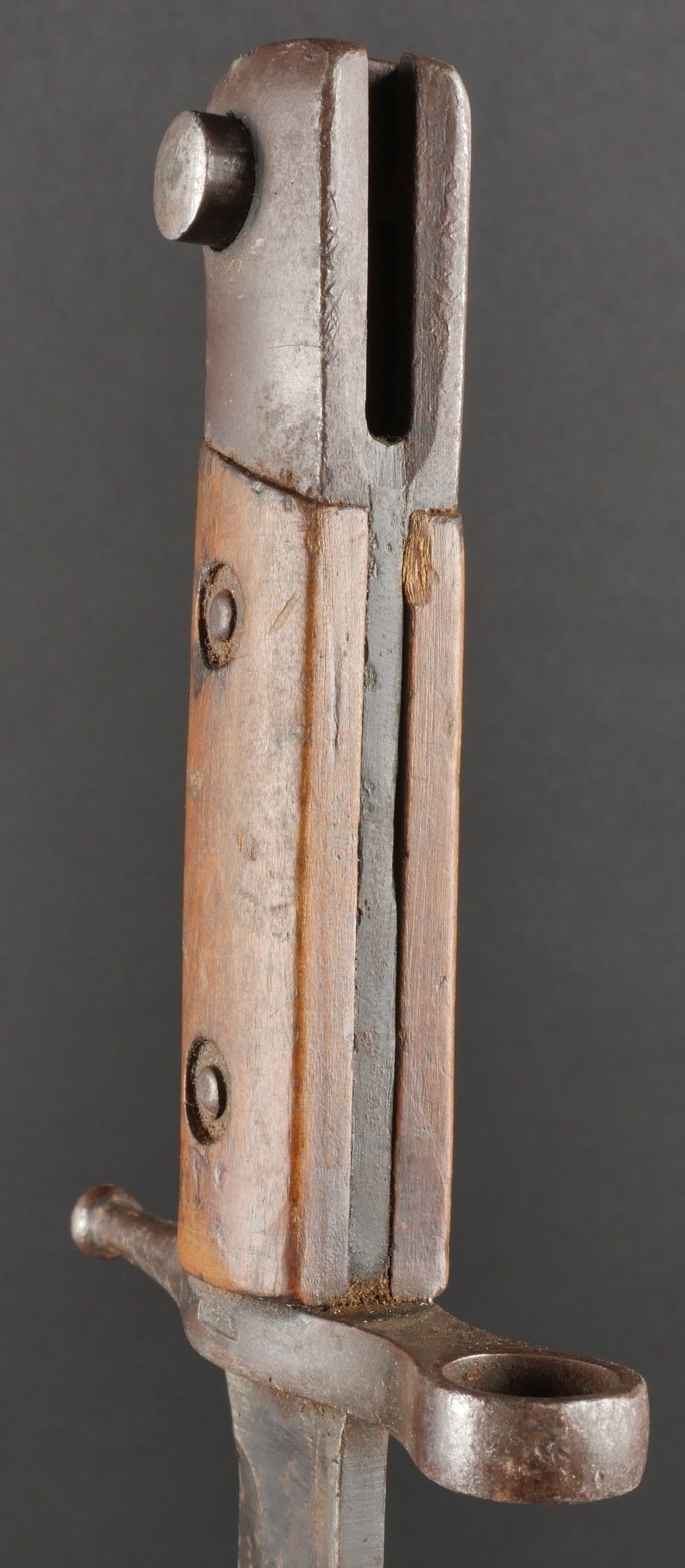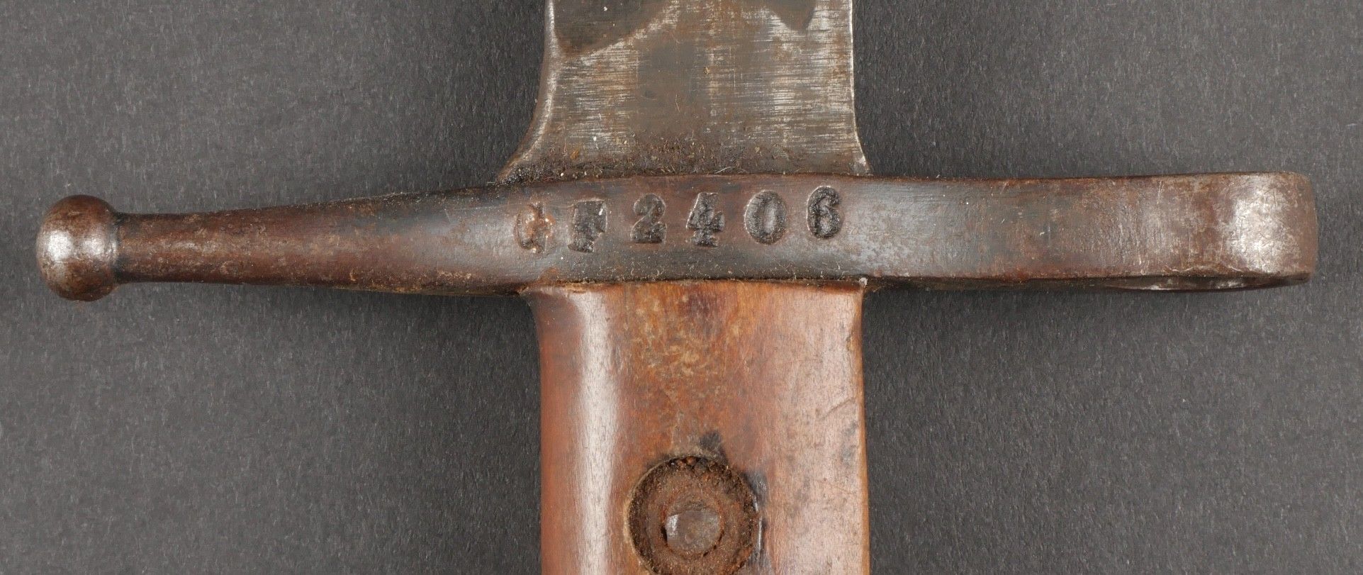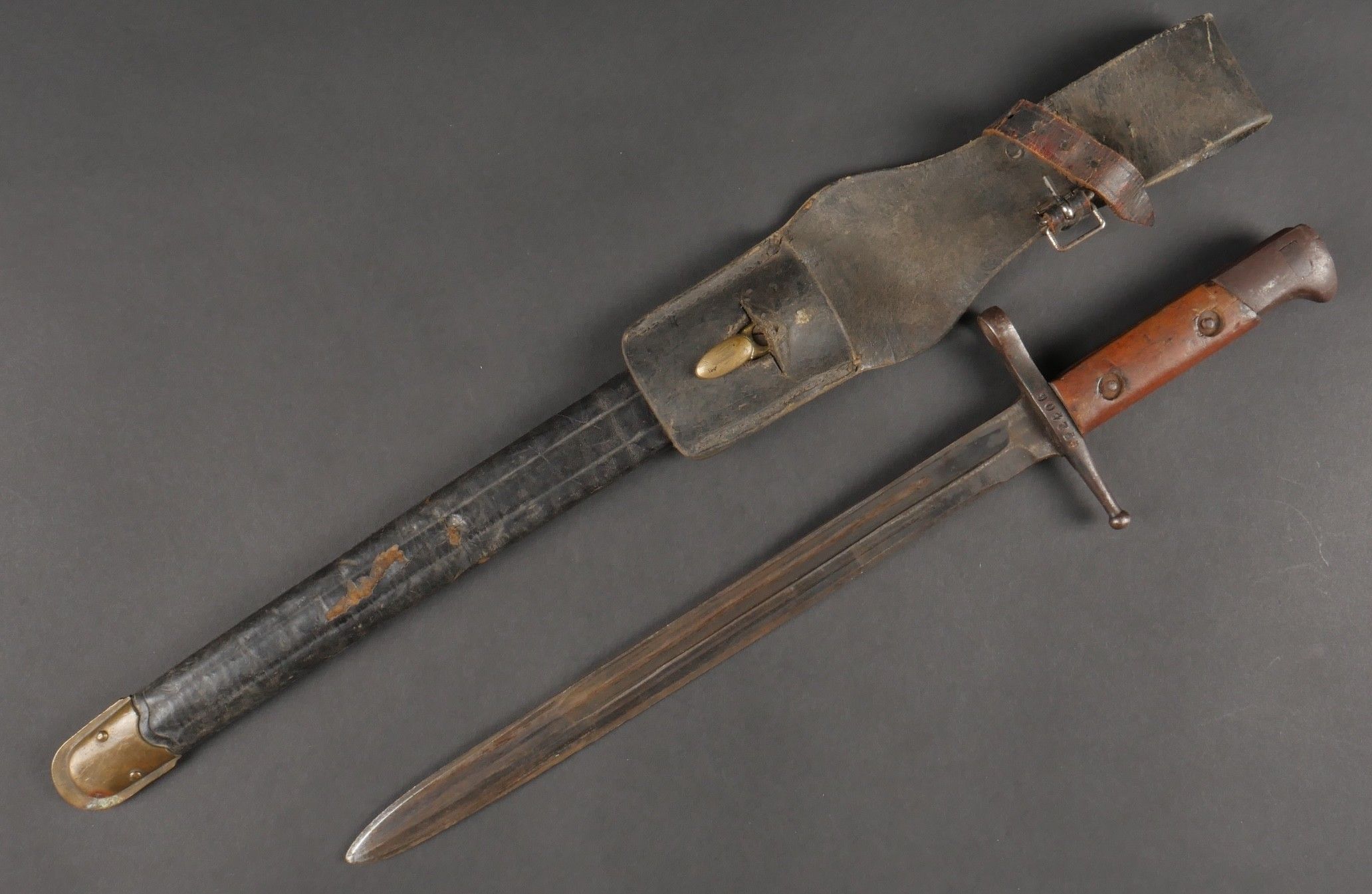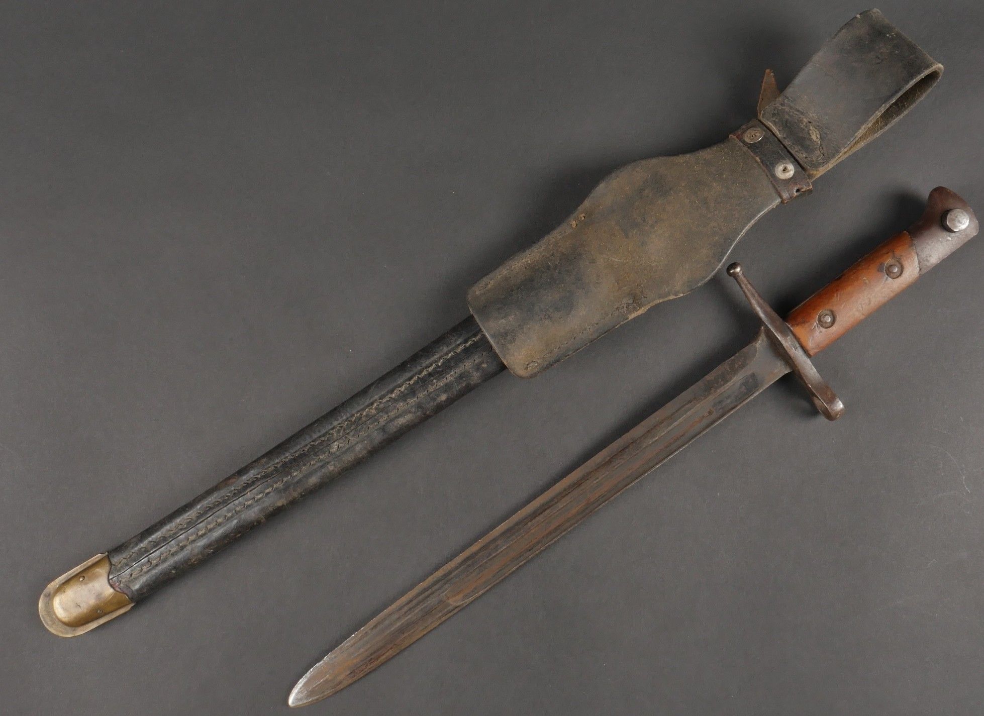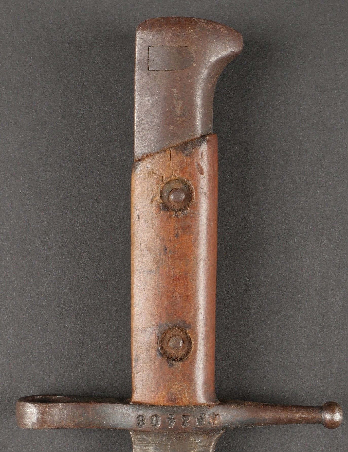 Model 91 bayonet. Metal fittings showing some oxidation. Wooden plates held in place by two rivets. Guard number GF2406, manufacture illegible. Beautiful blade in its original 70% colour. Complete leather and brass scabbard. Complete leather gusset, no visible markings. Some wear and patina. Condition II+. Model 91 Bayonet Metal fittings showing oxidation. Wooden grips secured by two rivets. Guard numbered GF2406, maker's mark illegible. Blade retains about 70% of its original finish. Complete leather and brass scabbard. Complete leather frog with no visible markings. Some wear and patina noted. Condition II+.