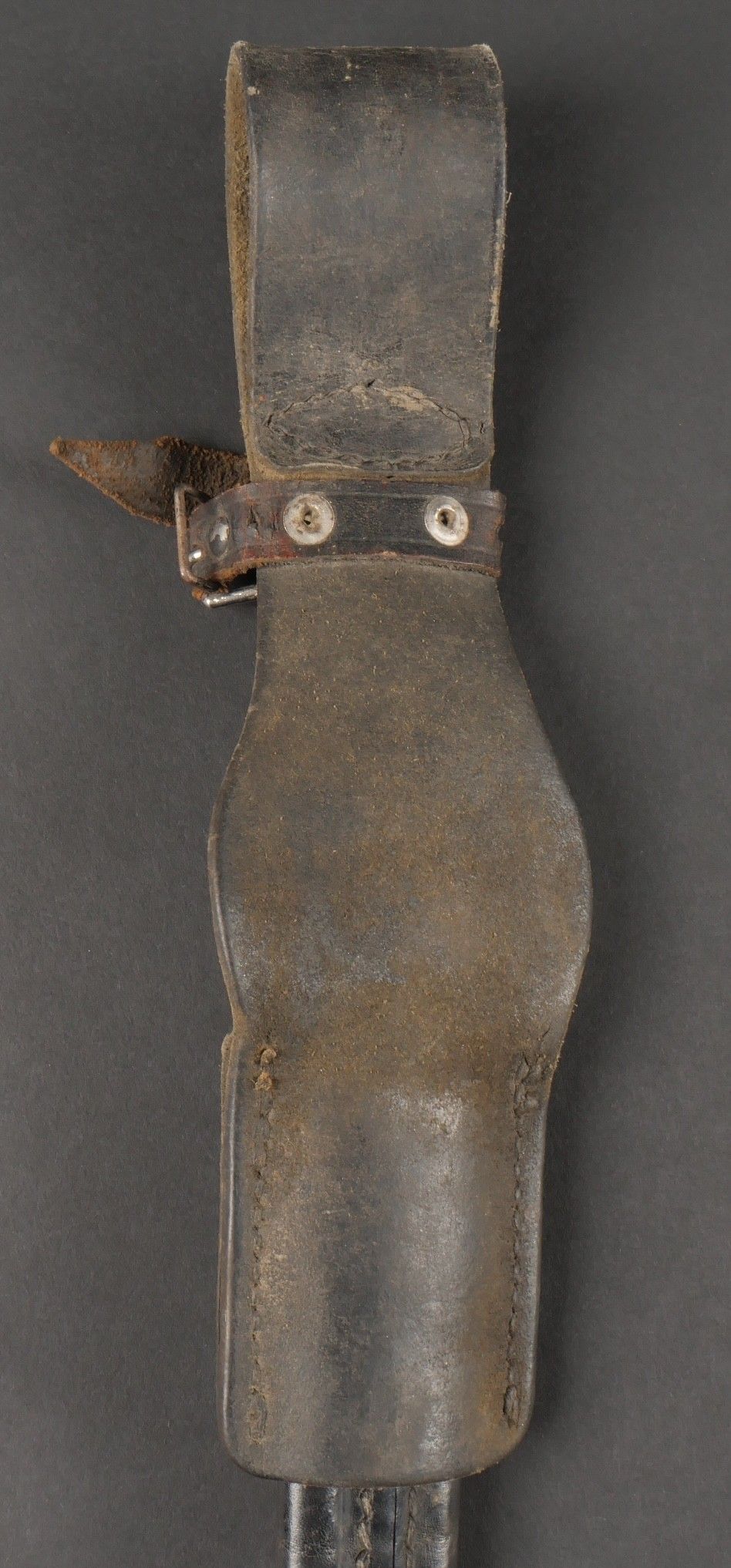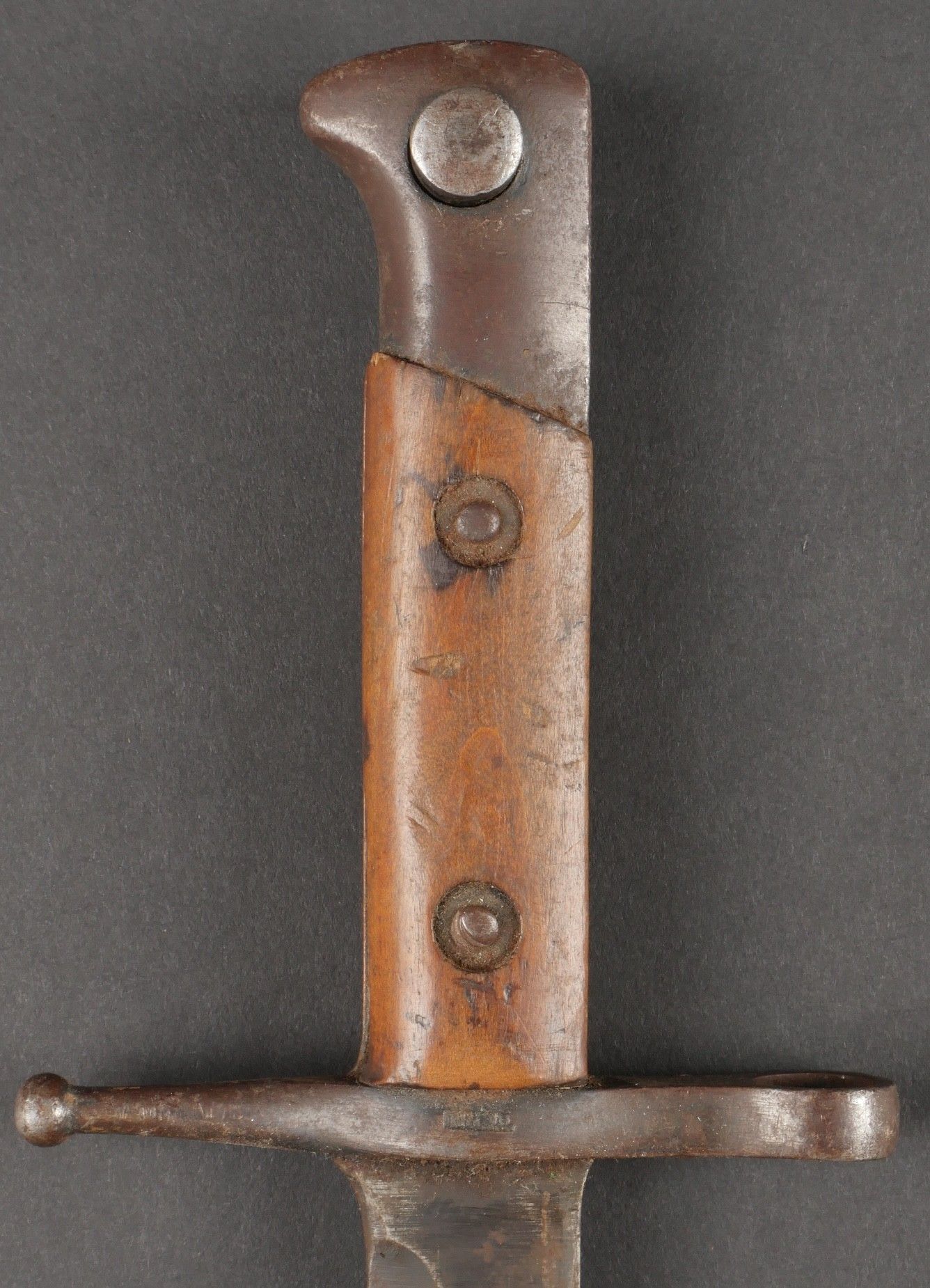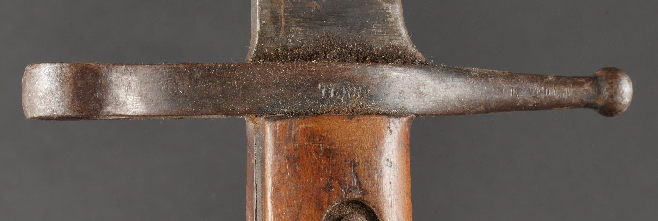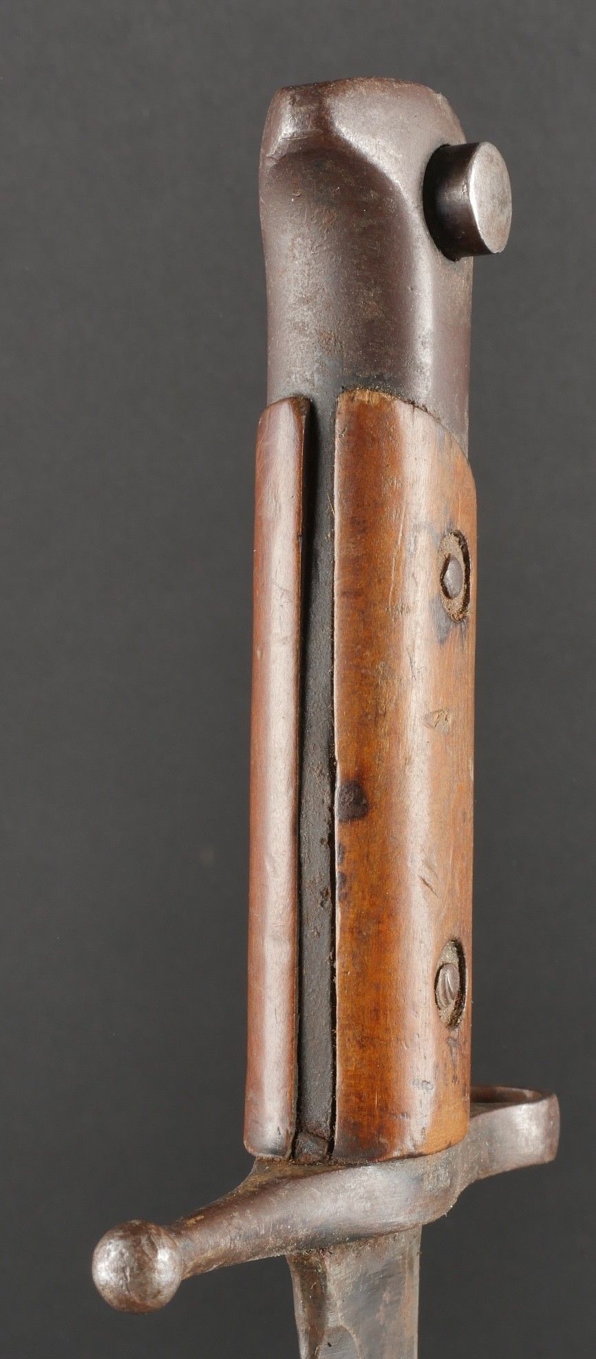 Model 91 bayonet. Metal fittings showing some oxidation. Wooden plates held in place by two rivets. Guard number GF2406, manufacture illegible. Beautiful blade in its original 70% colour. Complete leather and brass scabbard. Complete leather gusset, no visible markings. Some wear and patina. Condition II+. Model 91 Bayonet Metal fittings showing oxidation. Wooden grips secured by two rivets. Guard numbered GF2406, maker's mark illegible. Blade retains about 70% of its original finish. Complete leather and brass scabbard. Complete leather frog with no visible markings. Some wear and patina noted. Condition II+.