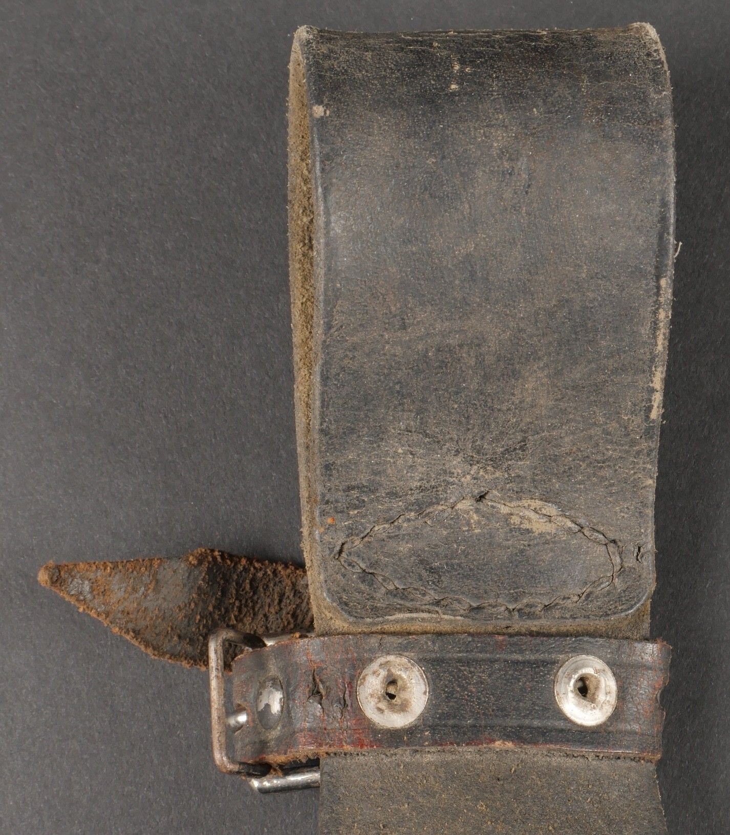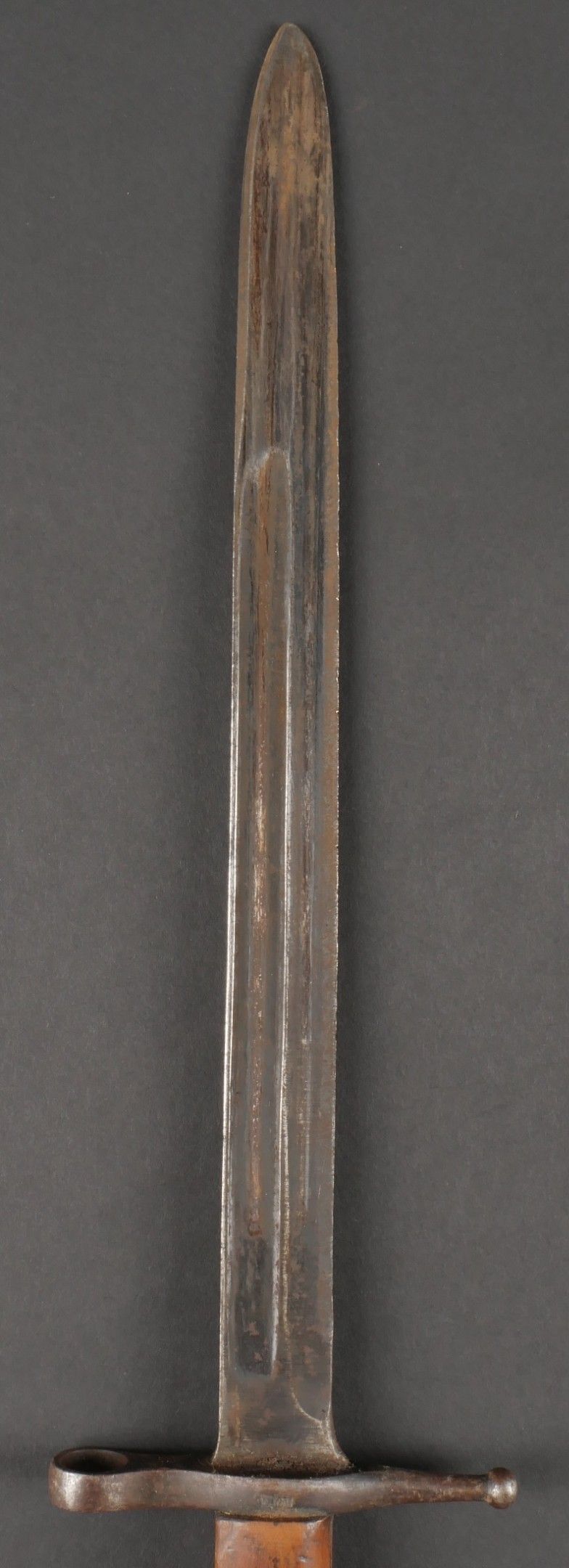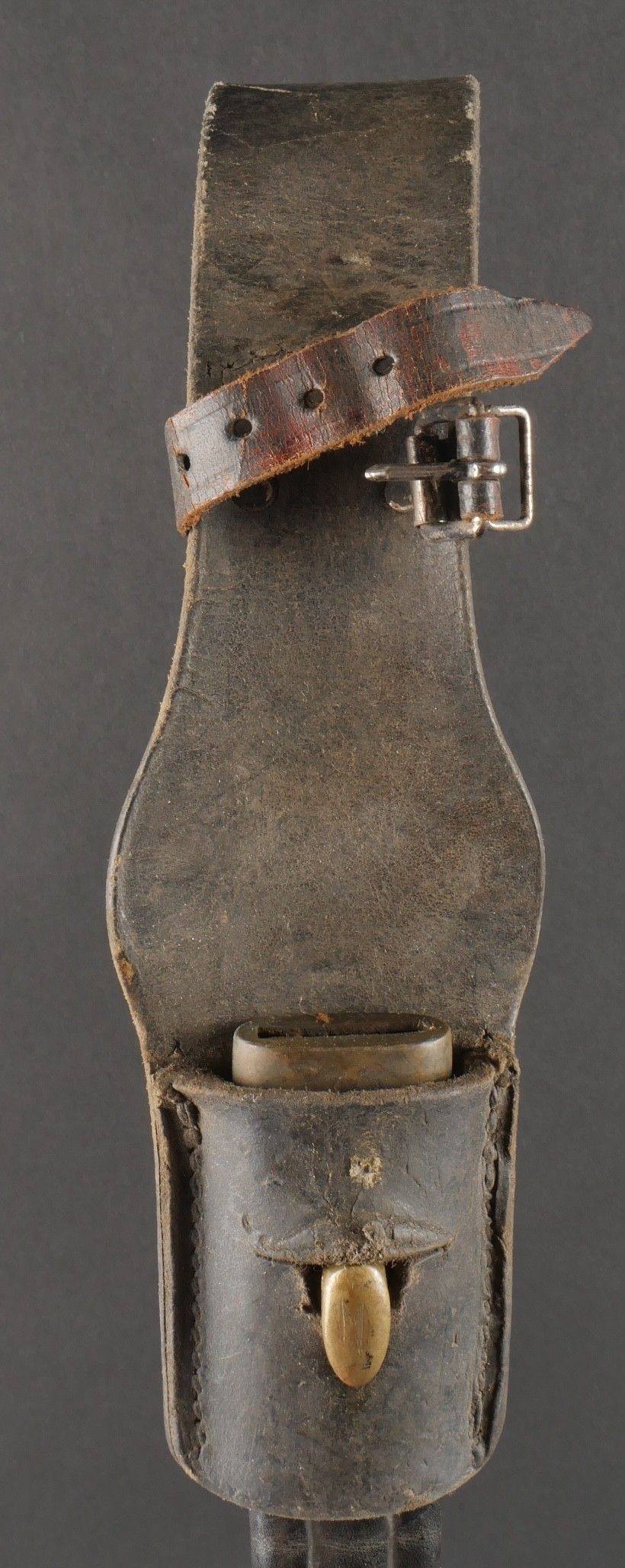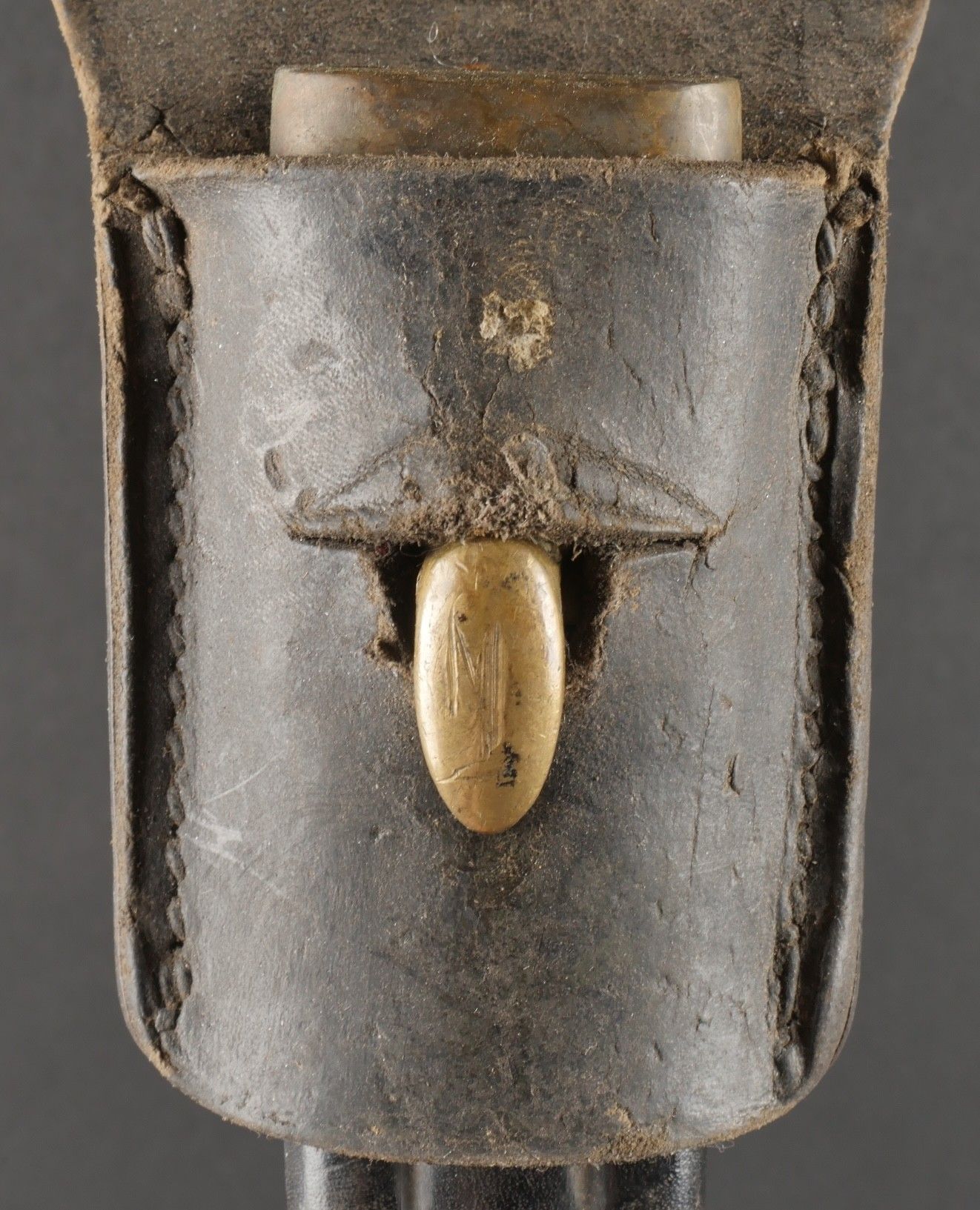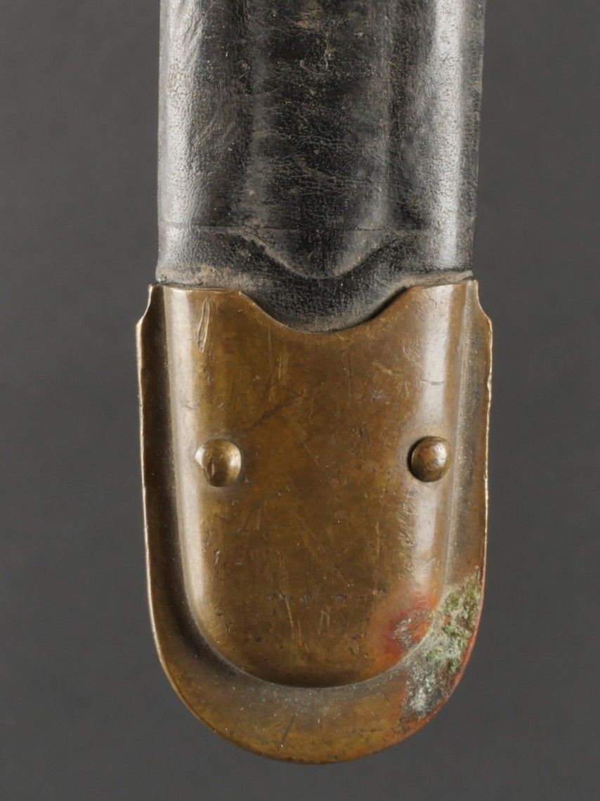 Model 91 bayonet. Metal fittings showing some oxidation. Wooden plates held in place by two rivets. Guard number GF2406, manufacture illegible. Beautiful blade in its original 70% colour. Complete leather and brass scabbard. Complete leather gusset, no visible markings. Some wear and patina. Condition II+. Model 91 Bayonet Metal fittings showing oxidation. Wooden grips secured by two rivets. Guard numbered GF2406, maker's mark illegible. Blade retains about 70% of its original finish. Complete leather and brass scabbard. Complete leather frog with no visible markings. Some wear and patina noted. Condition II+.