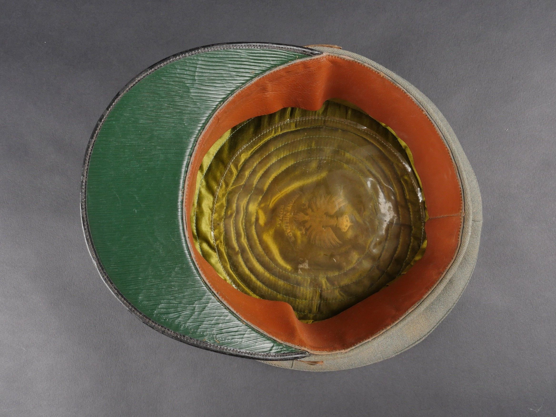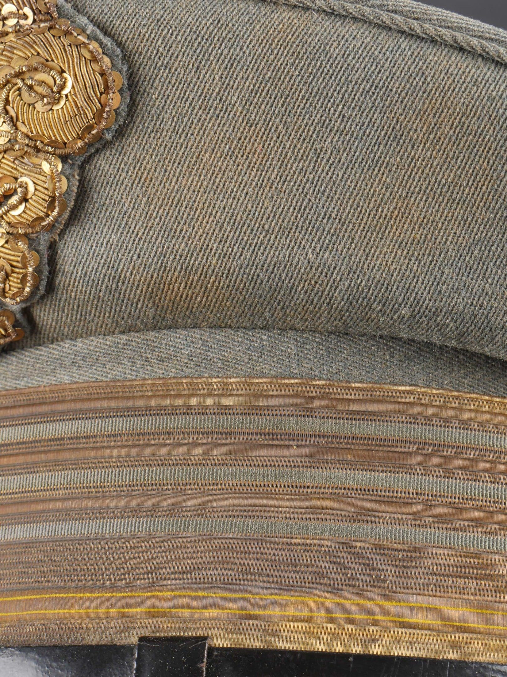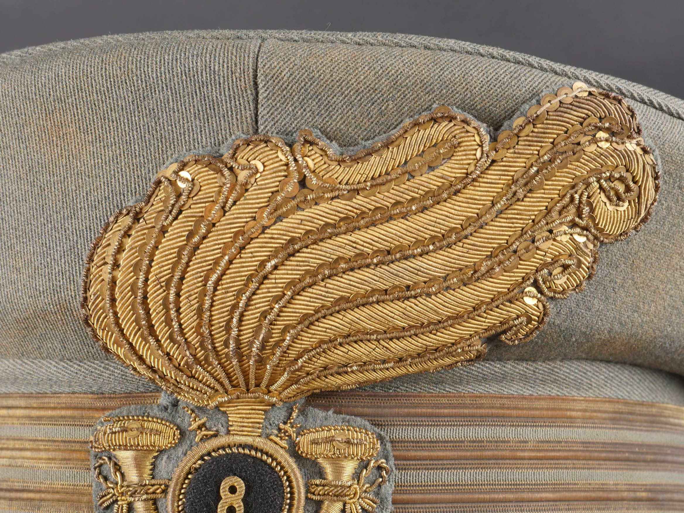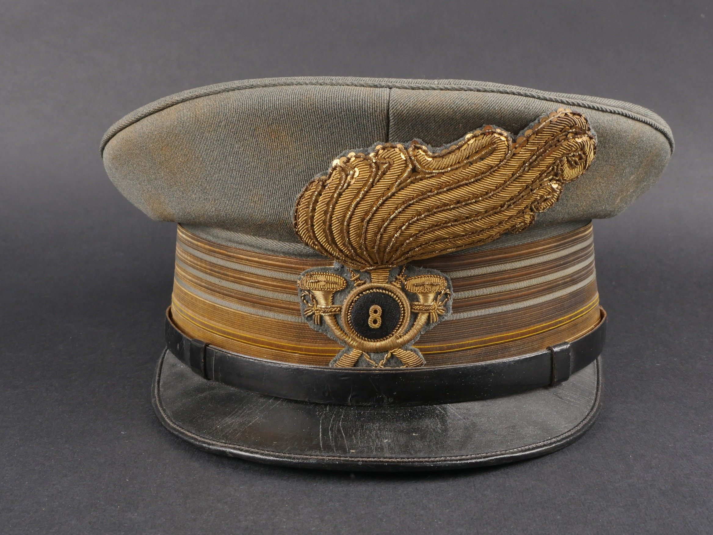 Cap of the 8th Bersaglieri Regiment. In Grio Verdo gabardine. Headband with gold braid. Gold piping badge of the 8th Bersaglieri Regiment. Complete chinstrap. Leather visor. Interior lined in green silky fabric. Mica present. Unione Militare Roma manufacturer's logo. Brown leather sweatband. Some wear and patina. Condition II+. Cap of the 8th Bersaglieri Regiment Made of grigio-verde gabardine. Gold braid band with gold bullion insignia of the 8th Bersaglieri Regiment. Complete imitation chinstrap. Leather visor. Interior lined with green silky fabric, mica present. Maker's logo Unione Militare Roma. Brown leather sweatband. Some wear and patina noted. Condition II+.