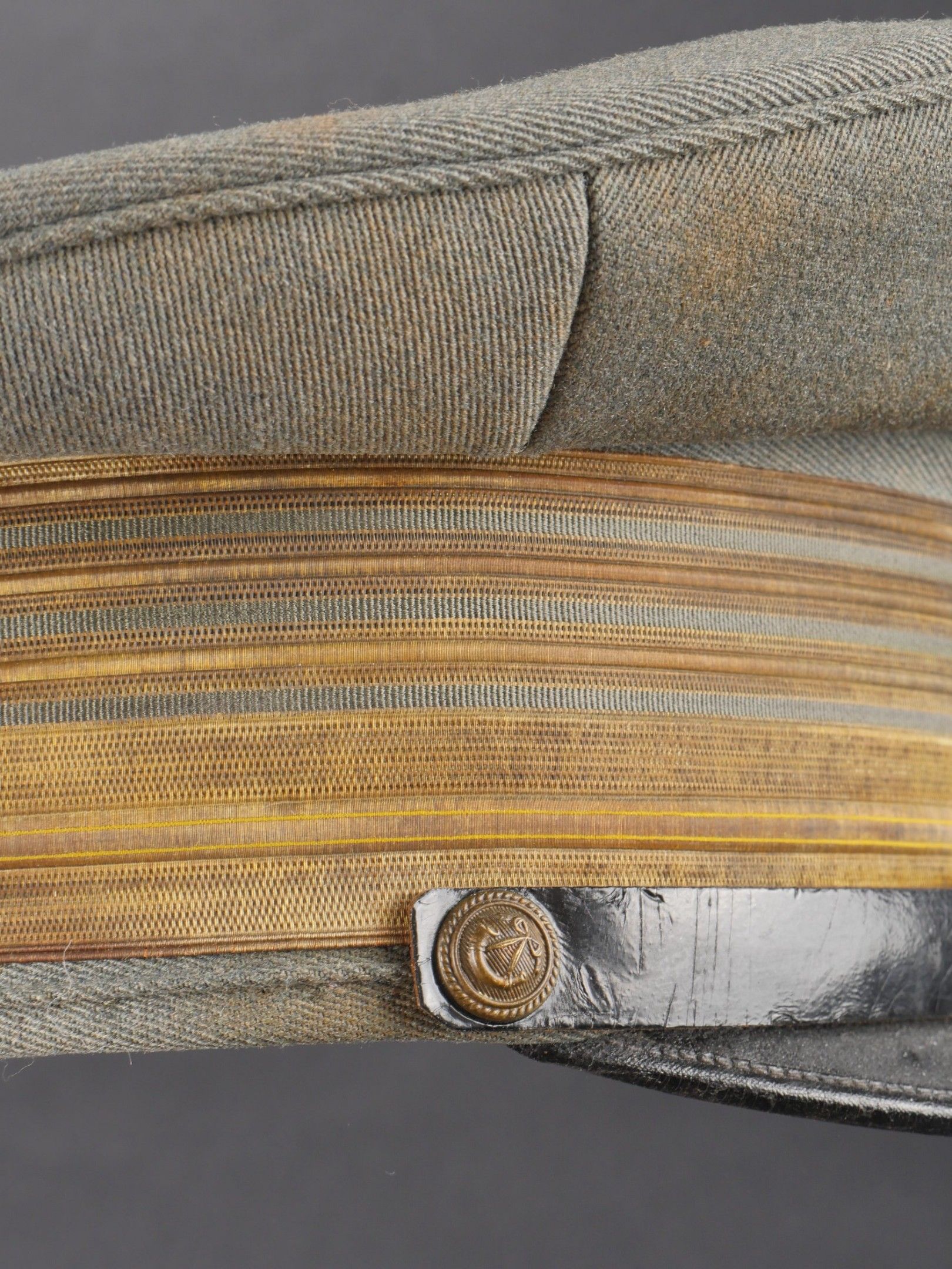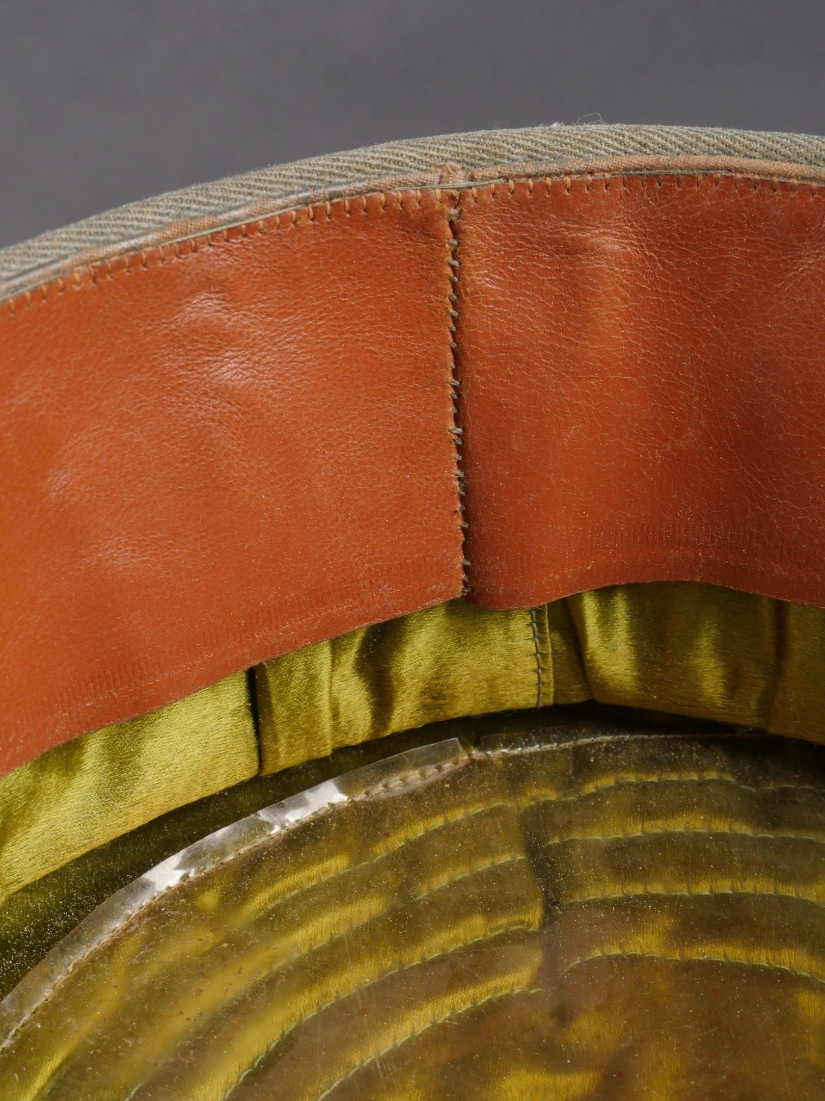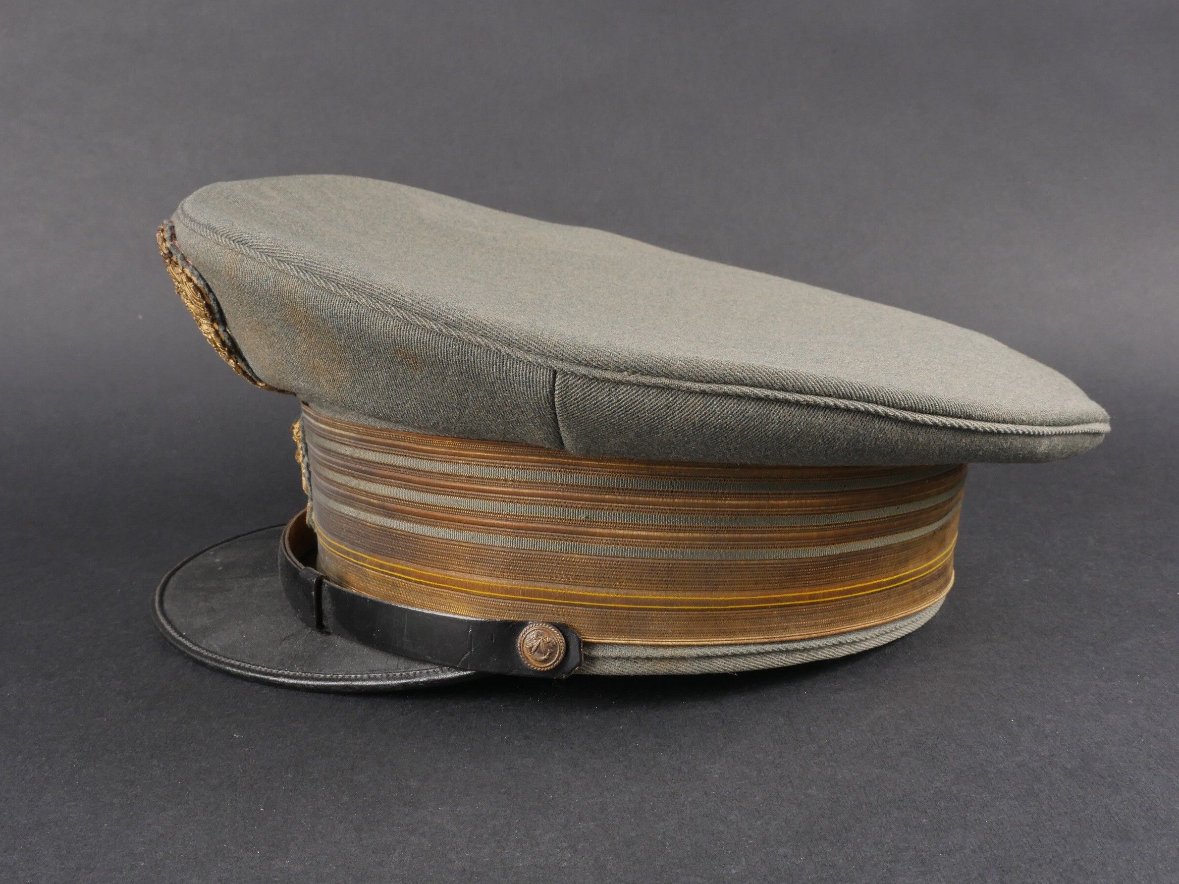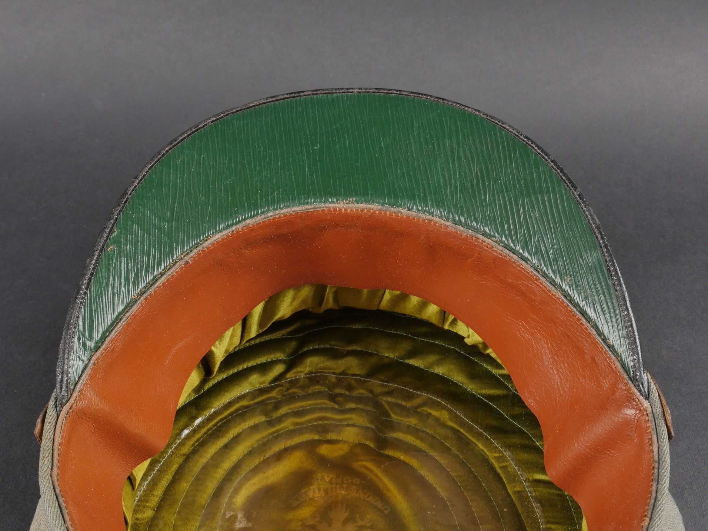 Cap of the 8th Bersaglieri Regiment. In Grio Verdo gabardine. Headband with gold braid. Gold piping badge of the 8th Bersaglieri Regiment. Complete chinstrap. Leather visor. Interior lined in green silky fabric. Mica present. Unione Militare Roma manufacturer's logo. Brown leather sweatband. Some wear and patina. Condition II+. Cap of the 8th Bersaglieri Regiment Made of grigio-verde gabardine. Gold braid band with gold bullion insignia of the 8th Bersaglieri Regiment. Complete imitation chinstrap. Leather visor. Interior lined with green silky fabric, mica present. Maker's logo Unione Militare Roma. Brown leather sweatband. Some wear and patina noted. Condition II+.