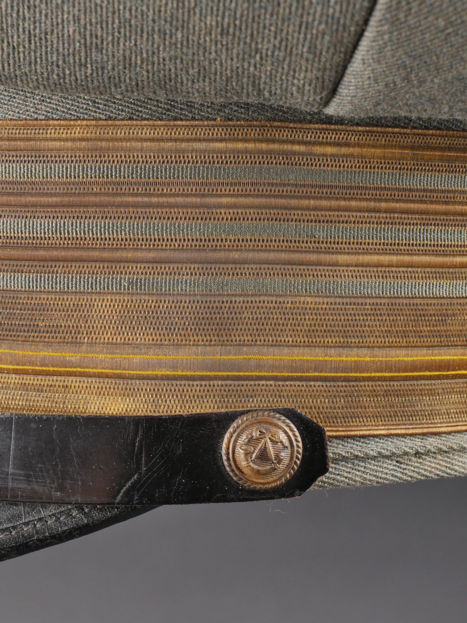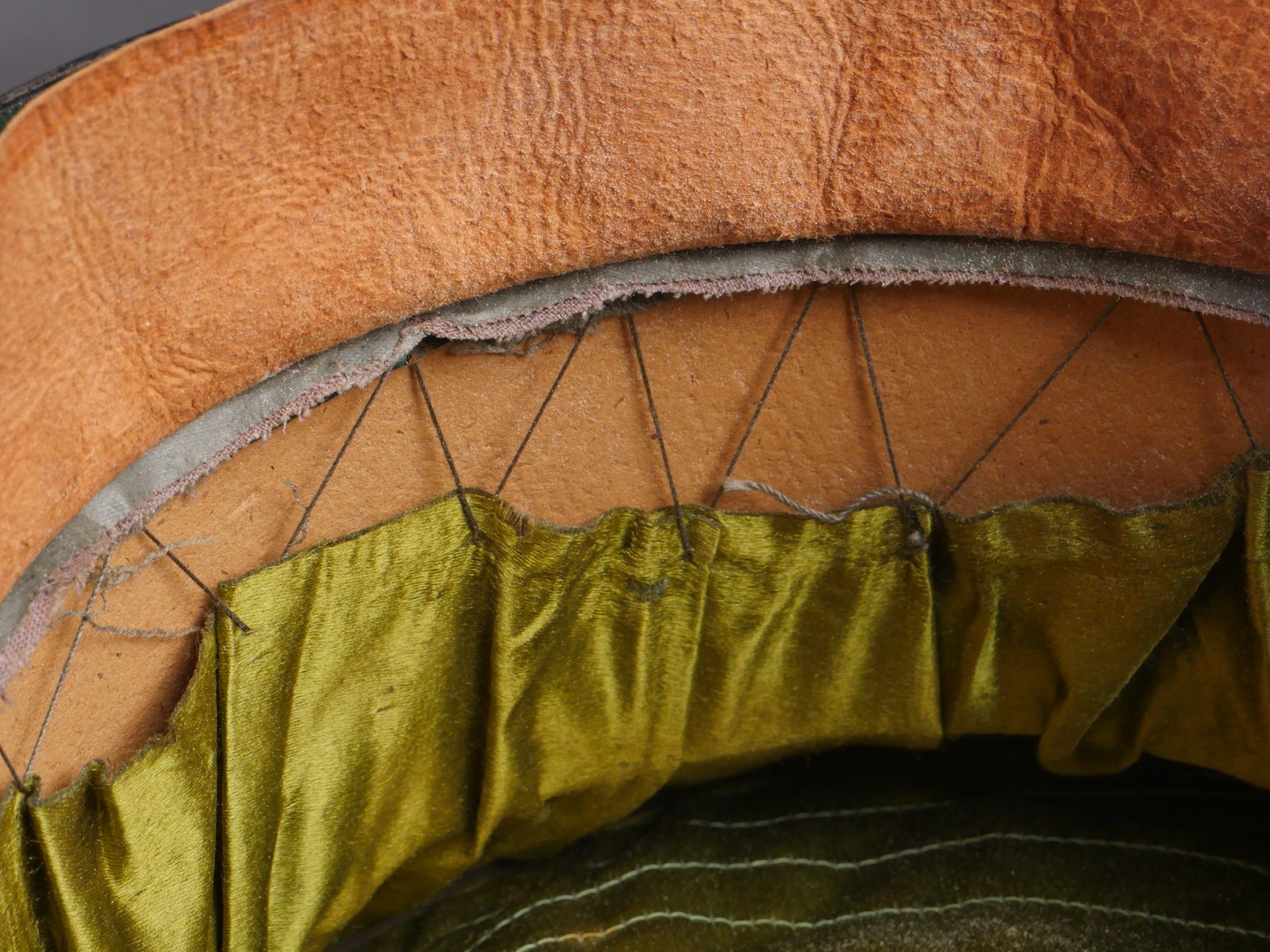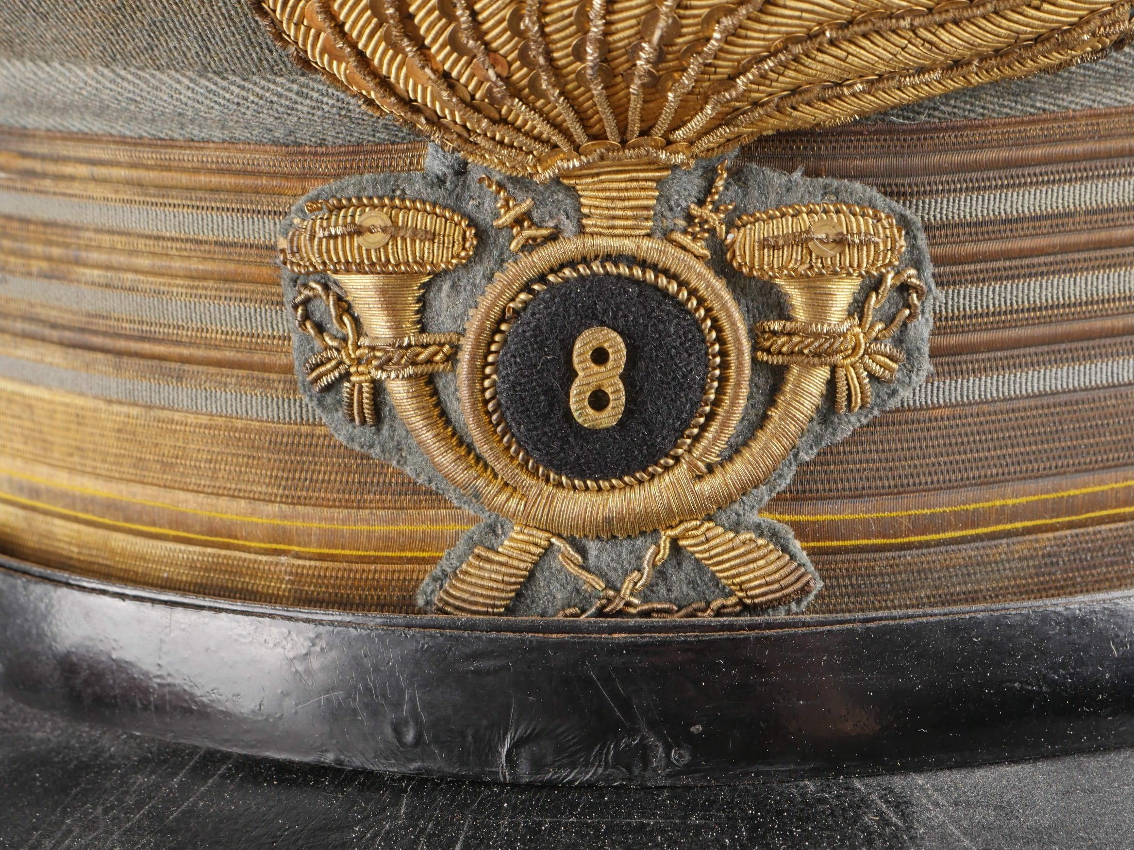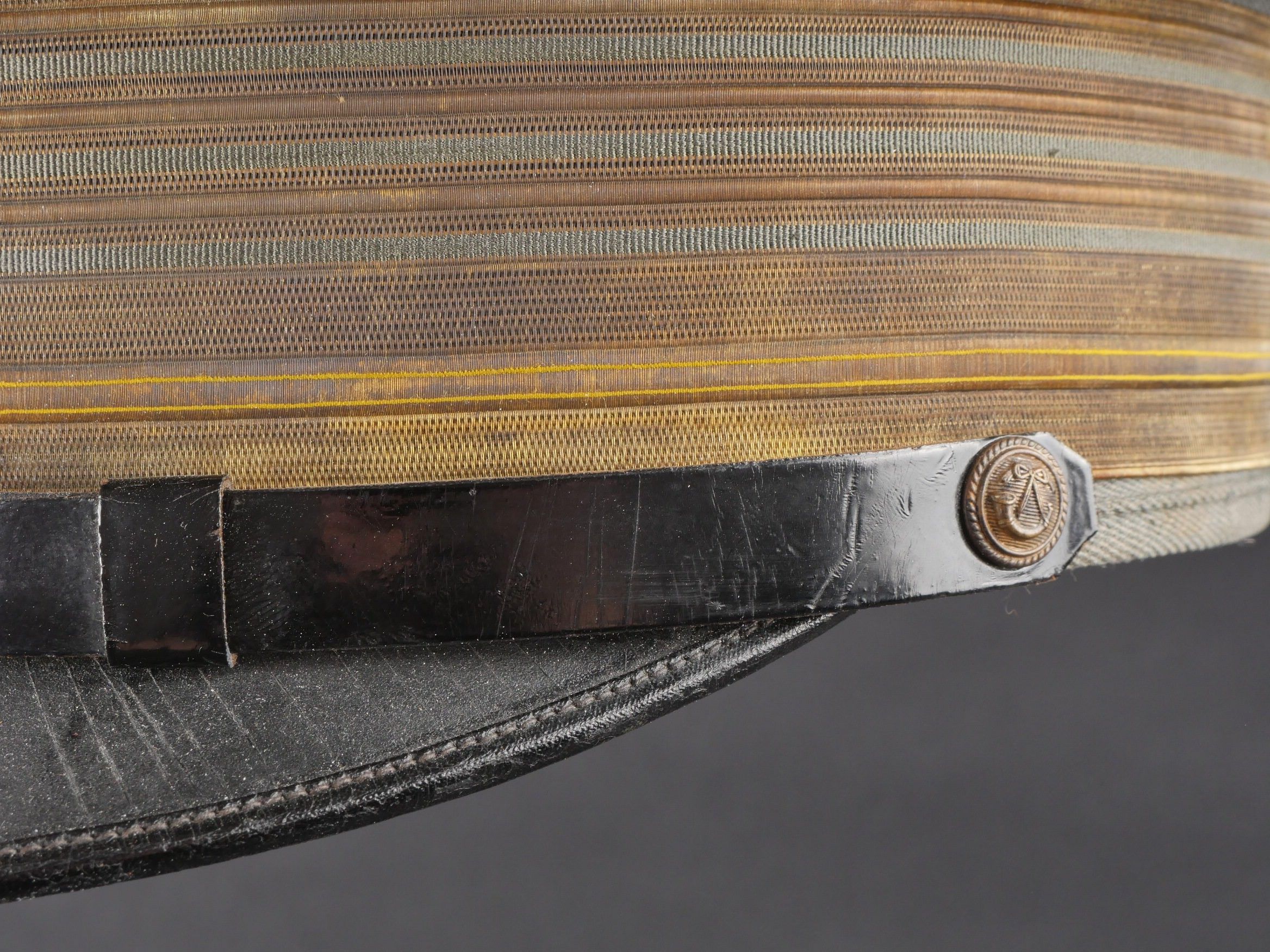 Cap of the 8th Bersaglieri Regiment. In Grio Verdo gabardine. Headband with gold braid. Gold piping badge of the 8th Bersaglieri Regiment. Complete chinstrap. Leather visor. Interior lined in green silky fabric. Mica present. Unione Militare Roma manufacturer's logo. Brown leather sweatband. Some wear and patina. Condition II+. Cap of the 8th Bersaglieri Regiment Made of grigio-verde gabardine. Gold braid band with gold bullion insignia of the 8th Bersaglieri Regiment. Complete imitation chinstrap. Leather visor. Interior lined with green silky fabric, mica present. Maker's logo Unione Militare Roma. Brown leather sweatband. Some wear and patina noted. Condition II+.