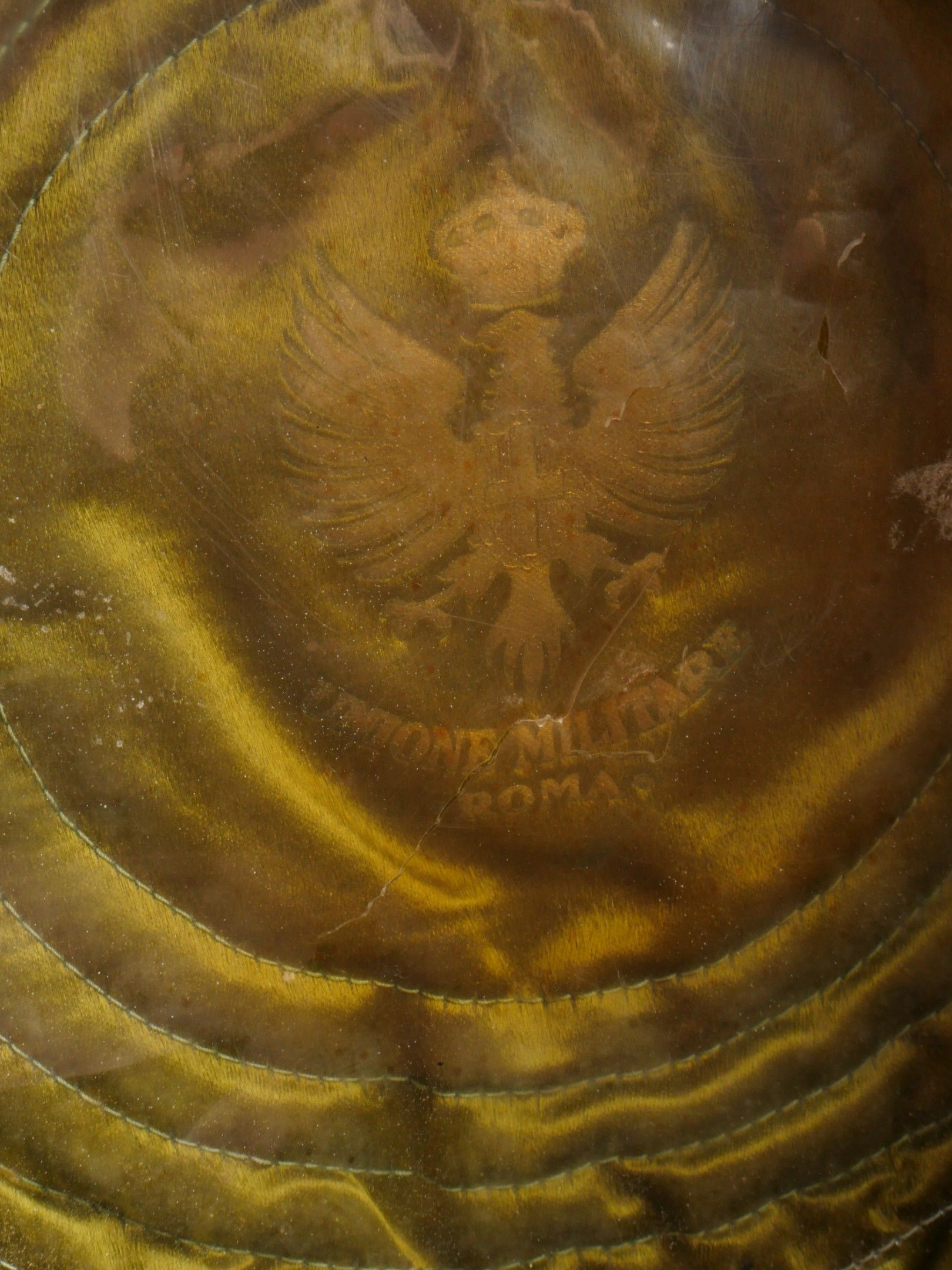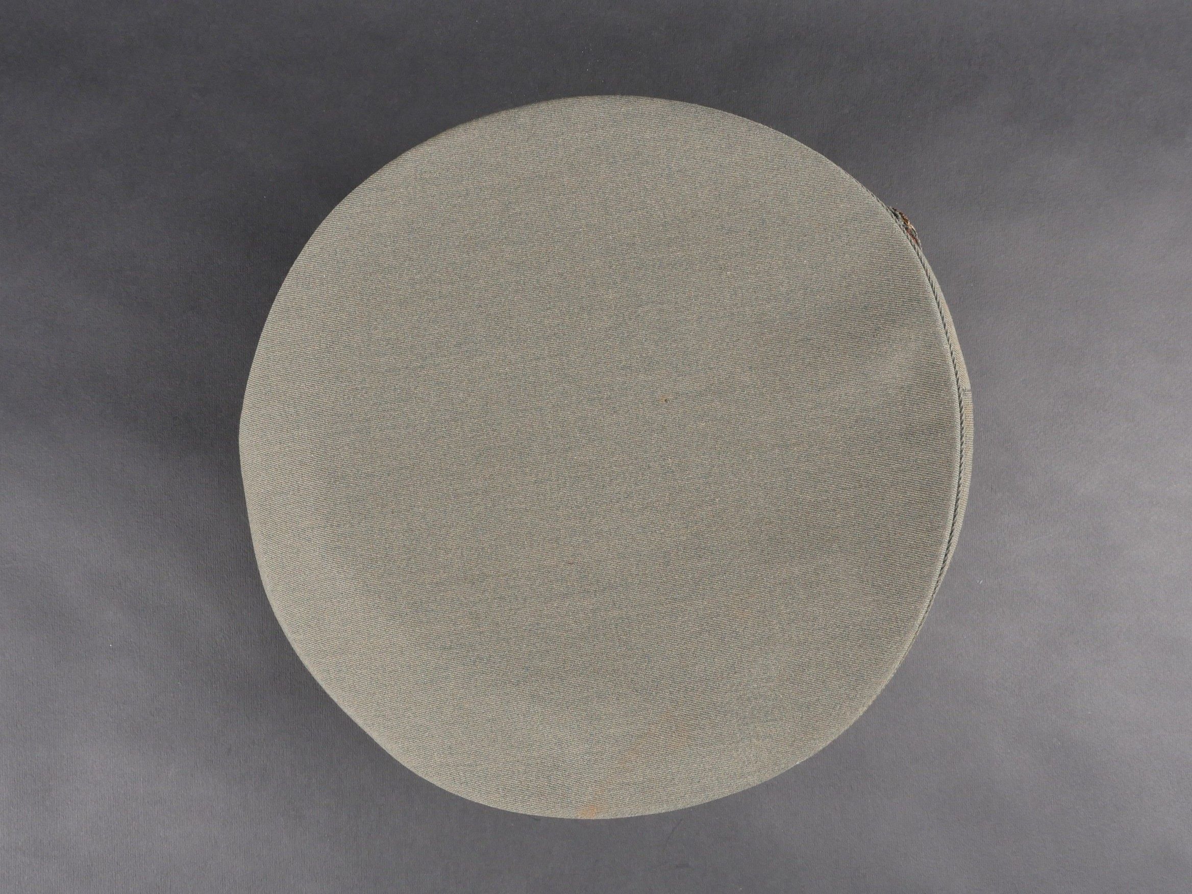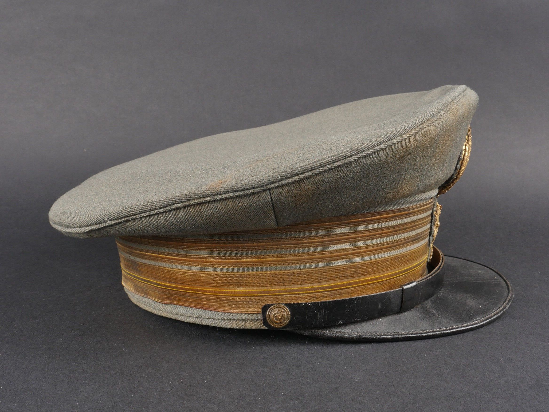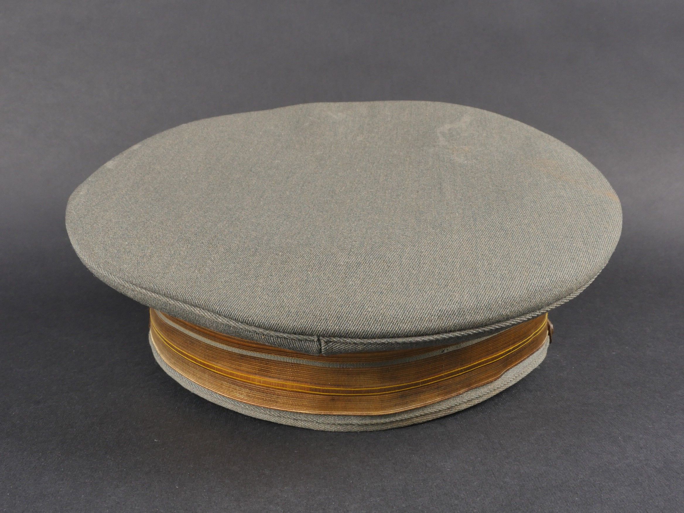 Cap of the 8th Bersaglieri Regiment. In Grio Verdo gabardine. Headband with gold braid. Gold piping badge of the 8th Bersaglieri Regiment. Complete chinstrap. Leather visor. Interior lined in green silky fabric. Mica present. Unione Militare Roma manufacturer's logo. Brown leather sweatband. Some wear and patina. Condition II+. Cap of the 8th Bersaglieri Regiment Made of grigio-verde gabardine. Gold braid band with gold bullion insignia of the 8th Bersaglieri Regiment. Complete imitation chinstrap. Leather visor. Interior lined with green silky fabric, mica present. Maker's logo Unione Militare Roma. Brown leather sweatband. Some wear and patina noted. Condition II+.