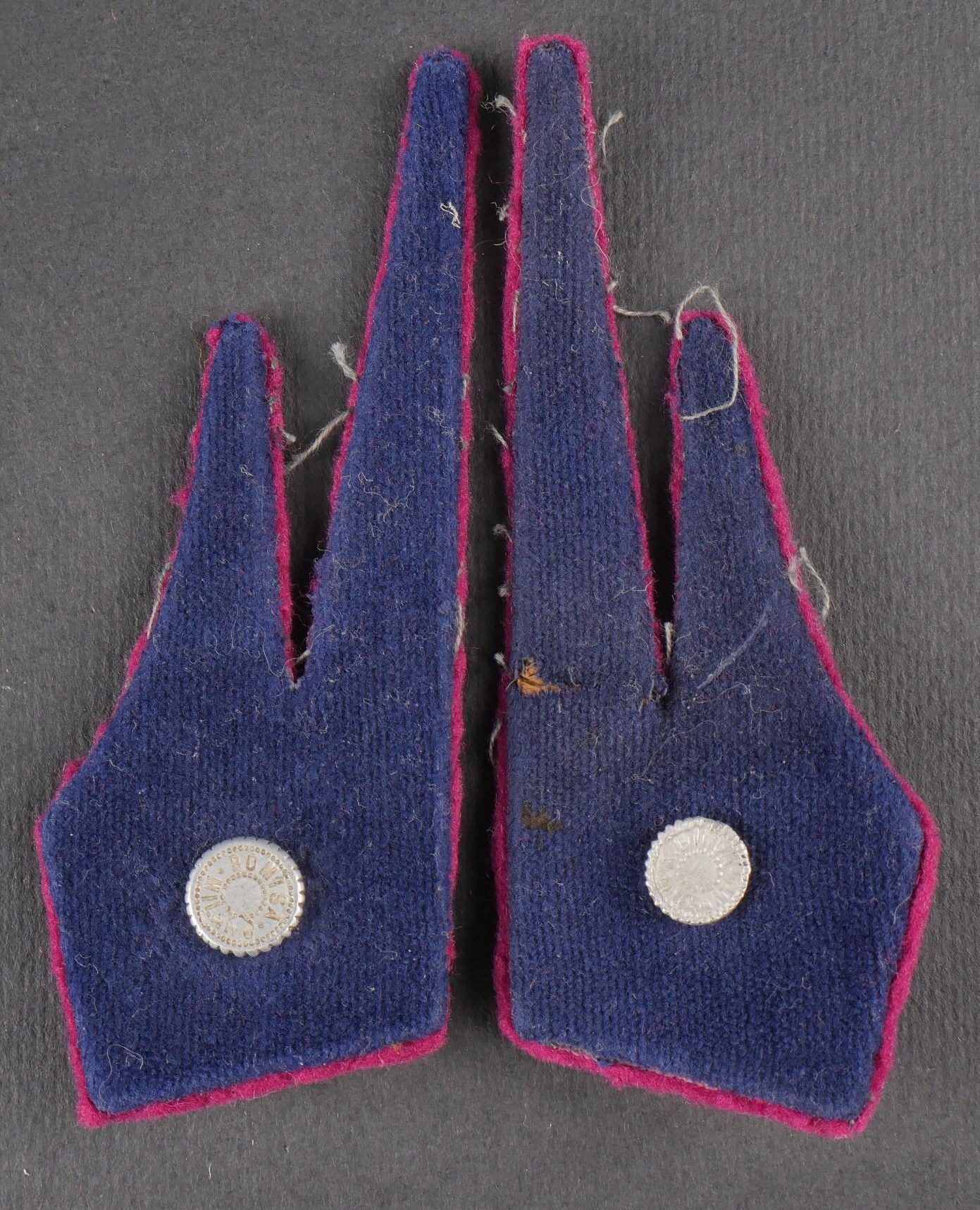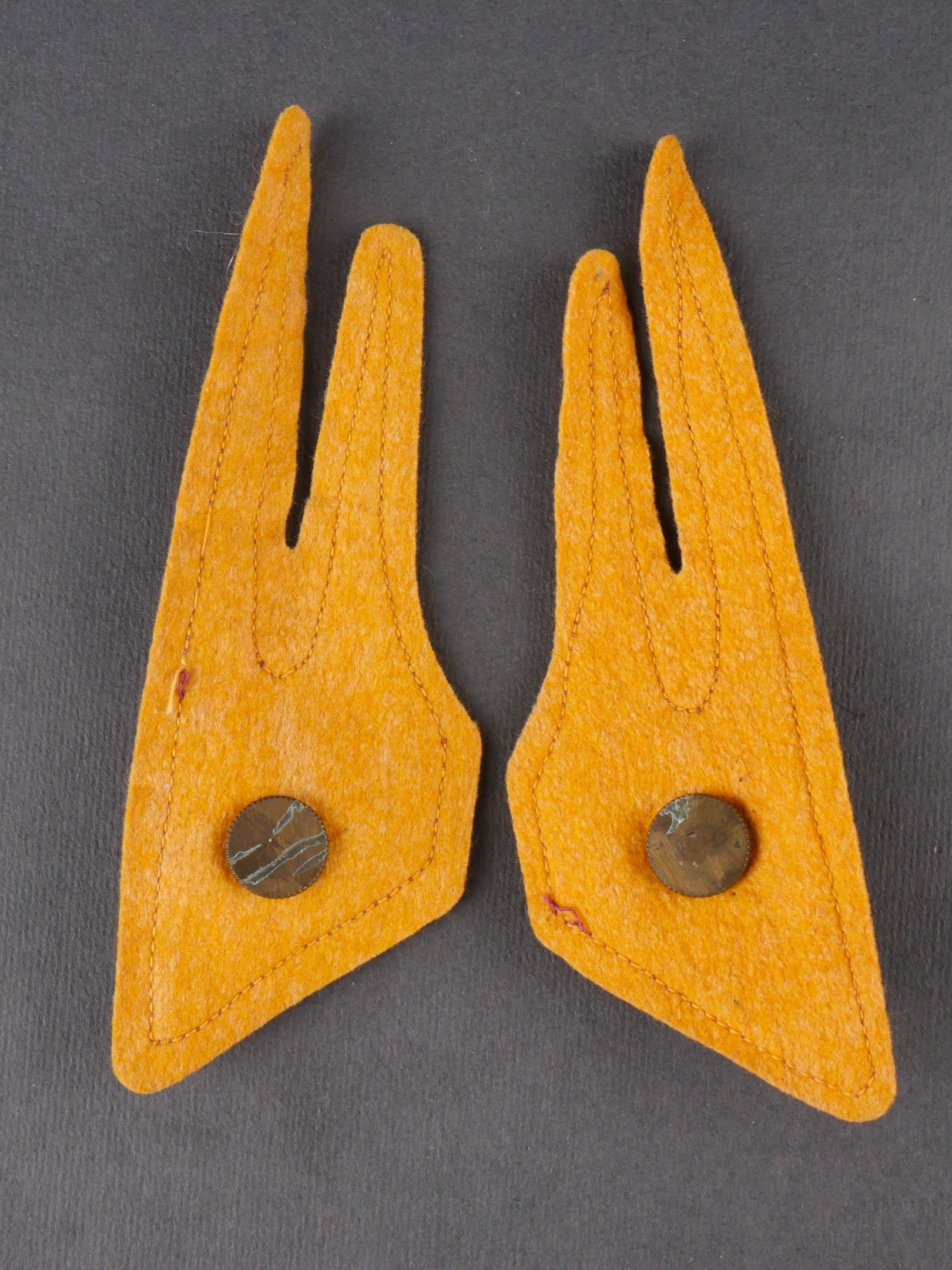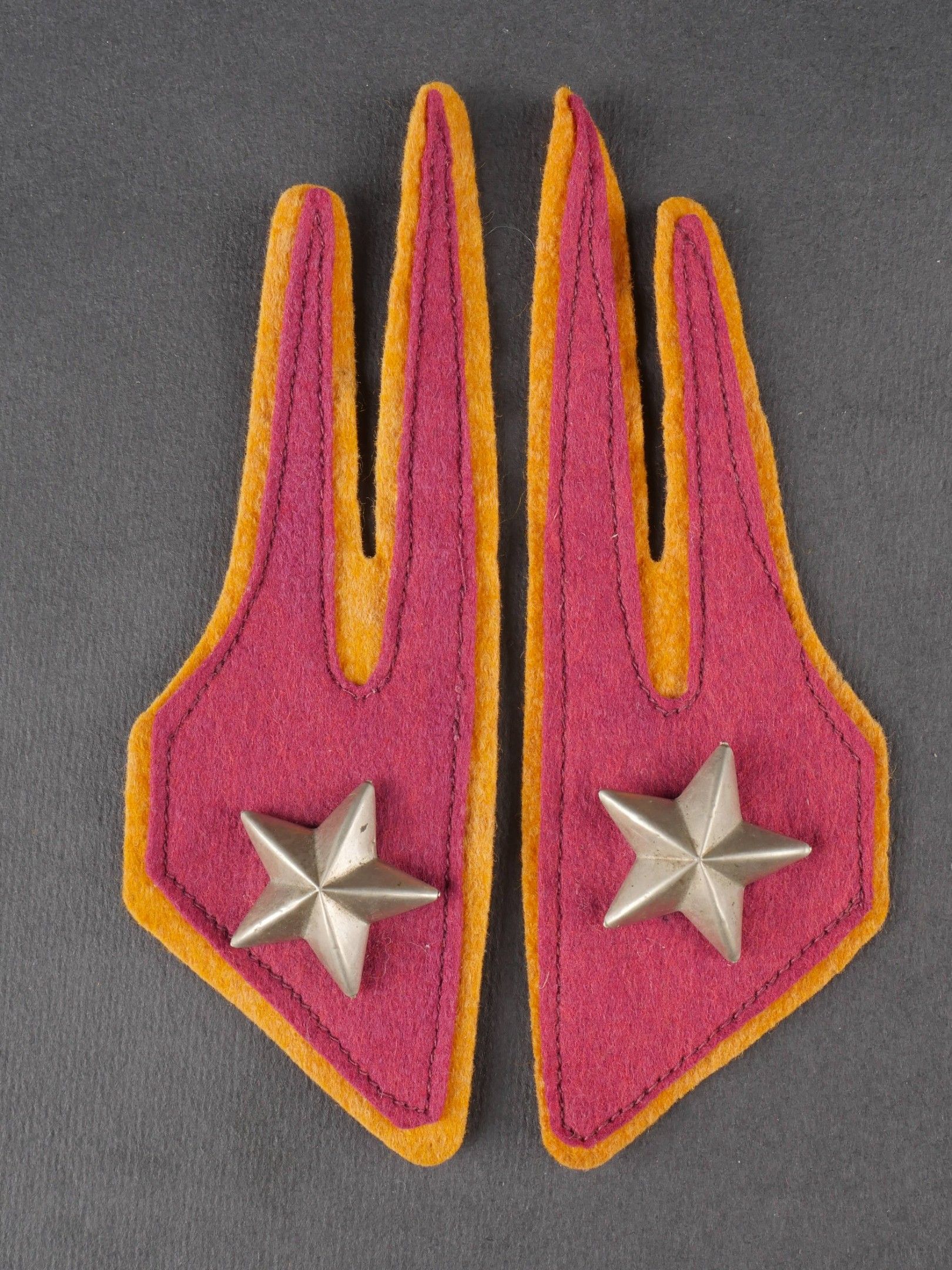 Italian collar tabs. Comprising a pair of Giovanni Fasciti collar tabs and a pair of Bersagleri collar tabs. One pair is disassembled from a jacket. Homogeneous pairs in cloth, metal insignia representing stars. Some wear and patina to be noted. Condition II+. Italian Collar Tabs Includes one pair for Giovanni Fascisti and one pair for Bersaglieri. One pair removed from a tunic. Matching pairs made of cloth with metal star insignia. Some wear and patina noted. Condition II+.