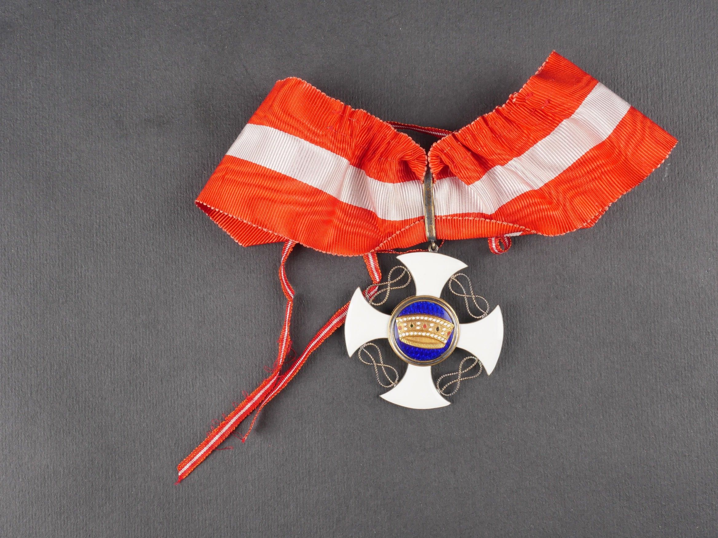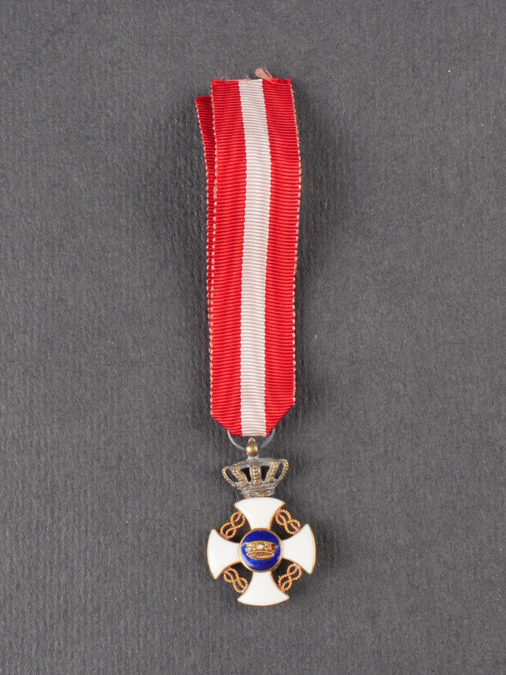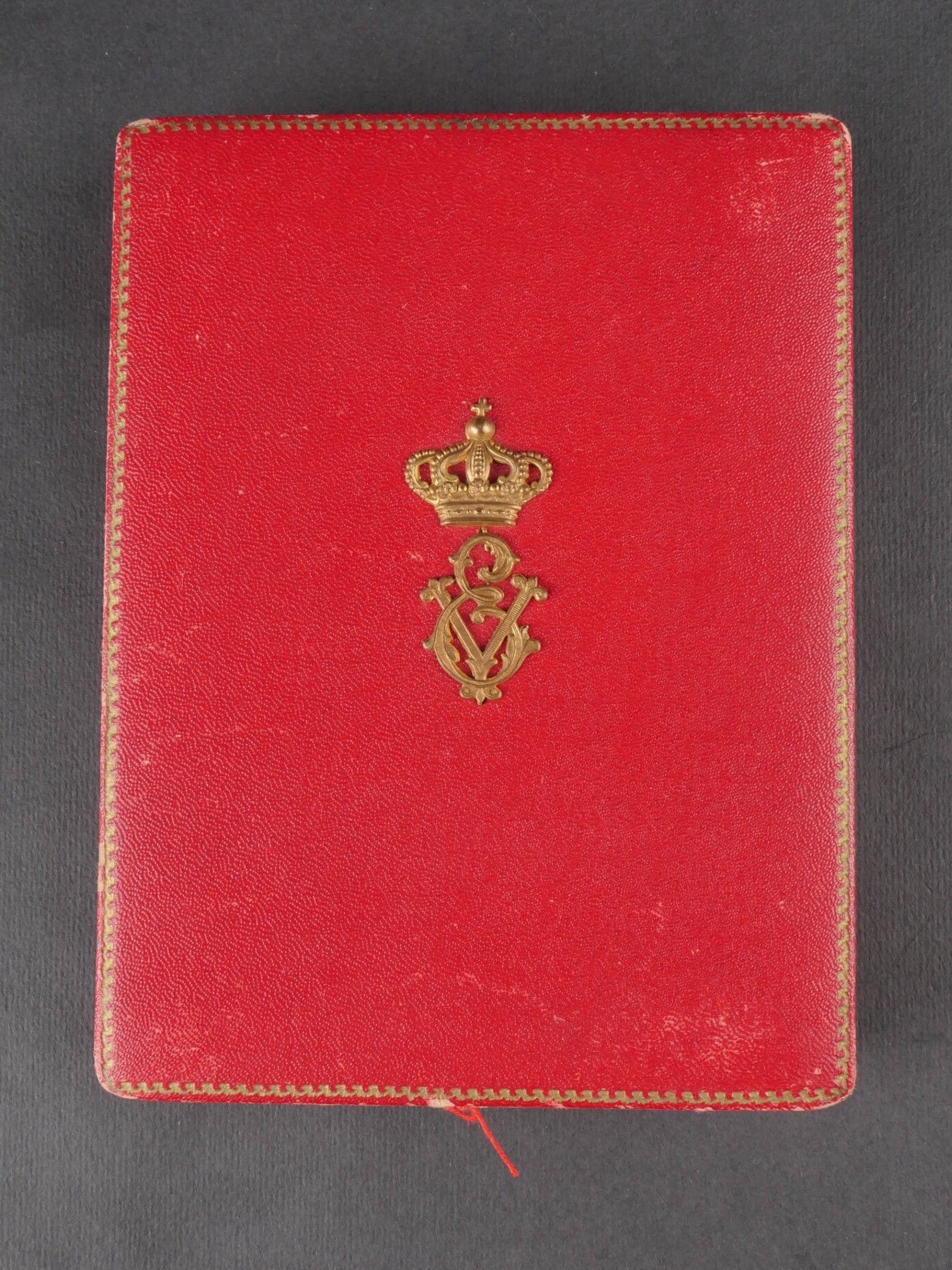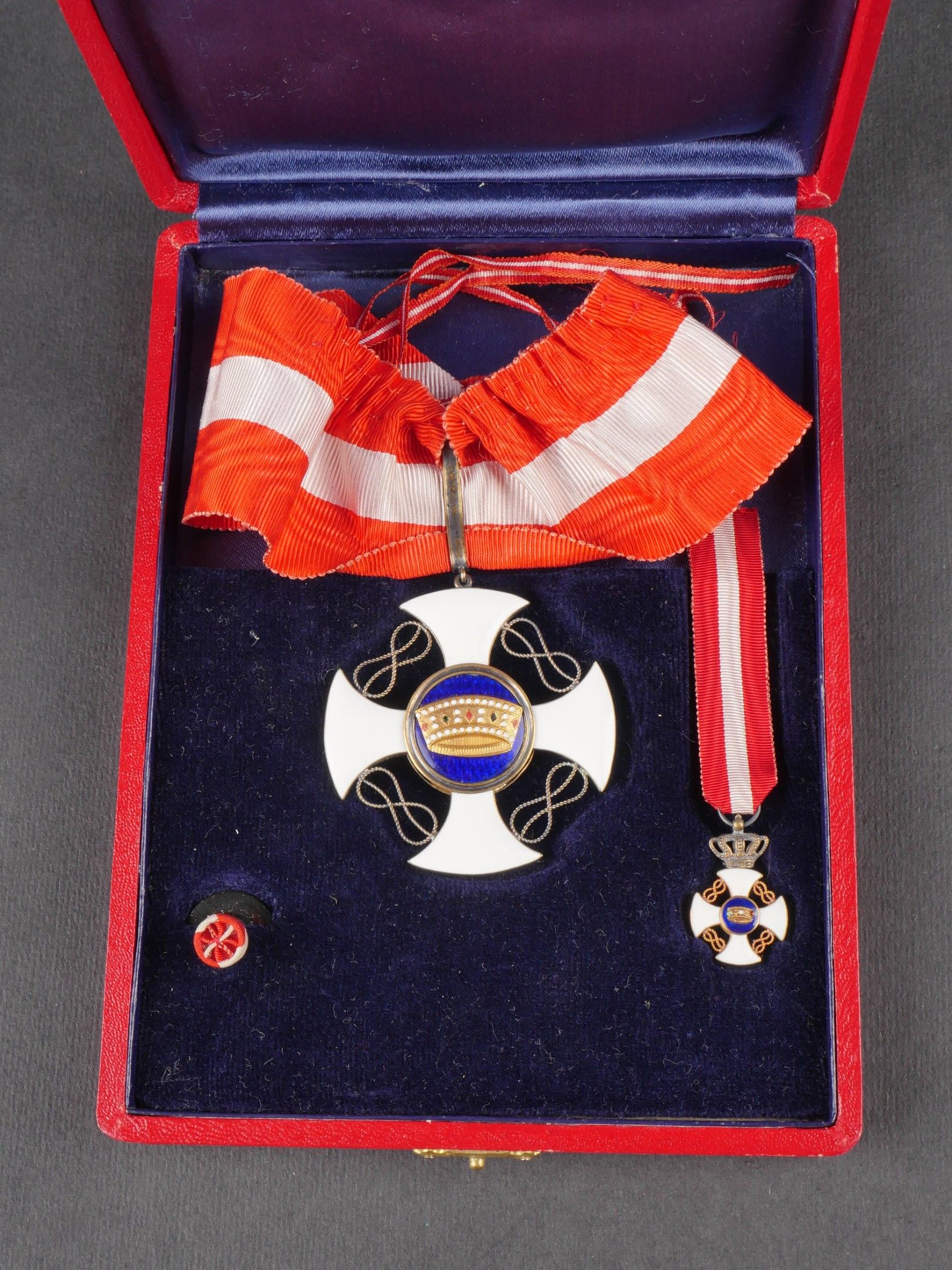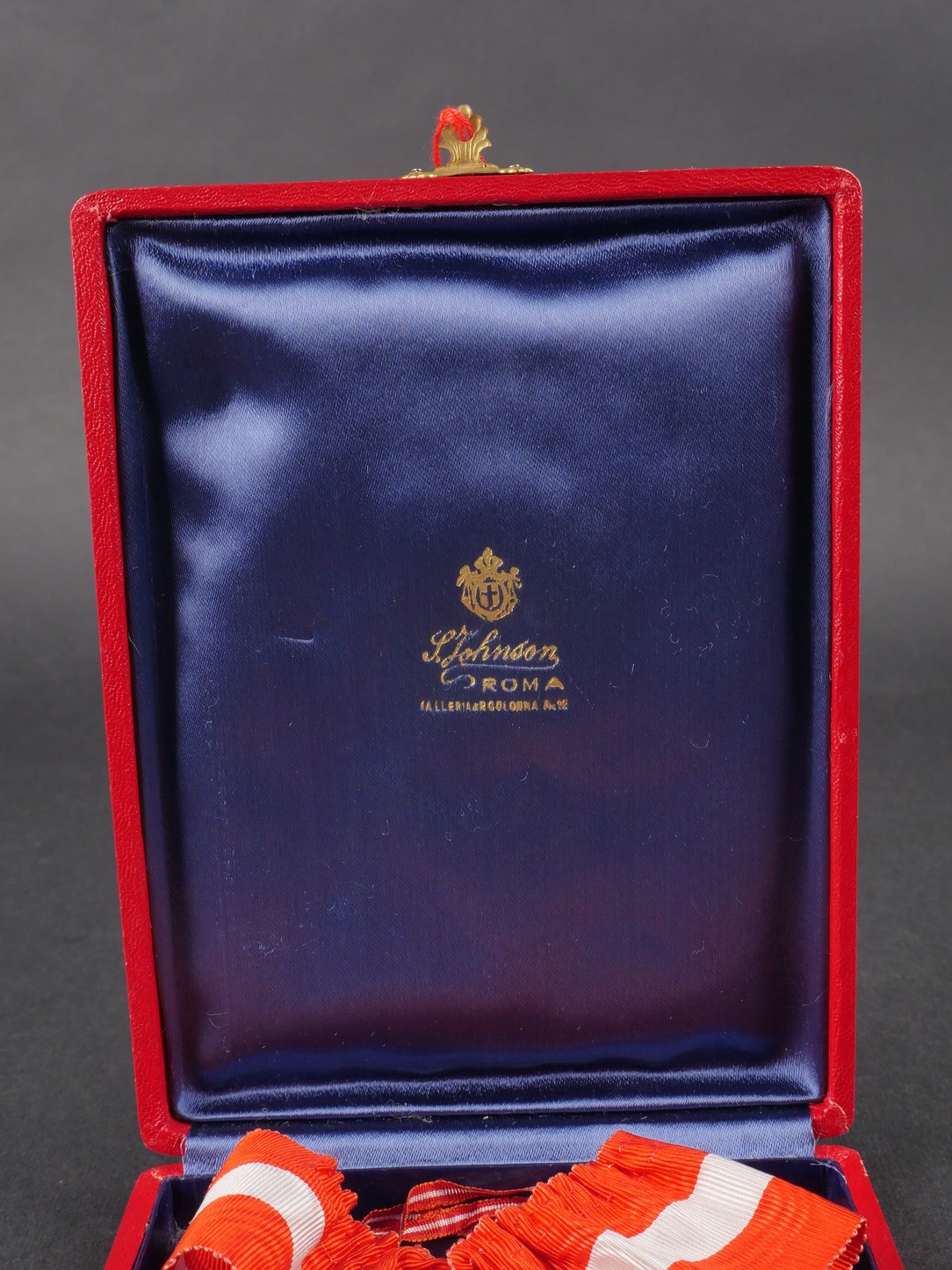 Commander's Cross of the Crown of Italy. Very fine box with EV metal monogram under crown. Interior lined in satinette and blue velvet. Functional clasp. Made by Johson Roma. The gold cross pattée is covered with white enamel. The branches of the cross are linked by four Savoy knot love lakes in braided gold wire. In the centre of the cross, on the obverse, is a gold medallion enamelled blue, featuring the crown of the King of the Lombards. The gold medallion on the reverse features a black-enamelled eagle with the enamelled Savoy cross in its mandorla, heraldic symbols taken from the great arms of the sovereigns of the House of Savoy. The ribbon is tierced with a white stripe between two red stripes. Miniature and buttonhole present. Some wear and patina. Condition II+. Commander's Cross of the Crown of Italy Fine boxed example with raised metallic monogram EV under crown. Interior lined with blue satinette and velvet, functional clasp. Made by Johnson Roma. Rounded gilt cross pattée covered in white enamel. Arms joined by four interlaced love knots Savoy knots in twisted gold wire. Central obverse medallion of blue enamel bearing the crown of the Lombard kings, reverse medallion depicting a black-enamelled eagle bearing the Savoy cross, heraldic symbols of the House of Savoy. Ribbon of one white band between two red bands. Miniature and rosette present. Some wear and patina noted. Condition II+.