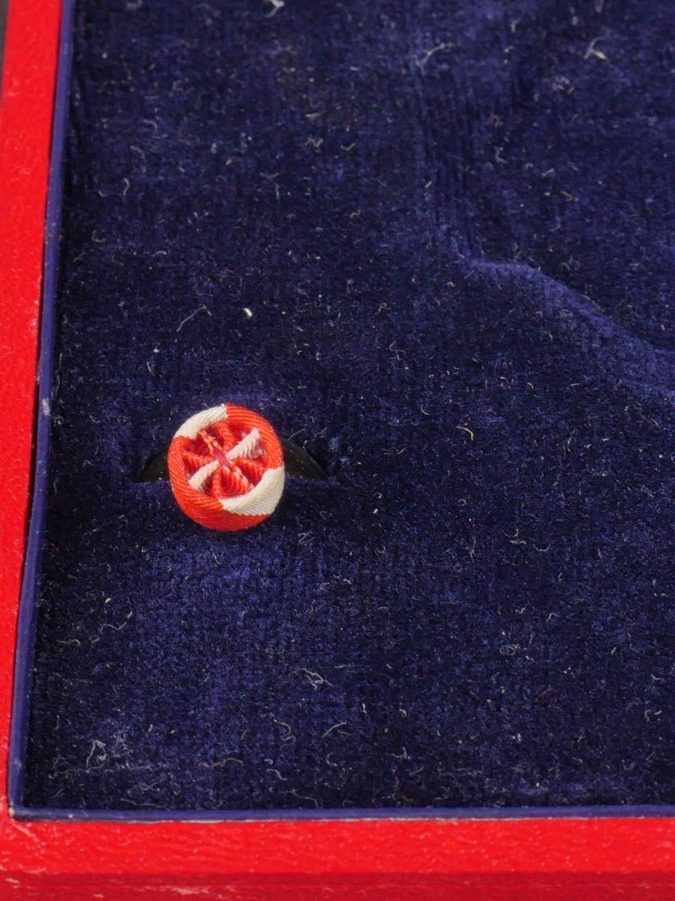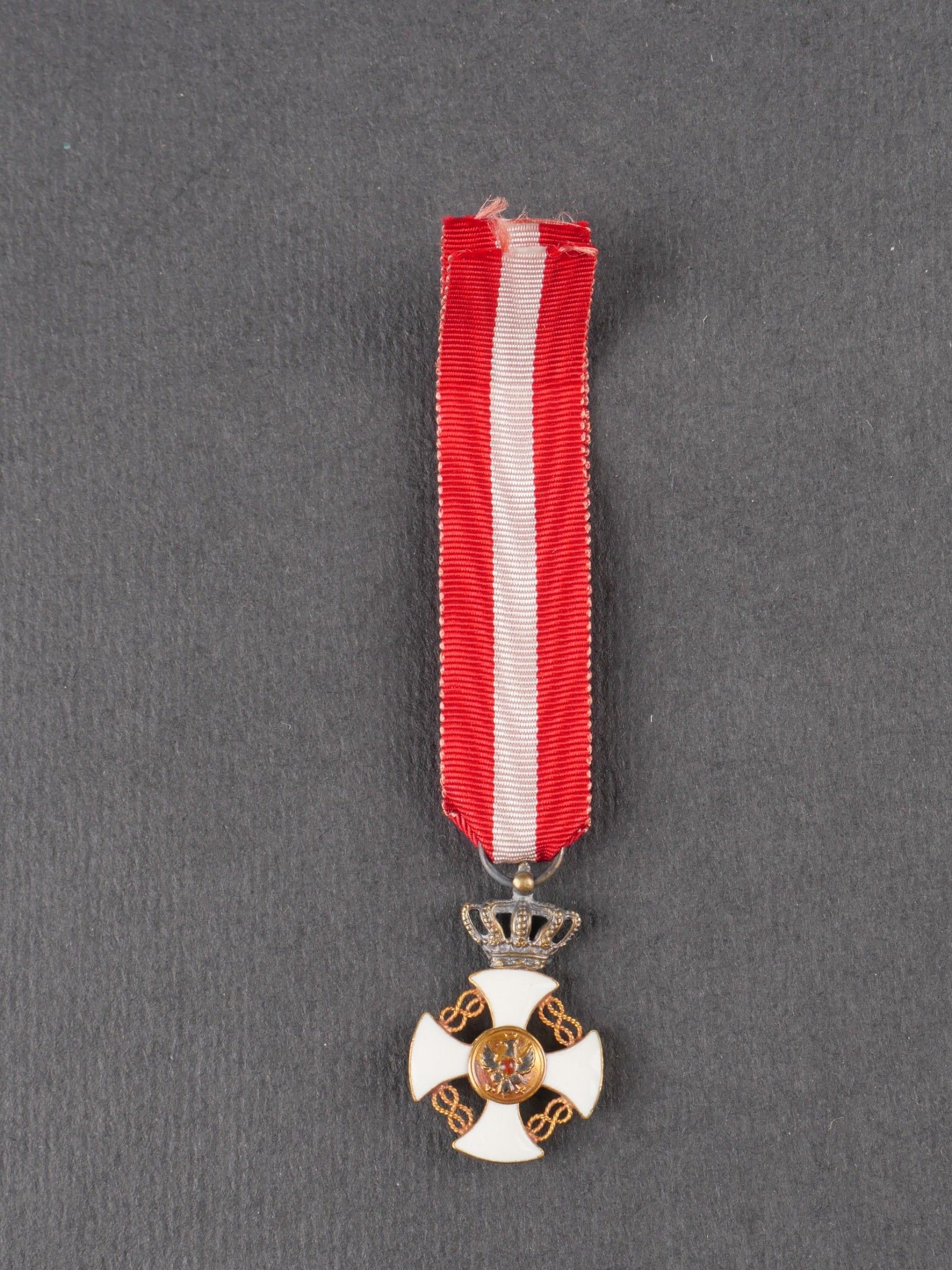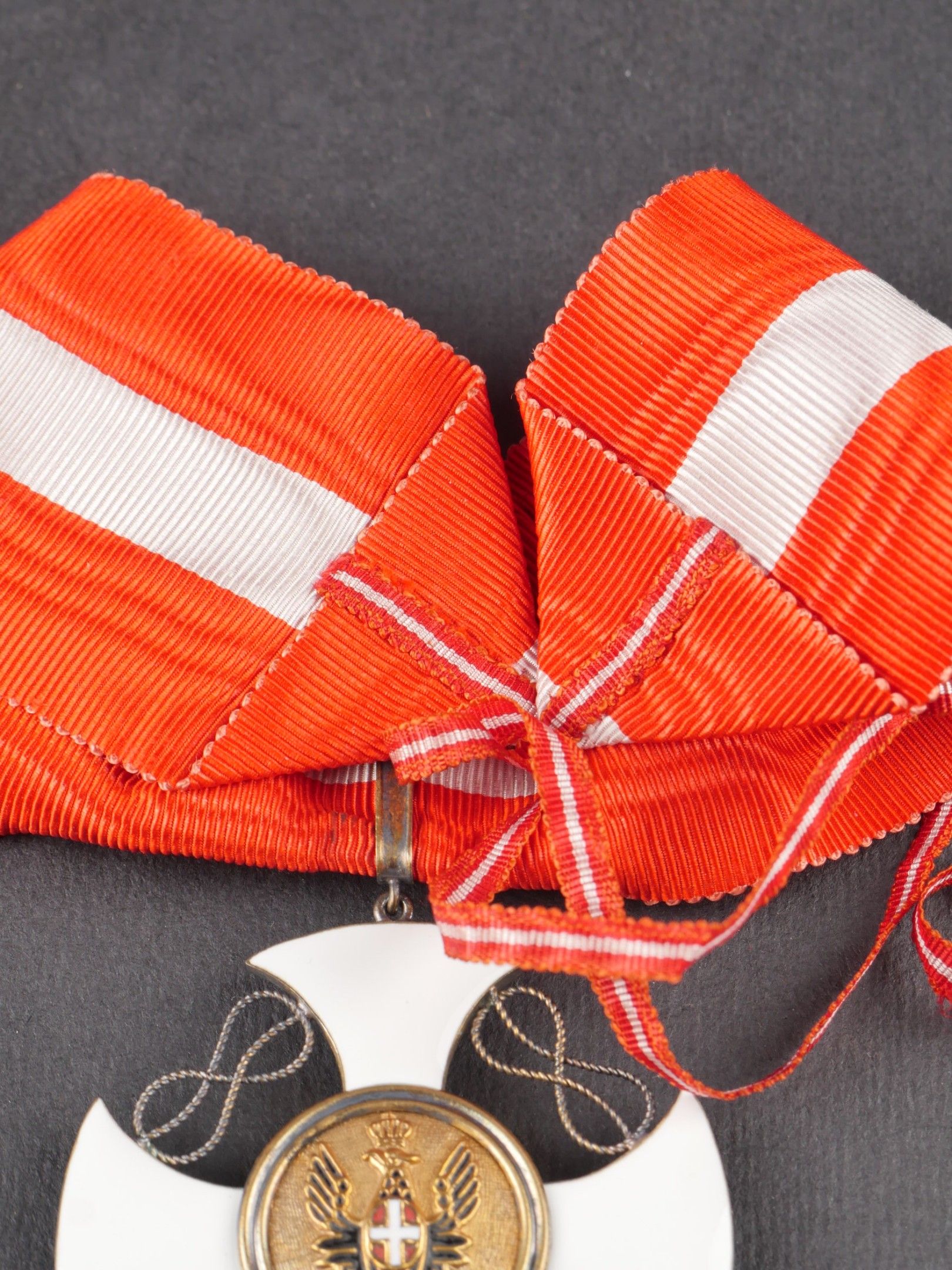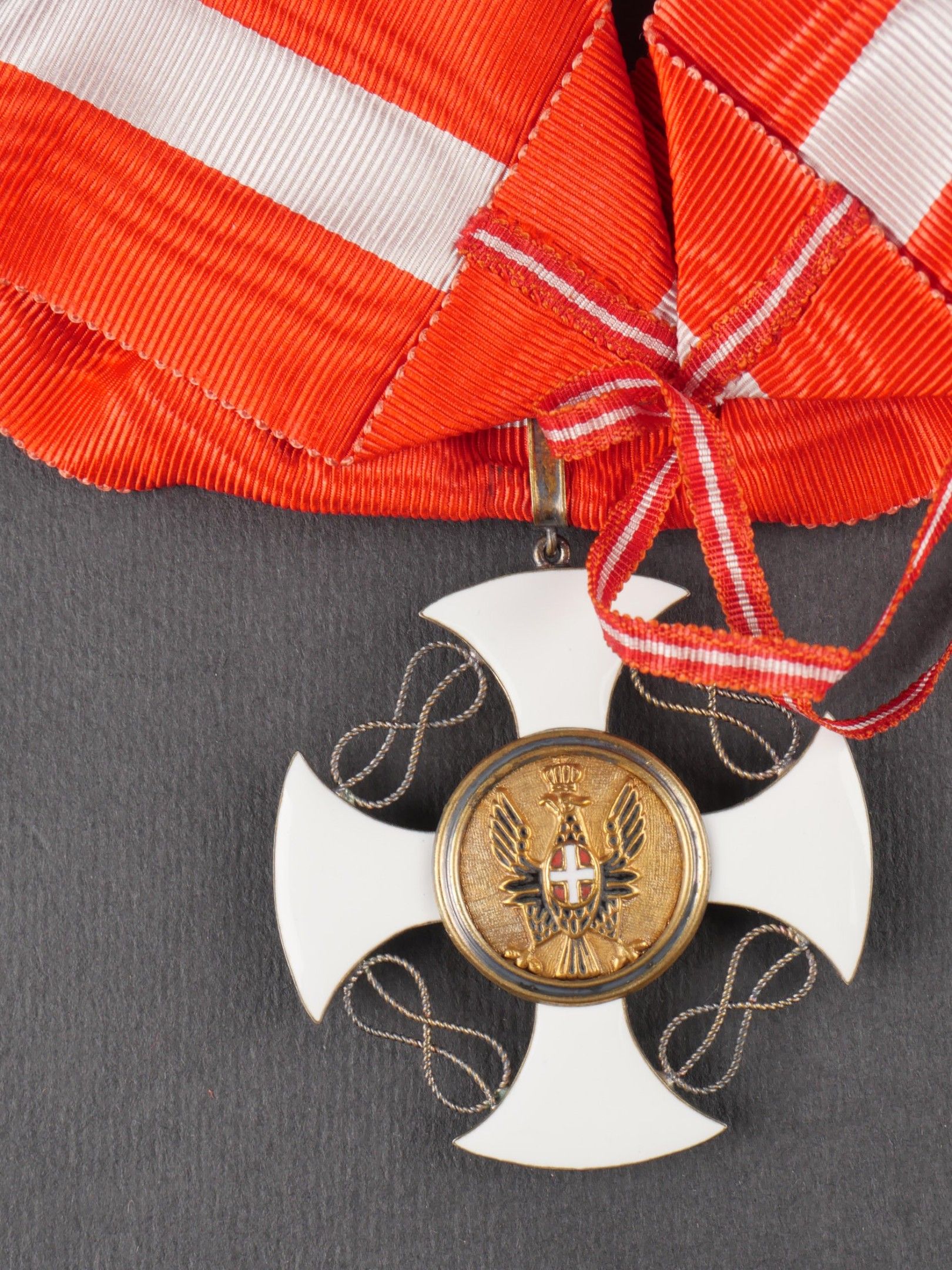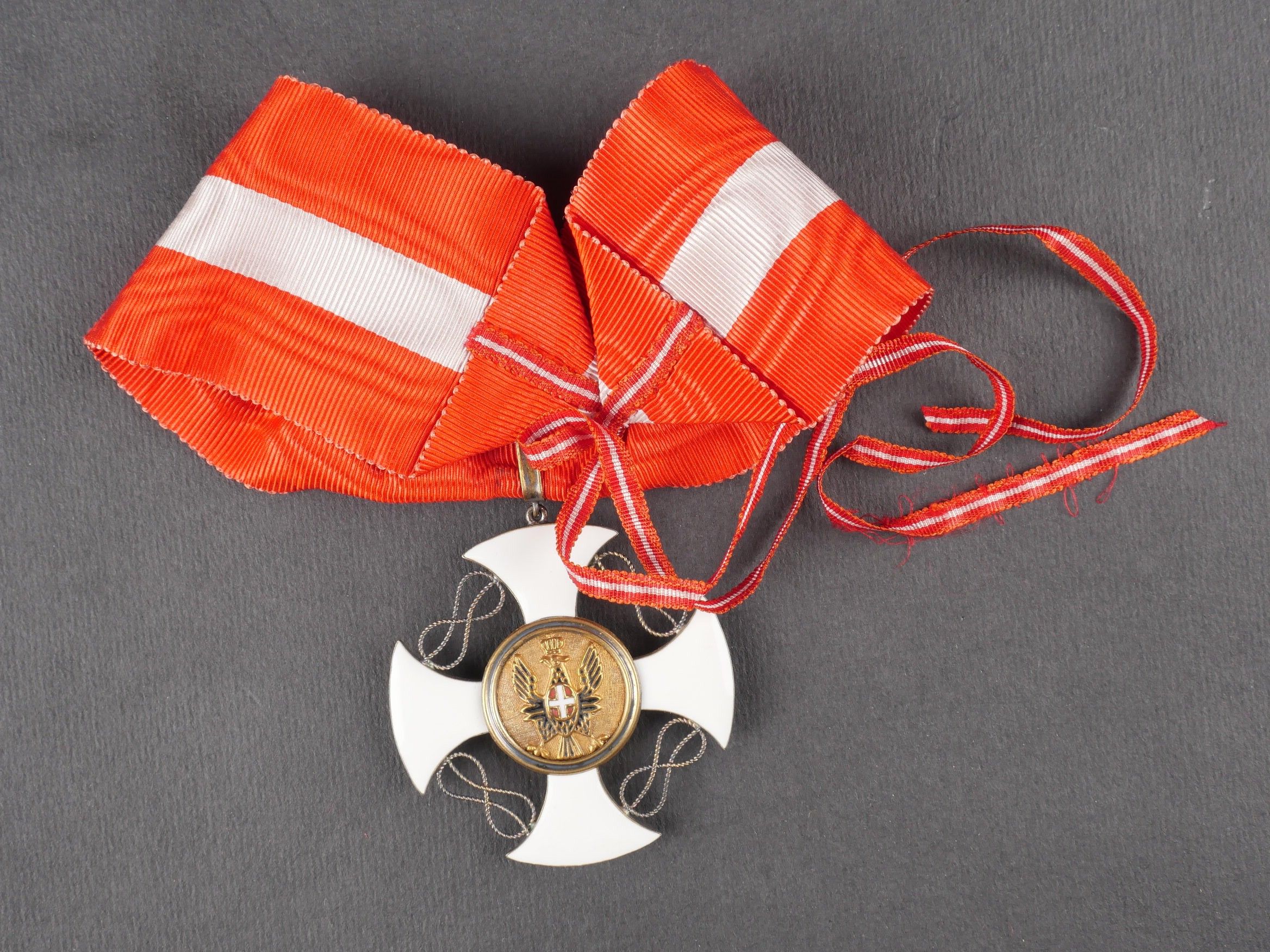 Commander's Cross of the Crown of Italy. Very fine box with EV metal monogram under crown. Interior lined in satinette and blue velvet. Functional clasp. Made by Johson Roma. The gold cross pattée is covered with white enamel. The branches of the cross are linked by four Savoy knot love lakes in braided gold wire. In the centre of the cross, on the obverse, is a gold medallion enamelled blue, featuring the crown of the King of the Lombards. The gold medallion on the reverse features a black-enamelled eagle with the enamelled Savoy cross in its mandorla, heraldic symbols taken from the great arms of the sovereigns of the House of Savoy. The ribbon is tierced with a white stripe between two red stripes. Miniature and buttonhole present. Some wear and patina. Condition II+. Commander's Cross of the Crown of Italy Fine boxed example with raised metallic monogram EV under crown. Interior lined with blue satinette and velvet, functional clasp. Made by Johnson Roma. Rounded gilt cross pattée covered in white enamel. Arms joined by four interlaced love knots Savoy knots in twisted gold wire. Central obverse medallion of blue enamel bearing the crown of the Lombard kings, reverse medallion depicting a black-enamelled eagle bearing the Savoy cross, heraldic symbols of the House of Savoy. Ribbon of one white band between two red bands. Miniature and rosette present. Some wear and patina noted. Condition II+.