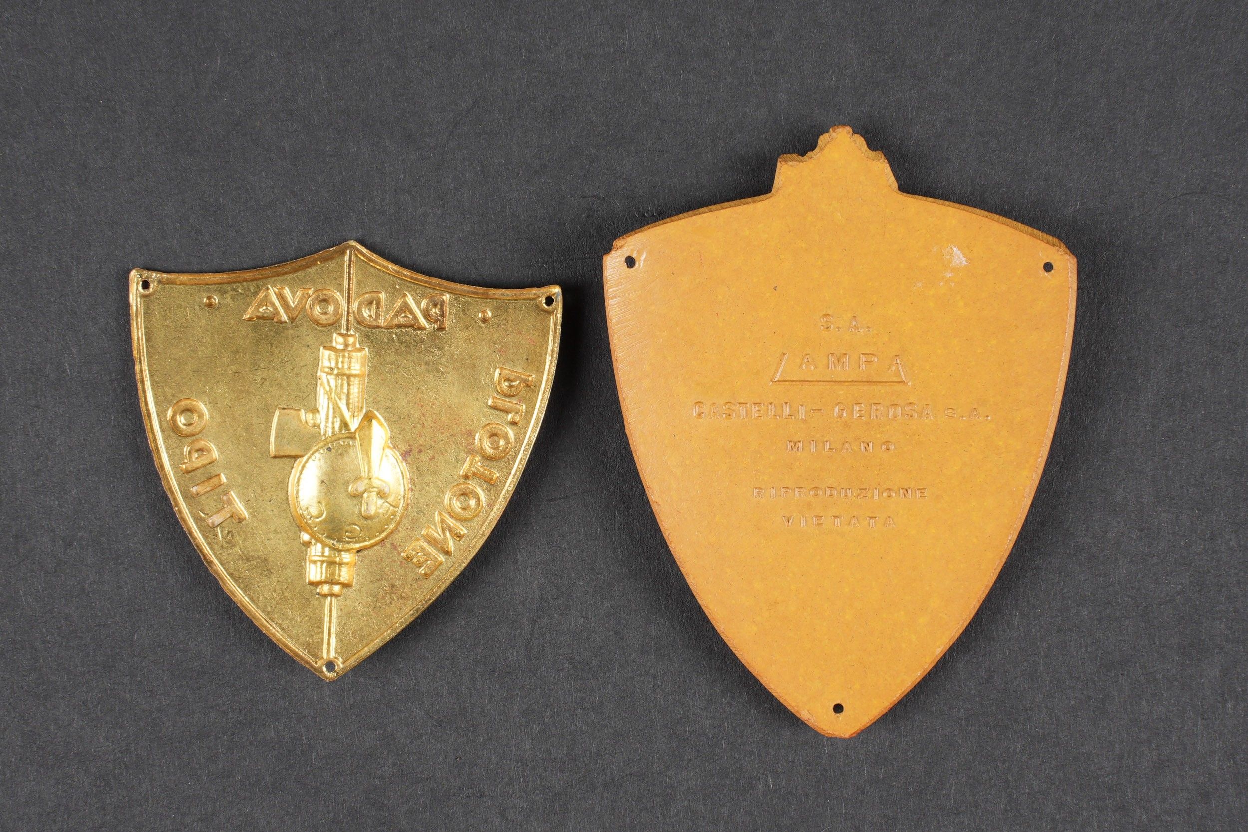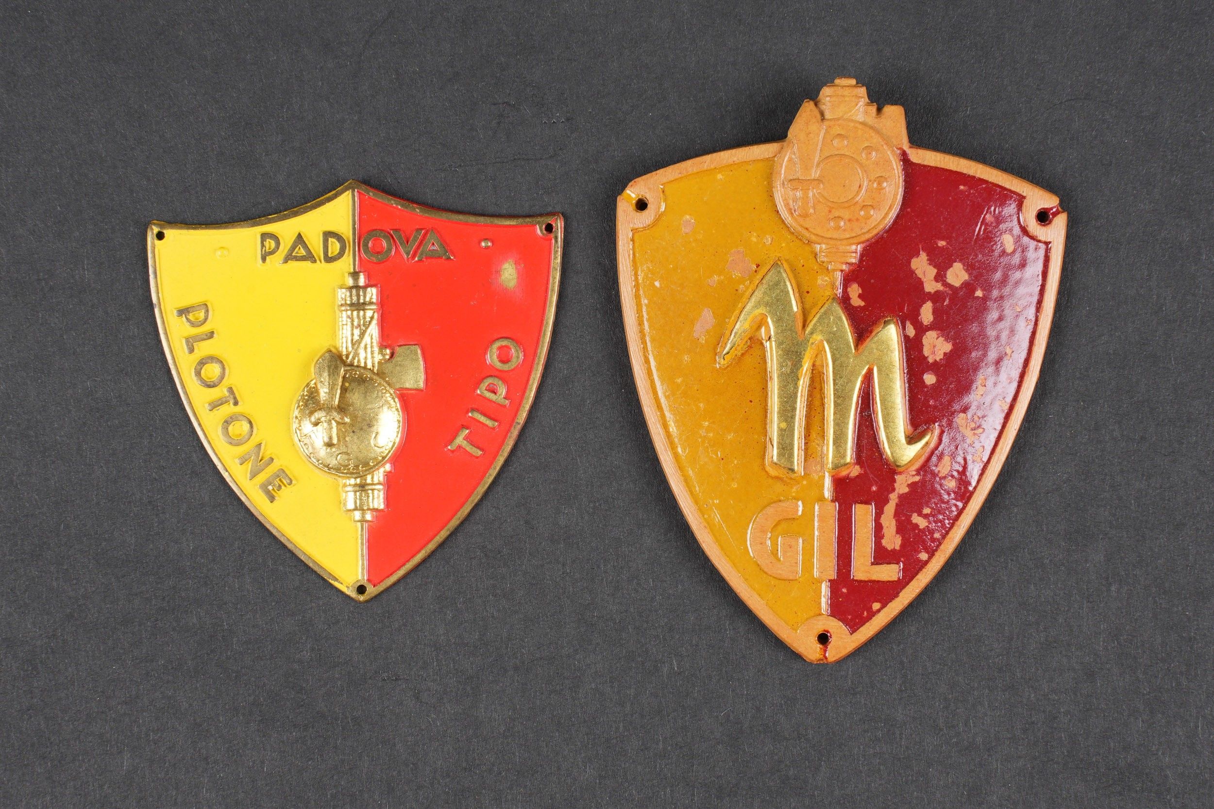 Padova and Gil sleeve badges. Comprising one Padova Plotone Tipo platoon metal handle plate, three fixing points, minor paint loss on left side. A bakelite handle plate of the GIL framing units. Some missing paint in the centre. Three fixing points. Made by Lampa Castelli Gerosa Milano. Some wear and patina. Condition II+. Padova and GIL Sleeve Insignia Includes a metal sleeve plaque for Padova Plotone Tipo with three attachment points, slight paint loss on the left side, and a bakelite sleeve plaque for GIL command units with minor central paint loss. Made by Lampa Castelli Gerosa Milano. Some wear and patina noted. Condition II+.