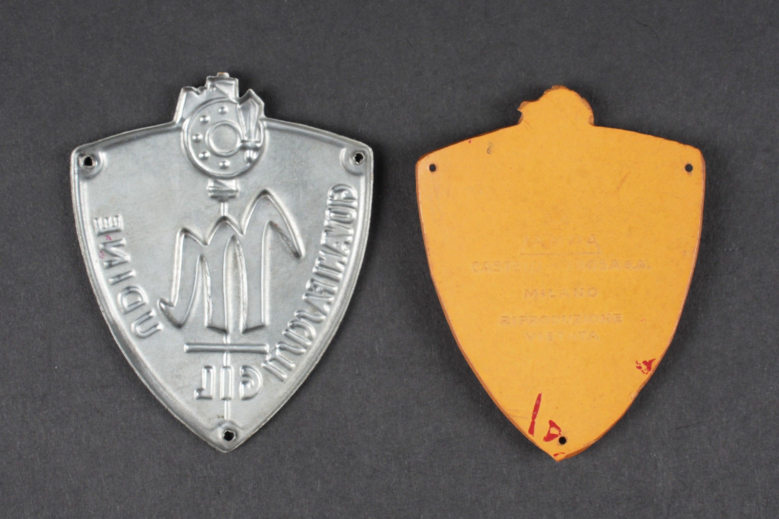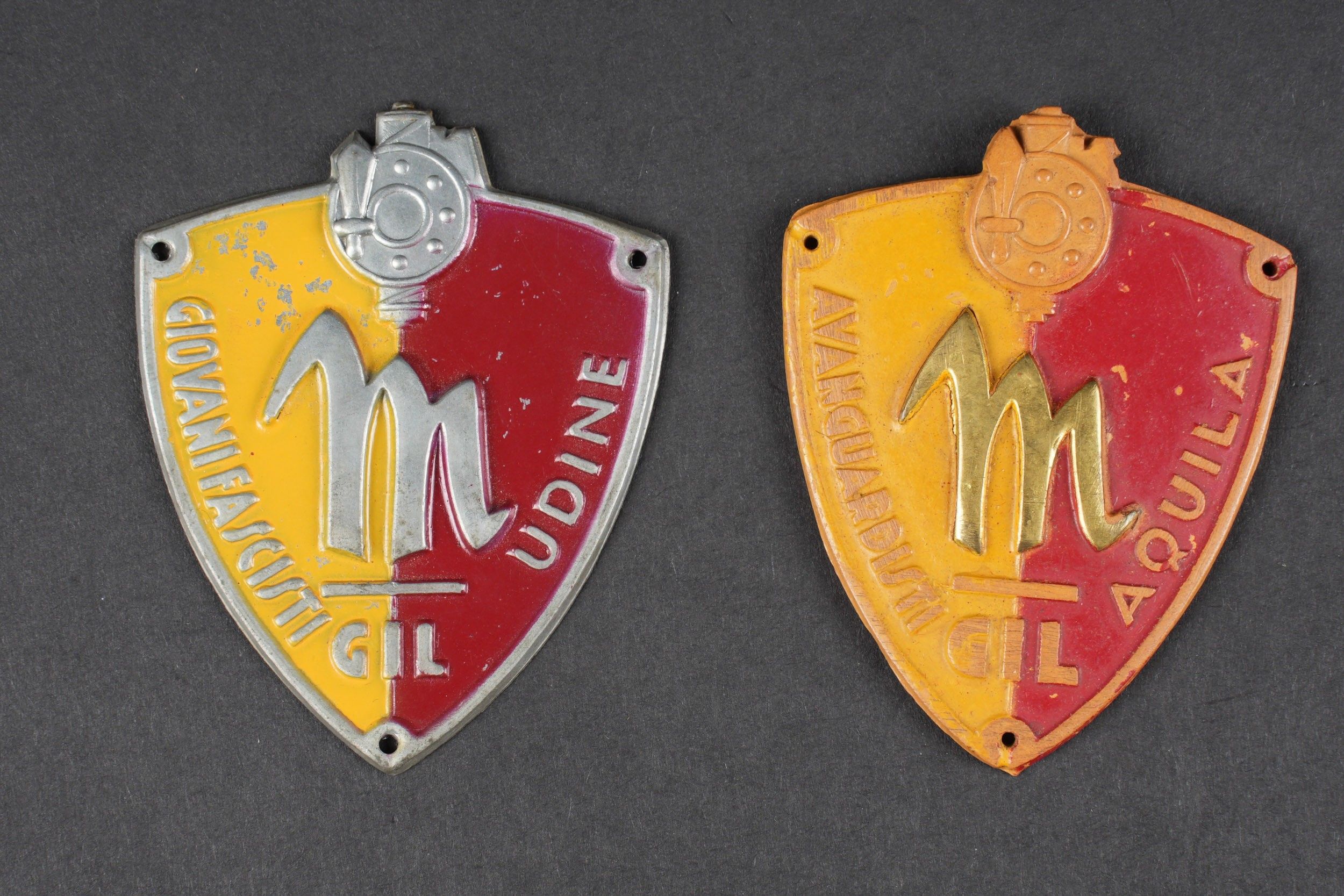 GIL sleeve insignia. Comprising one bakelite plate marked Avanguardisti GIL Aquila, three attachment points, made by Castelli Cerosa Milano. A metal plate, marked Giovanifascisti GIL Udine, a few small paint chips, three attachment points. Some wear and patina. Condition II+. GIL Sleeve Insignia Includes a bakelite plaque marked Avanguardisti GIL Aquila, three attachment points, made by Castelli Cerosa Milano, and a metal plaque marked Giovanifascisti GIL Udine with minor paint chipping, three attachment points. Some wear and patina noted. Condition II+.