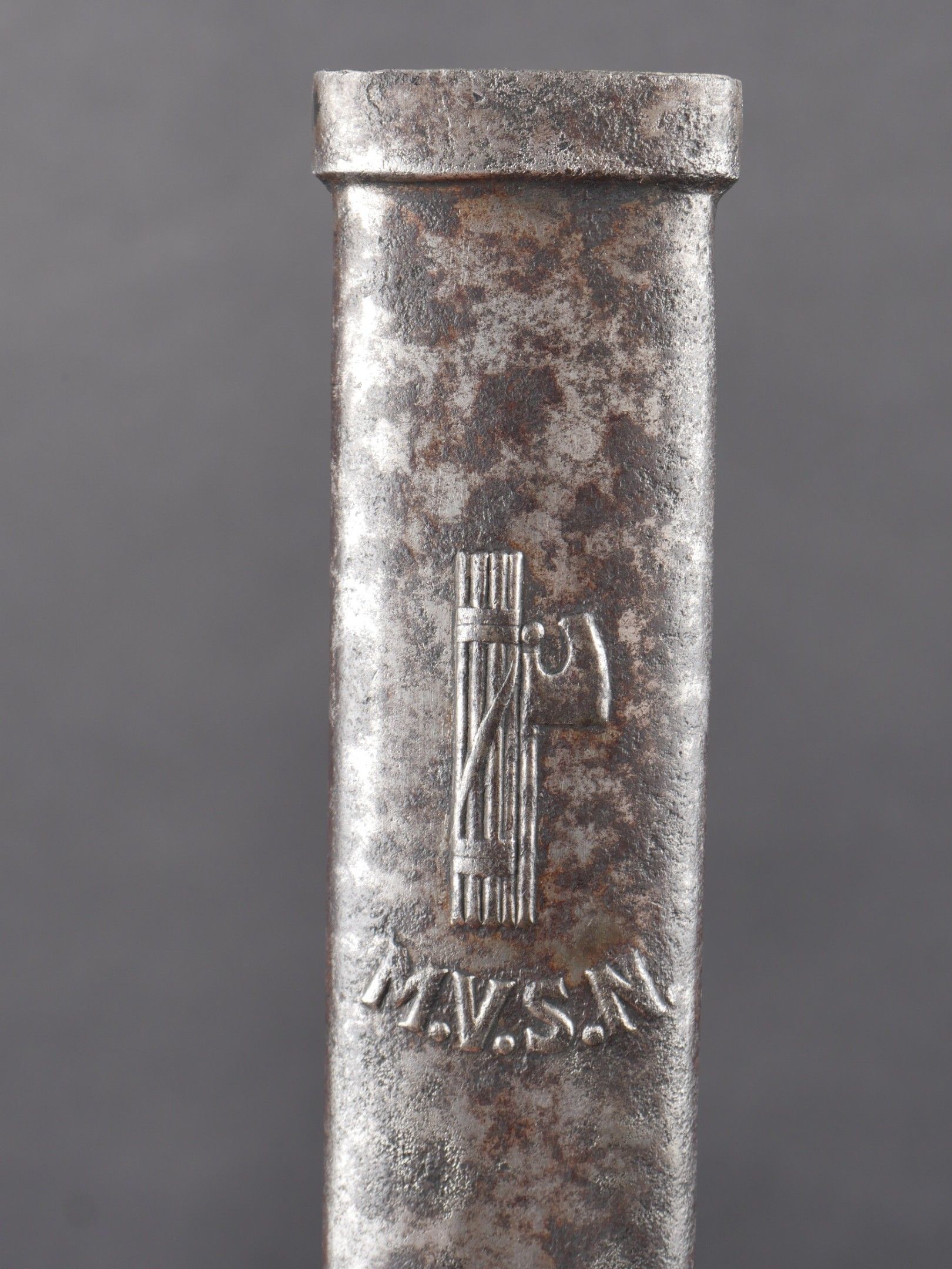 MVSN dagger. Rare model with orange bakelite handle. Oxidised scabbard, but clearly marked MVSN. Beautiful full-length blade. Some wear and oxidation. Condition II+. MVSN Dagger Rare model with orange bakelite handle. Scabbard oxidized but clearly marked MVSN. Fine blade, complete in length. Some wear and oxidation noted. Condition II+.