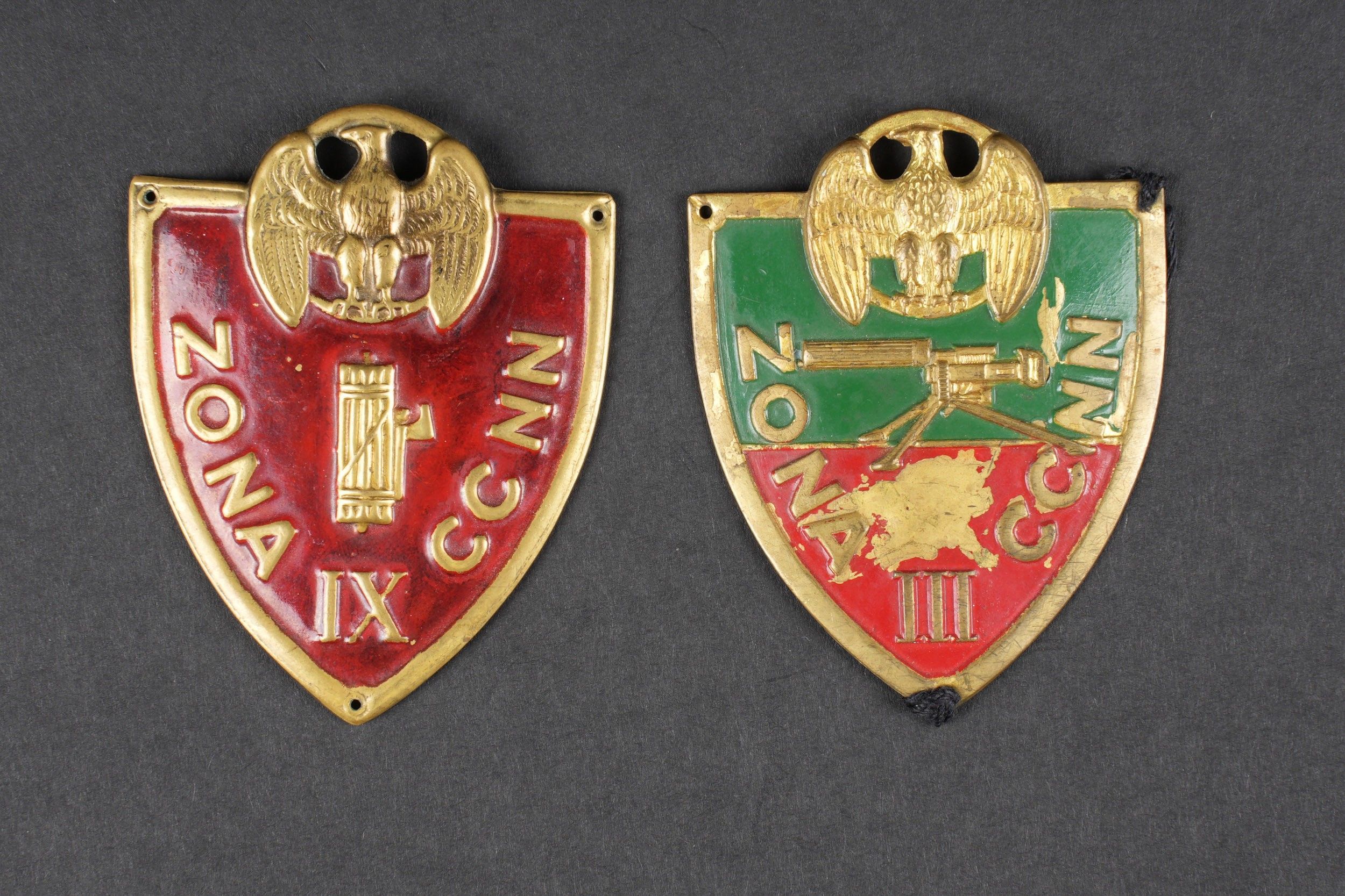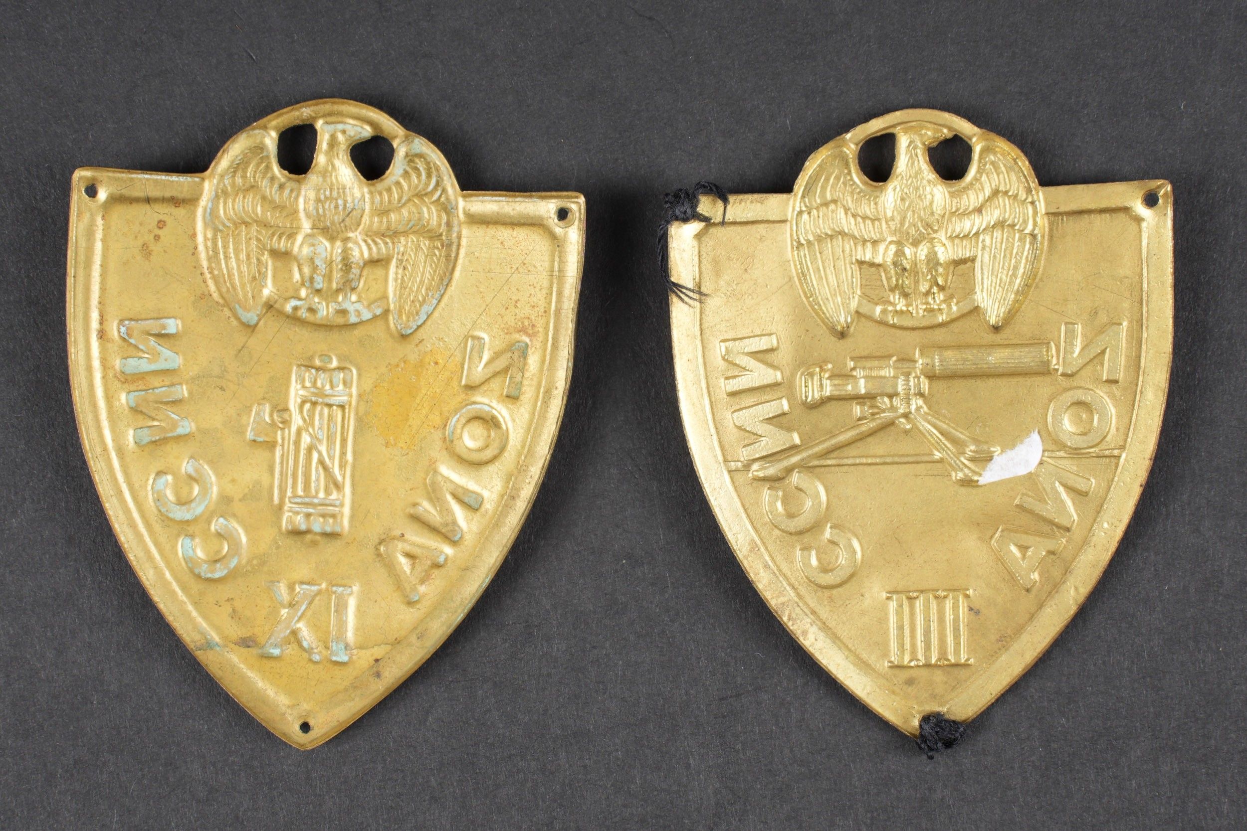 MVSN sleeve insignia. Comprising a metal sleeve plate of the 3rd Legion MVSN machine gunner group, some paint missing from the centre, visibly disassembled from a jacket. A handle plate of the 9th Legion, three fixing points. Some wear and patina. Condition II+. MVSN Sleeve Insignia Includes a metal plaque for the machine-gun group of the 3rd Legion, MVSN, with minor paint losses at the centre, possibly removed from a tunic, and a plaque of the 9th Legion with three attachment points. Some wear and patina noted. Condition II+.