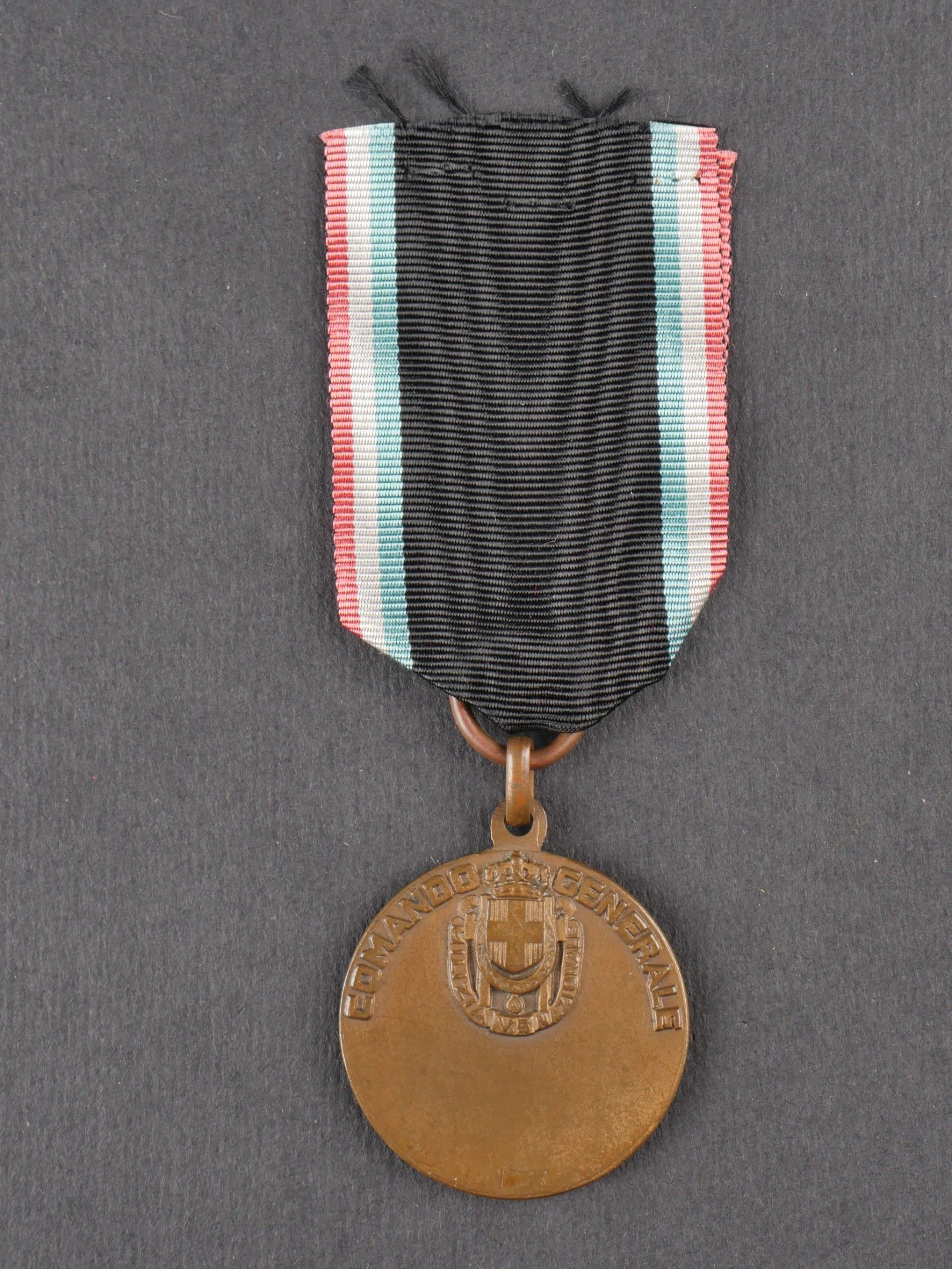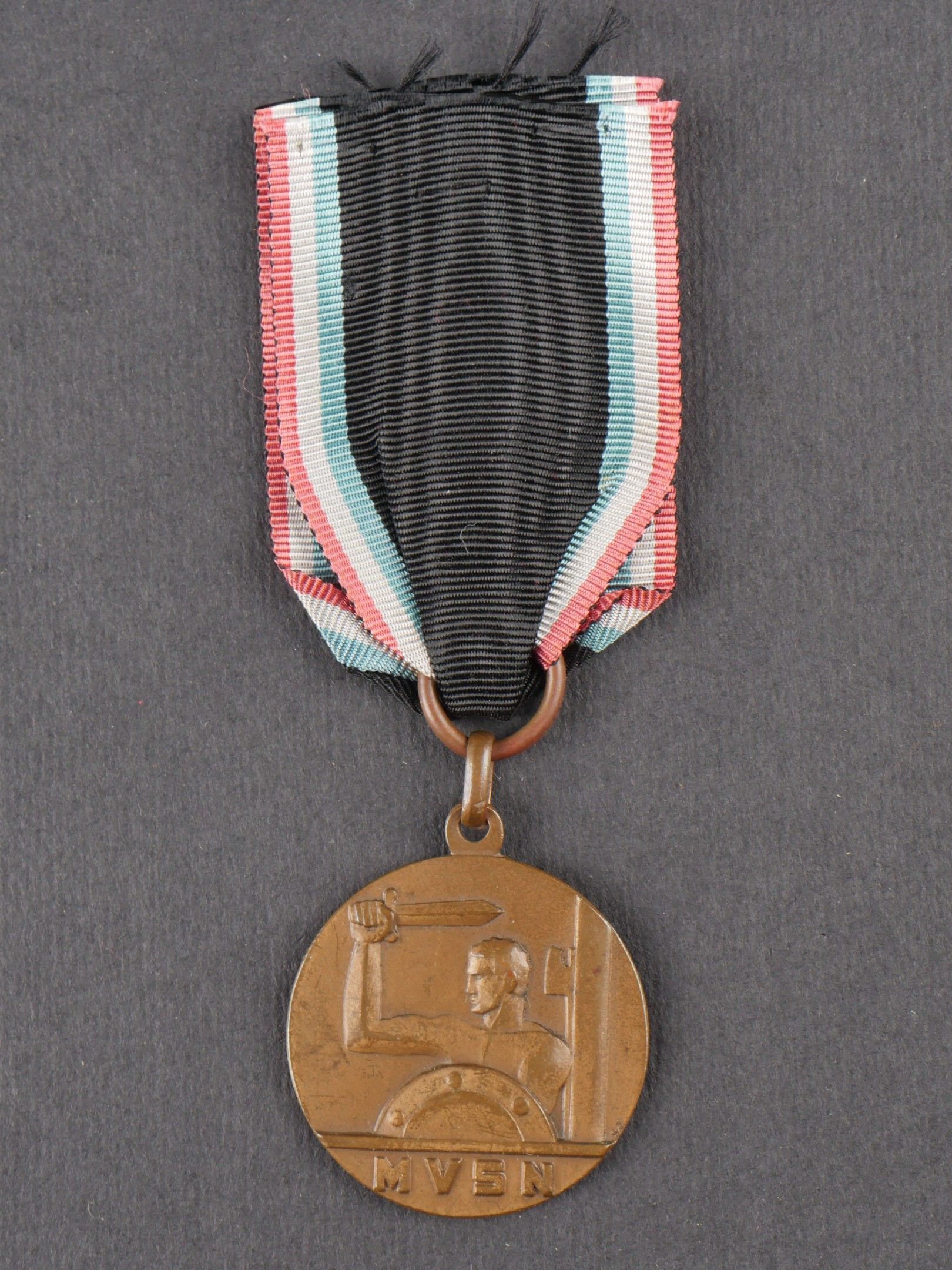 MVSN General Command Medal. Silver. Obverse depicting a man raising his right arm and holding a sword, his left hand resting on a shield, to the right a large bundle and the inscription MVSN below. Reverse showing a shield surrounded by the legend MILIZIA V.S. NAZIONALE, with the words COMMANDO to the left and GENERALE to the right. Complete ribbon. Some wear and patina. Condition II+. MVSN General Command Medal Silver medal. Obverse depicts a man raising his right arm and holding a sword, left hand resting on a shield, with a large fasces and the inscription MVSN below. Reverse shows a shield surrounded by the legend MILIZIA V.S. NAZIONALE, with COMMANDO to the left and GENERALE to the right. Complete ribbon. Some wear and patina noted. Condition II+.