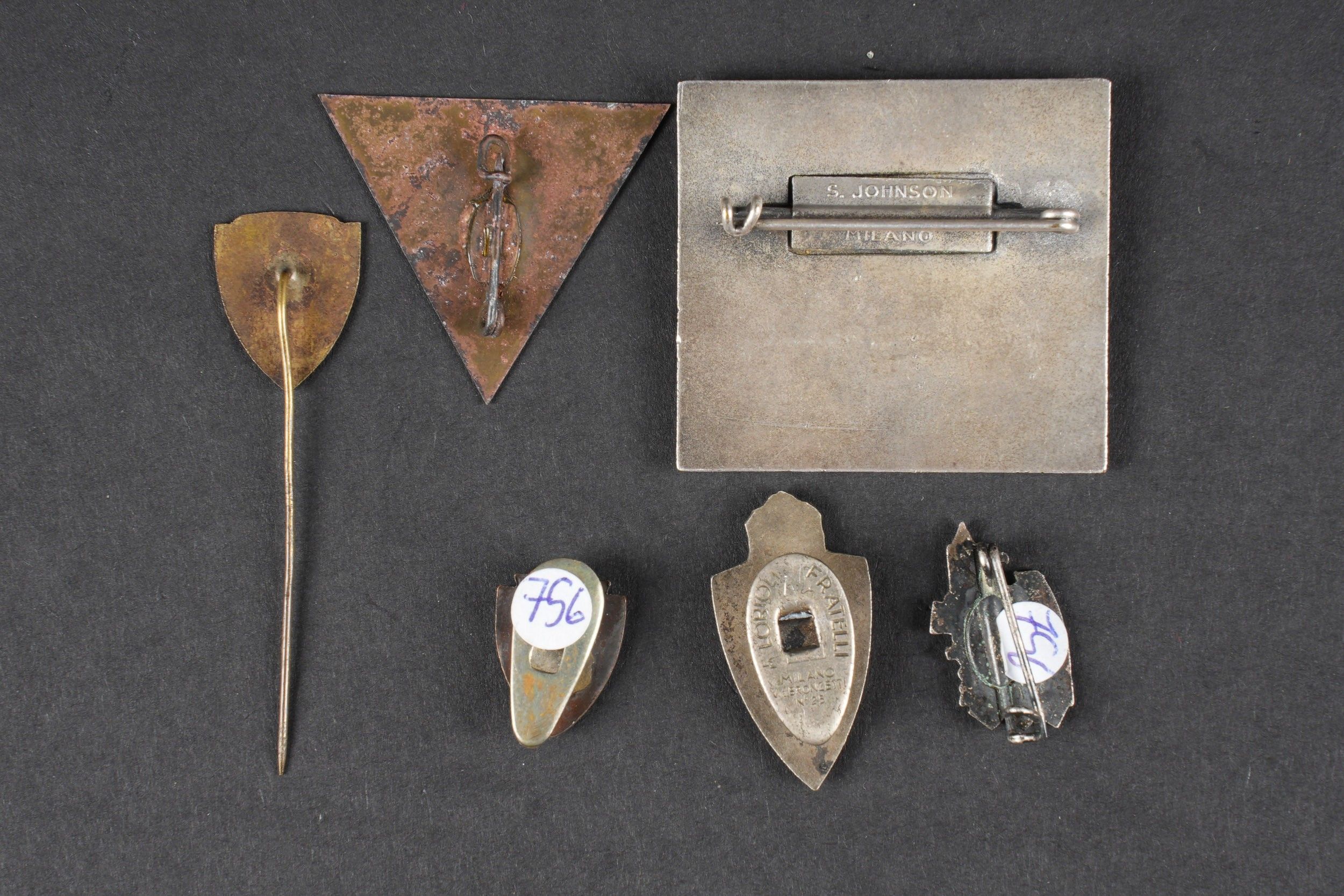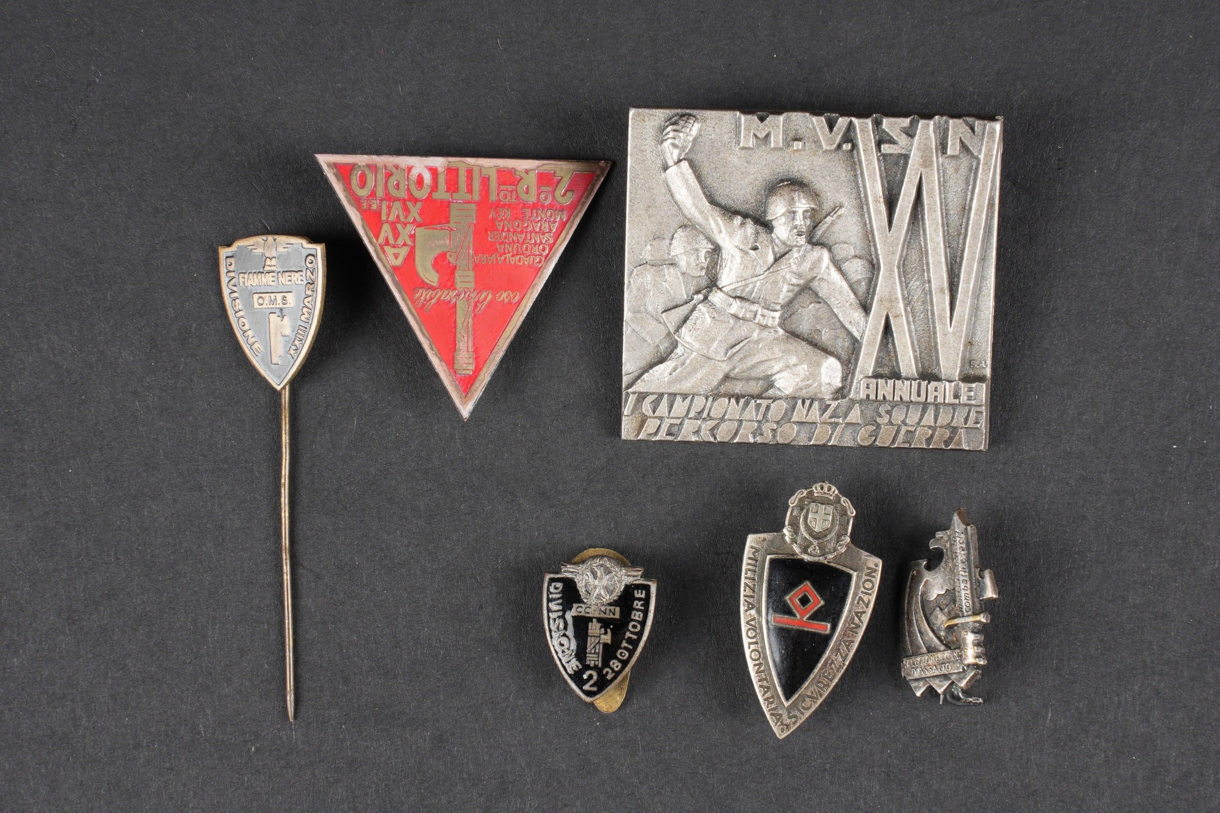 MVSN badges. Comprising a pin marked Divionne XXIII Marzo, attachment complete. A painted metal badge, some missing paint visible, marked 2R Littorio, fastening complete, back of piece oxidised. An enamelled metal button badge, marked Divisionne 2 28 Ottobre. A metal badge MVSN XV Annuale I Campionato Naz A Squadre Percorso di Guerra, full attachment, S Johnson Milano manufacture. An enamelled metal button badge, marked Milizia Volontaria, made by Loriolli Milano. A metal badge, complete with clip. Some wear and patina. Condition II+. MVSN Insignia Includes a pin marked Divionne XXIII Marzo with complete attachment, a painted metal badge with minor paint losses, marked 2R Littorio, complete attachment, oxidized reverse, an enameled metal lapel badge marked Divisione 2 28 Ottobre, a metal badge marked MVSN XV Annuale I Campionato Naz. a Squadre Percorso di Guerra, complete attachment, made by S. Johnson Milano, an enameled lapel badge marked Milizia Volontaria, made by Lorioli Milano, and one additional complete metal badge. Some wear and patina noted. Condition II+.
