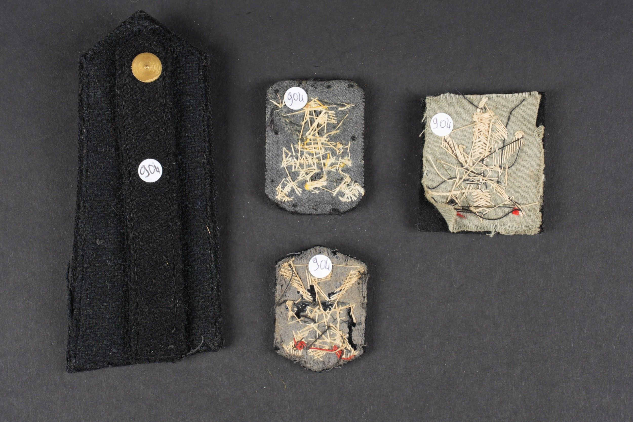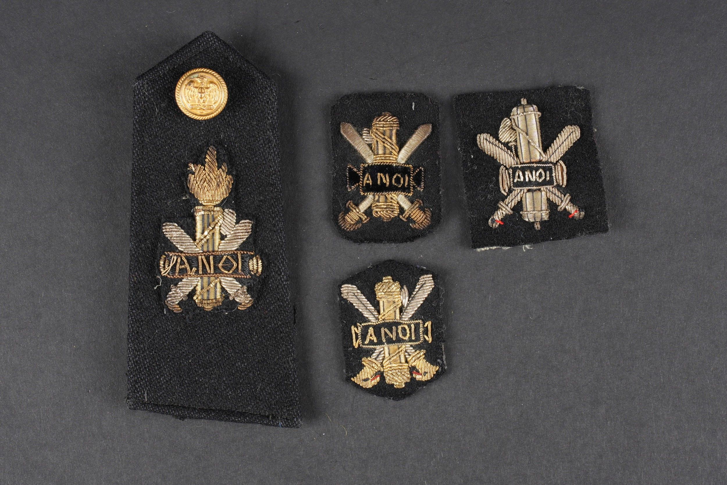 MVSN badges. Comprising three different designs of cloth insignia, black background, and cannetille insignia. One shoulder tab in black cloth, insignia in cannetille, gold button present. Some wear and patina. Condition II+. MVSN Insignia Includes three different cloth insignia on black background with gold bullion embroidery, and one black cloth shoulder board with gold bullion insignia and gilt button. Some wear and patina noted. Condition II+.
