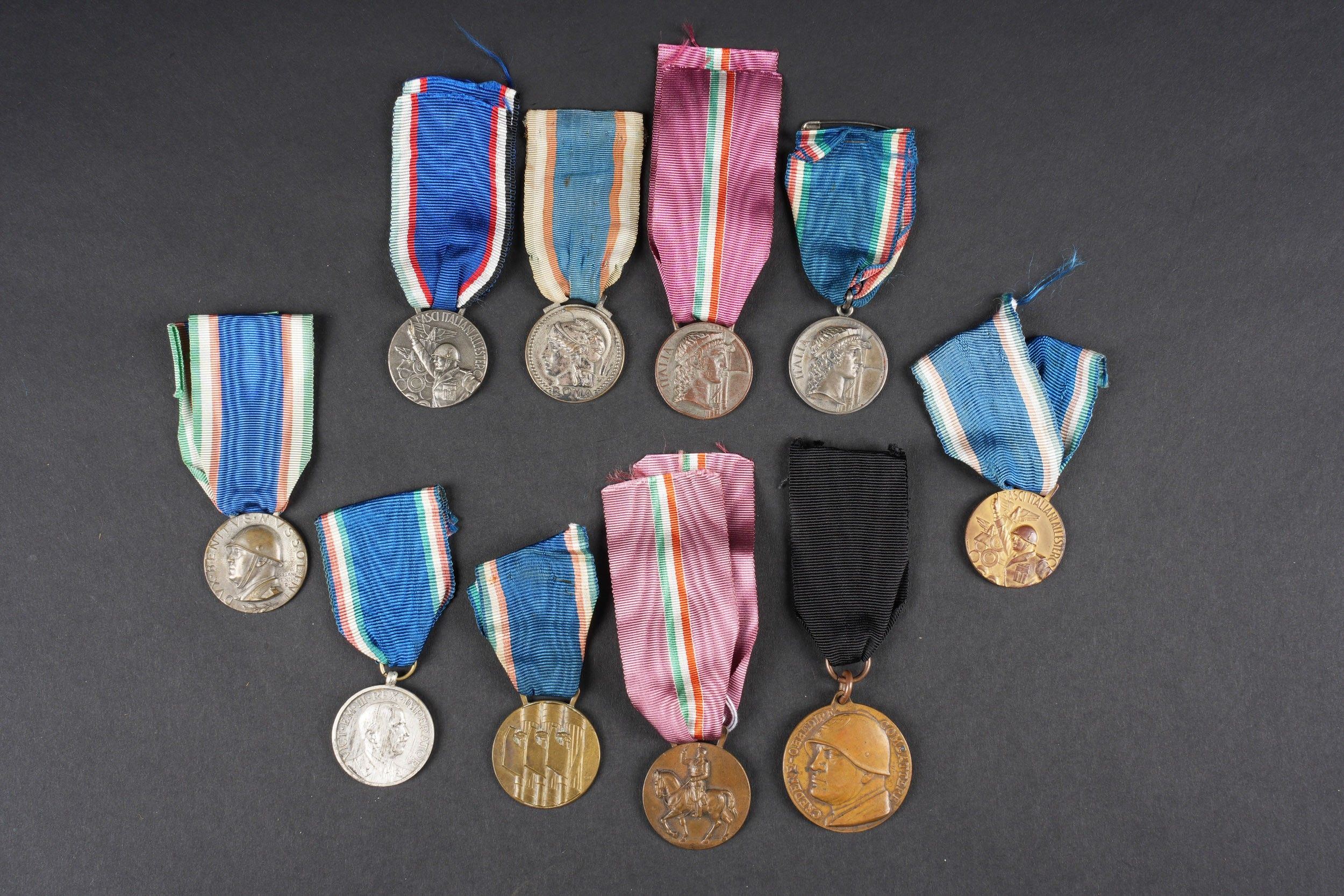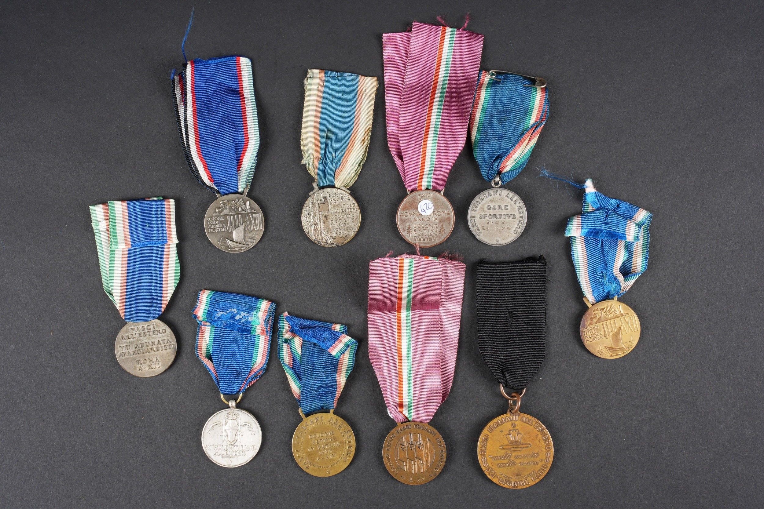 Medals of the Jeunesses Italiennes du Licteur abroad. 10 metal medals, the ribbons are present. Various models and manufacture. Some wear and patina to be noted. Condition II+. Medals of the Italian Youth of the Lictor Abroad Ten metal medals, all with ribbons present. Various designs and makers. Some wear and patina noted. Condition II+.