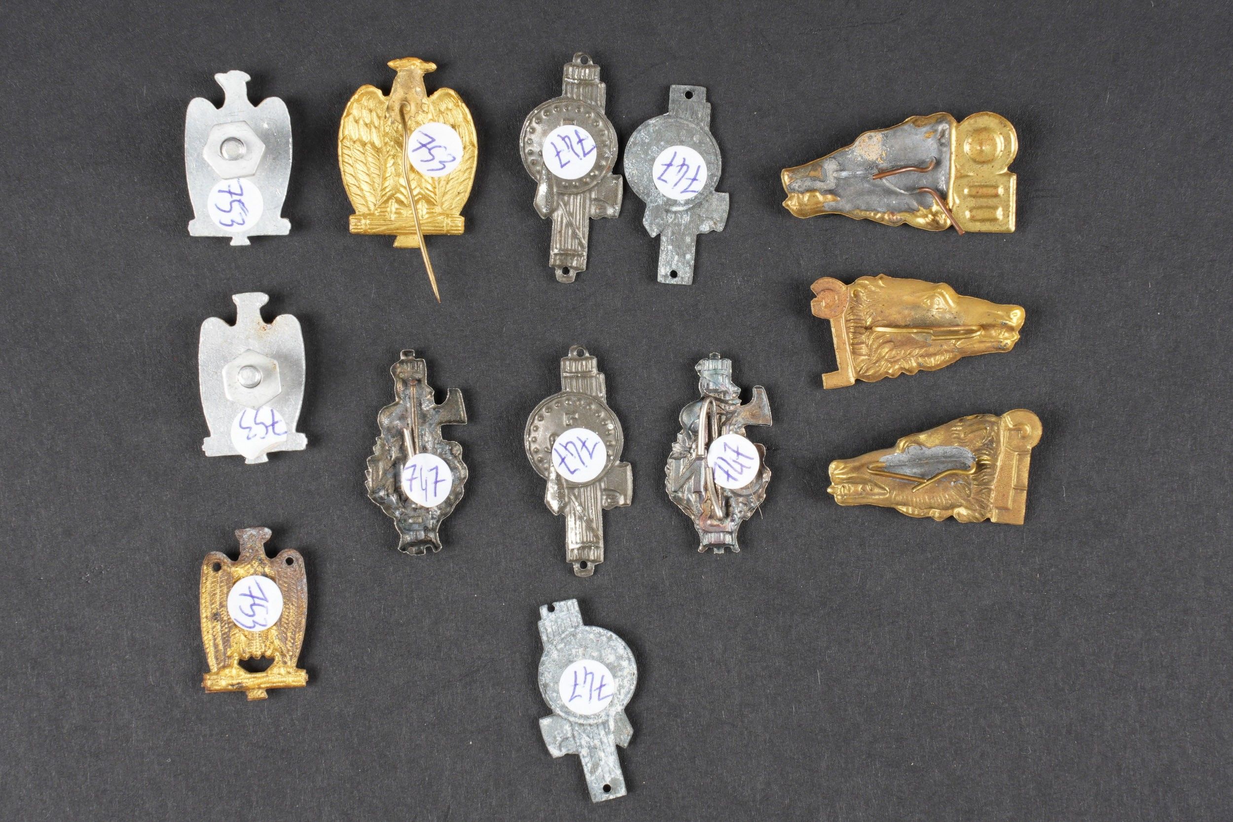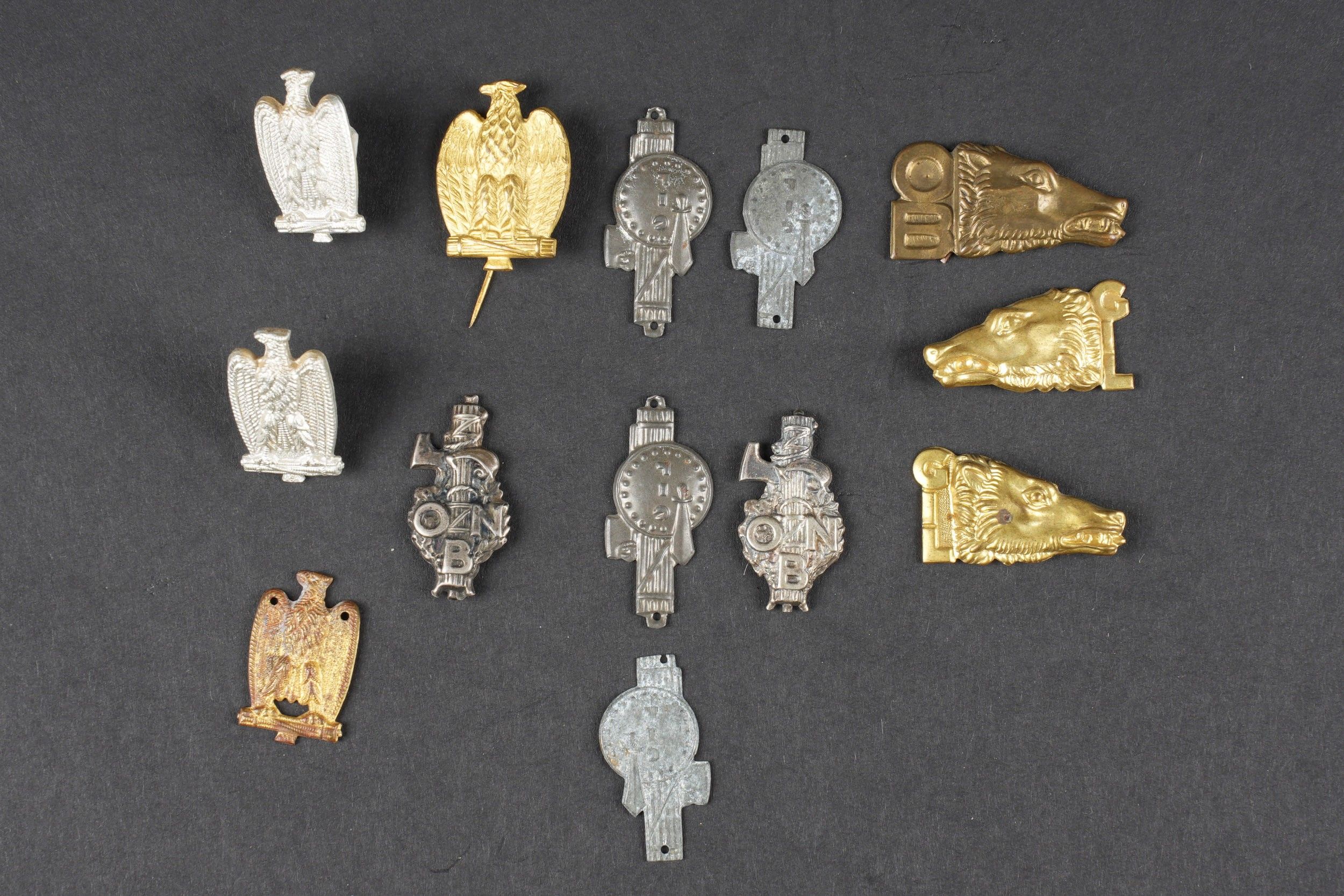Fascist Youth collar badge. Comprising 13 metal badges, most of the fastenings are present. Some GIL and ONB models. Some wear and patina to be noted. Condition II+. Fascist Youth Collar Insignia Thirteen metal insignia, most with attachments intact. Includes several GIL and ONB models. Some wear and patina noted. Condition II+.