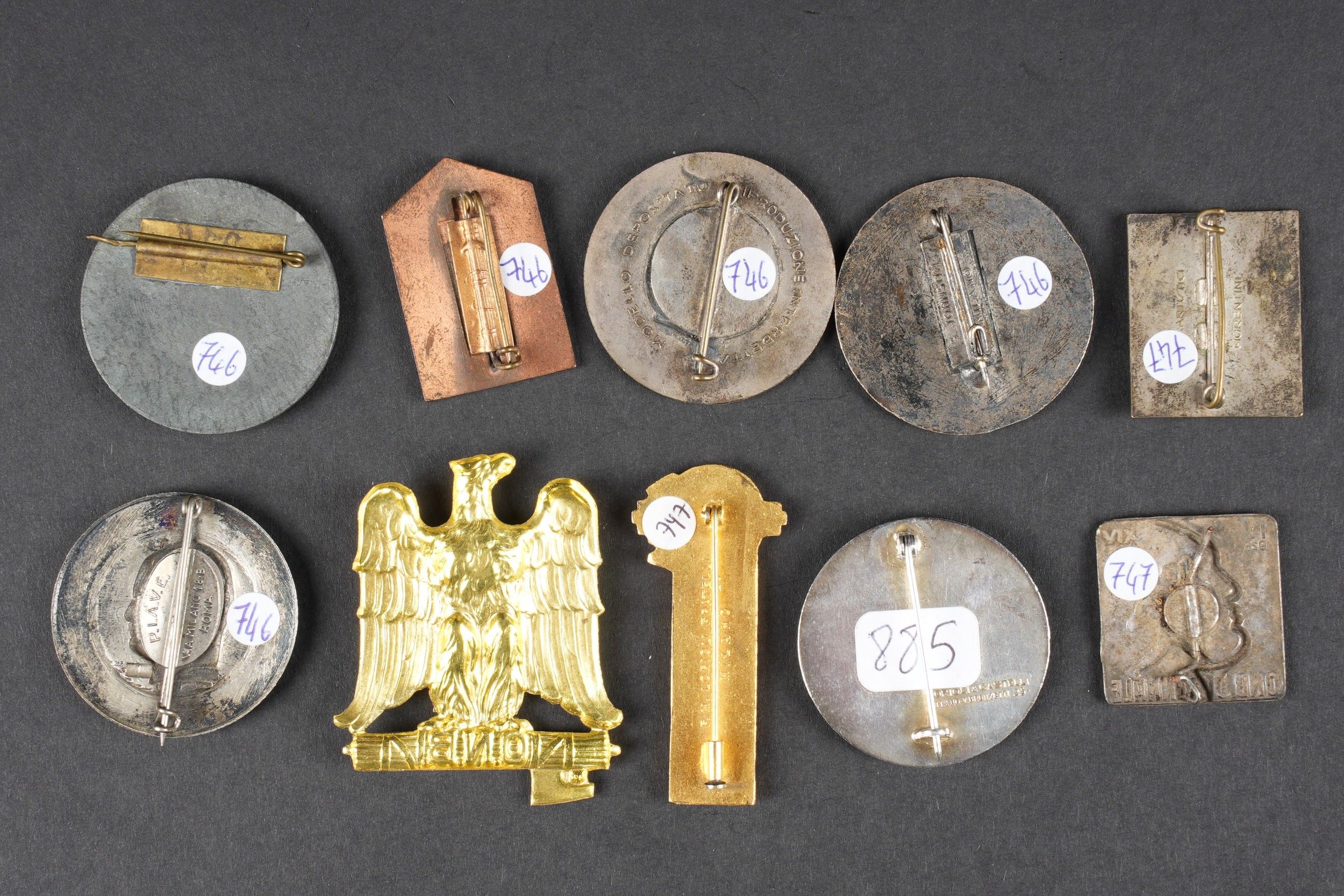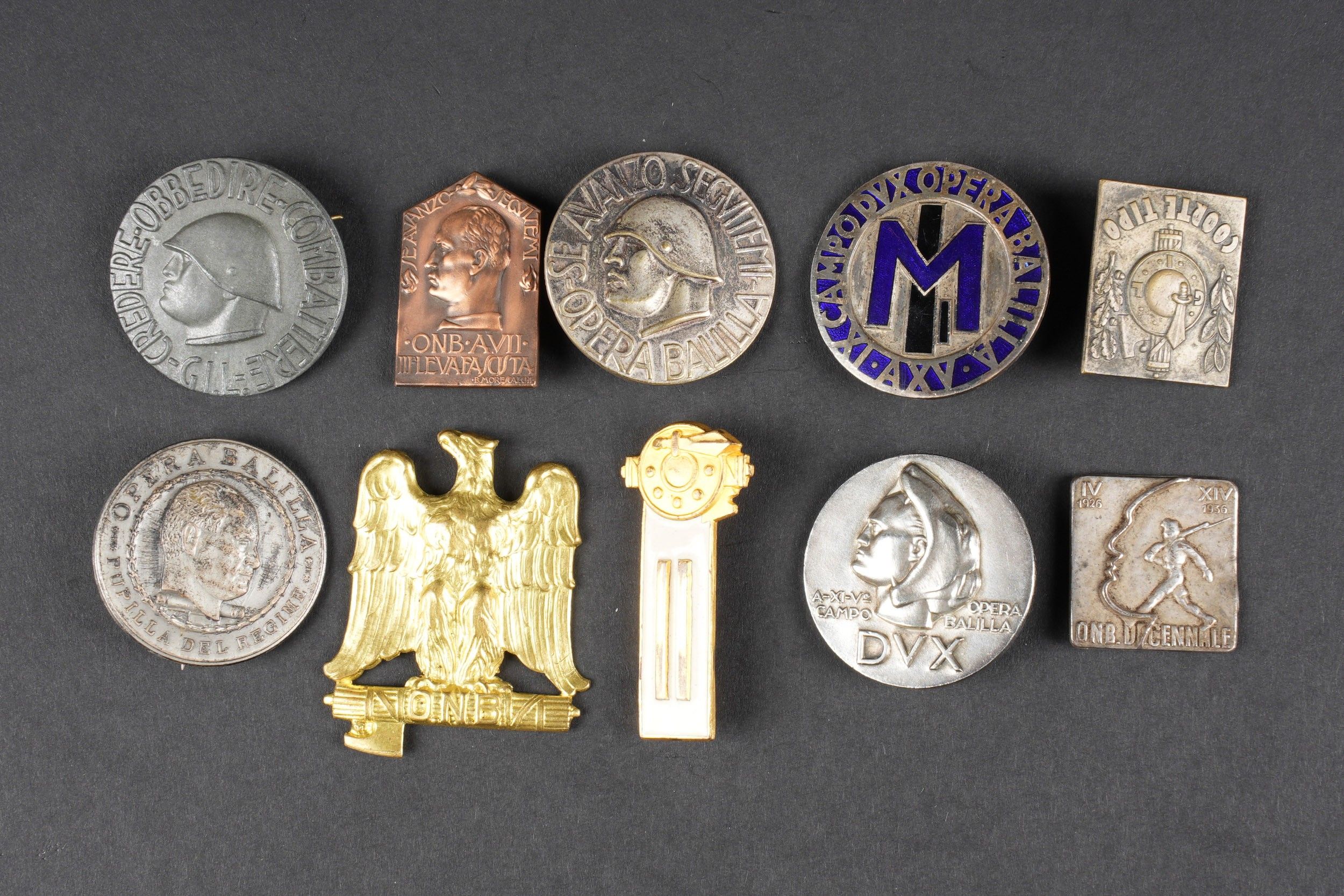 Badges of the Fascist Youth, GIL and ONB. Comprising ten metal badges, all fastenings present. Manufacture various. One clip is incomplete. Some wear and patina to be noted. Condition II+. Fascist Youth, GIL, and ONB Insignia Ten metal insignia, all with attachments intact. Various makers. One attachment incomplete. Some wear and patina noted. Condition II+.