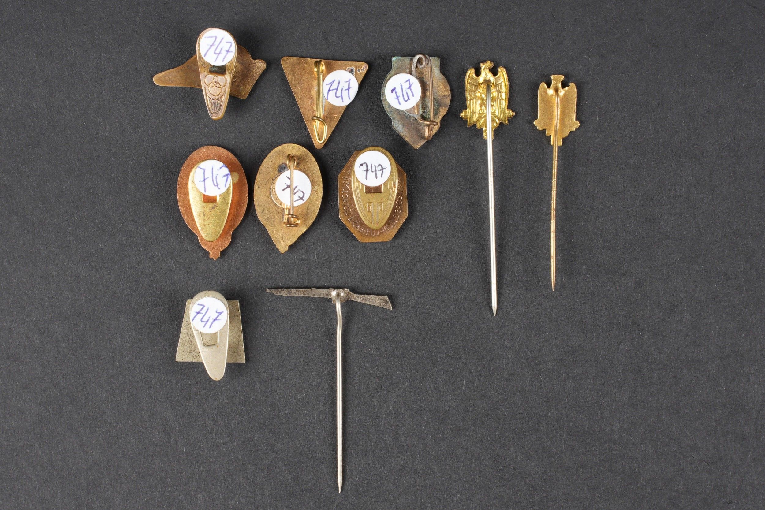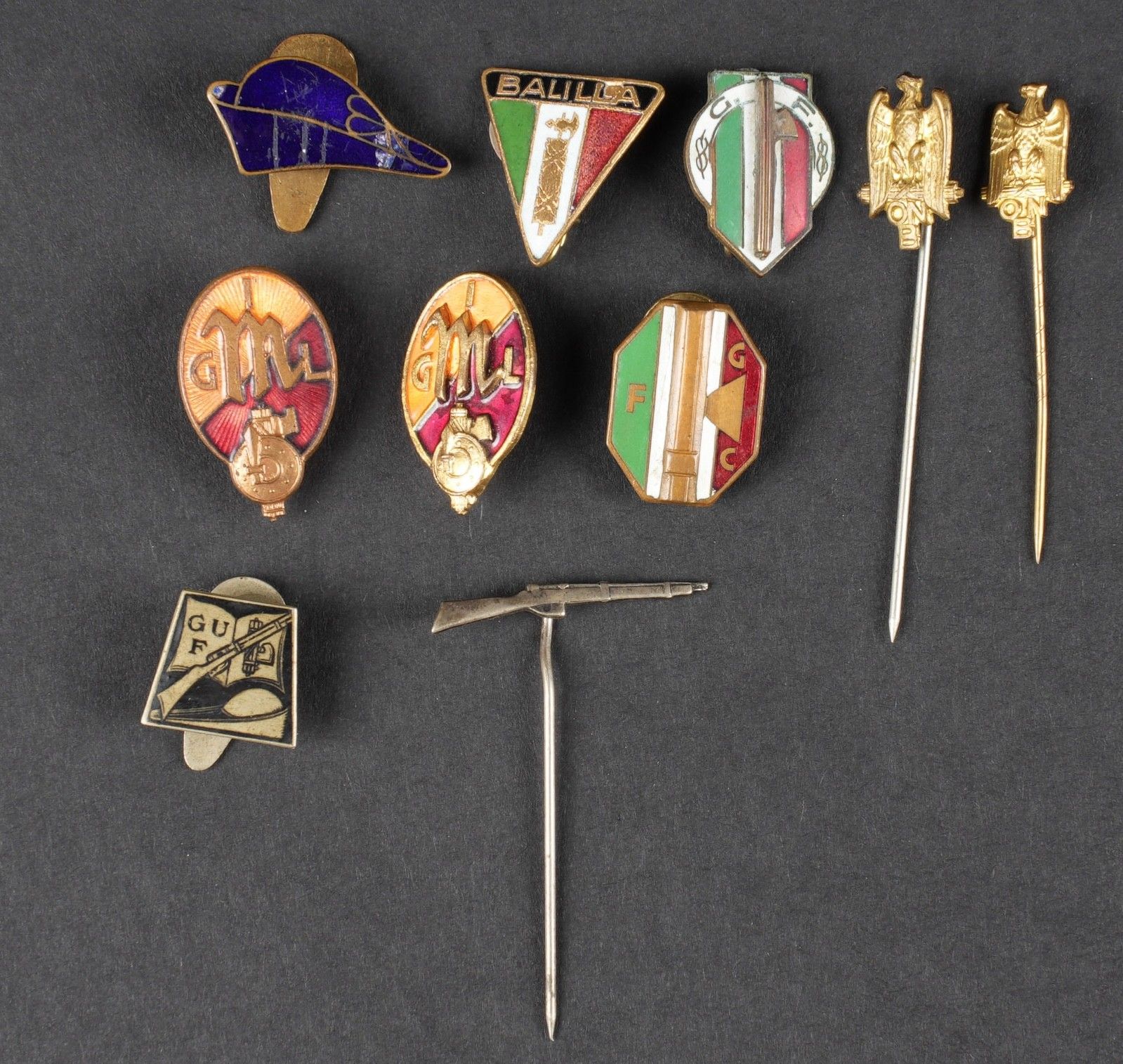 Badges of the Fascist Youth, GIL, GUF and ONB. Comprising ten metal badges, all fastenings present. Manufacture various. Some wear and patina to be noted. Condition II+. Fascist Youth, GIL, GUF, and ONB Insignia Ten metal insignia, all with attachments intact. Various makers. Some wear and patina noted. Condition II+.