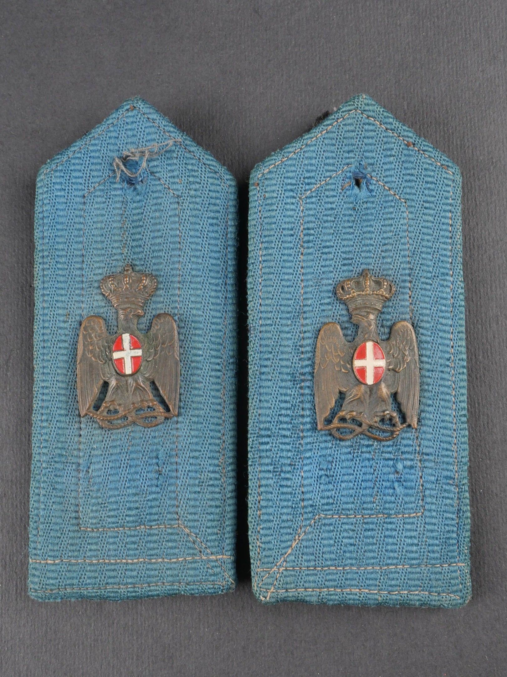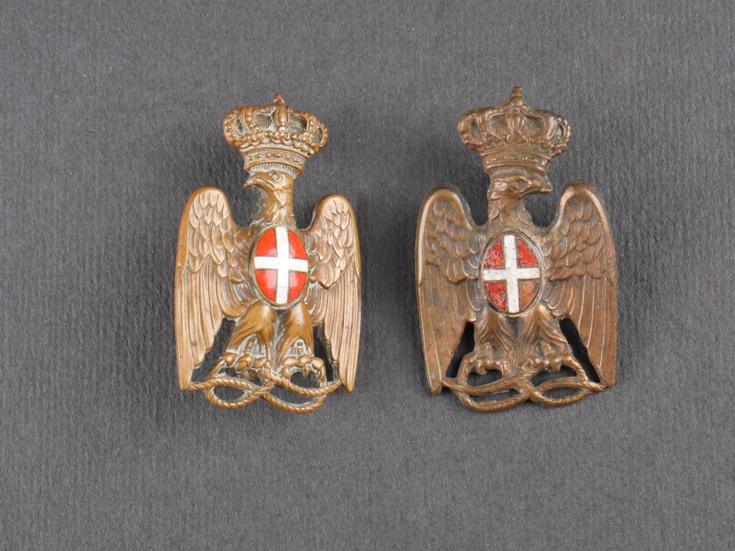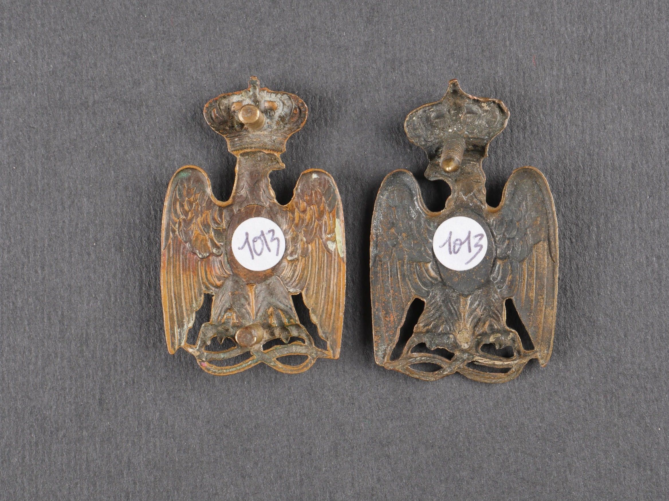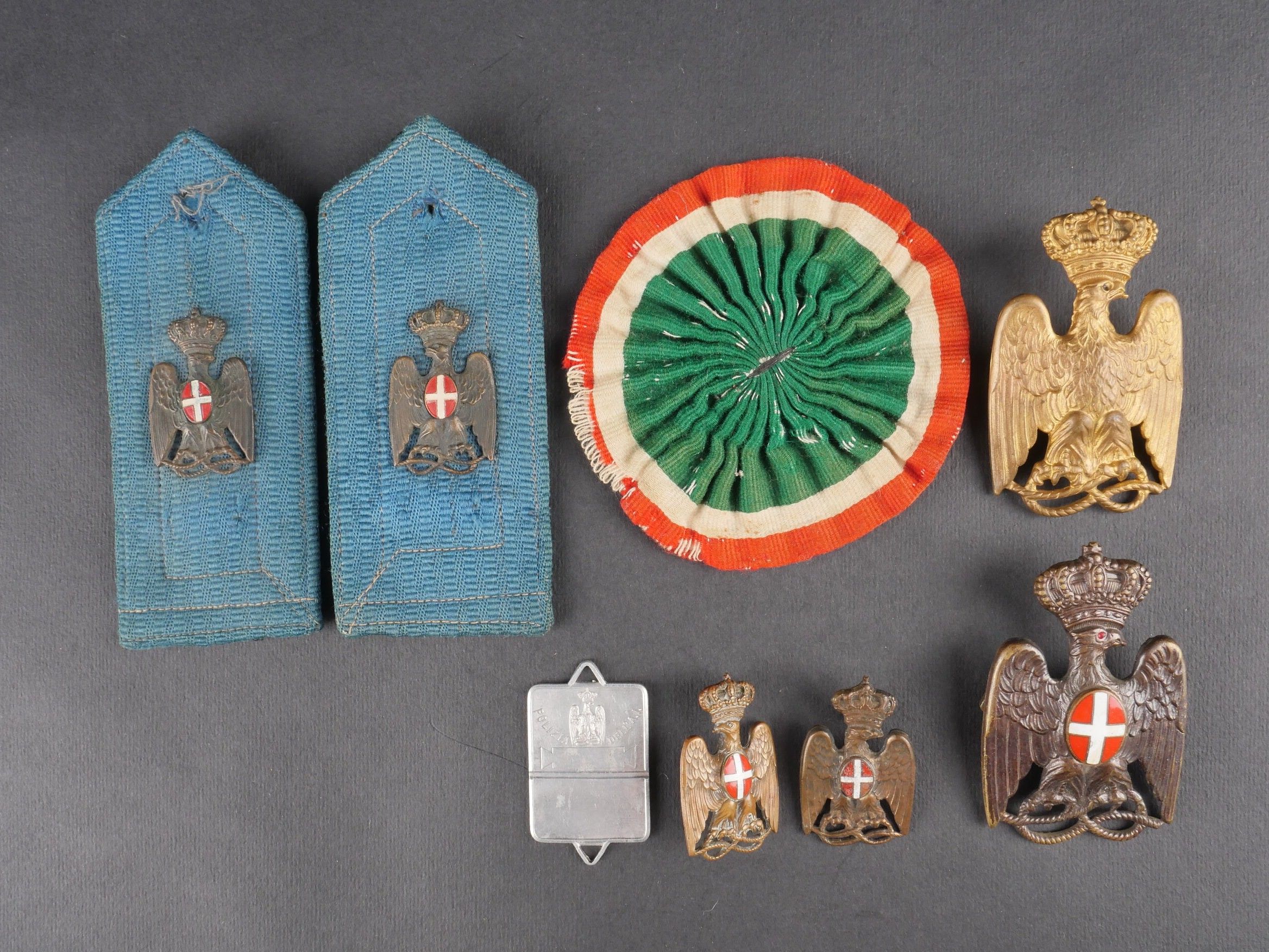 PAI badges. Magnificent set of Italian African police badges. Comprising a uniform pair of blue cloth shoulder tabs, two PAI metal eagles. Black cloth lining. One gold-coloured metal headdress eagle. One metal colonial helmet eagle, made in two parts. All fastenings are present. A small metal eagle, fastenings incomplete. An aluminium plate, marked Polizia dell AI. A green-white colonial helmet roundel with metal eagle. Some wear and patina to be noted. Condition II+. PAI Insignia Magnificent set of the Italian African Police. Includes a matching pair of blue cloth shoulder boards with metal PAI eagles, a gold-coloured metal cap eagle, a two-piece metal colonial helmet eagle complete attachments, a small metal eagle with incomplete fixings, an aluminium plaque marked Polizia dell'Africa Italiana, and a tricolor greenwhitered colonial helmet cockade with metal eagle. Some wear and patina noted. Condition II+.