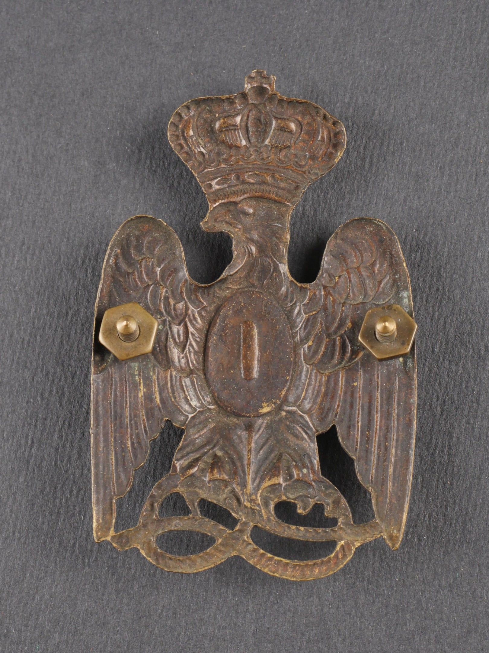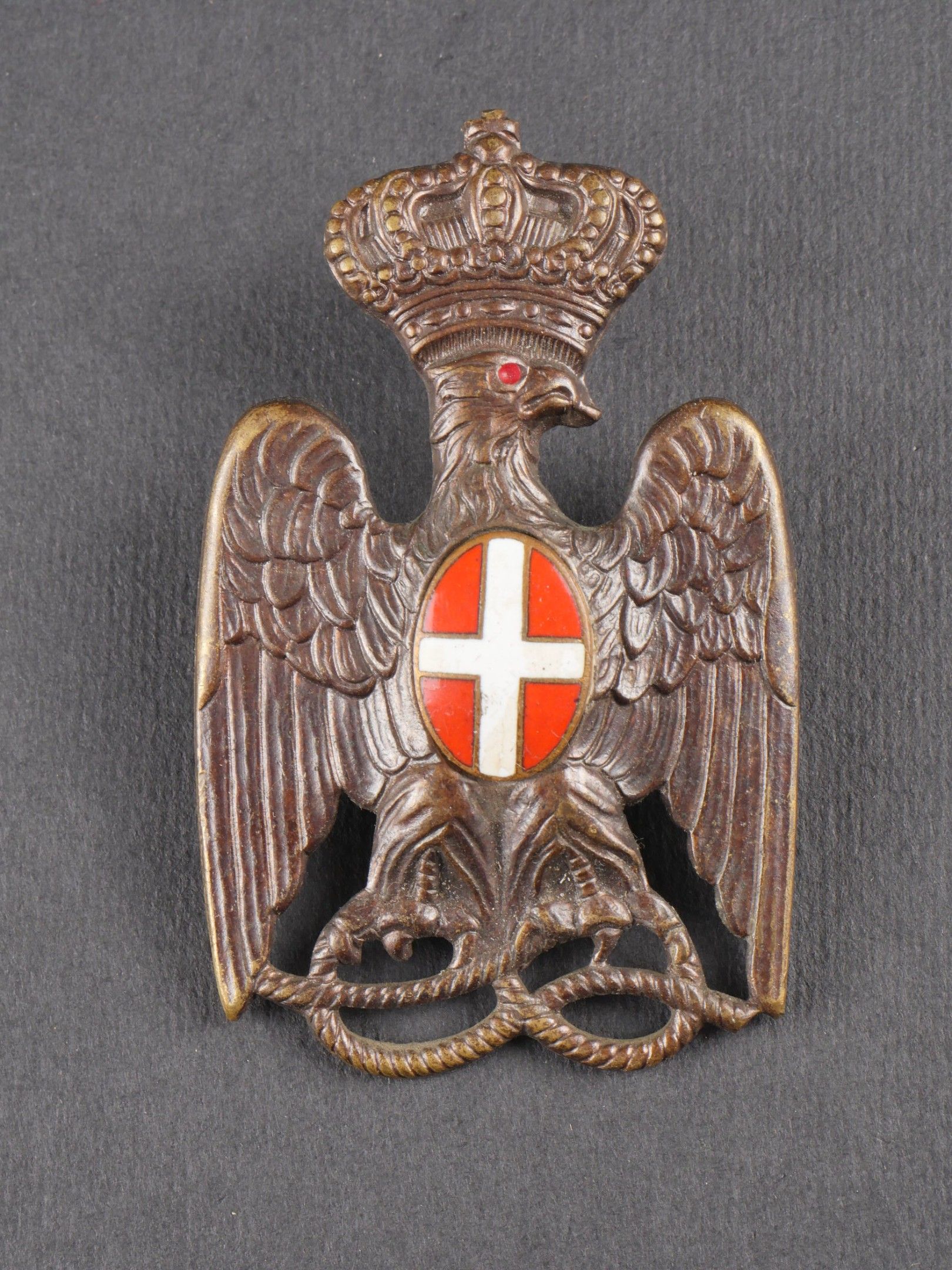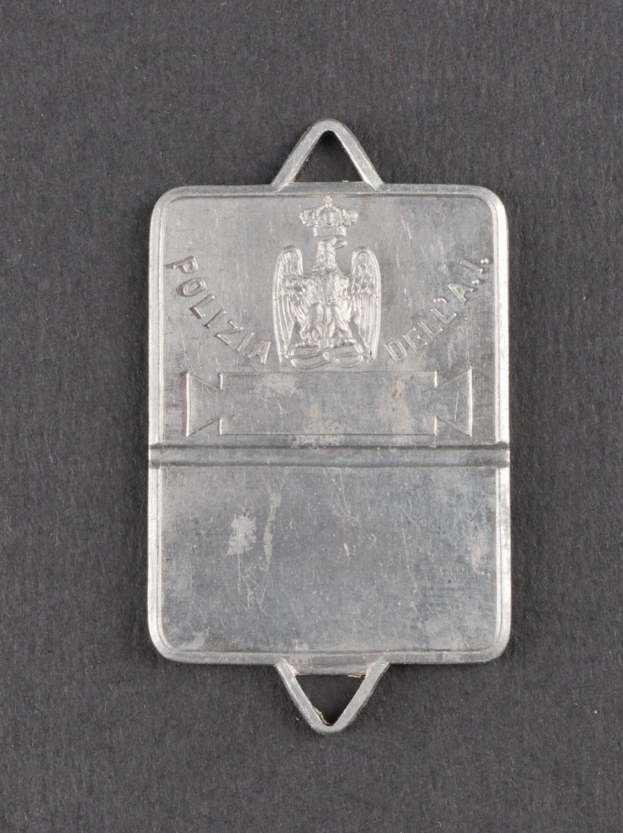 PAI badges. Magnificent set of Italian African police badges. Comprising a uniform pair of blue cloth shoulder tabs, two PAI metal eagles. Black cloth lining. One gold-coloured metal headdress eagle. One metal colonial helmet eagle, made in two parts. All fastenings are present. A small metal eagle, fastenings incomplete. An aluminium plate, marked Polizia dell AI. A green-white colonial helmet roundel with metal eagle. Some wear and patina to be noted. Condition II+. PAI Insignia Magnificent set of the Italian African Police. Includes a matching pair of blue cloth shoulder boards with metal PAI eagles, a gold-coloured metal cap eagle, a two-piece metal colonial helmet eagle complete attachments, a small metal eagle with incomplete fixings, an aluminium plaque marked Polizia dell'Africa Italiana, and a tricolor greenwhitered colonial helmet cockade with metal eagle. Some wear and patina noted. Condition II+.