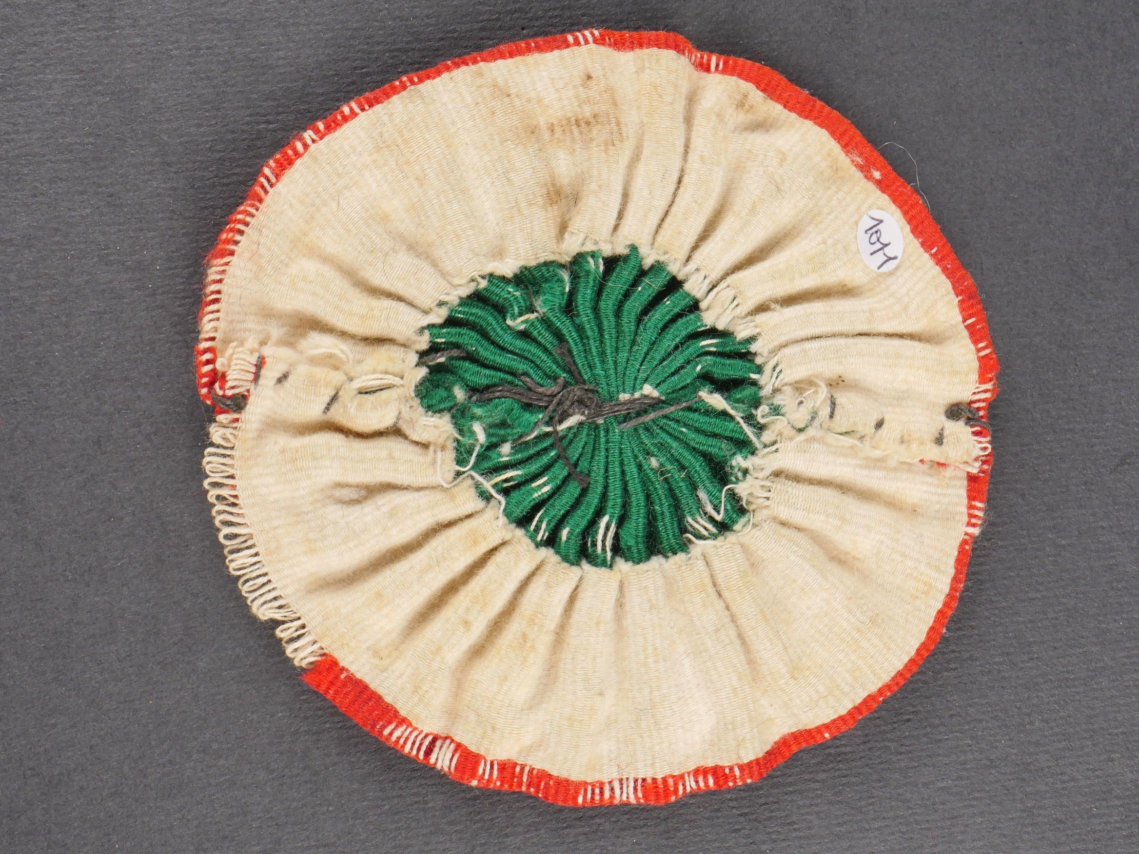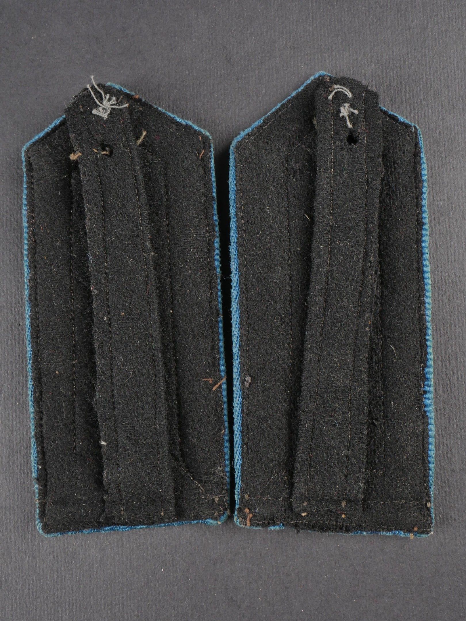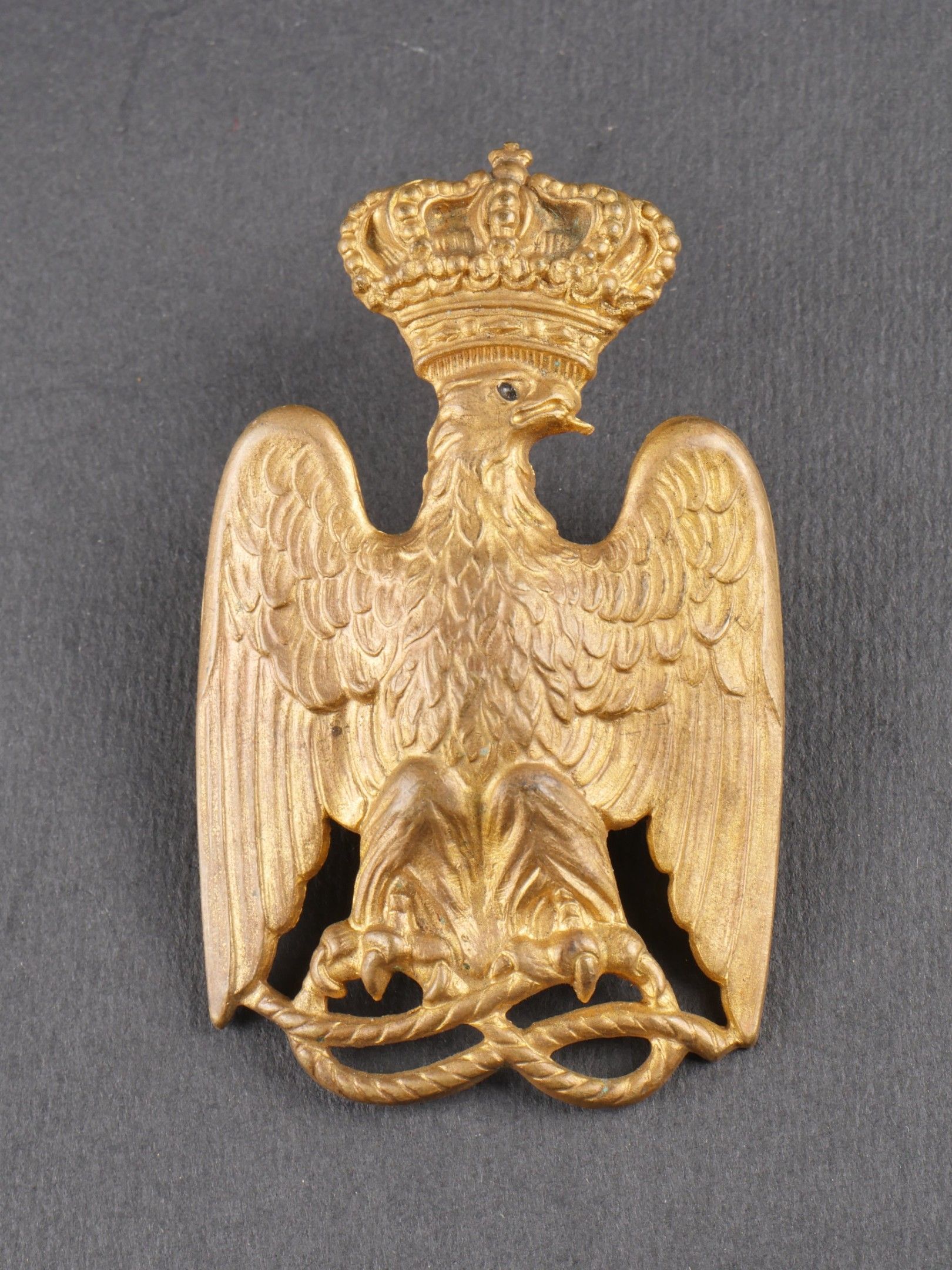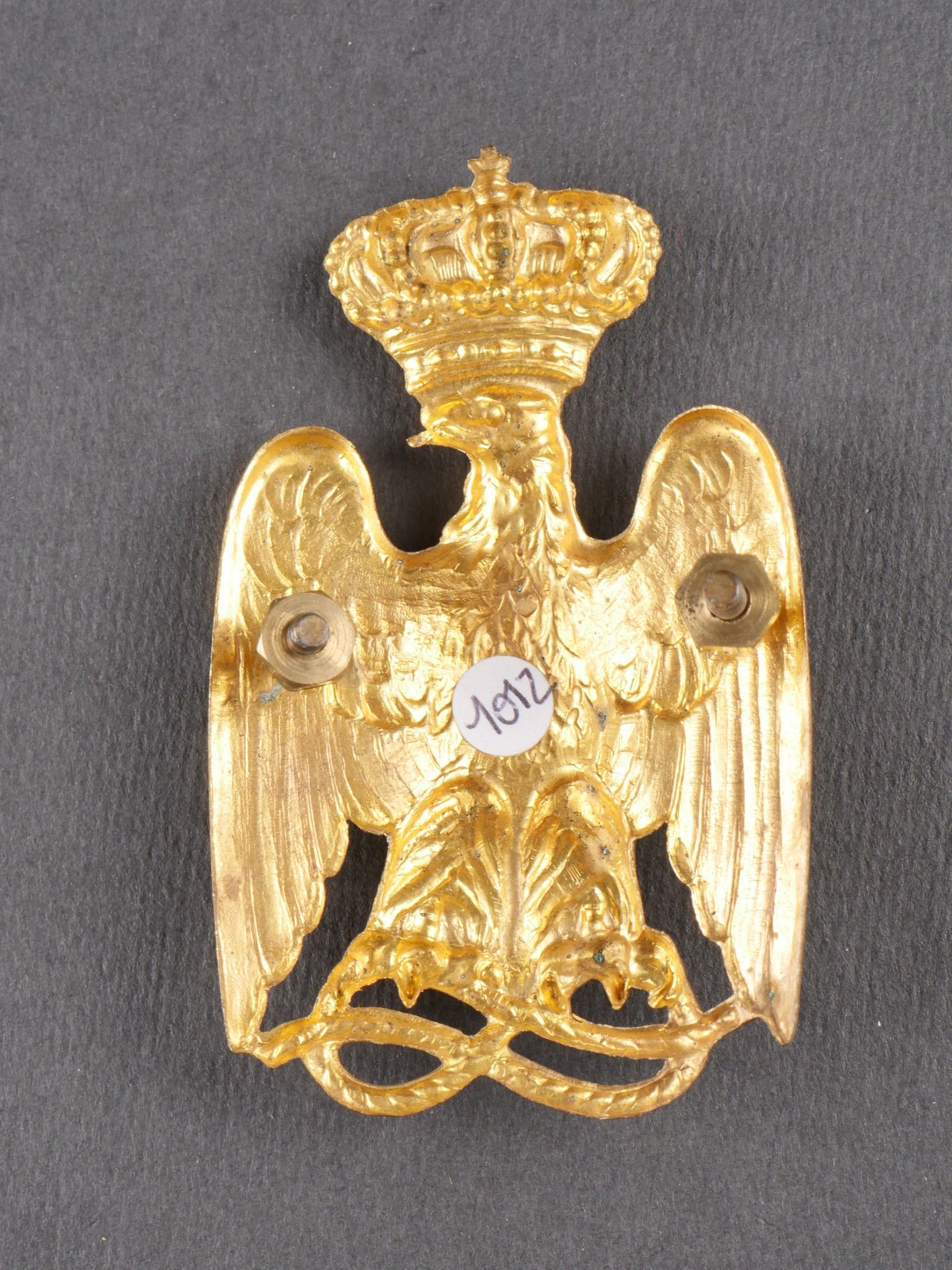 PAI badges. Magnificent set of Italian African police badges. Comprising a uniform pair of blue cloth shoulder tabs, two PAI metal eagles. Black cloth lining. One gold-coloured metal headdress eagle. One metal colonial helmet eagle, made in two parts. All fastenings are present. A small metal eagle, fastenings incomplete. An aluminium plate, marked Polizia dell AI. A green-white colonial helmet roundel with metal eagle. Some wear and patina to be noted. Condition II+. PAI Insignia Magnificent set of the Italian African Police. Includes a matching pair of blue cloth shoulder boards with metal PAI eagles, a gold-coloured metal cap eagle, a two-piece metal colonial helmet eagle complete attachments, a small metal eagle with incomplete fixings, an aluminium plaque marked Polizia dell'Africa Italiana, and a tricolor greenwhitered colonial helmet cockade with metal eagle. Some wear and patina noted. Condition II+.