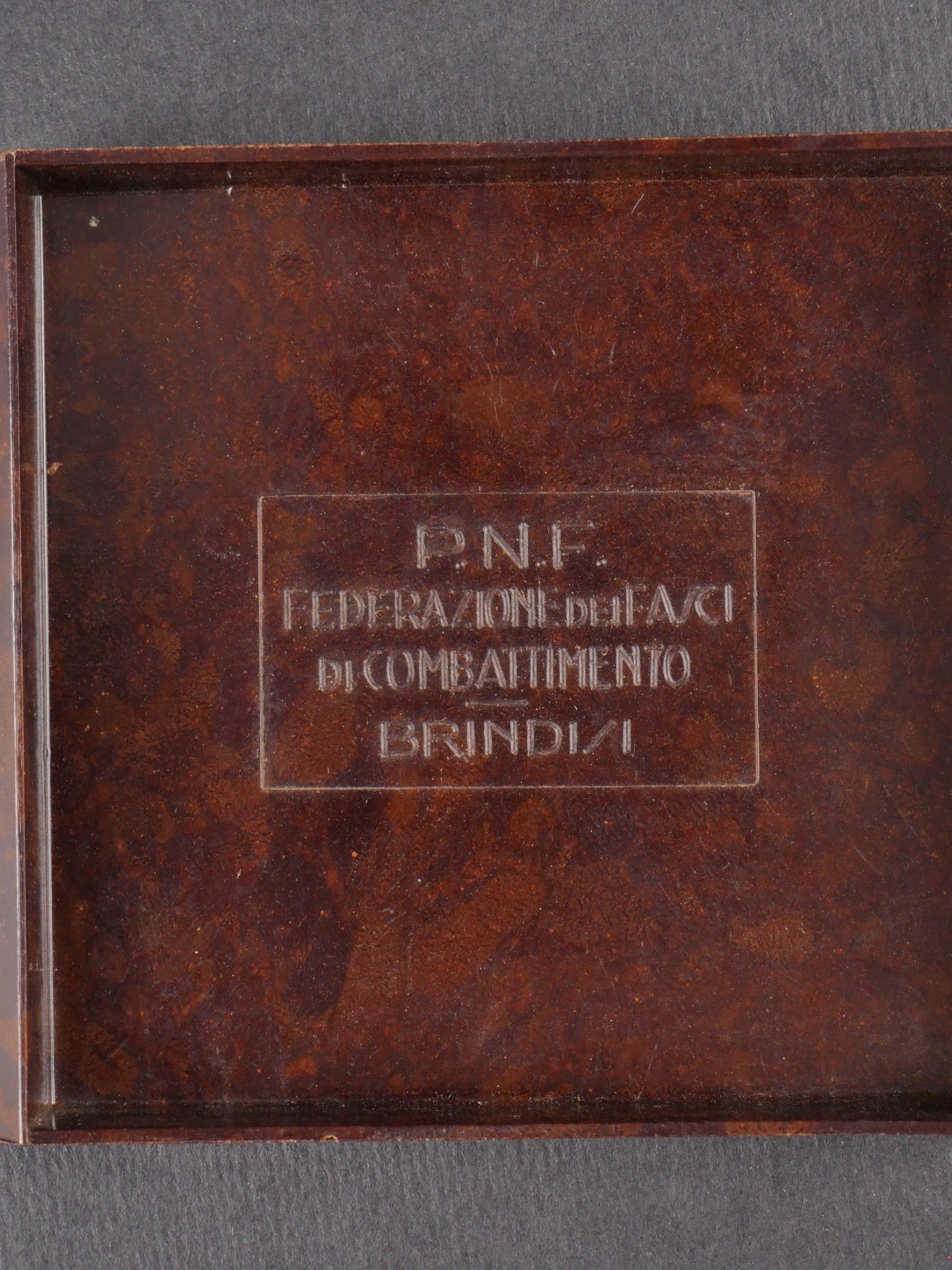 PNF cigarette case. Very nice brown bakelite box. Metal band glued to the lid, inside marked PNF Federazione dei FACI di Combattimento Brindi1. Contains twelve coins bearing the effigy of Benito Mussolini. Some cracks visible in the bakelite. Some wear and patina of the coin. Condition II+. PNF Cigarette Case Fine brown bakelite box with a metal fasces emblem affixed to the lid. Interior marked PNF Federazione dei FACI di Combattimento Brindi1. Contains twelve coins bearing the effigy of Benito Mussolini. Some visible cracks in the bakelite. Some wear and patina noted. Condition II+.