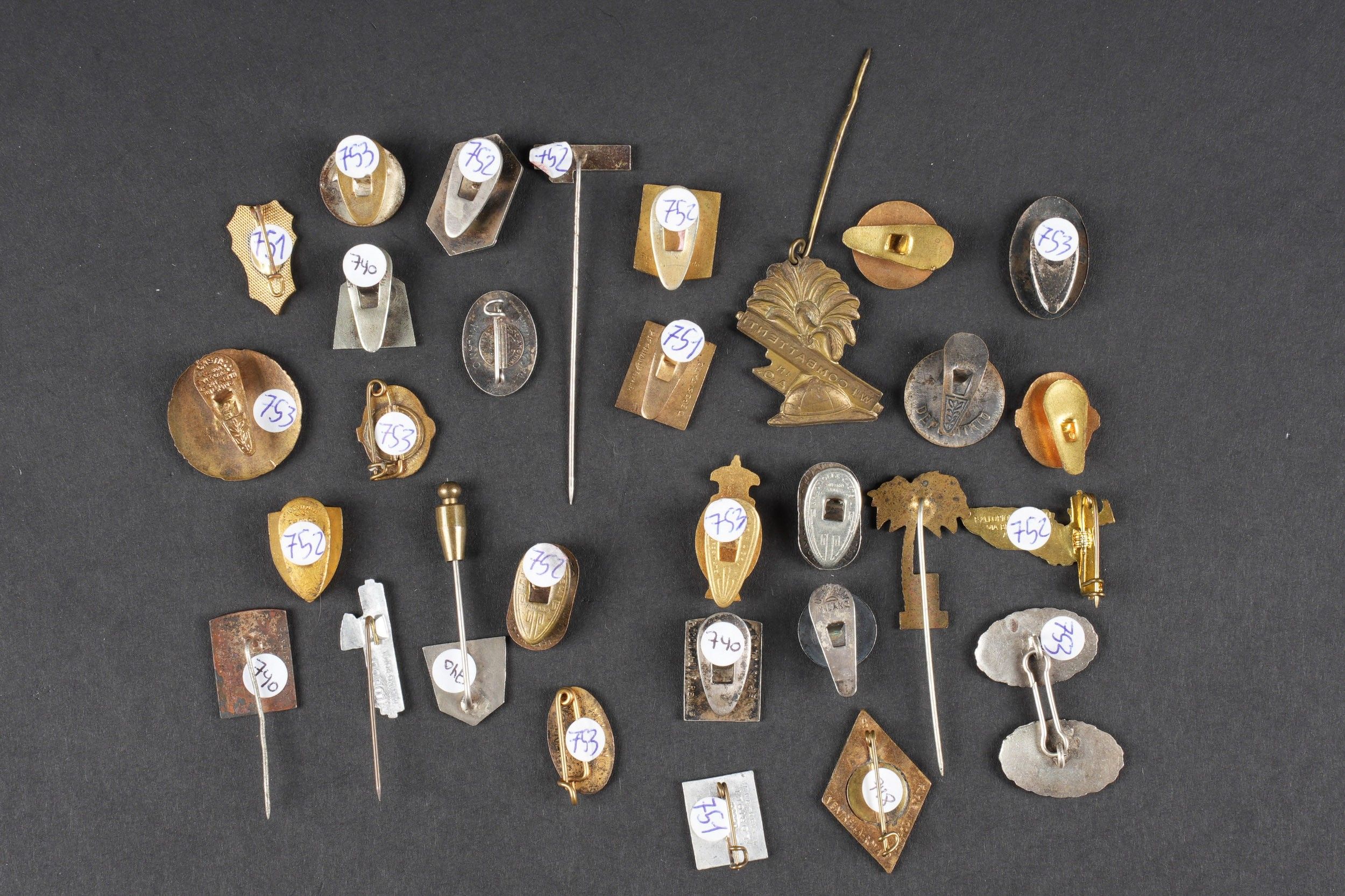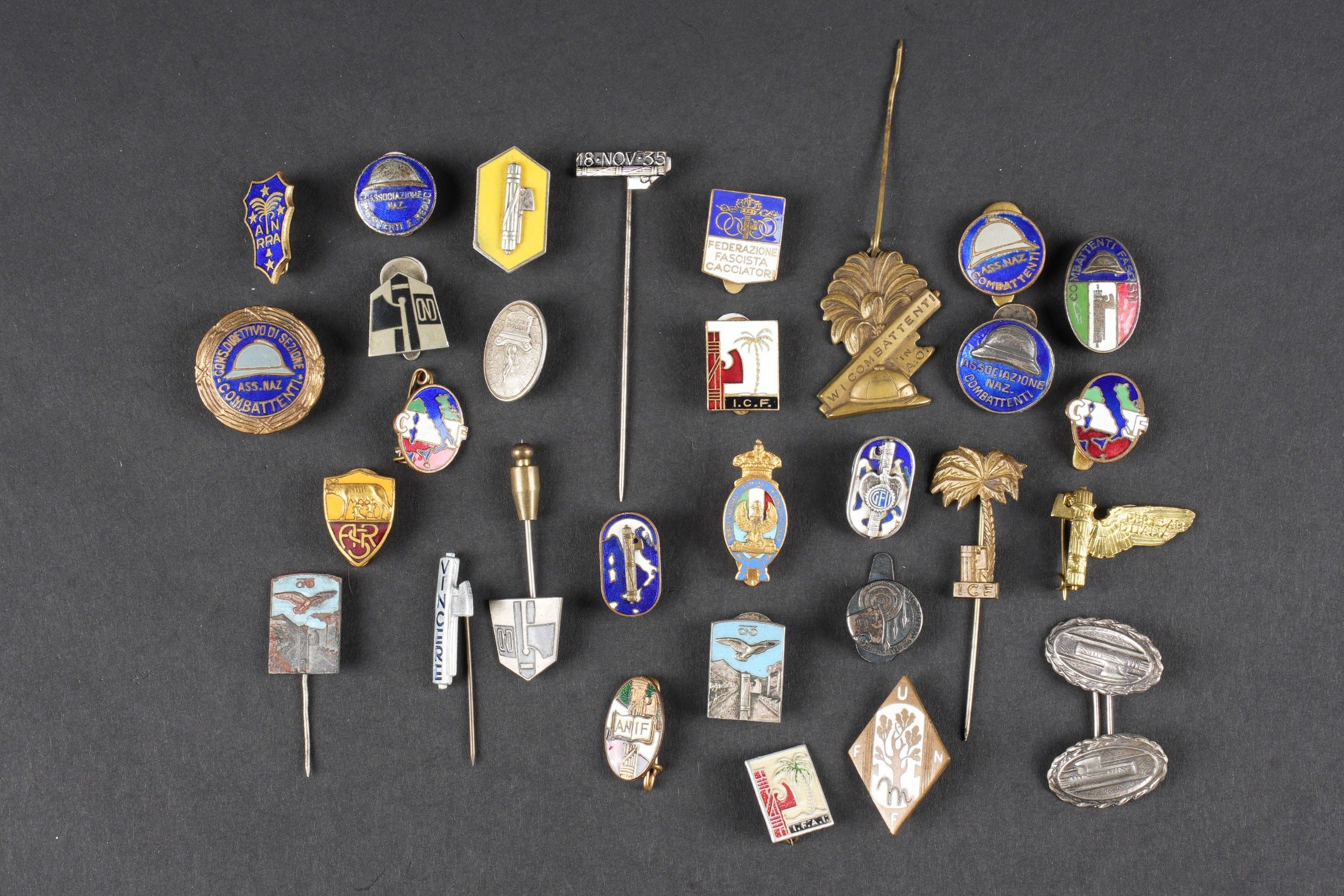 Badges of the organisations of the National Fascist Party. Thirty metal badges of various makes and models. Most of the fastenings are present. Some wear and patina to be noted. Condition II+. Insignia of the Organizations of the National Fascist Party Thirty metal insignia of various designs and manufacturers, most with attachments intact. Some wear and patina noted. Condition II+.