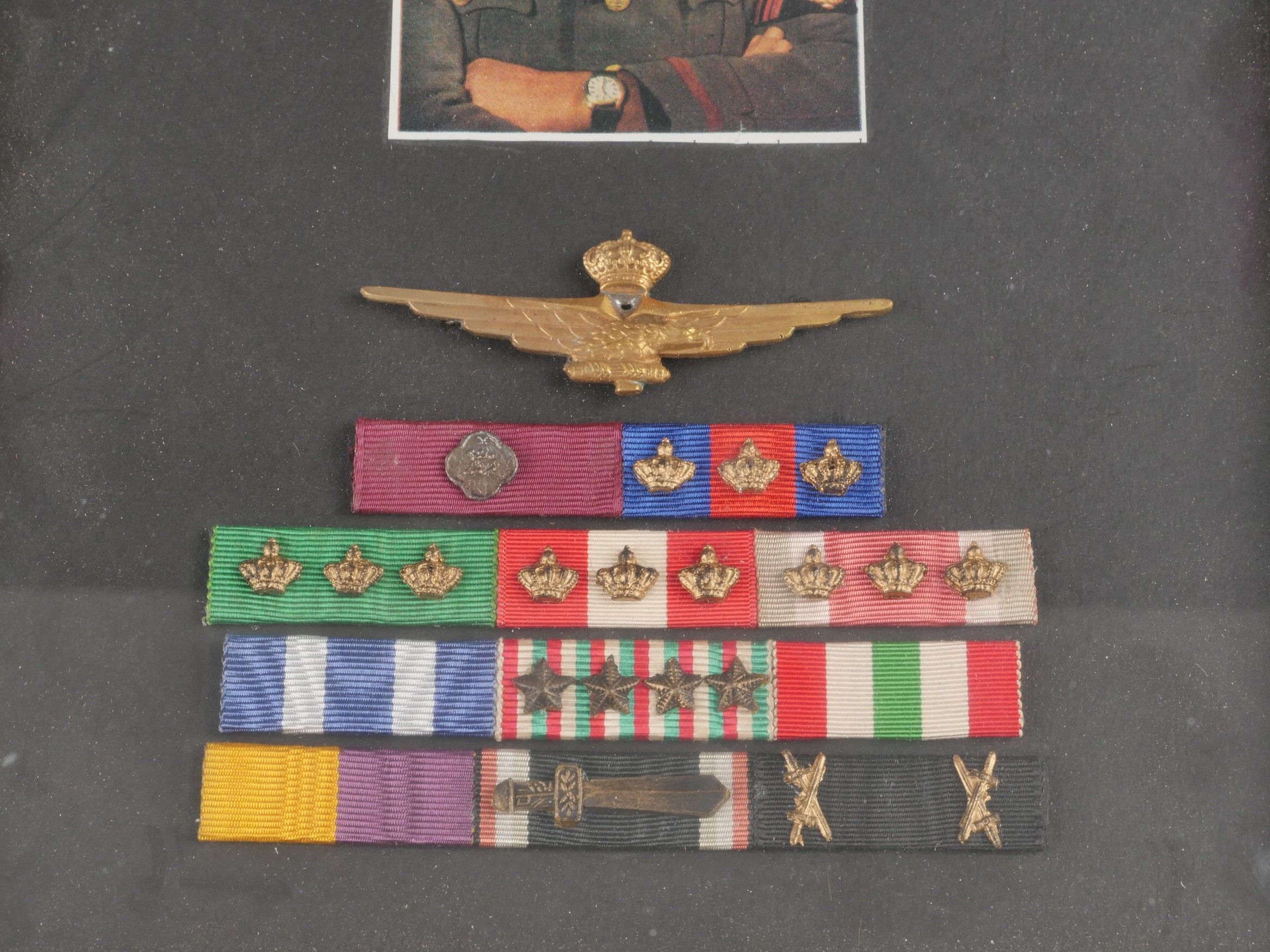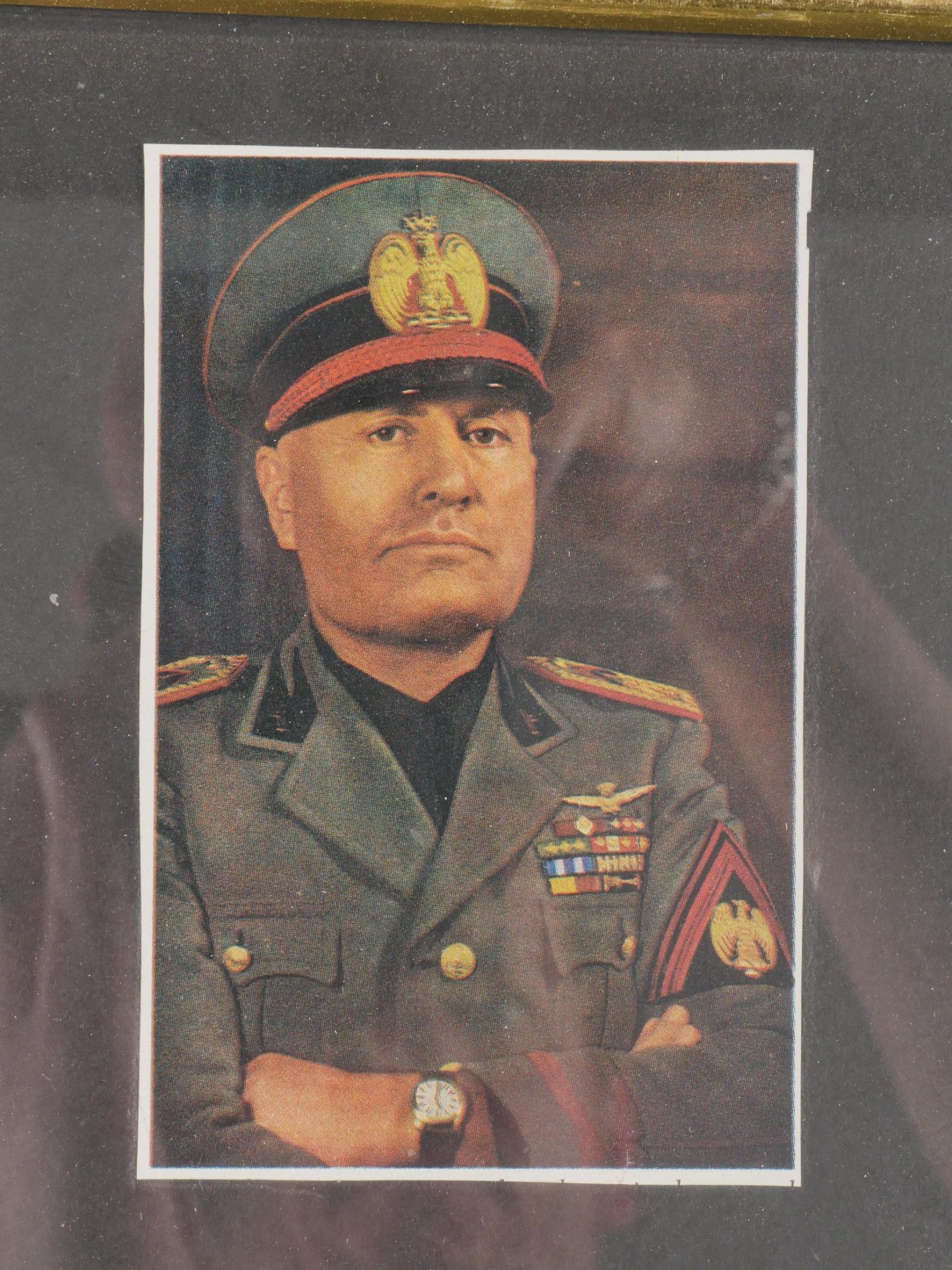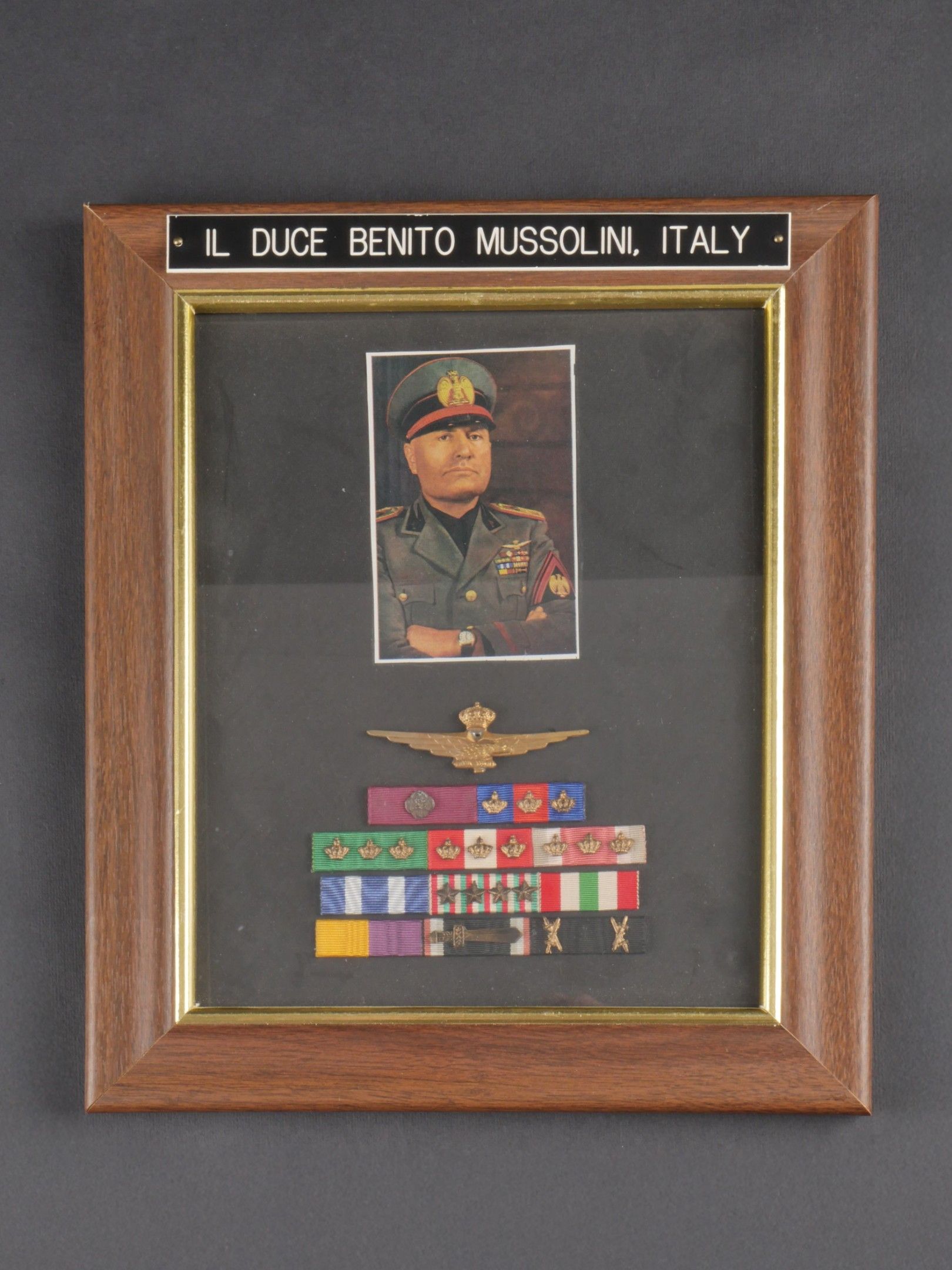 Insignia of Benito Mussolini. Antique frame from an American museum. Containing all his decoration bars, as well as his pilot's licence. This is a reconstruction with modern insignia. There is no evidence that these are the insignia of the Duce. Some wear and patina. Condition II+. Benito Mussolini Insignia Displayed in an old frame from an American museum, containing a full set of decoration bars and a pilot's license. This is a reconstruction with modern insignia, there is no evidence that these belonged to Mussolini. Some wear and patina noted. Condition II+.