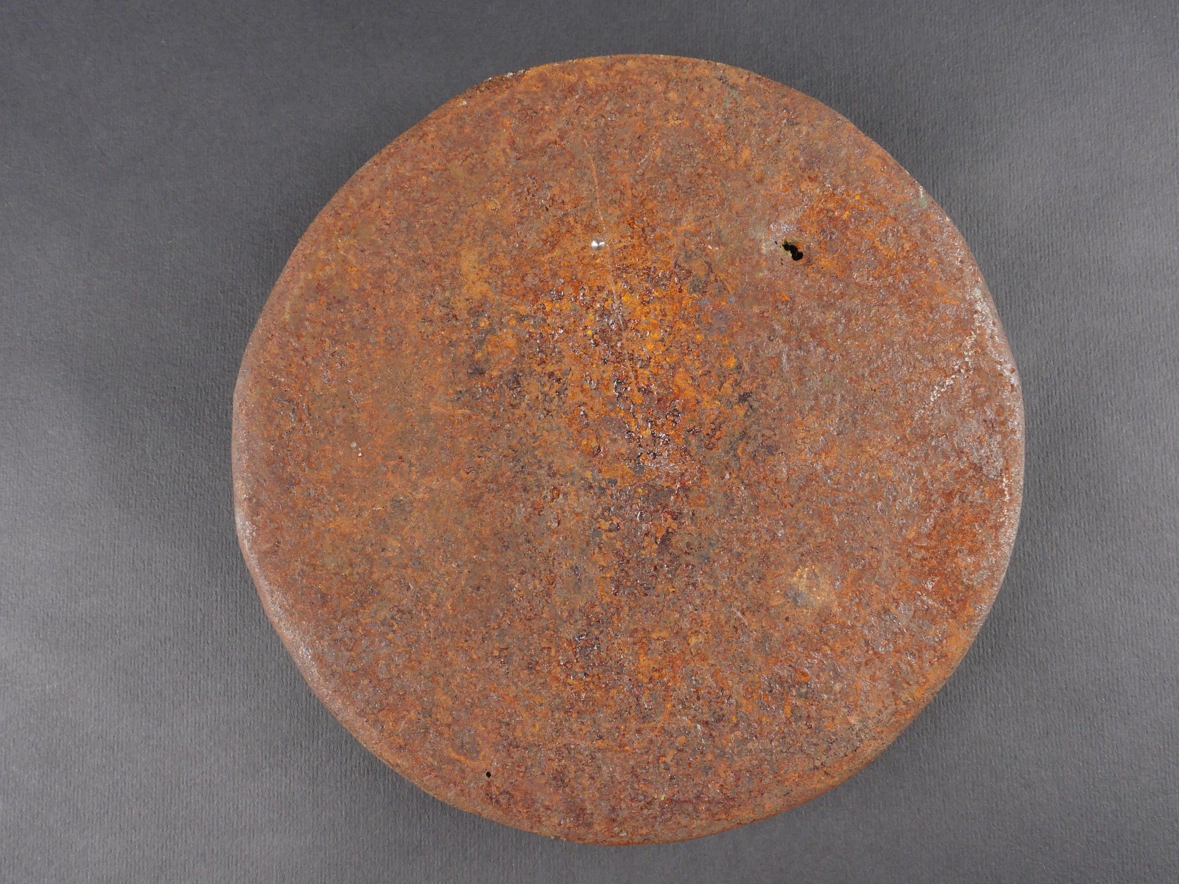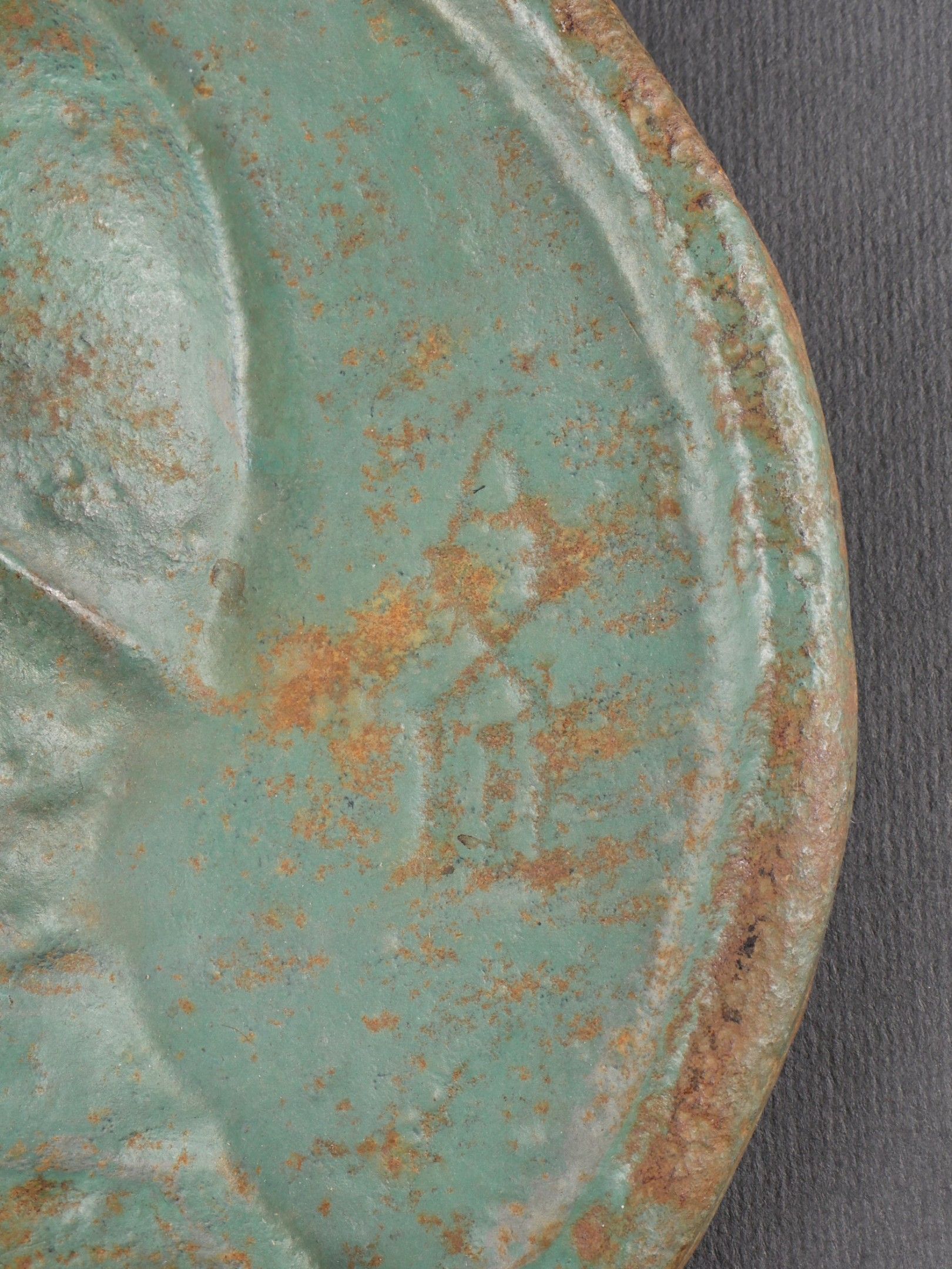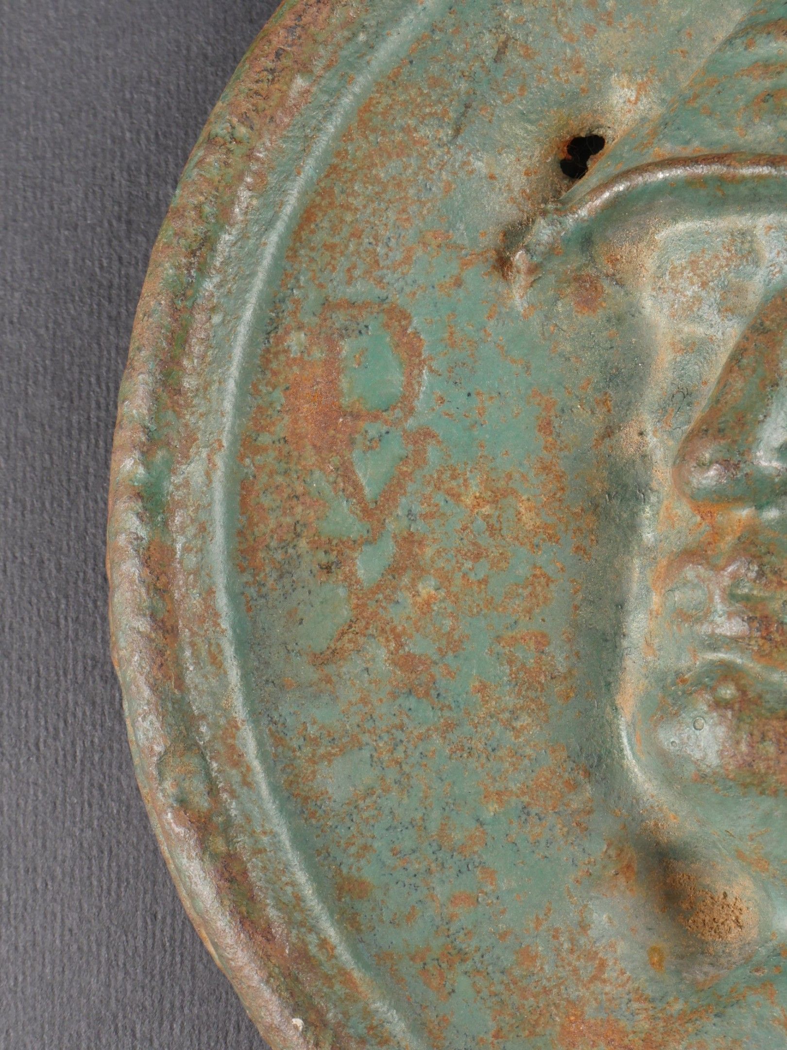 Profile of Benito Mussolini. Thick metal, green colour, representing the helmeted Duce. There is a perforation near the helmet. No visible markings. Significant wear and traces of oxidation. Condition II+. Profile of Benito Mussolini Thick green-painted metal depicting the Duce with helmet. A perforation is visible near the helmet. No visible markings. Noticeable wear and signs of oxidation Condition II+.
