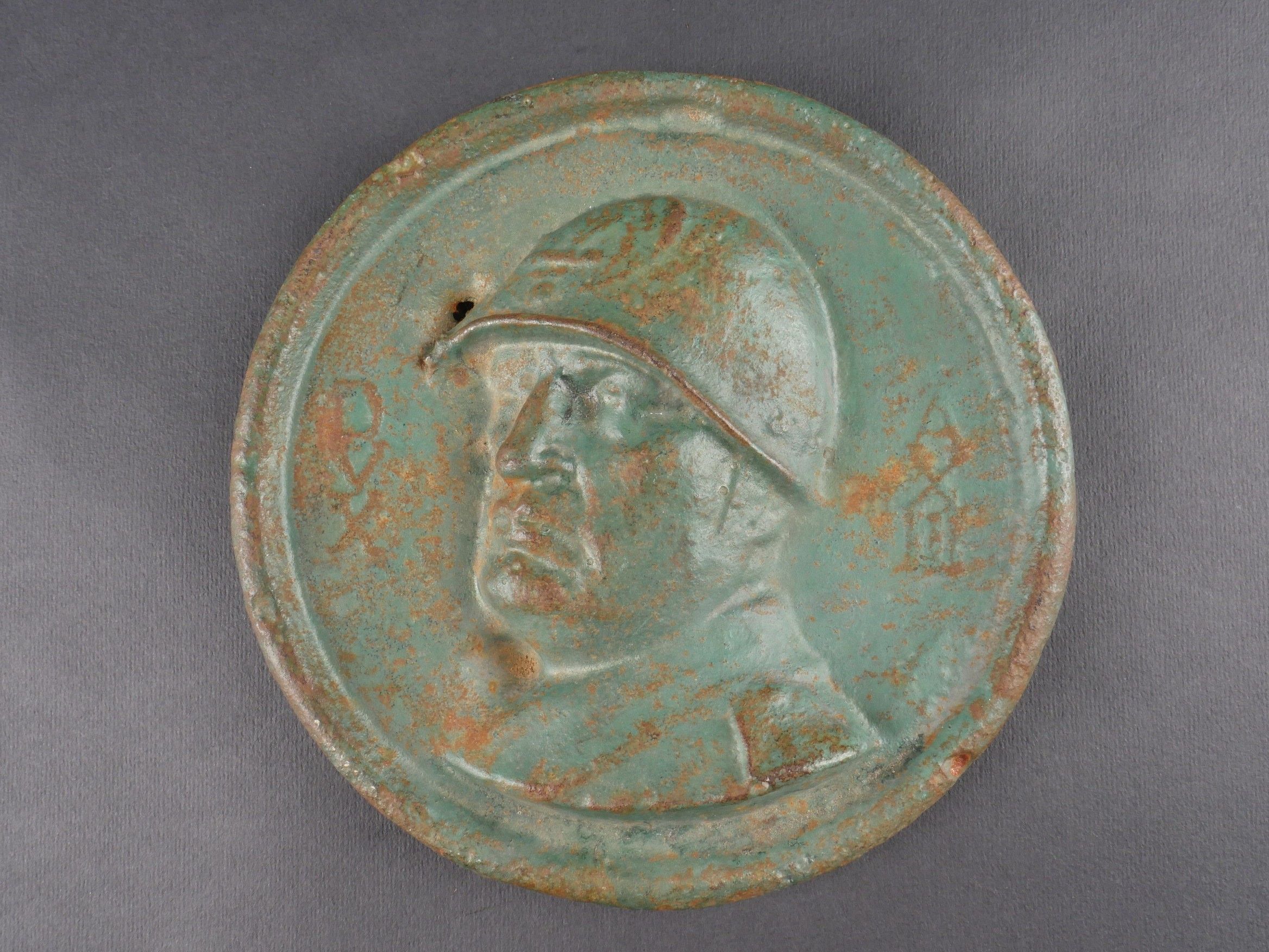 Profile of Benito Mussolini. Thick metal, green colour, repr…