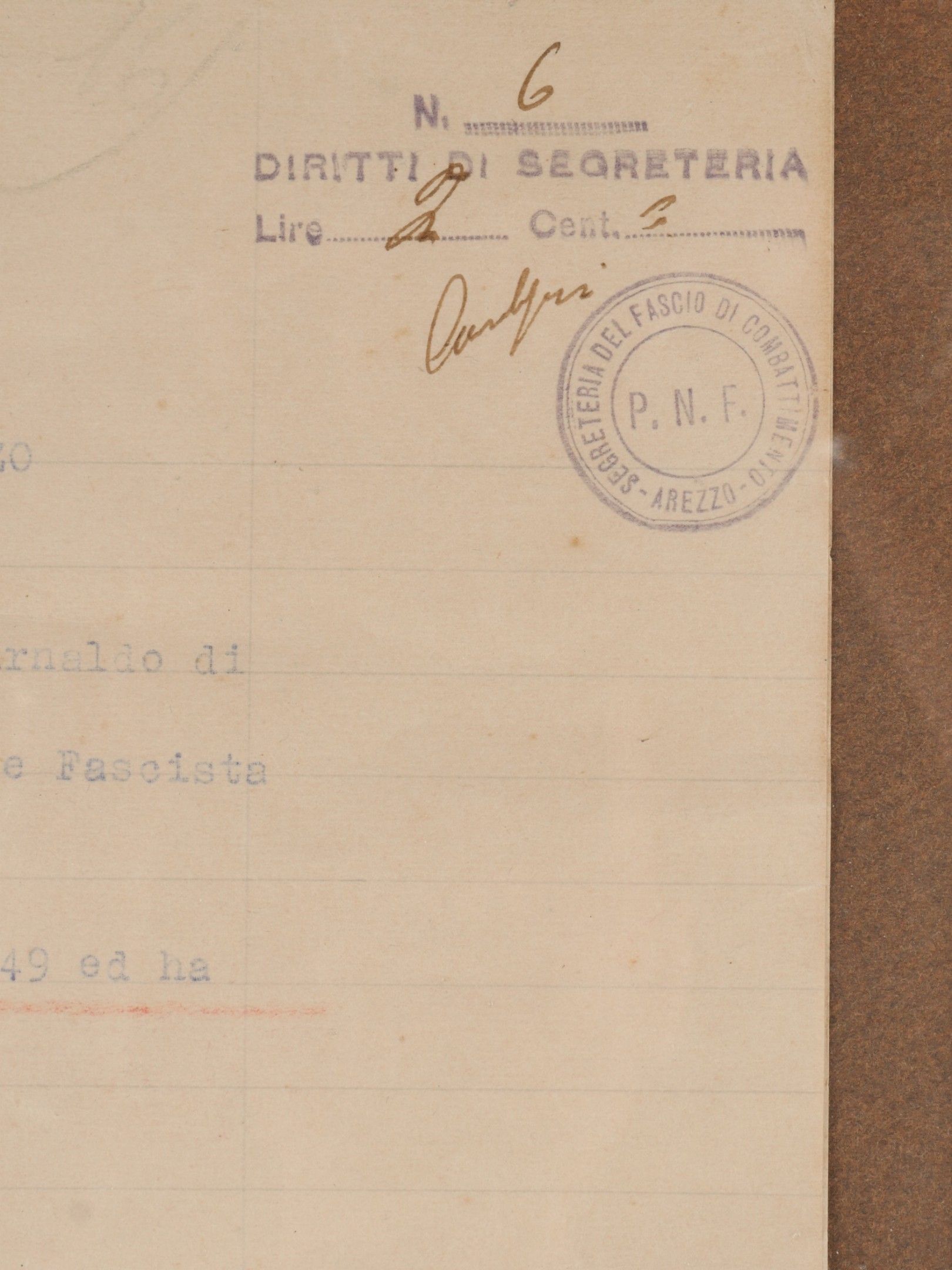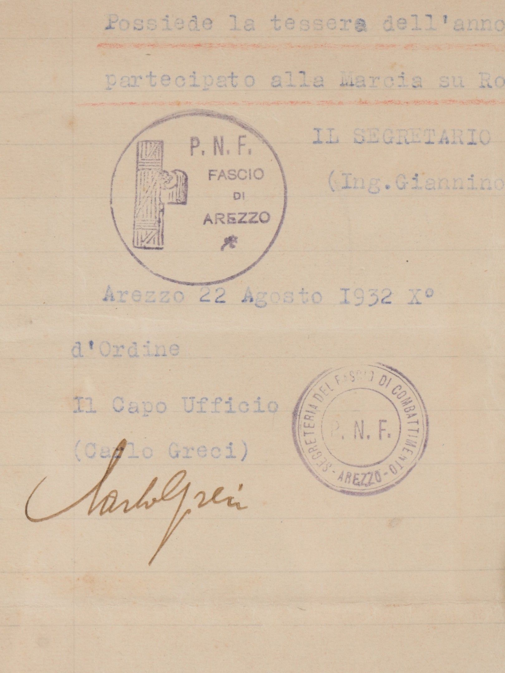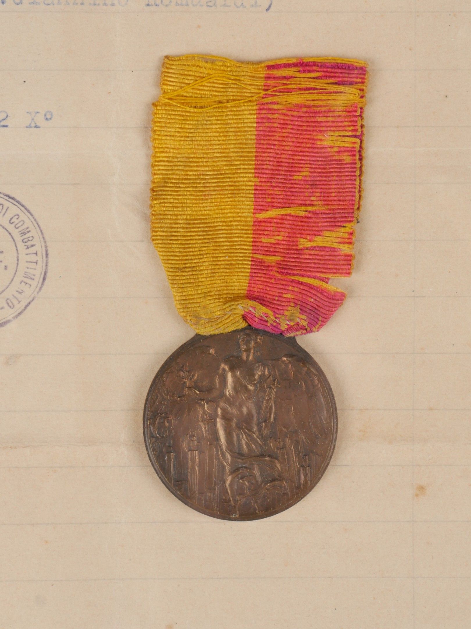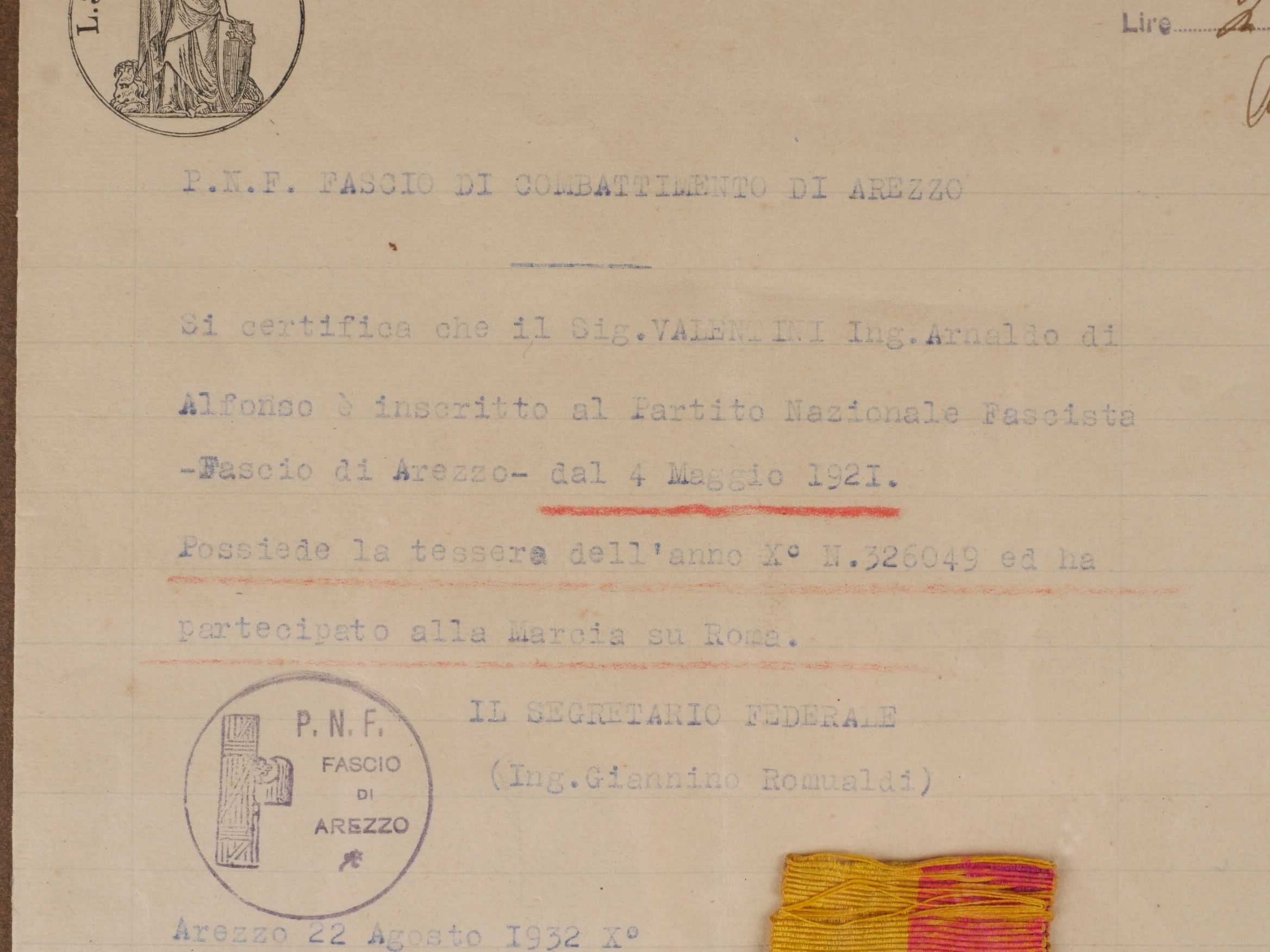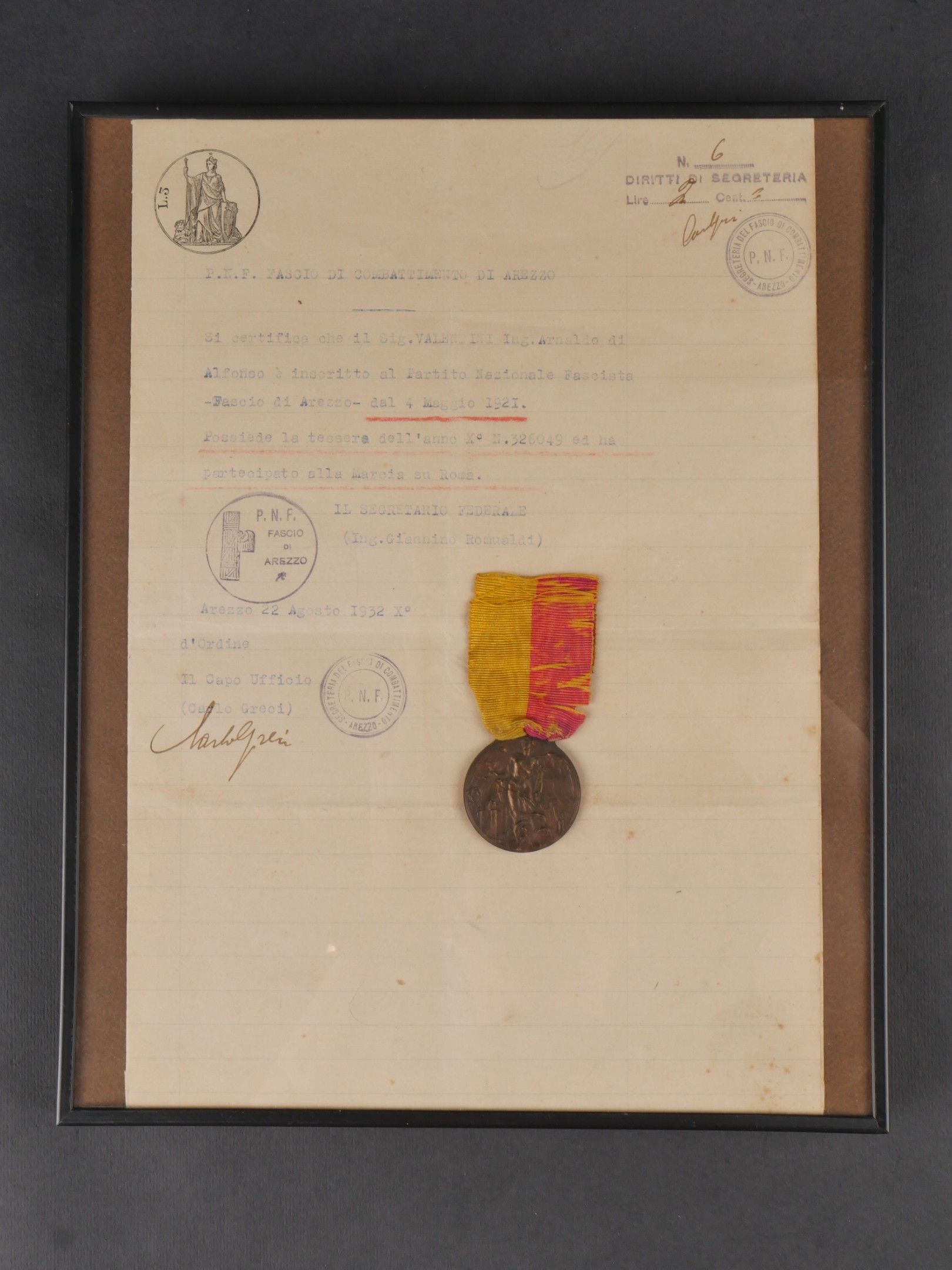 Medal of the March on Rome with certificate. On the obverse is a winged victory figure holding an oak wreath in the right hand and supporting a lictor fess in the left. Behind the figure are legionary badges, lictors' fasces and Roman daggers. On the reverse, in the centre, there is an empty square space where the recipient can have his or her name engraved. The square space is bordered by four lictor beams. The border is bordered by a double circle in which the legends Marcia Su Roma, at the top, and 27 October-1 November 1922 are engraved. The ribbon is divided vertically in two, with amaranth-red on the left and yellow on the right, the colours of the Municipality of Rome. Paper certificate from the PNF fascio di Arezzo, attributed to Arnaldo di Alfonso Valentini. In a modern frame. Some wear and patina. Condition II+. March on Rome medal with certificate. Obverse shows a winged Victory holding an oak wreath in her right hand and supporting a lictor's band in her left. Behind the figure are legionary insignia, fasces of lictors and Roman daggers. On the reverse, at the centre, a square blank space where the recipient could have engraved his name. The square is framed by four fasces of lictors. The border is edged with a double circle bearing the legends Marcia Su Roma above and 27 ottobre-1 novembre 1922 below. The ribbon is divided vertically, red amaranth on the left and yellow on the right, colors of the municipality of Rome. Paper certificate issued by PNF Fascio di Arezzo attributed to Arnaldo di Alfonso Valentini. In a modern frame. Some wear and patina on the piece. Condition II+