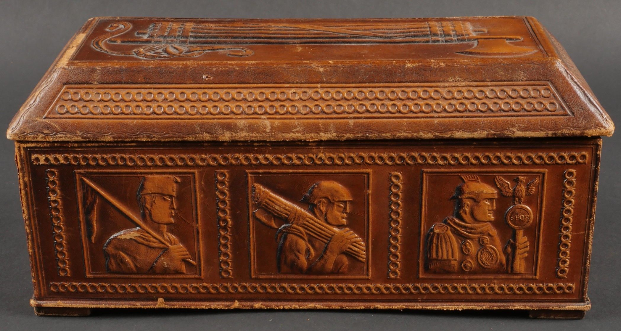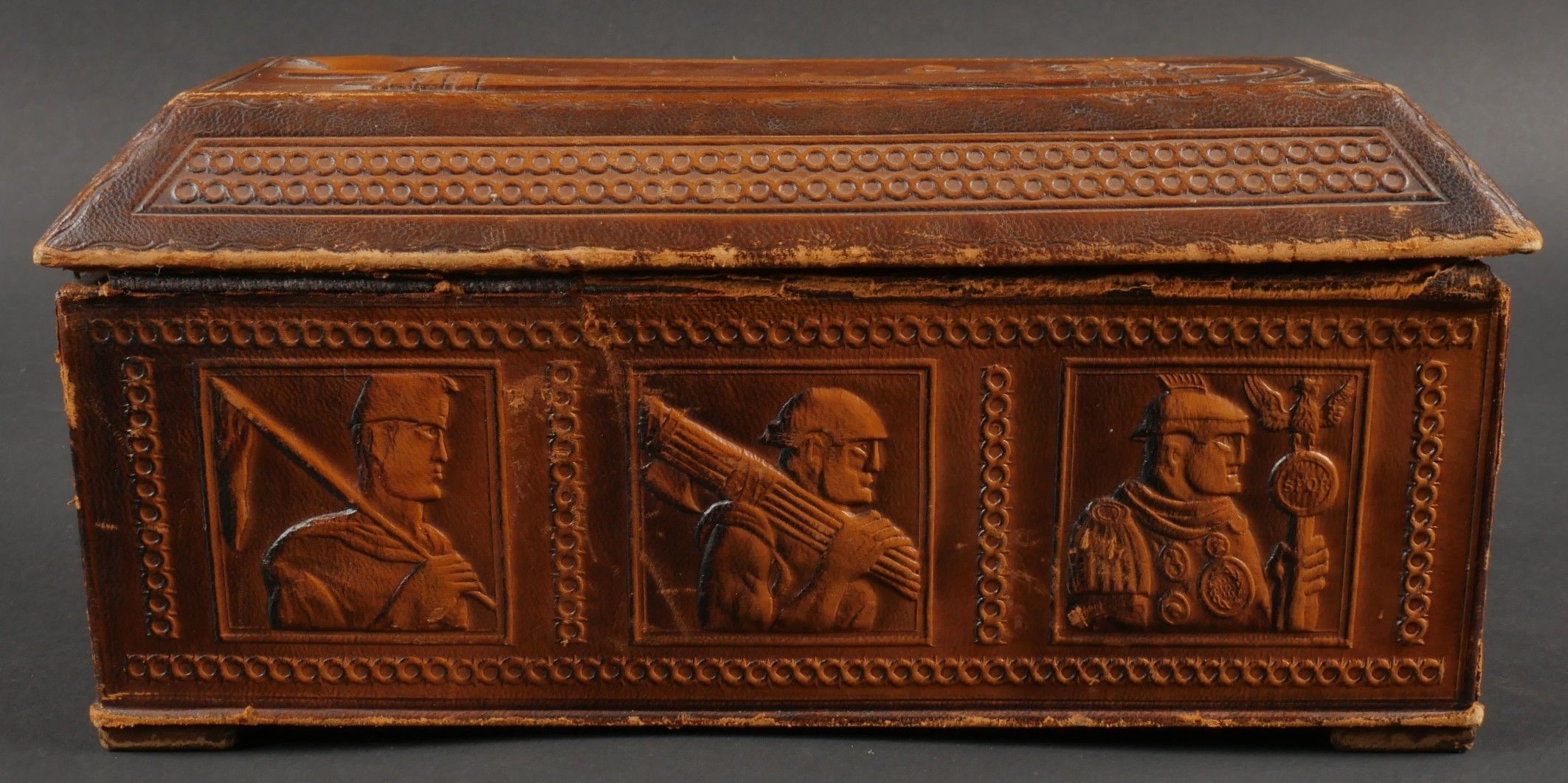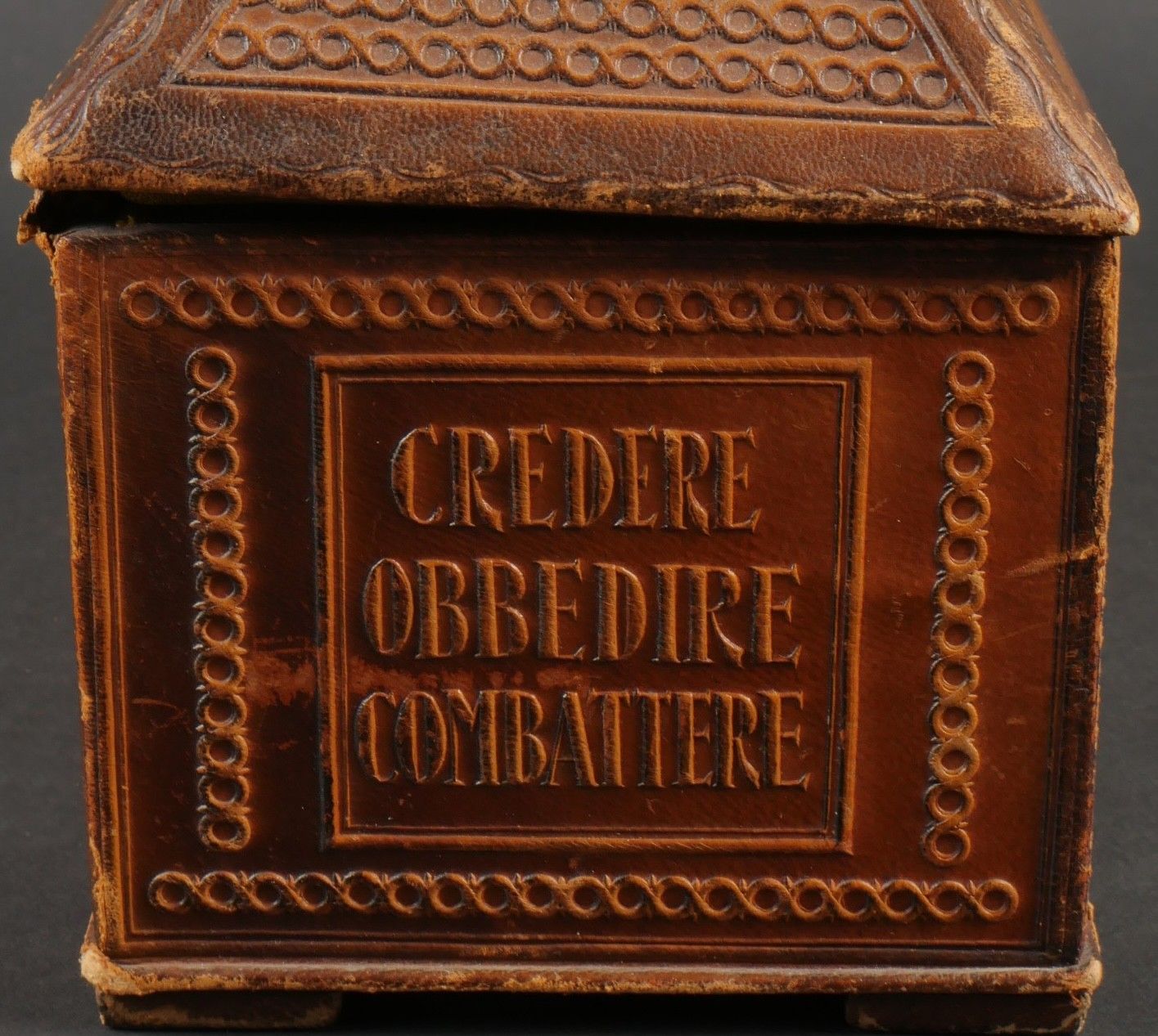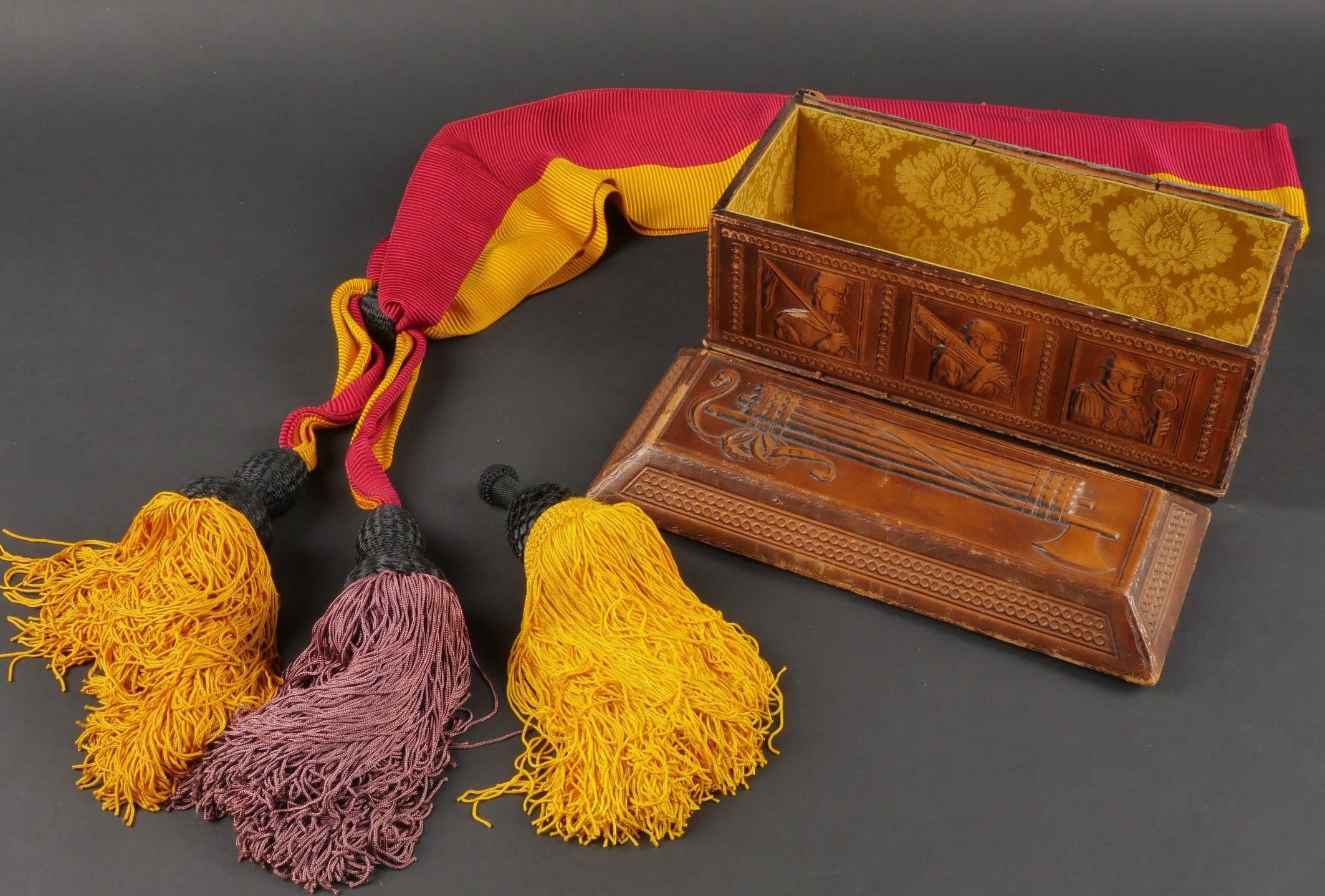 Leather case presented to Fascist dignitaries who took part in the march on Rome. Inside, the Littorio scarf reserved for those who took part in the march on Rome. Very handsome box entirely covered in leather, with numerous bundles and military decorations. Littorio scarf complete with tassels. The lid is detached from the box. Dimensions 25.5 x 10.5 x 12.5 cm. Some wear and patina. Condition II+. Leather box presented to fascist dignitaries who took part in the March on Rome containing inside the Littorio sash reserved for participants of the march. Fine box entirely covered in leather with numerous fasces and military decorations. Complete Littorio sash with tassels. Lid detached from the box. Dimensions 25.5 x 10.5 x 12.5 cm. Some wear and patina on the piece. Condition II+