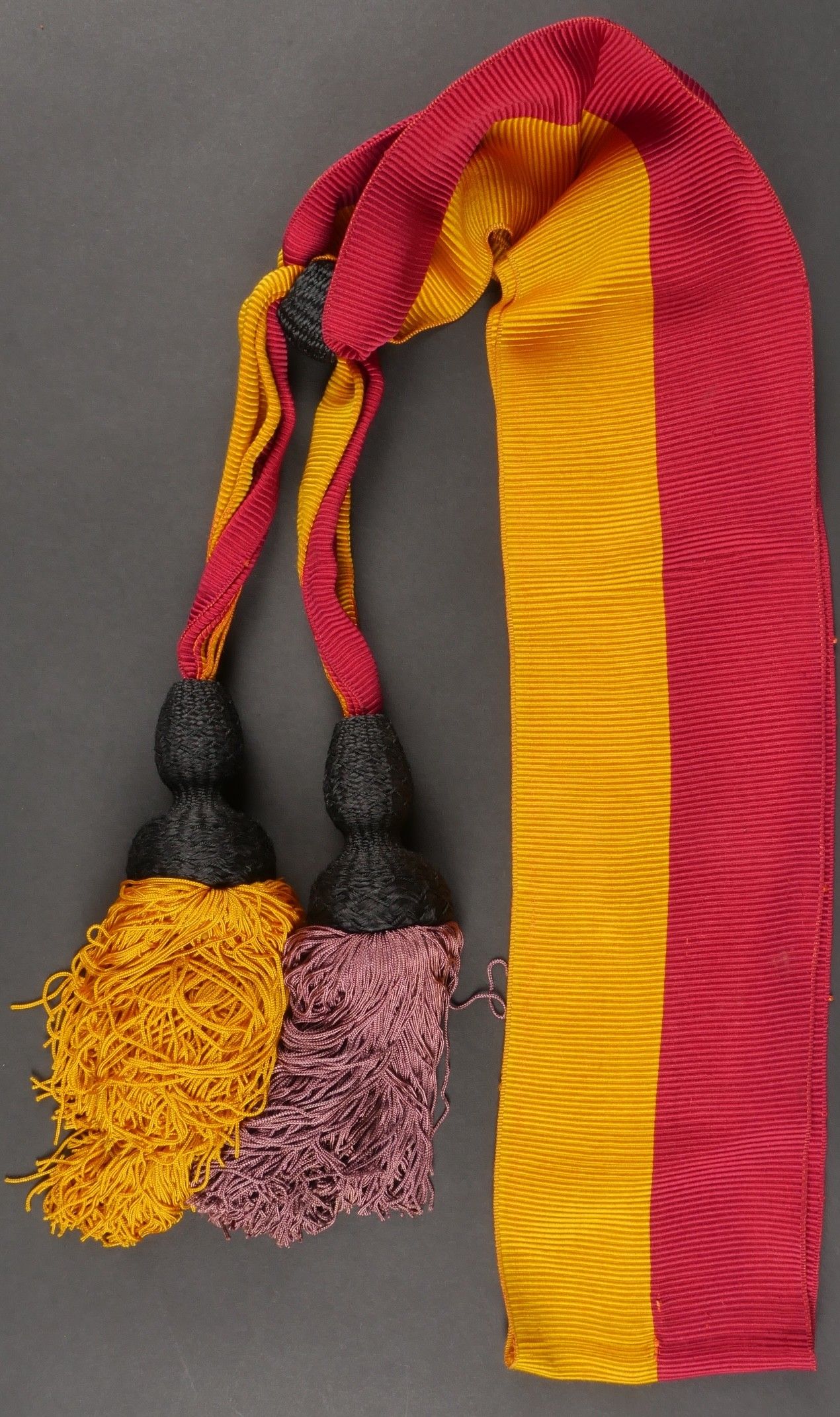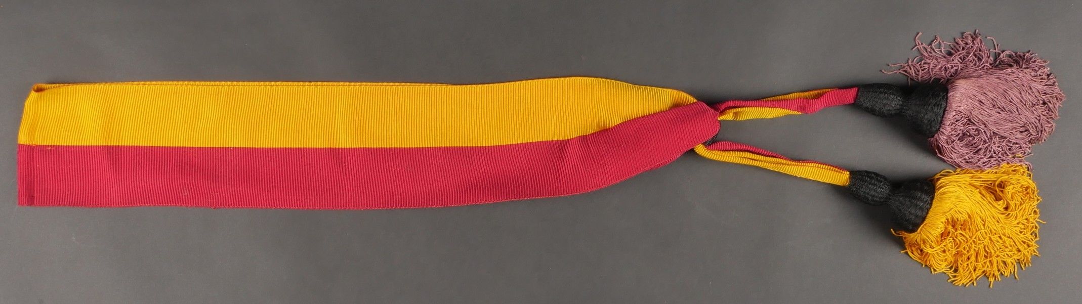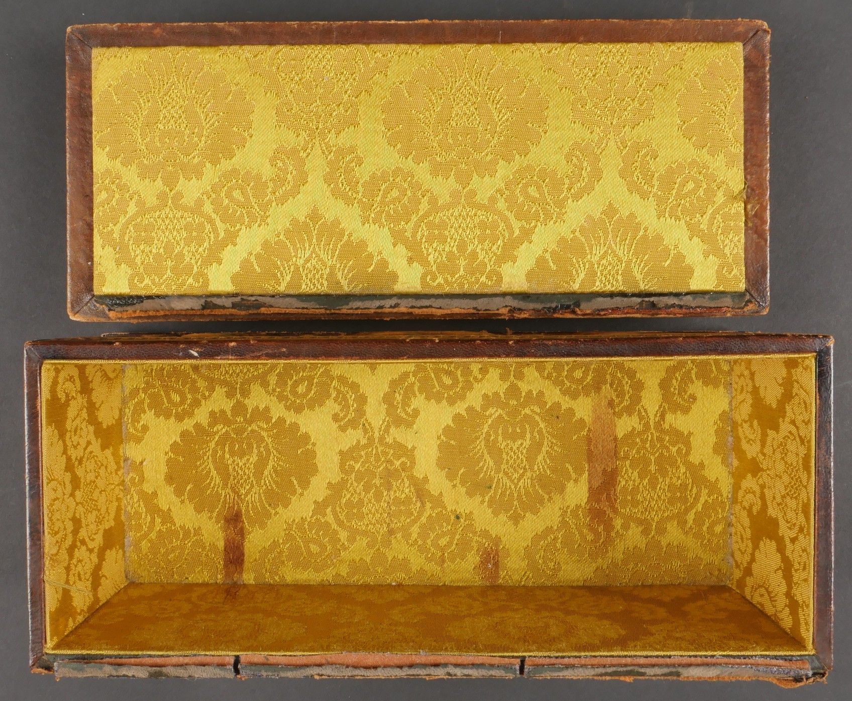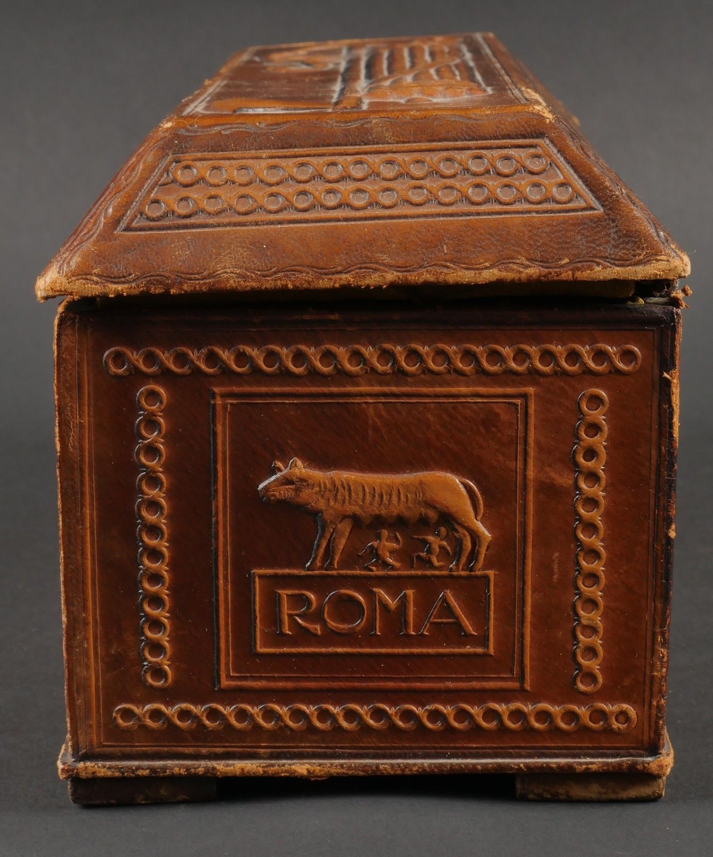 Leather case presented to Fascist dignitaries who took part in the march on Rome. Inside, the Littorio scarf reserved for those who took part in the march on Rome. Very handsome box entirely covered in leather, with numerous bundles and military decorations. Littorio scarf complete with tassels. The lid is detached from the box. Dimensions 25.5 x 10.5 x 12.5 cm. Some wear and patina. Condition II+. Leather box presented to fascist dignitaries who took part in the March on Rome containing inside the Littorio sash reserved for participants of the march. Fine box entirely covered in leather with numerous fasces and military decorations. Complete Littorio sash with tassels. Lid detached from the box. Dimensions 25.5 x 10.5 x 12.5 cm. Some wear and patina on the piece. Condition II+