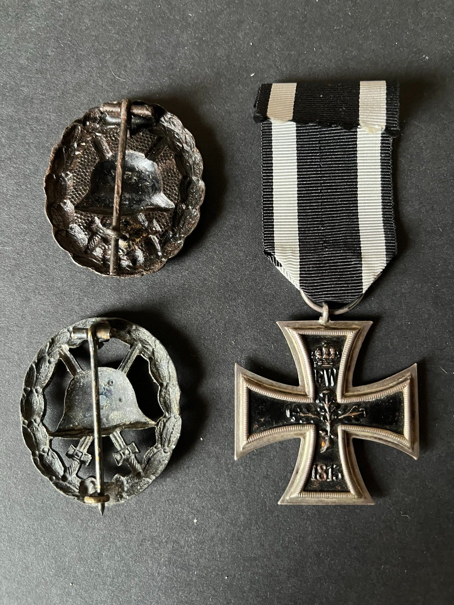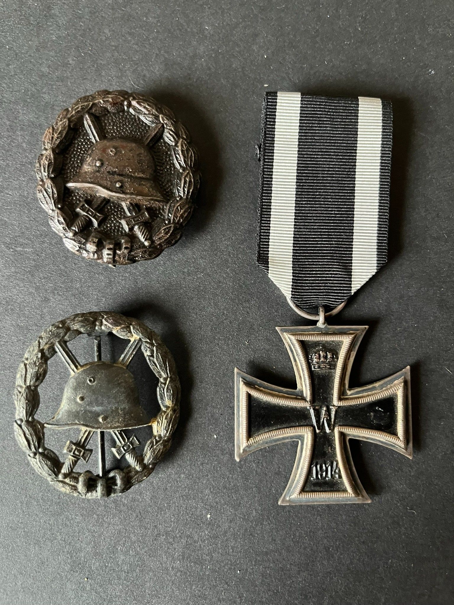 3 pieces. Croix de Fer 1914 de 2ème classe argent, ring stamped KO, later ribbon, insigne des Blessés Noir, insigne des Blessés Noir version ajourée, oxidation. Set of three pieces. 1914 Iron Cross 2nd Class in silver with KO hallmark on the ring and later ribbon, Black Wound Badge, and openwork version of the Black Wound Badge. Some oxidation present.