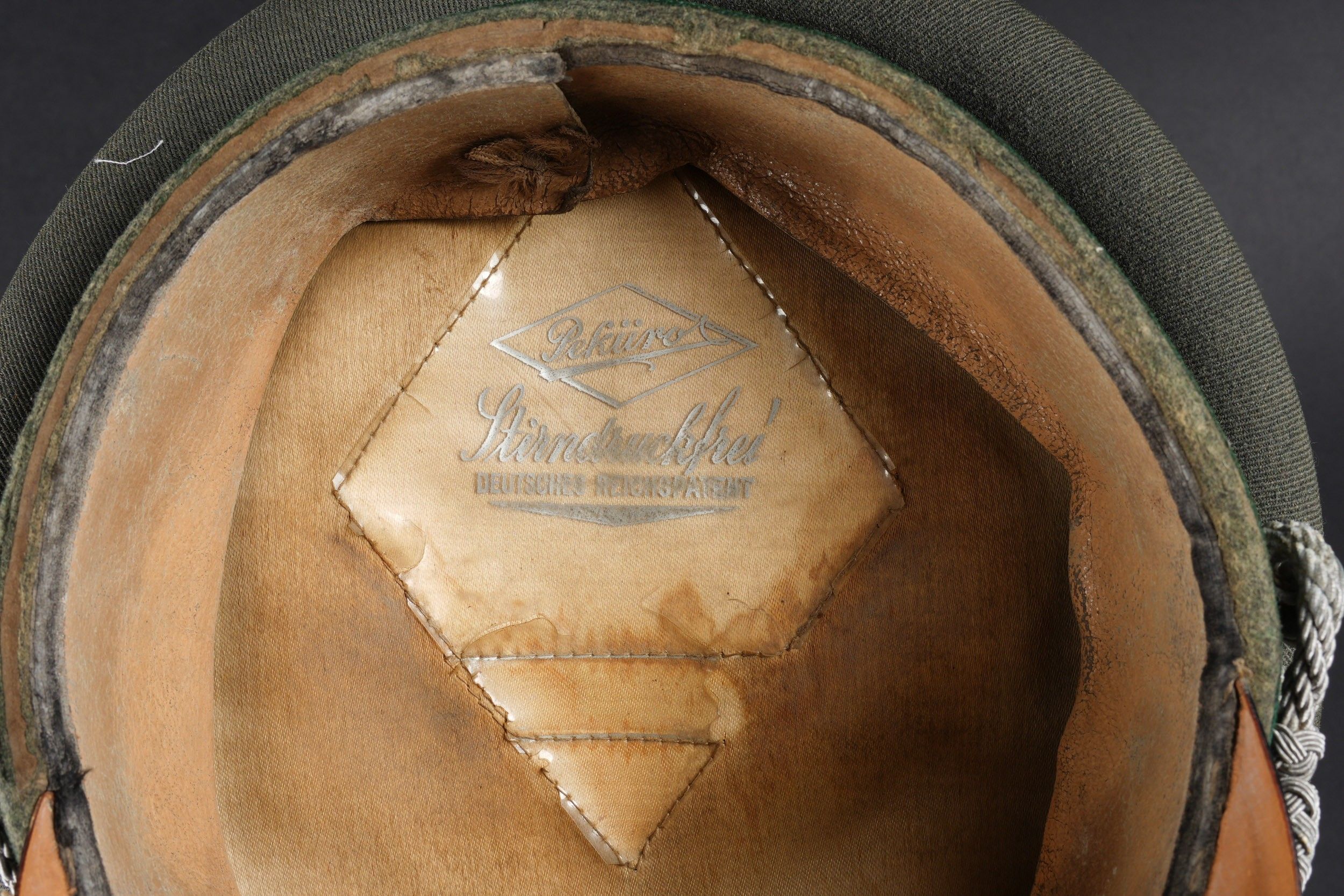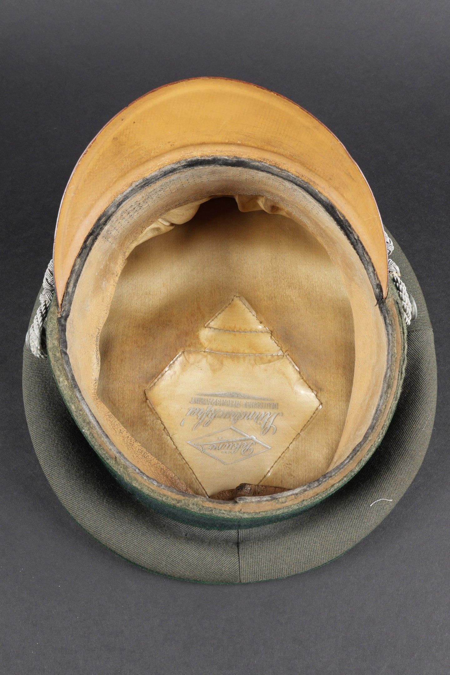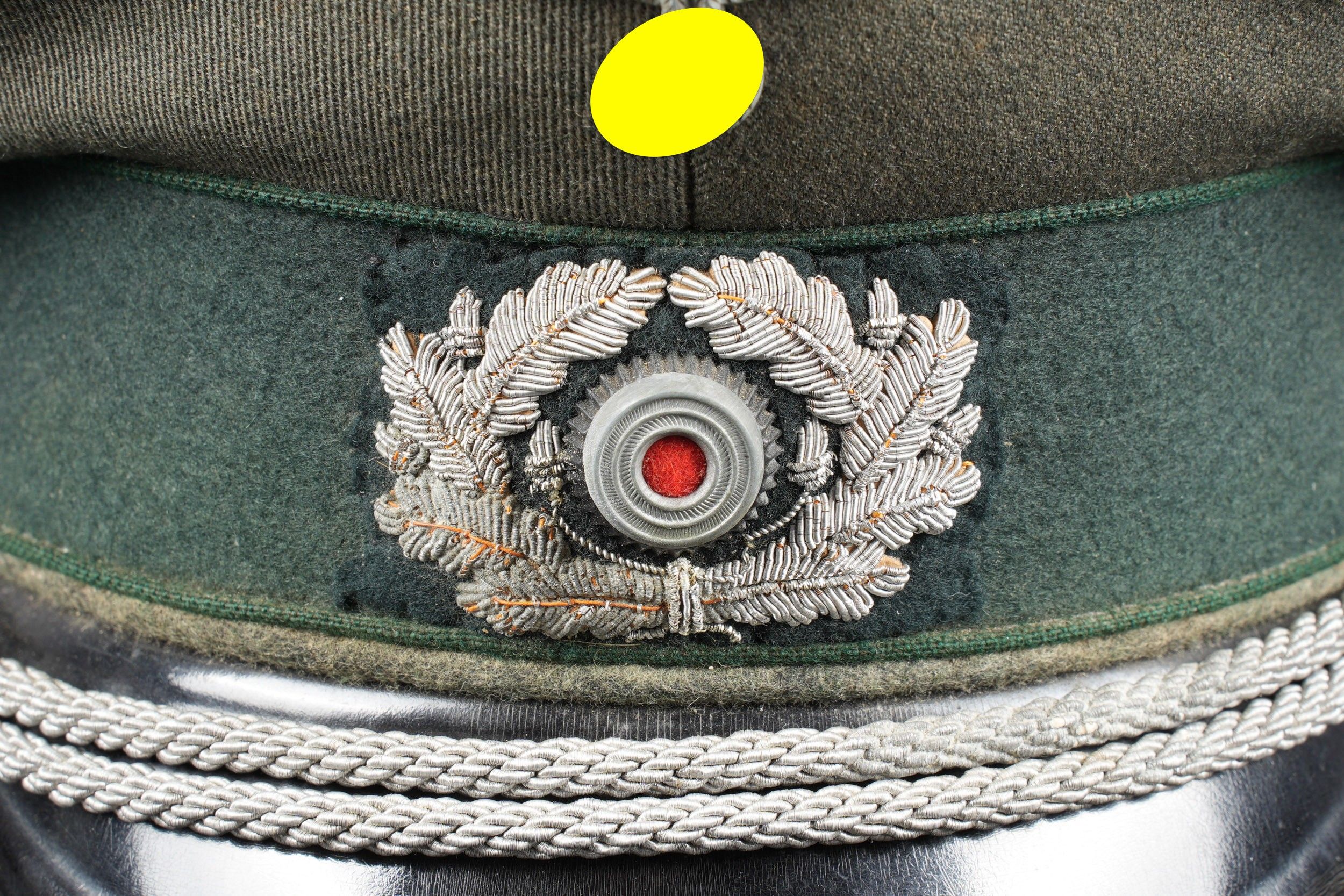 Administration officer's cap. In Feldgrau grey gabardine. Headband in duck green cloth. Triple dark green administration piping. Metal eagle and cockade. Oak leaves in silver cannetille. False chinstrap in the officer's style complete. Interior lined in silky fabric. Mica present, but incomplete. Made by Peküro. Tan leather sweatband. The edge of the headdress is worn. Some wear and patina. Condition II+. German administration officer cap in greyFeldgrau gabardine. Band in duck green cloth with triple dark green piping of the administration. Metal eagle and cockade. Silver bullion oak leaves. Complete officer-style chinstrap. Silk-lined interior with mica present but incomplete. Made by Peküro. Tan leather sweatband. Edge of the visor worn. Some wear and patina on the piece. Condition II+
