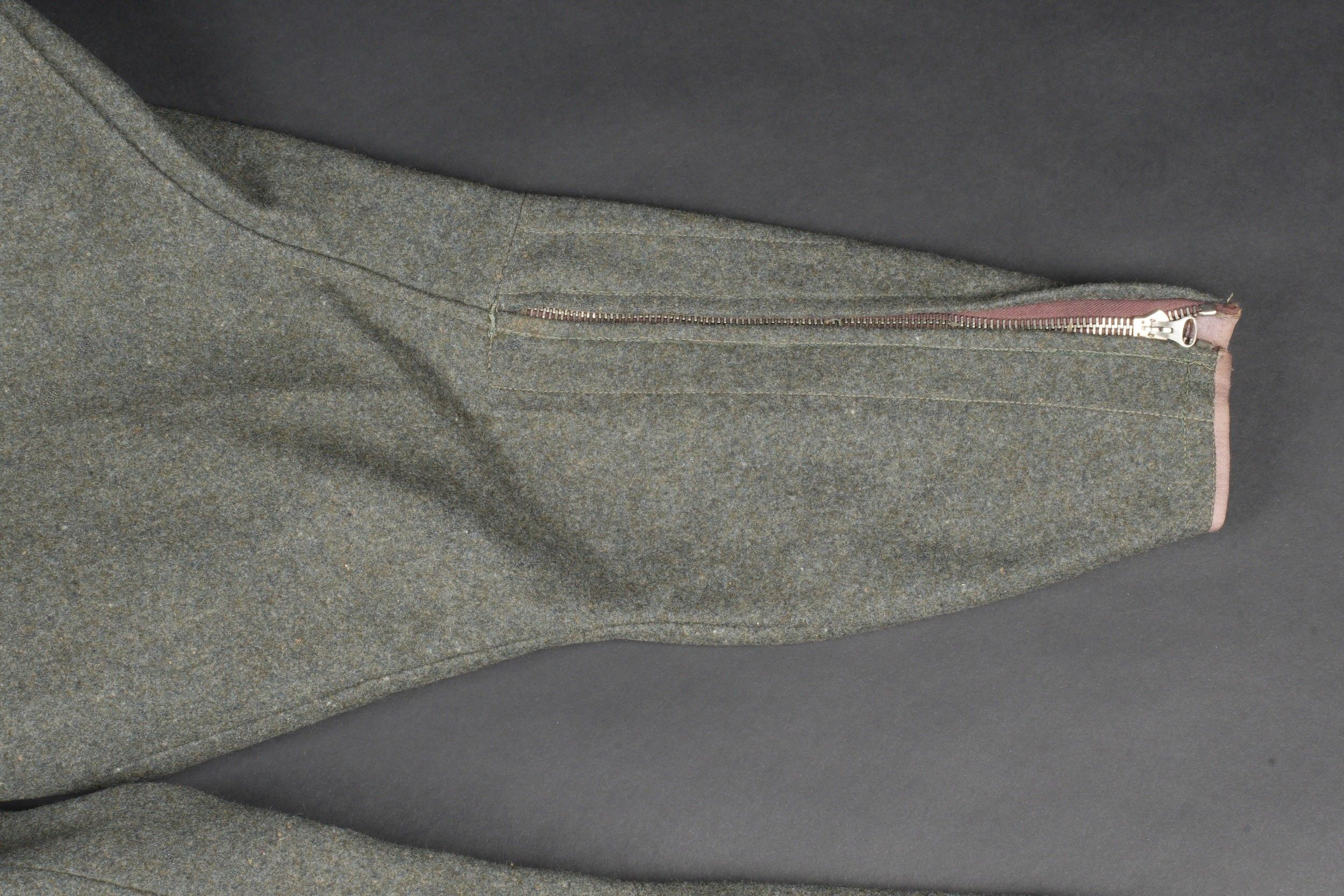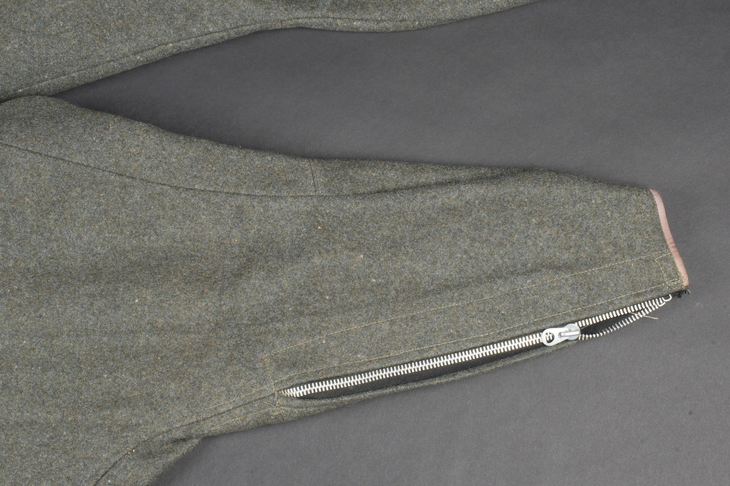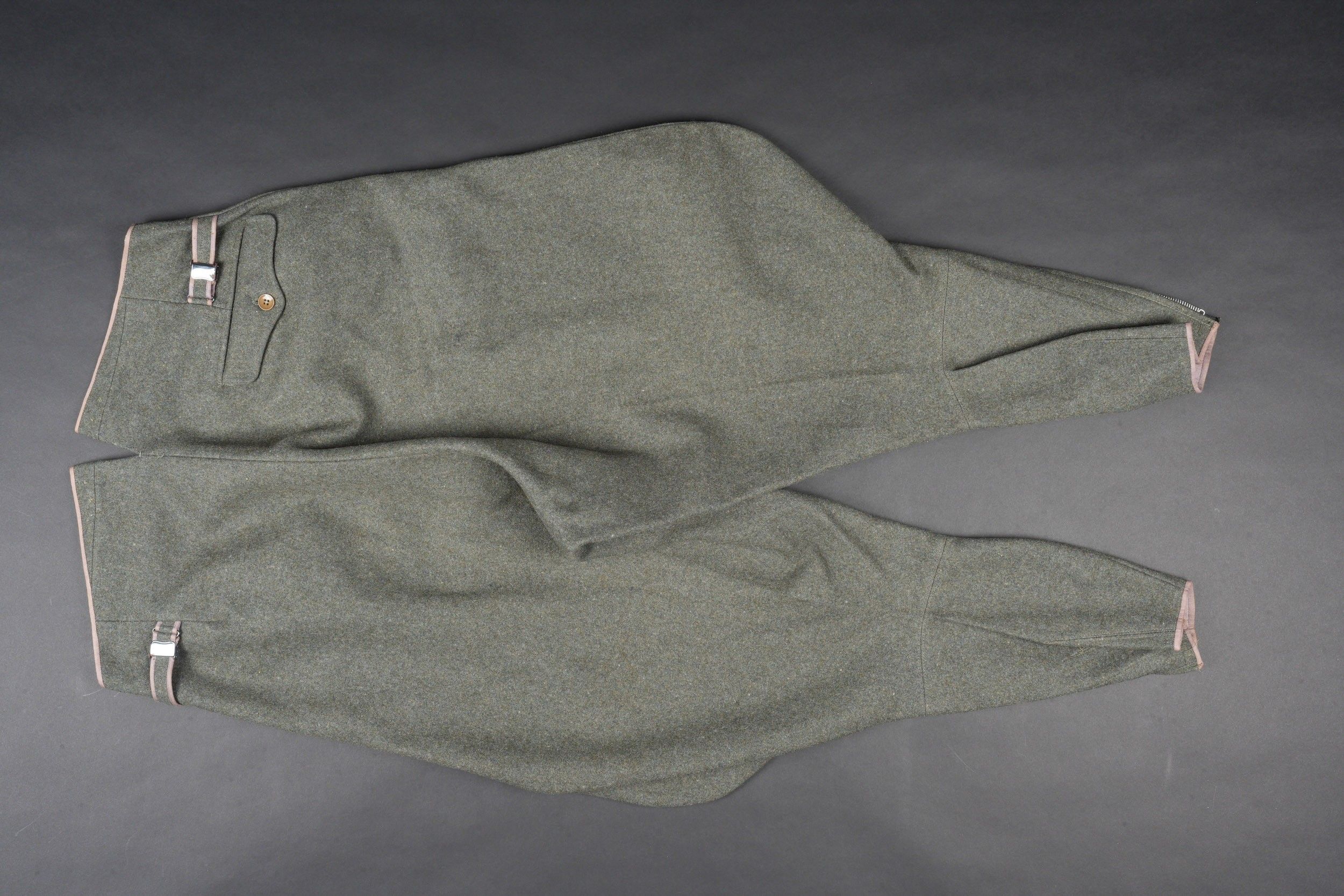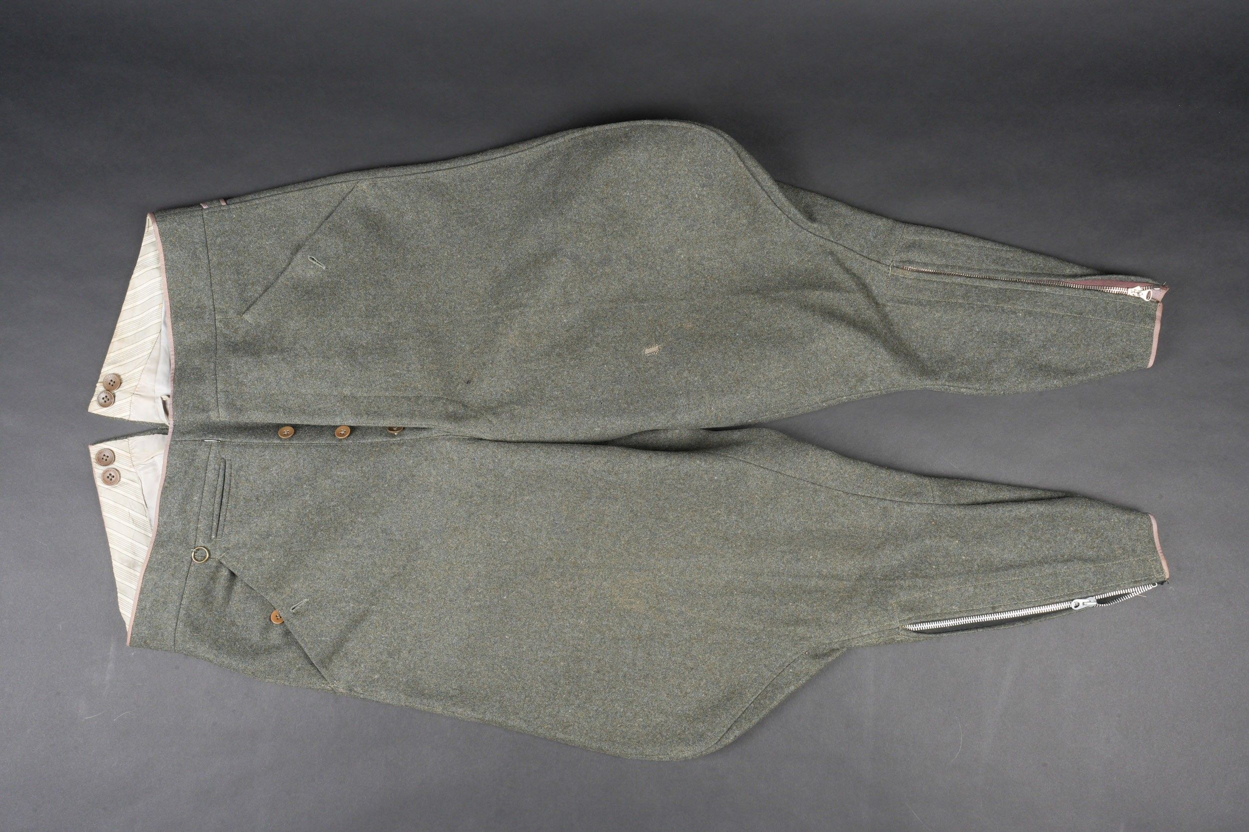 Saddlebags. In Feldgrau cloth. All buttons are present. Some are made by Zimmermann. Legs close with functional zips. Interior lined in civilian fabric. No visible markings. Some wear and patina to be noted, as well as a few moth marks and repairs. Condition II+. Riding breeches in Feldgrau cloth. All buttons present, some marked Zimmermann. Lower legs with working zippers. Lined in civilian fabric without visible markings. Some wear and patina on the piece with minor moth traces and repairs. Condition II+