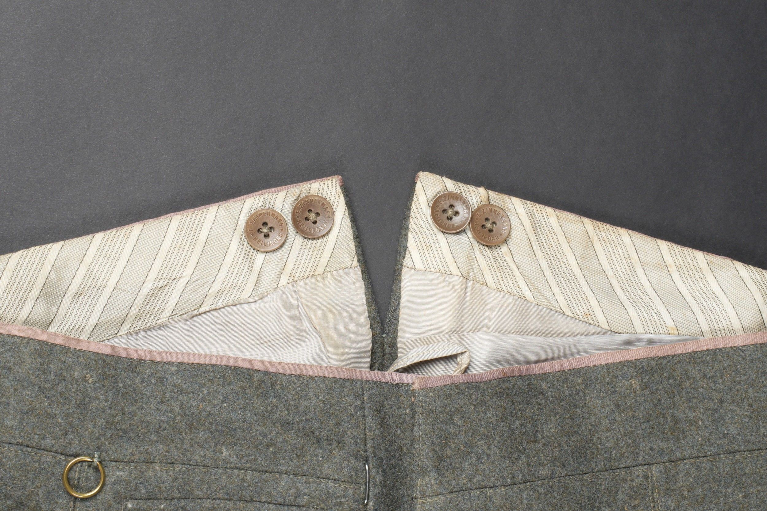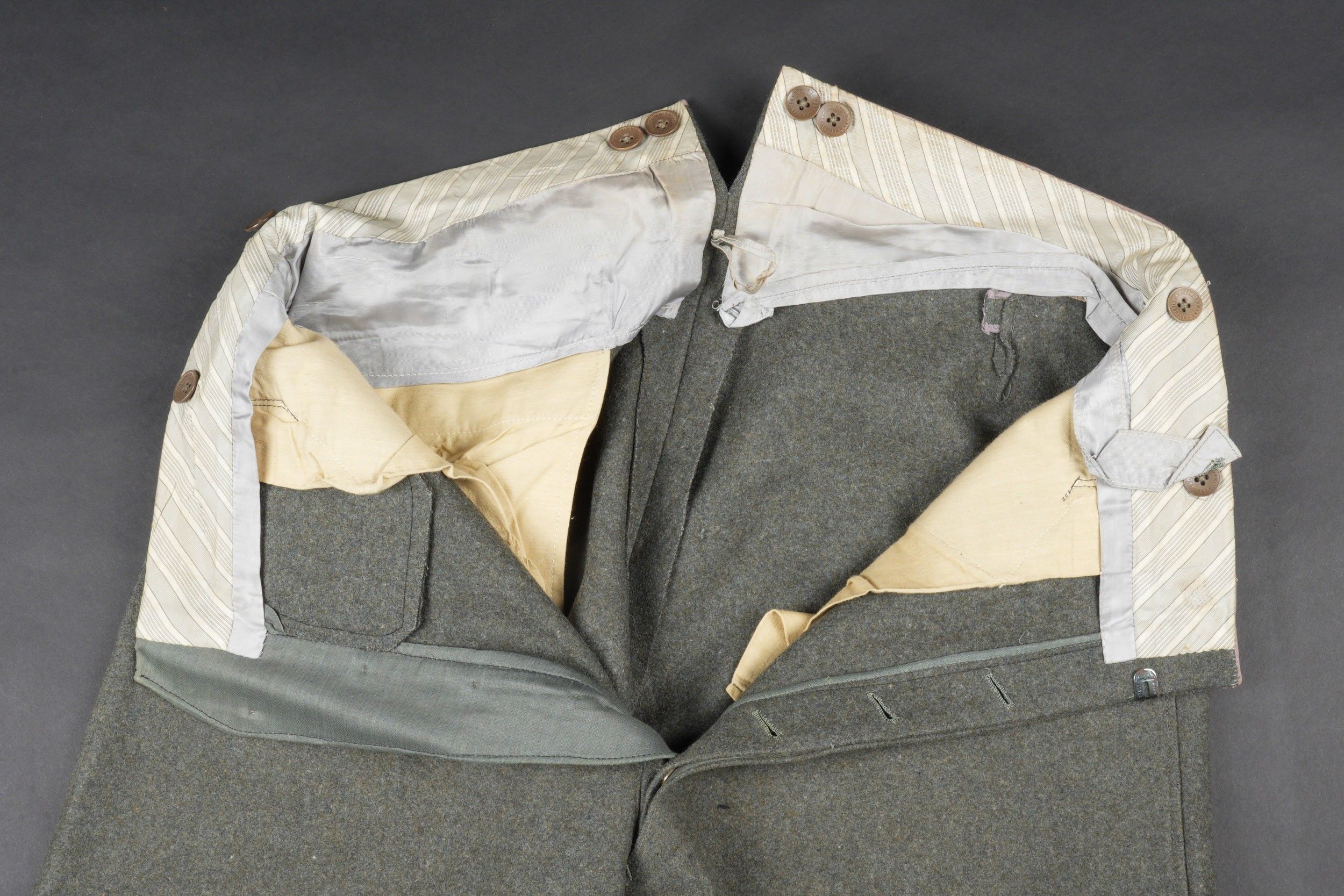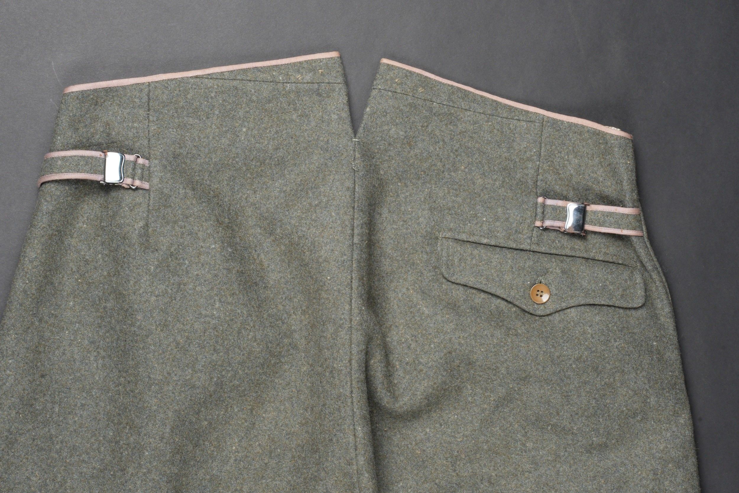 Saddlebags. In Feldgrau cloth. All buttons are present. Some are made by Zimmermann. Legs close with functional zips. Interior lined in civilian fabric. No visible markings. Some wear and patina to be noted, as well as a few moth marks and repairs. Condition II+. Riding breeches in Feldgrau cloth. All buttons present, some marked Zimmermann. Lower legs with working zippers. Lined in civilian fabric without visible markings. Some wear and patina on the piece with minor moth traces and repairs. Condition II+