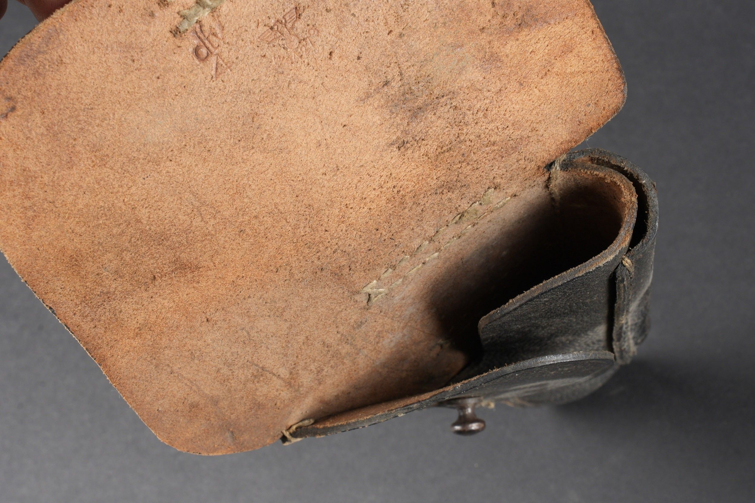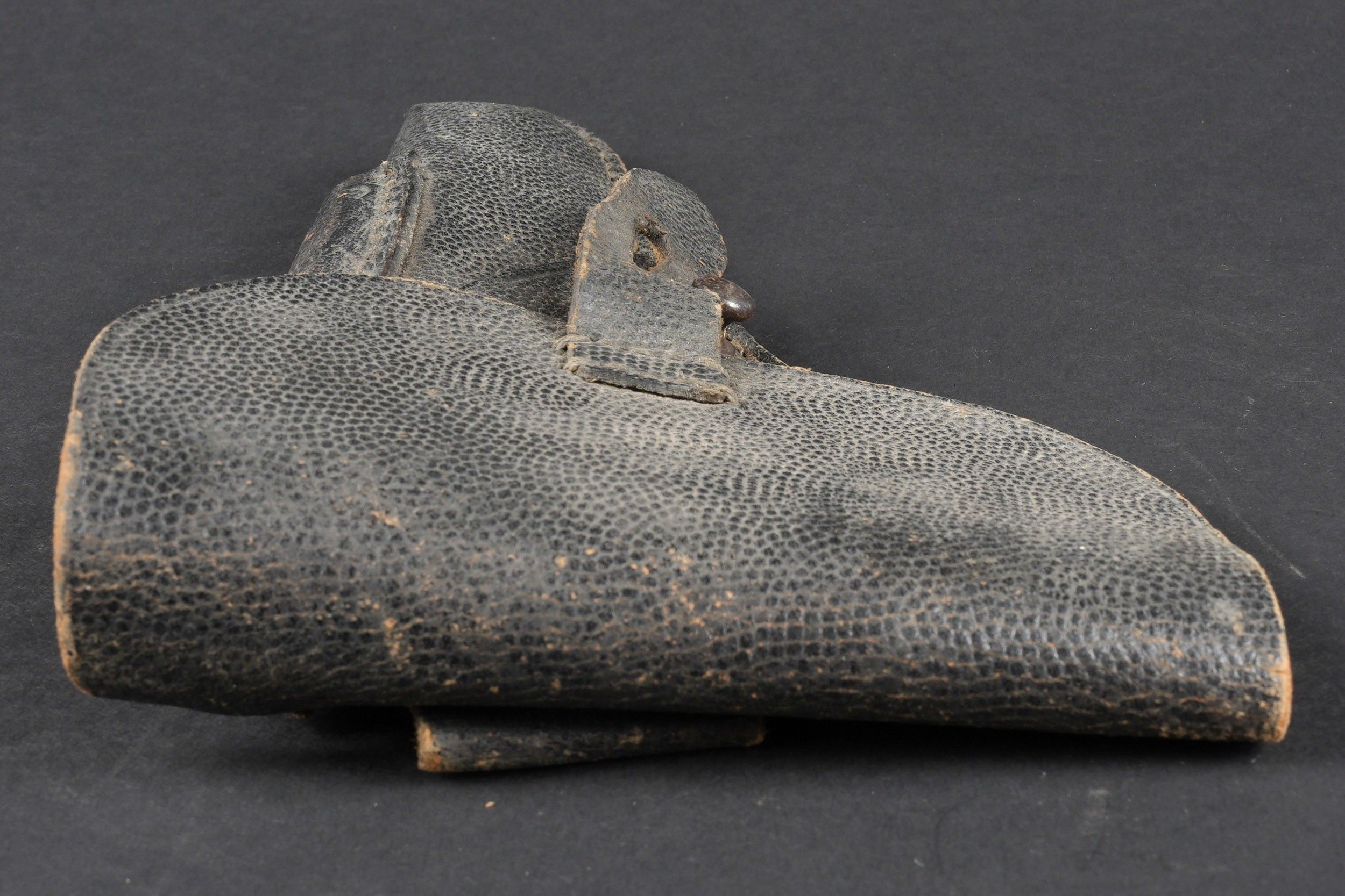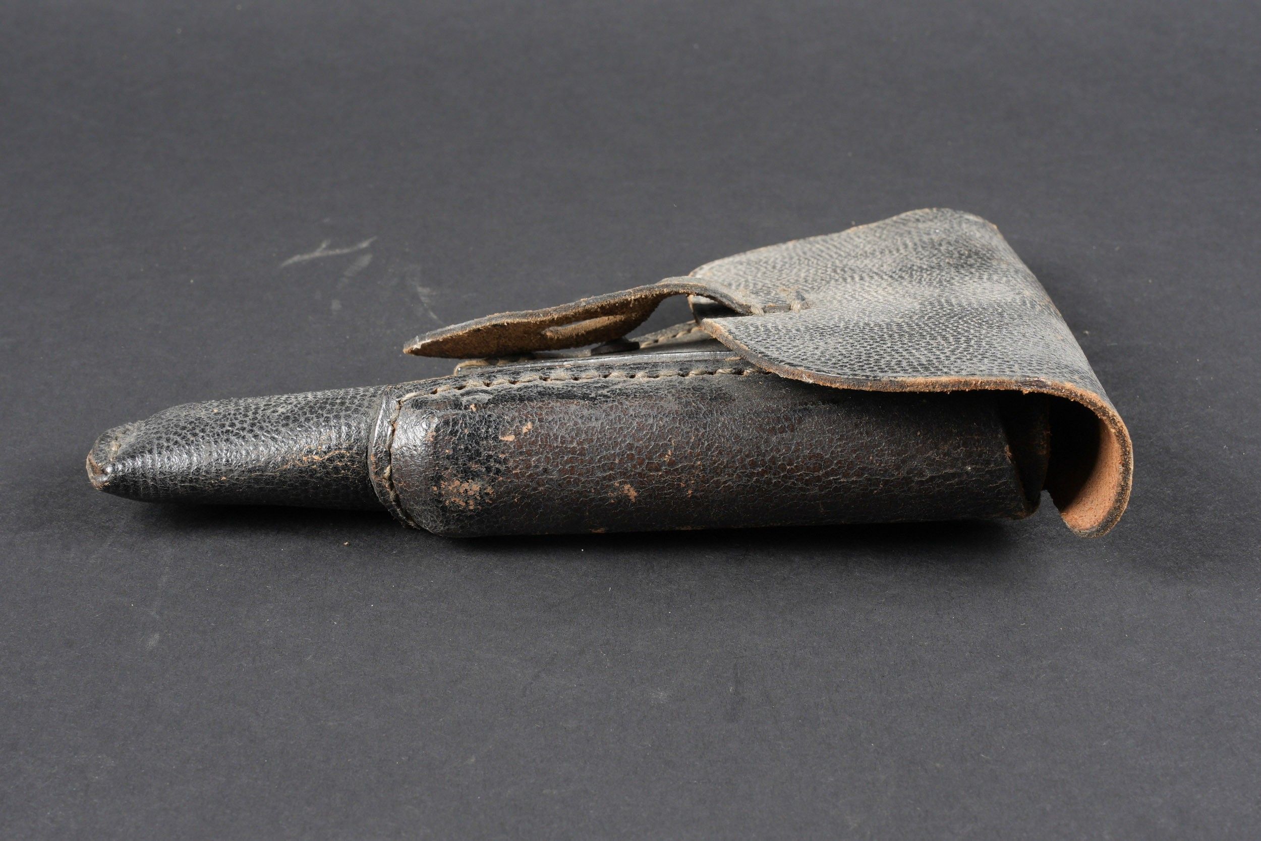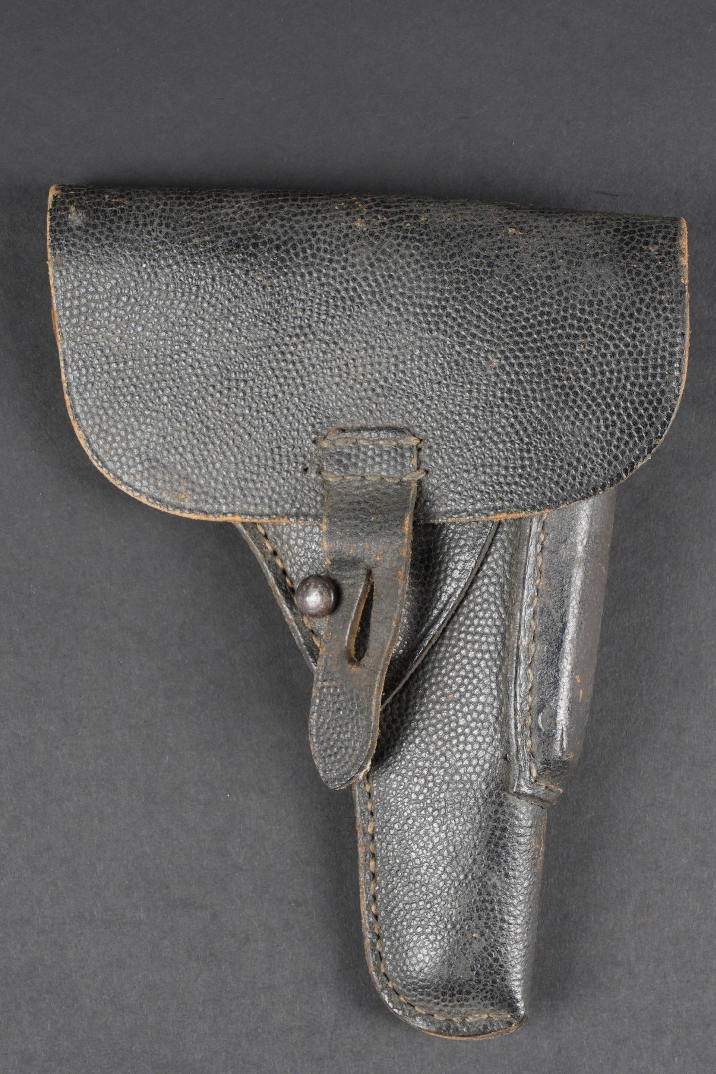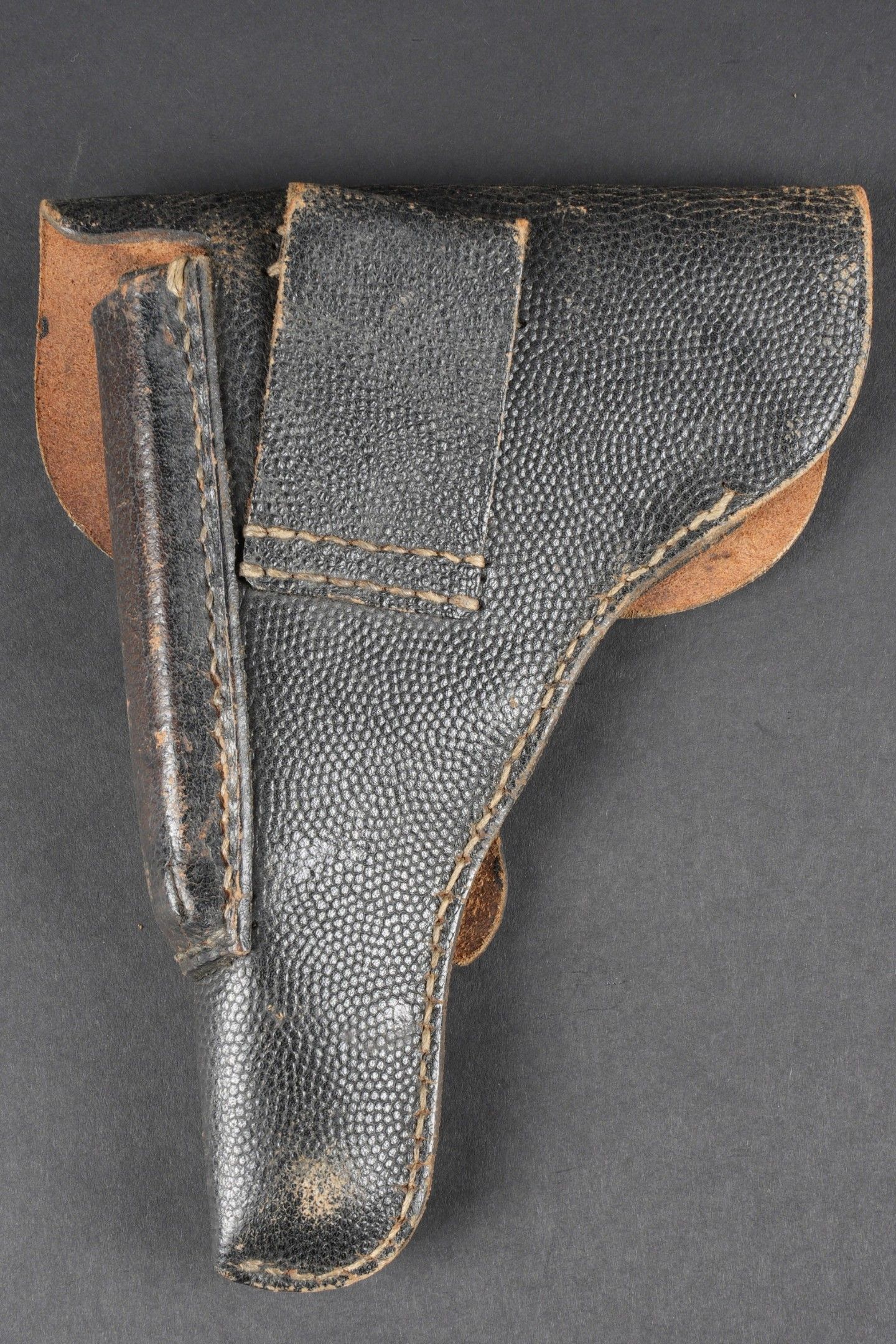 Holster for German pistol. Black grained leather. The closing strap is functional. The rear loop is complete. DTV 4 manufacture with Waa eagle. Some wear and patina. Condition II+. German pistol holster in black grained leather. Functional closing strap. Rear belt loop complete. Made by DTV 4 with Waa eagle. Some wear and patina on the piece. Condition II+