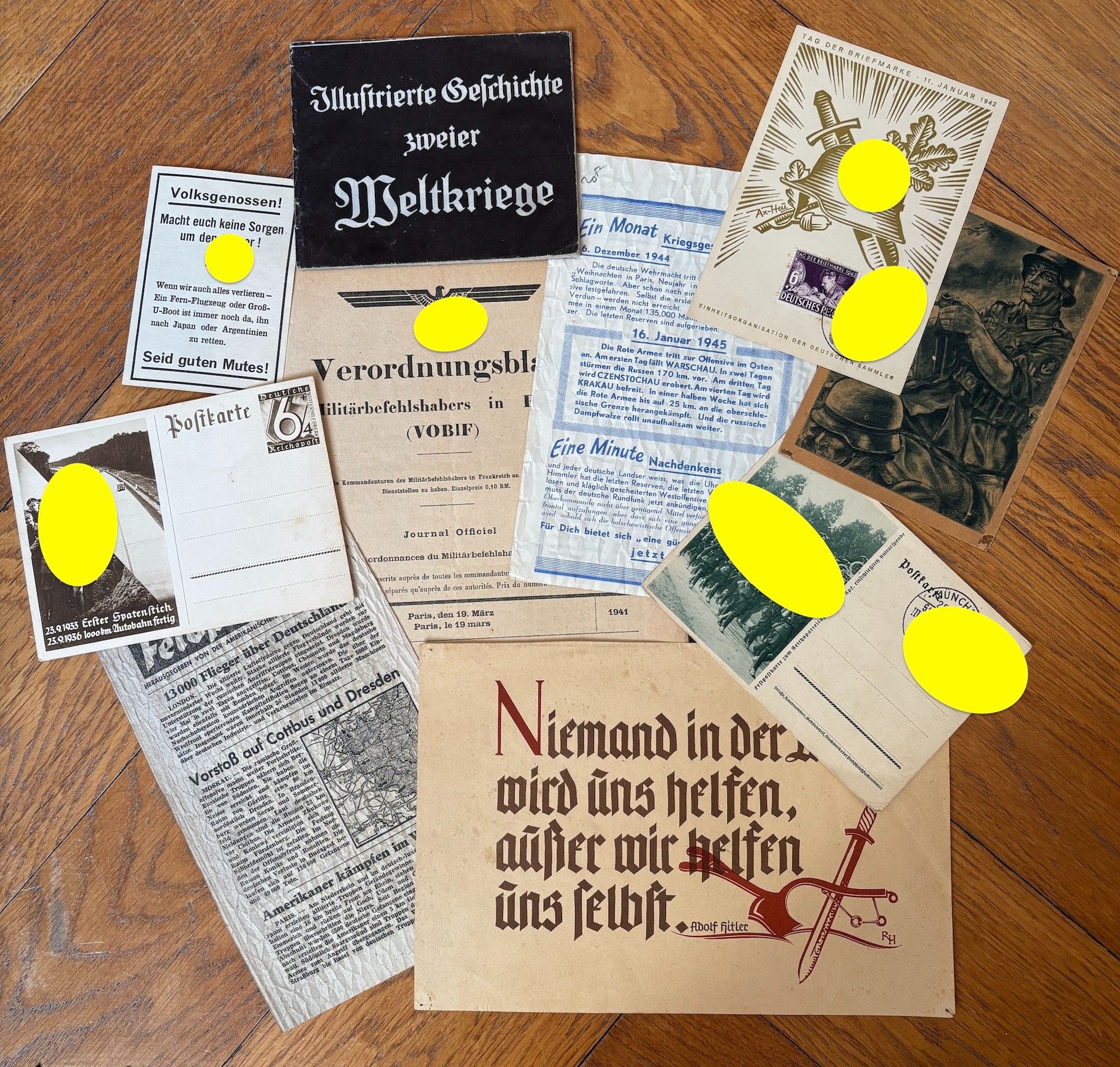 German documents. Including a Feldpost leaflet. A Volksgenossen leaflet. A leaflet entitled ein Monat Kriegsgeschichte. A booklet entitled Illustrierte Geschichte zweier Weltkriege. A poster entitled Niemand in der Welt wird uns helfen ausser wir helfen uns selbst. Four postcards. 5 blank folder Verordnungsblatt des Militärbefehlshabers in Frankreich. Some wear and patina to parts. Condition II+. German Documents. Including a Feldpost leaflet a Volksgenossen leaflet an Ein Monat Kriegsgeschichte leaflet a booklet titled Illustrierte Geschichte zweier Weltkriege a small poster titled Niemand in der Welt wird uns helfen ausser wir helfen uns selbst four postcards and five blank folders titled Verordnungsblatt des Militärbefehlshabers in Frankreich showing light wear and a period patina Condition II+