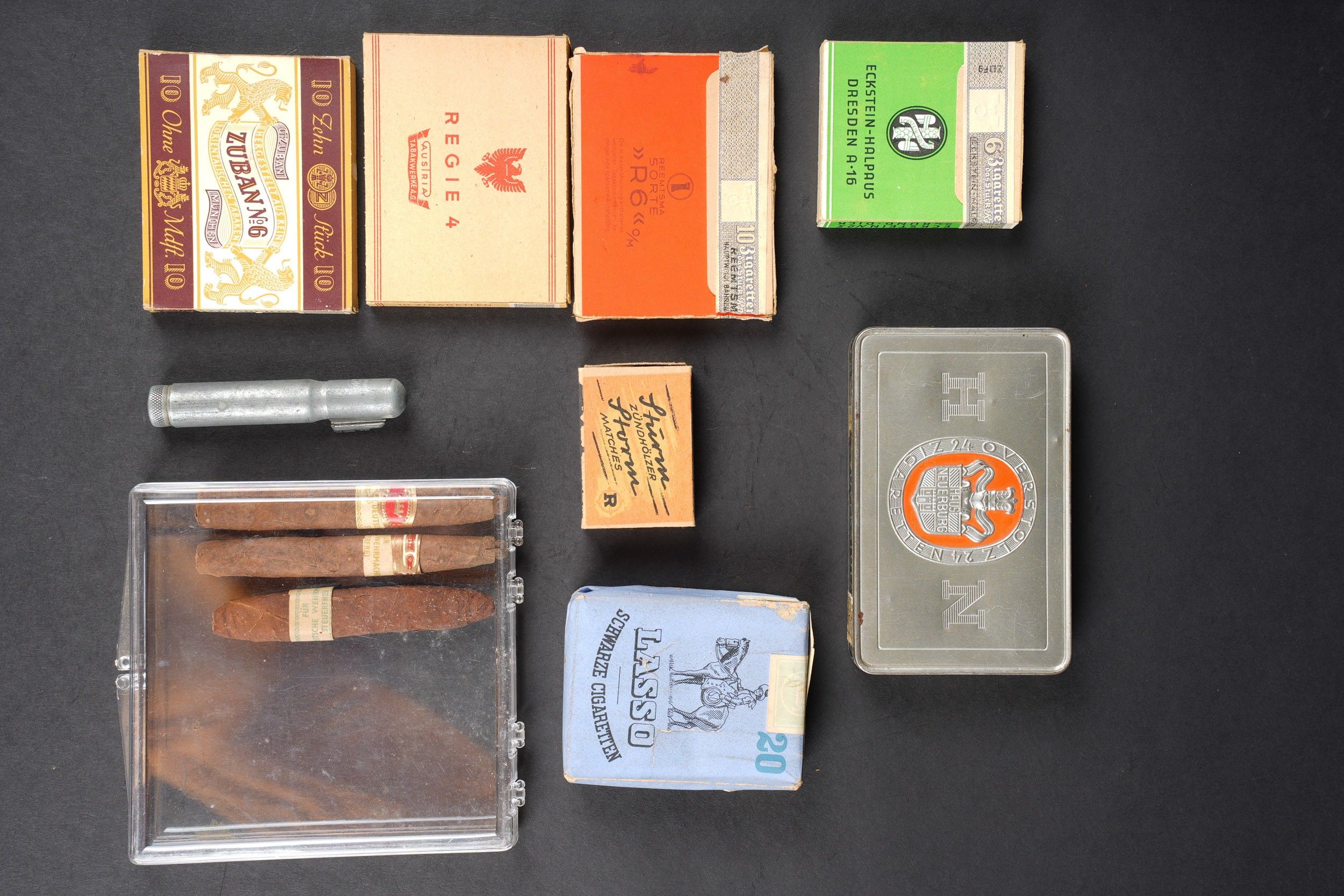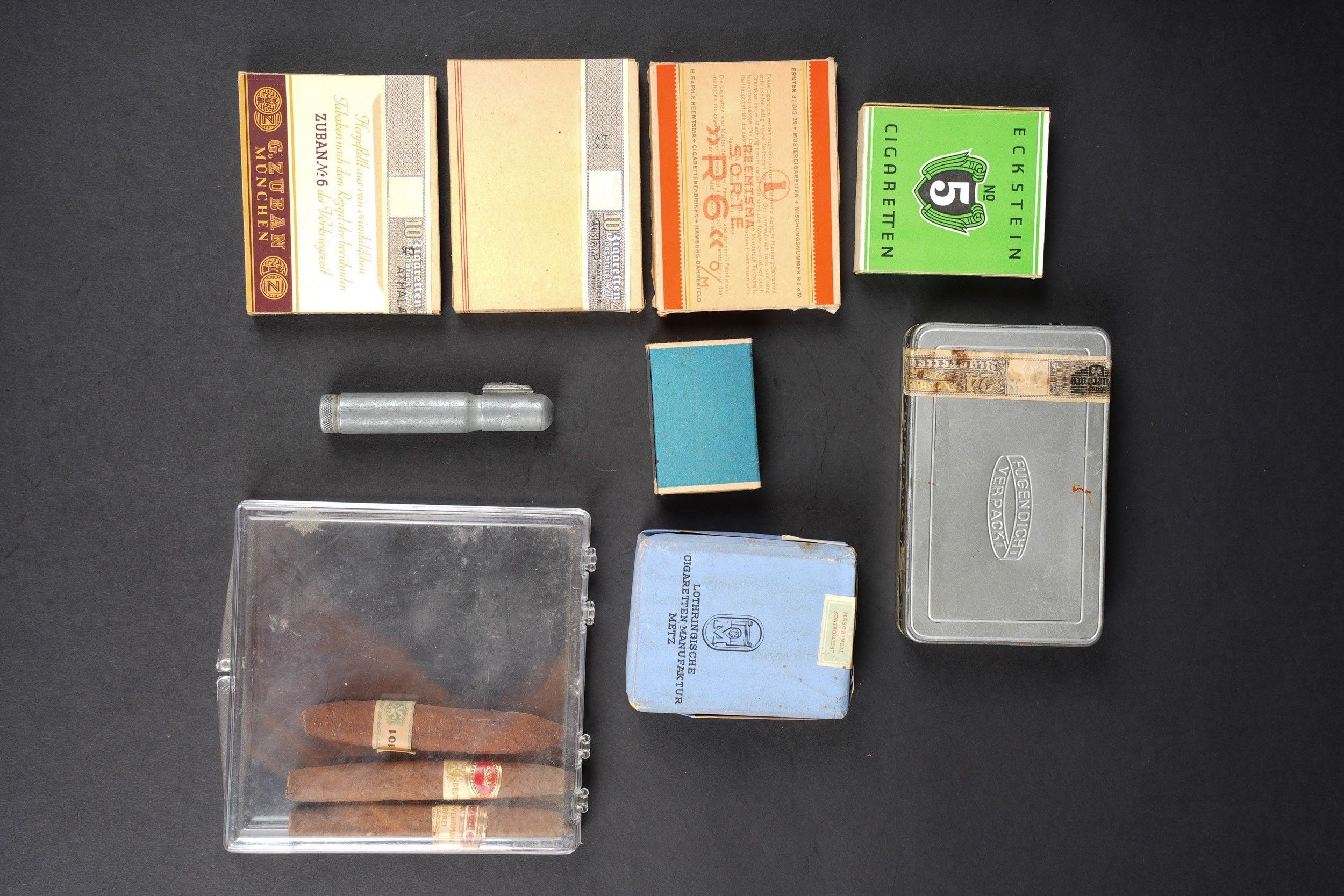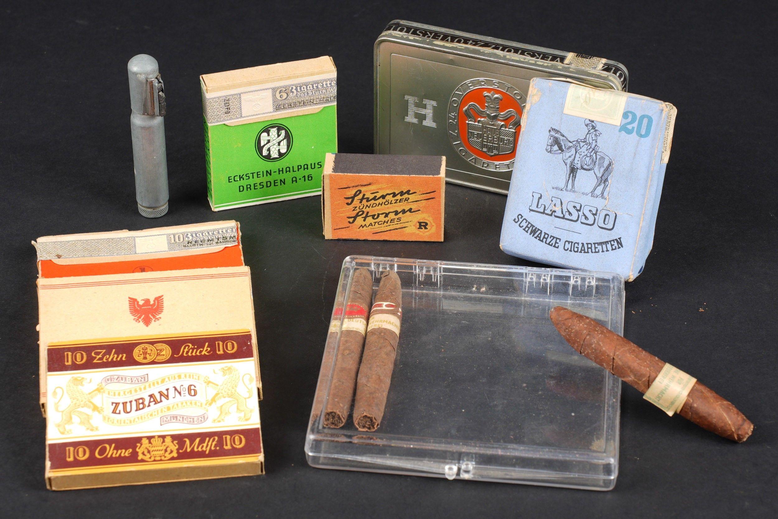 German smoker's accessories. Comprising an incomplete matchbox, marked Stürm. A metal tinderbox, DRKW. An unopened pack of Reemtsma Sorte cigarettes. An unopened packet of cigarettes, marked Regie 4. An unopened packet of G Zuban München cigarettes. An unopened pack of Lasso cigarettes. All closure bands have a German eagle. Three cigars. An empty metal box for HN cigarettes. One cigarette pack, unopened, Eckstein Halpaus Dresden. Some wear and patina to be noted. Condition II+. German smoking accessories including one incomplete matchbox marked Stürm, one metal tinder lighter marked DRKW, one unopened Reemtsma Sorte cigarette pack, one unopened Regie 4 pack, one unopened G. Zuban München pack, one unopened Lasso pack, all with German eagle closure bands, three cigars, one empty metal HN cigarette tin, and one unopened Eckstein Halpaus Dresden pack. Some wear and patina on the pieces. Condition II+