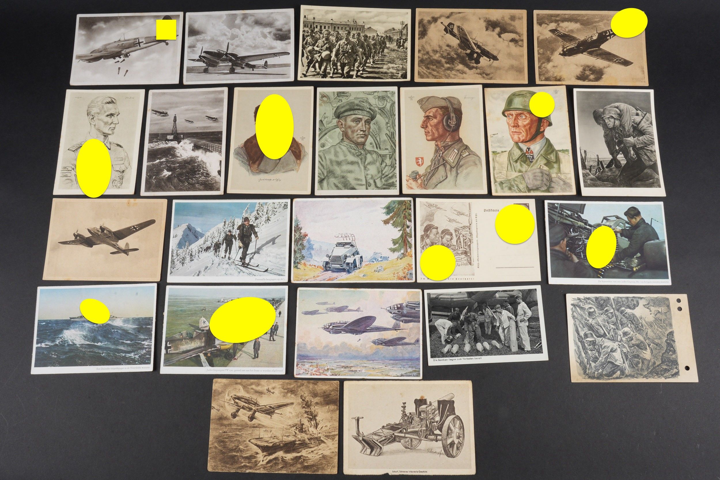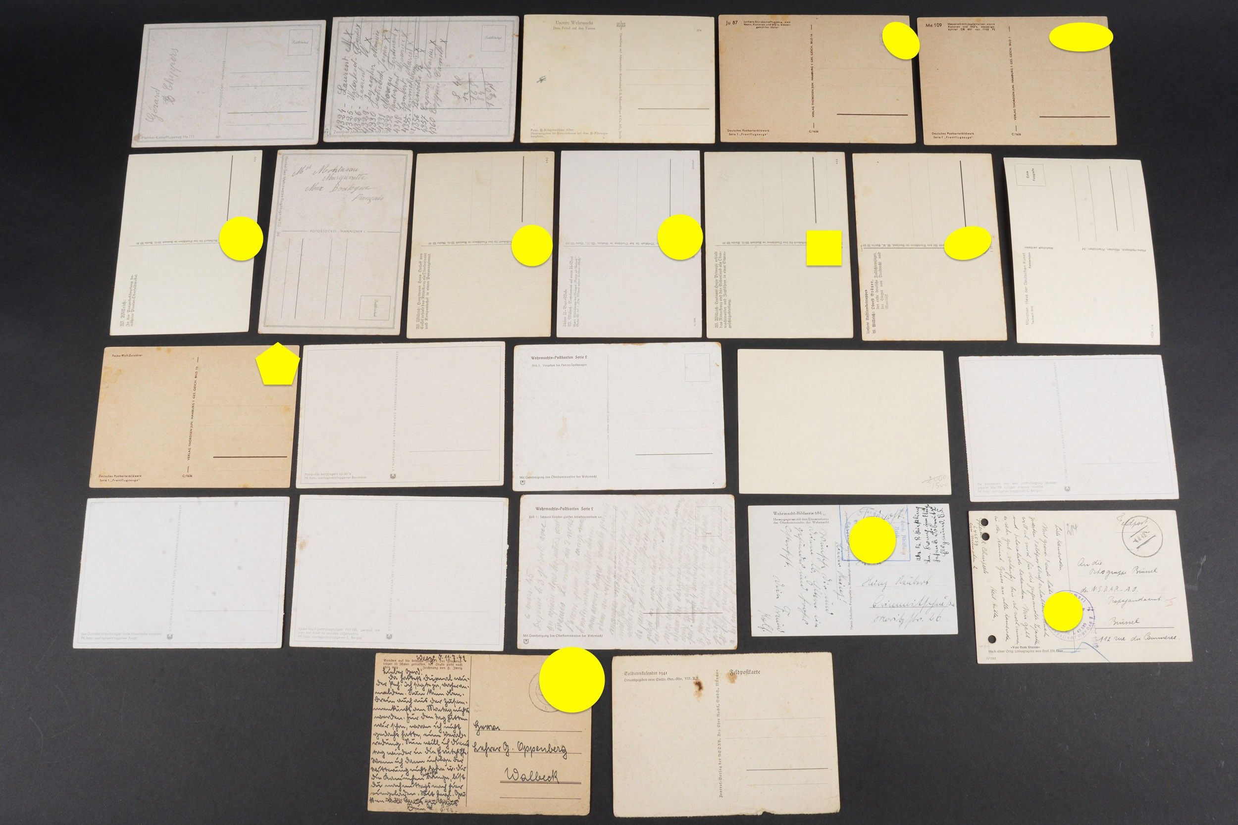 German postcards. Comprising 24 postcards, some in colour. Only postcards are filled on the back. One postcard is perforated on the left edge. A visible Feldpost number L 42539, corresponding to Flak regiment 54. Some wear and patina to the pieces. Condition II+. German postcards including 24 cards, some in colour. Only a few cards filled on the back. One card perforated along the left edge. Feldpost number L 42539 visible, corresponding to Flak Regiment 54. Some wear and patina on the pieces. Condition II+