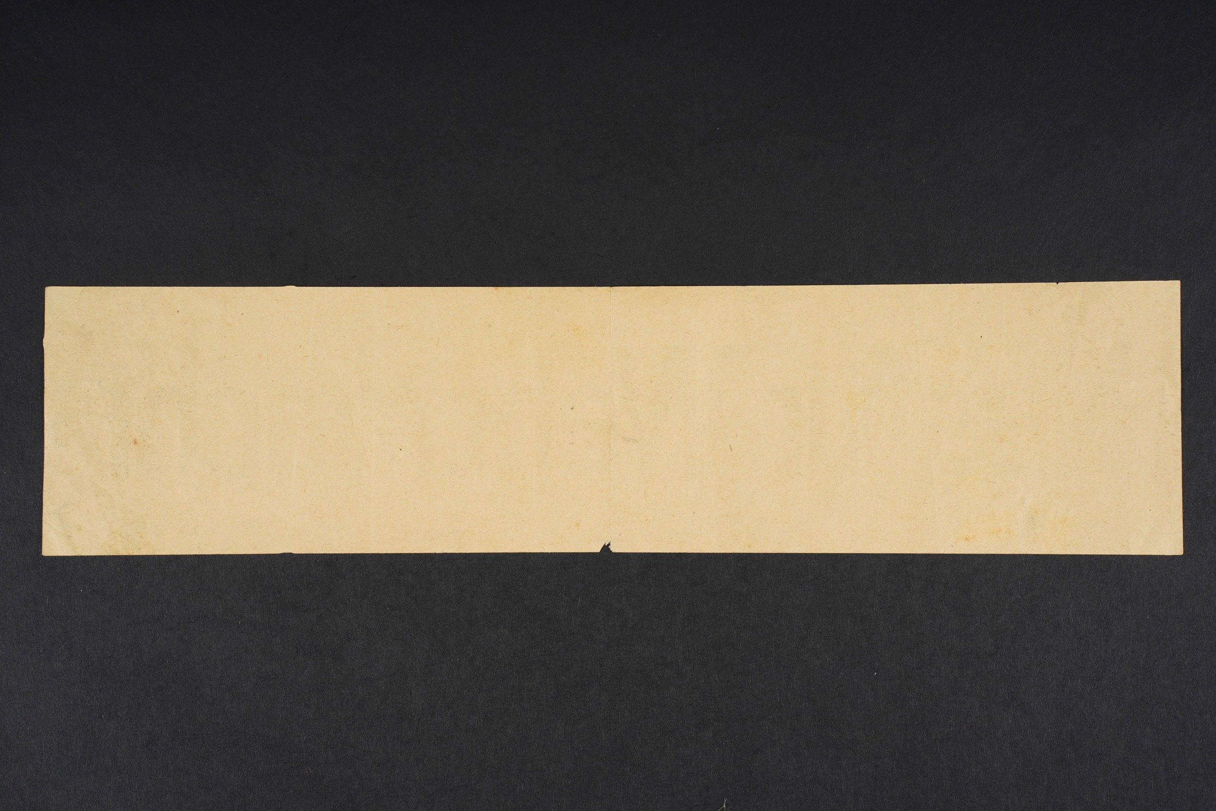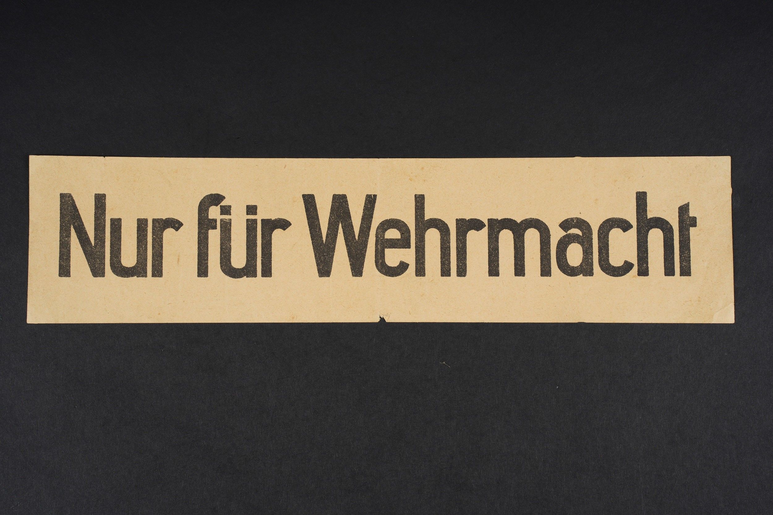 German poster. Paper, marked Nur Für Wehrmacht. Size 7.5 x 29.5 cm. A visible fold and a small missing piece. Slight wear and patina. Condition I-. German sign printed on paper marked Nur Für Wehrmacht. Dimensions 7.5 × 29.5 cm. One visible fold and a small loss. Slight wear and patina on the piece. Condition I-