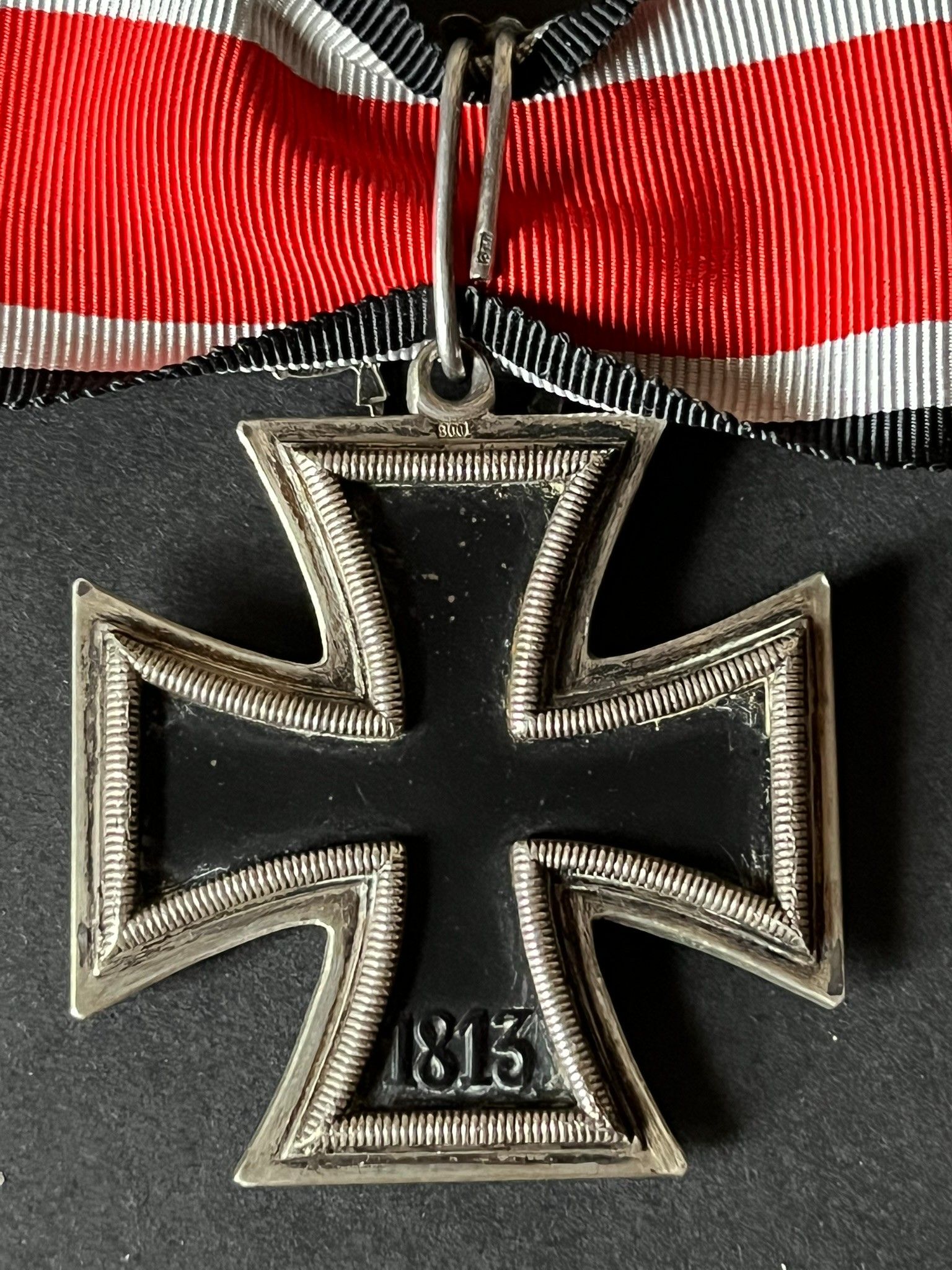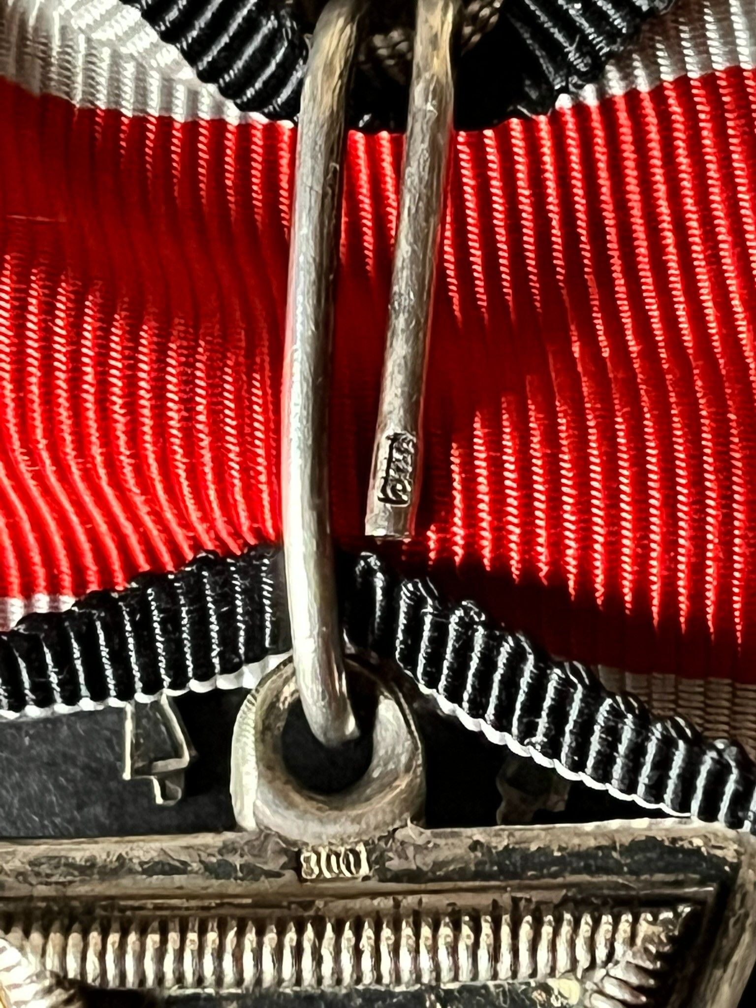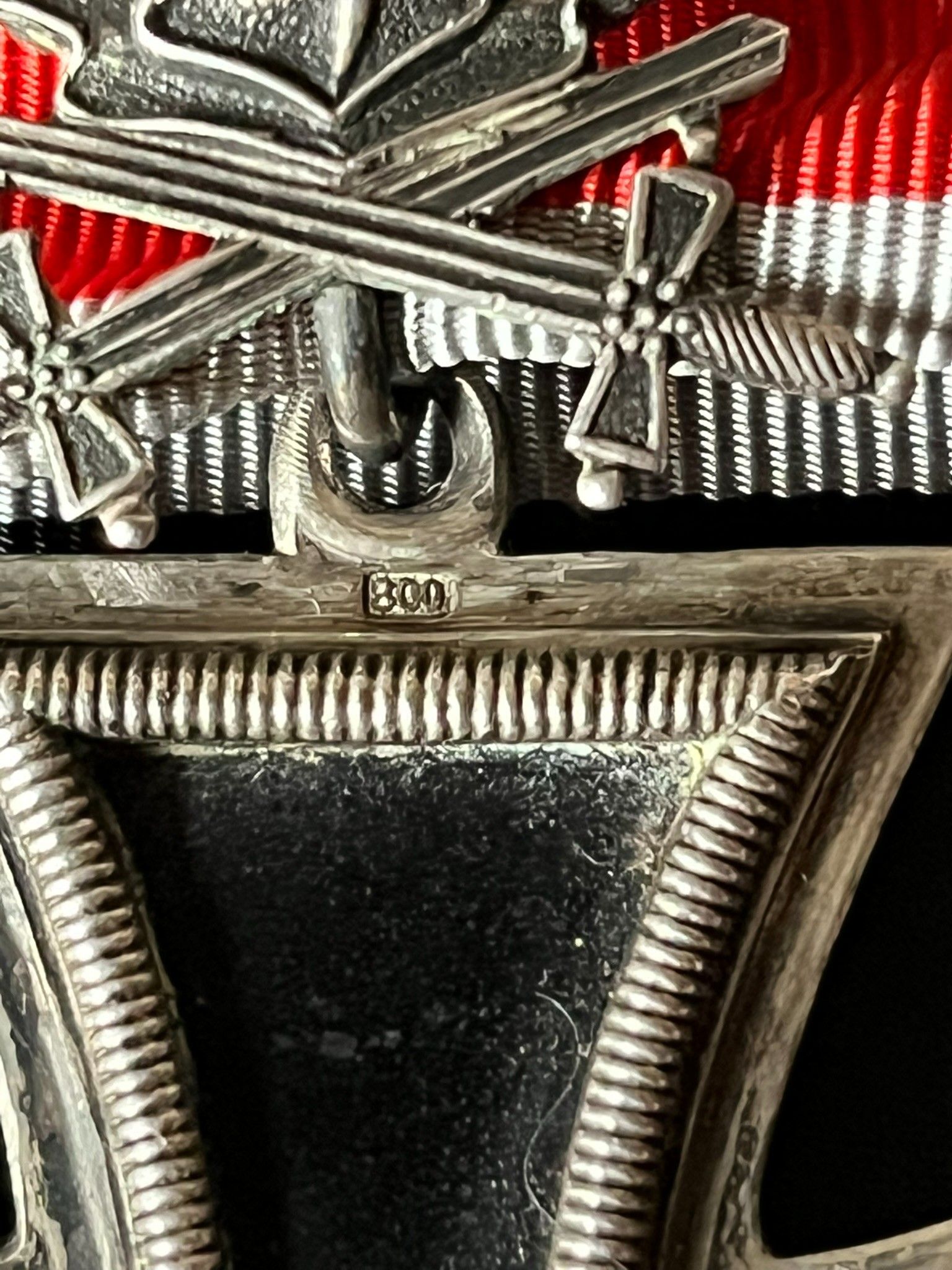 REPRODUCTION of the 1939 Knight's Cross of the Iron Cross in silver, hallmarked 800, with oak leaves and swords, also in silver and hallmarked 800. Reproduction of the 1939 Knight's Cross of the Iron Cross in silver, hallmarked 800, with oak leaves and swords, also in silver and hallmarked 800.