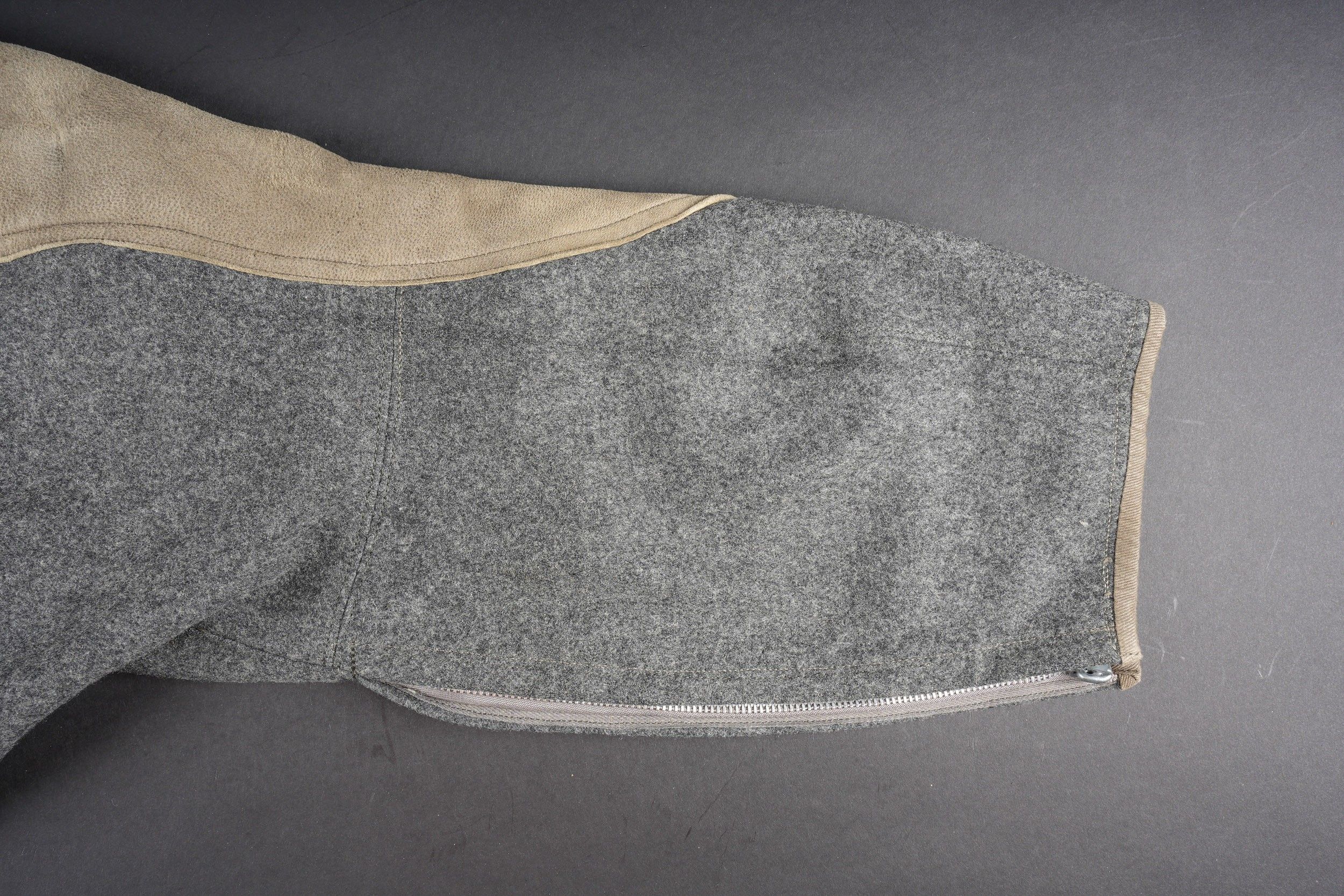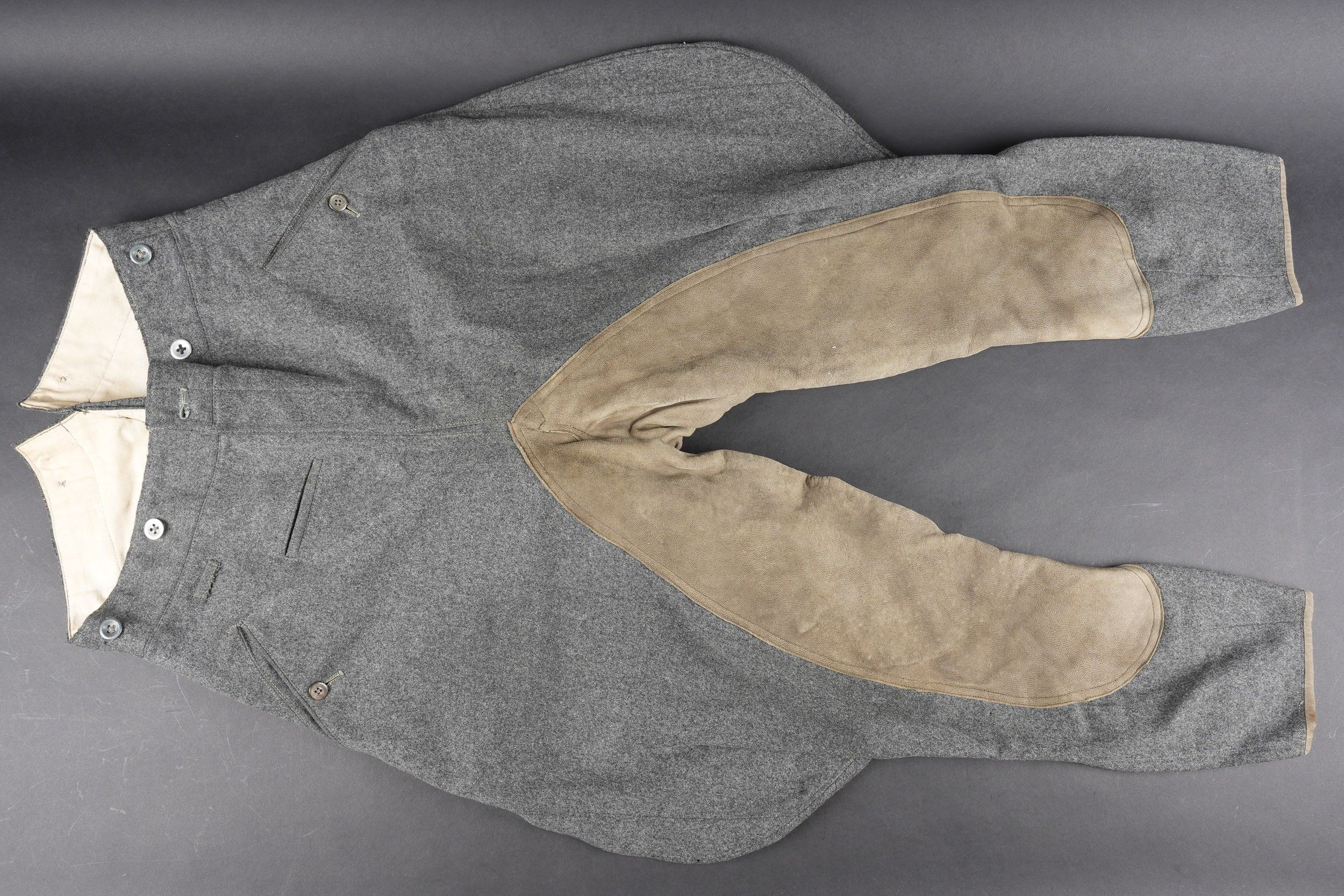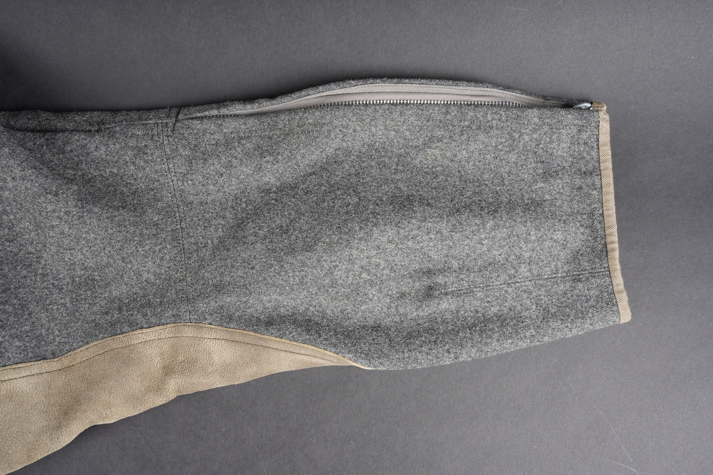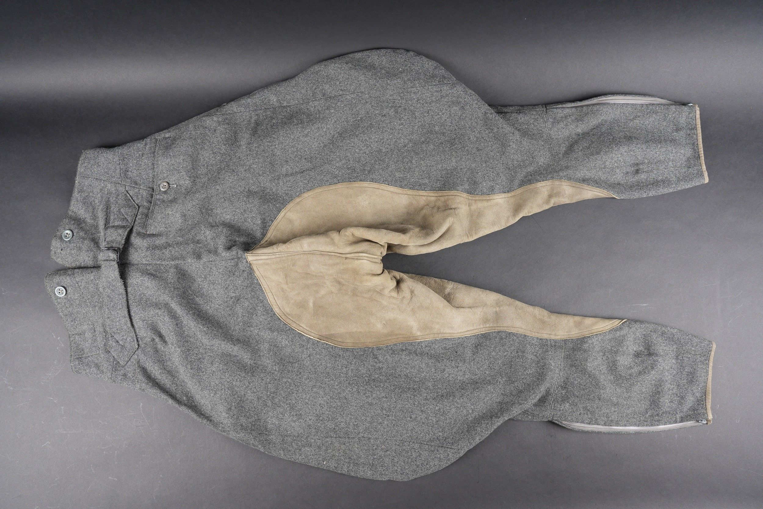 Saddle trousers. Thick stone grey cloth. All buttons are present. Leather reinforcement at the crotch. The bottom of the legs closes with a functional zip, the zips are missing. White cotton lining. Lago markings 82 96 116 108 M. The date is illegible. To the left are the V5 markings. Some wear and patina, as well as a few moth holes. Condition I-. Riding breeches in thick stone-grey cloth. All buttons present. Leather reinforcement at the crotch. Lower legs closed by functional zippers with missing pull tabs. White cotton lining with markings Lago 82 96 116 108 M. Date illegible. Marked V5 on the left. Some wear and patina on the piece with a few discreet moth holes. Condition I-