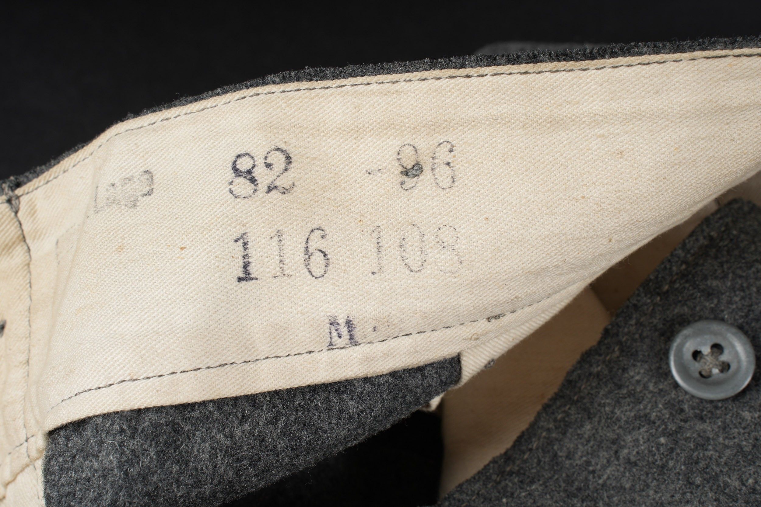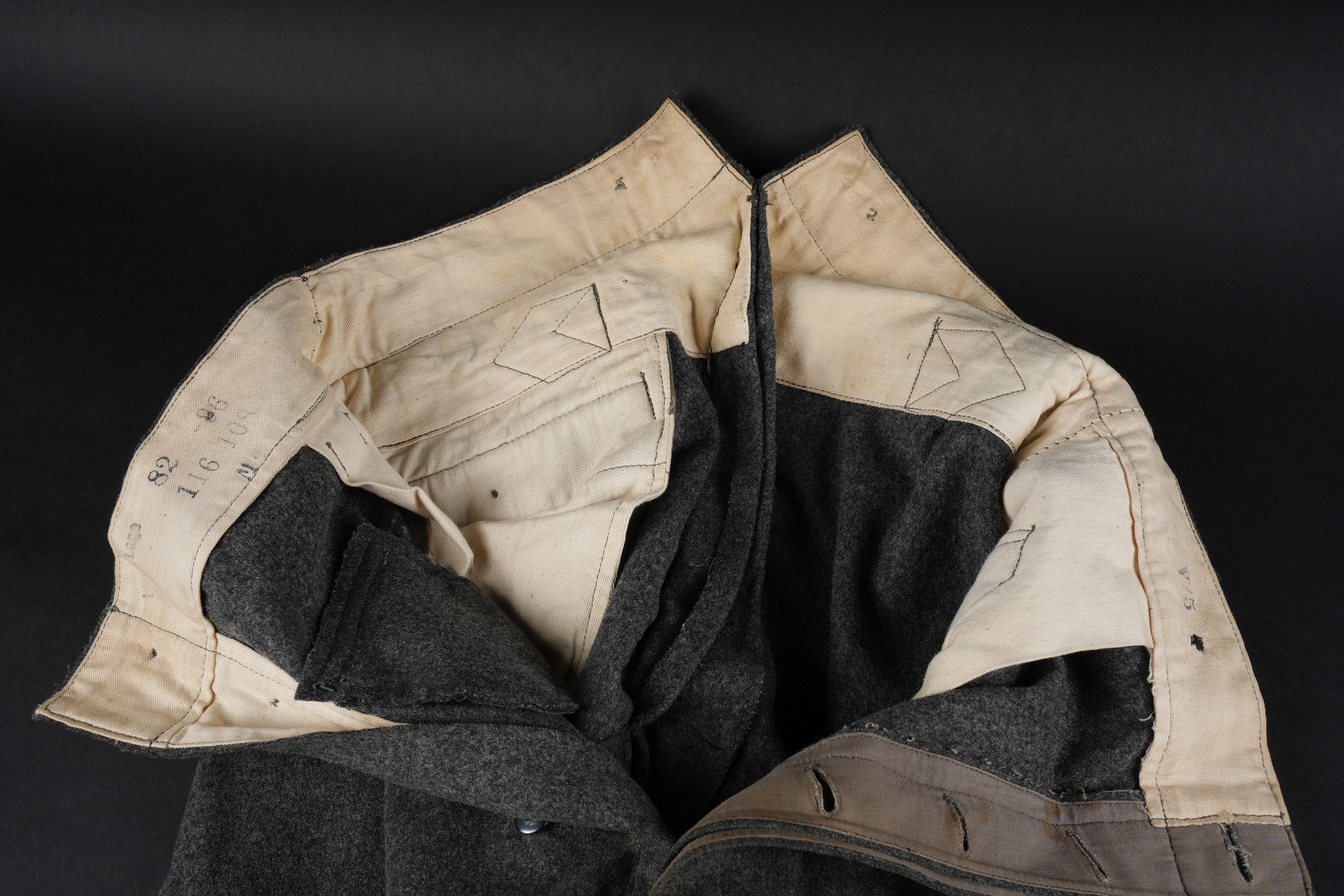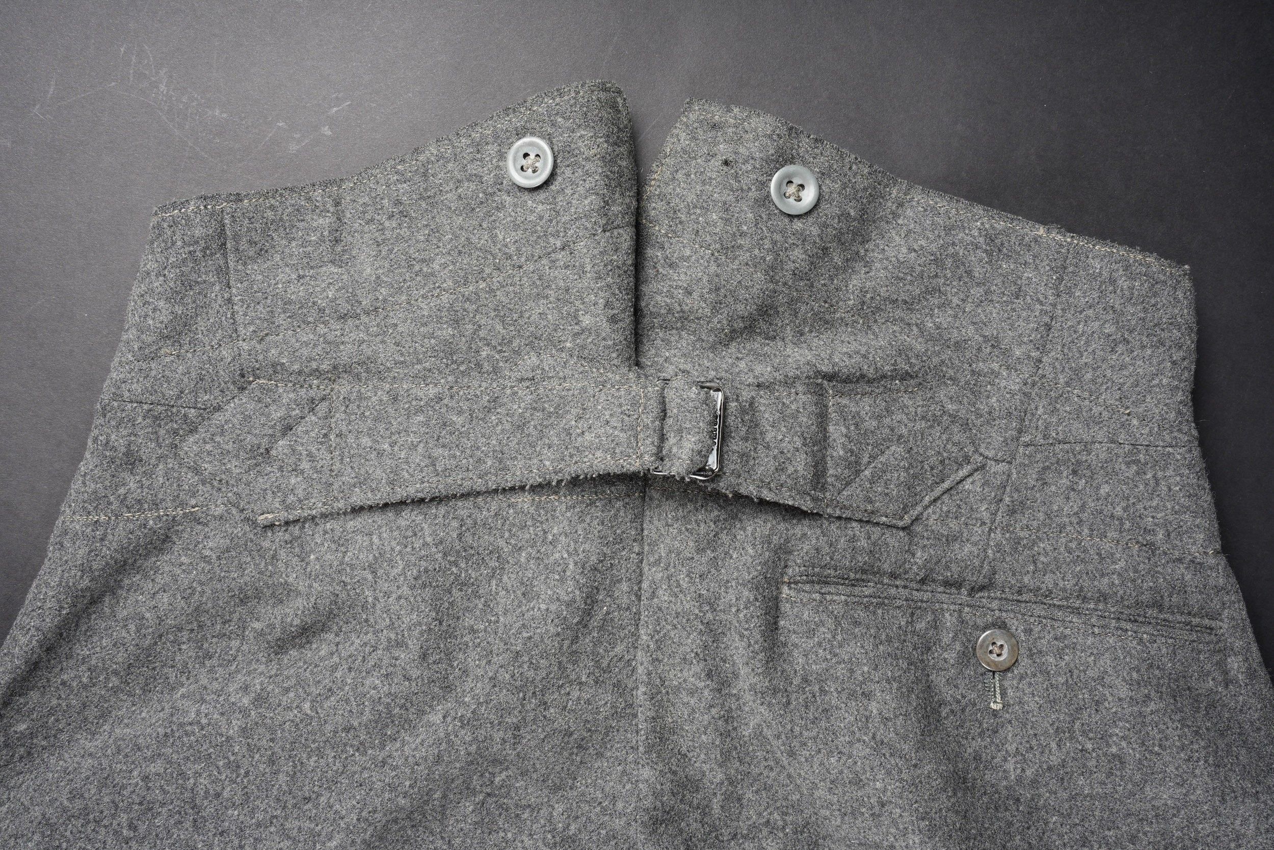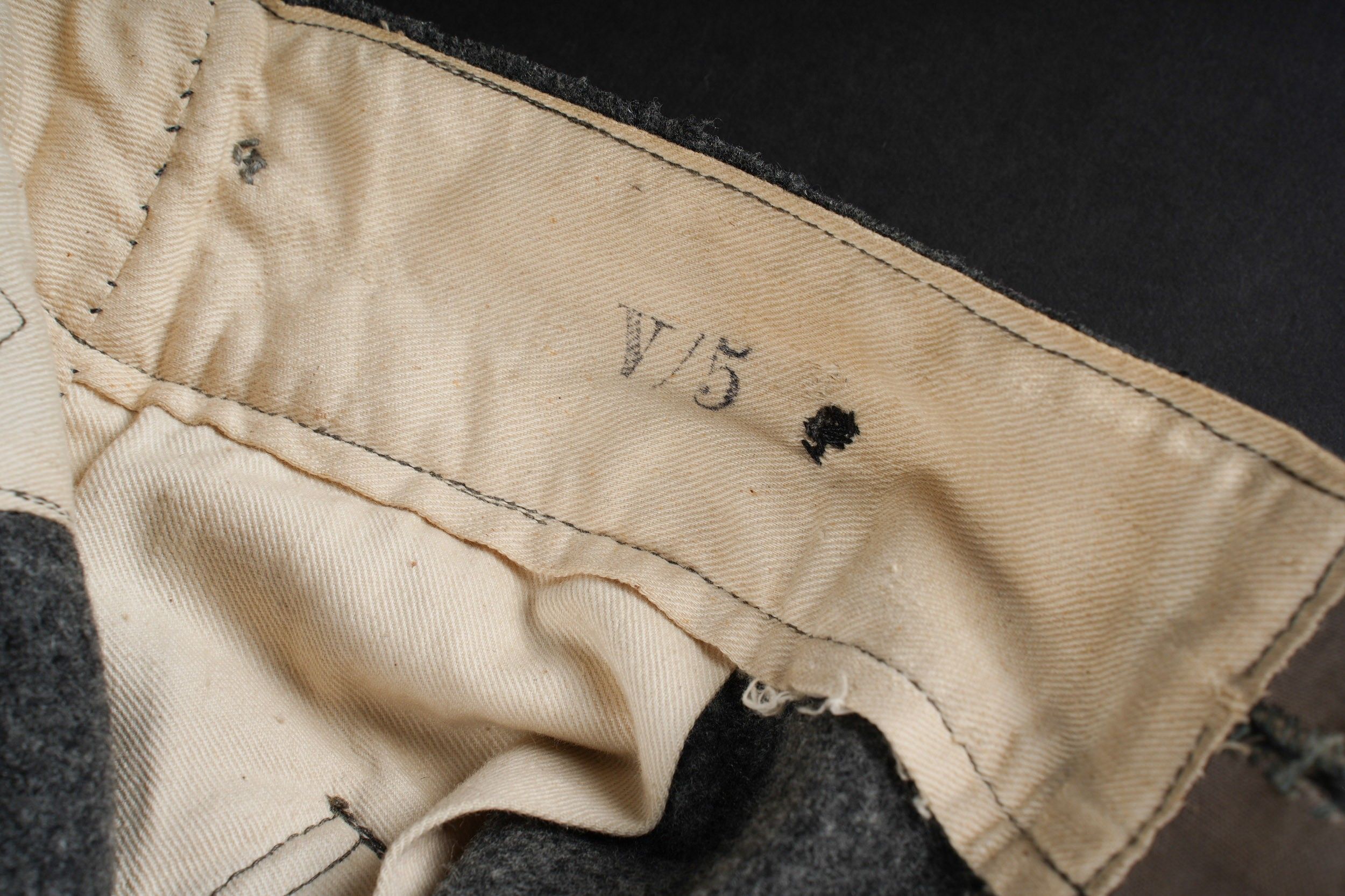 Saddle trousers. Thick stone grey cloth. All buttons are present. Leather reinforcement at the crotch. The bottom of the legs closes with a functional zip, the zips are missing. White cotton lining. Lago markings 82 96 116 108 M. The date is illegible. To the left are the V5 markings. Some wear and patina, as well as a few moth holes. Condition I-. Riding breeches in thick stone-grey cloth. All buttons present. Leather reinforcement at the crotch. Lower legs closed by functional zippers with missing pull tabs. White cotton lining with markings Lago 82 96 116 108 M. Date illegible. Marked V5 on the left. Some wear and patina on the piece with a few discreet moth holes. Condition I-