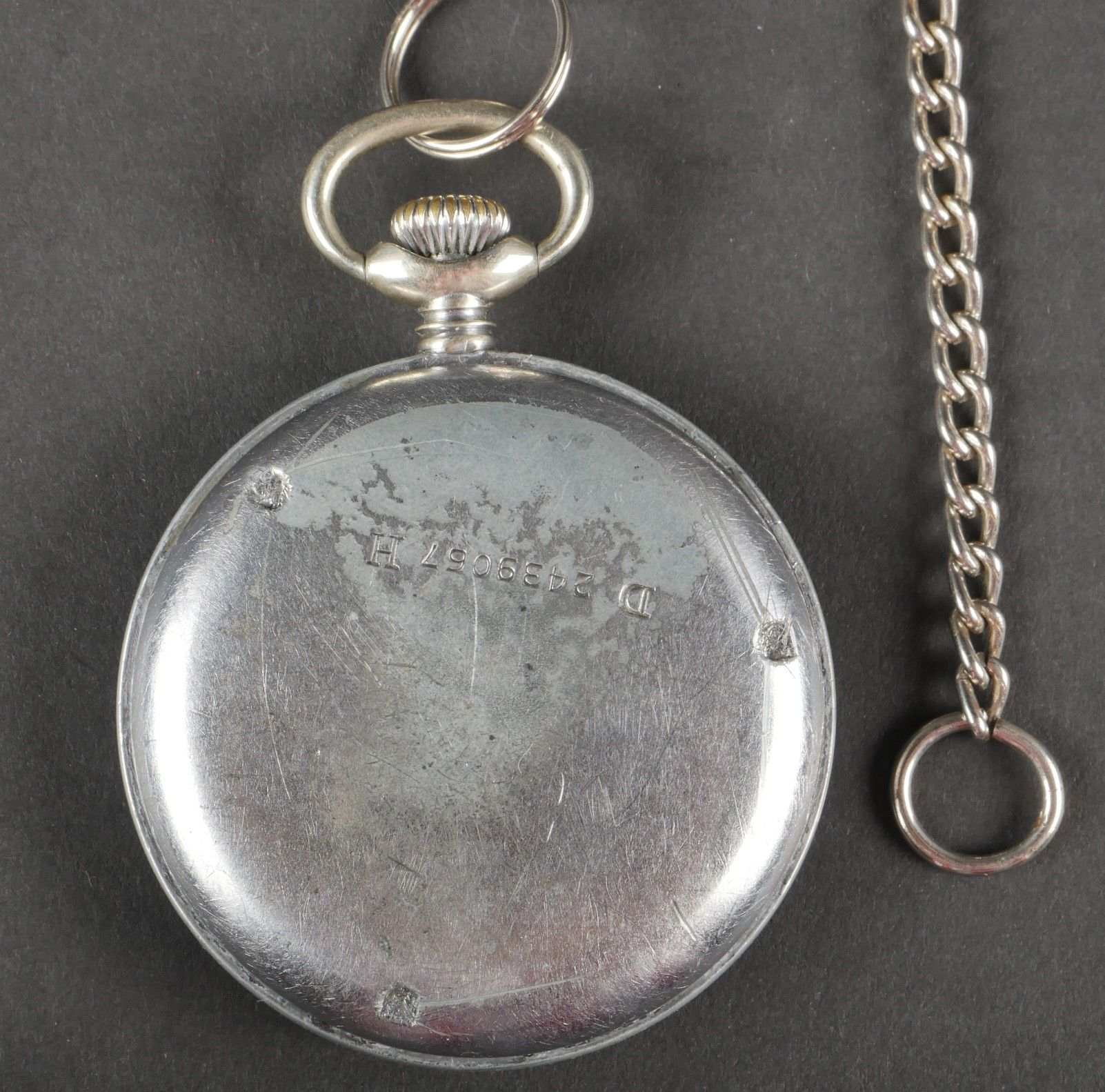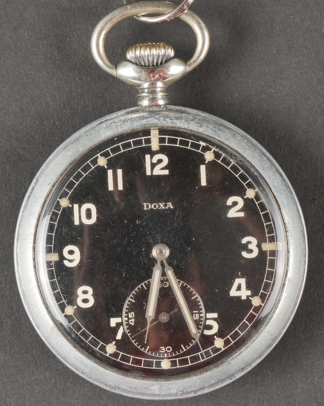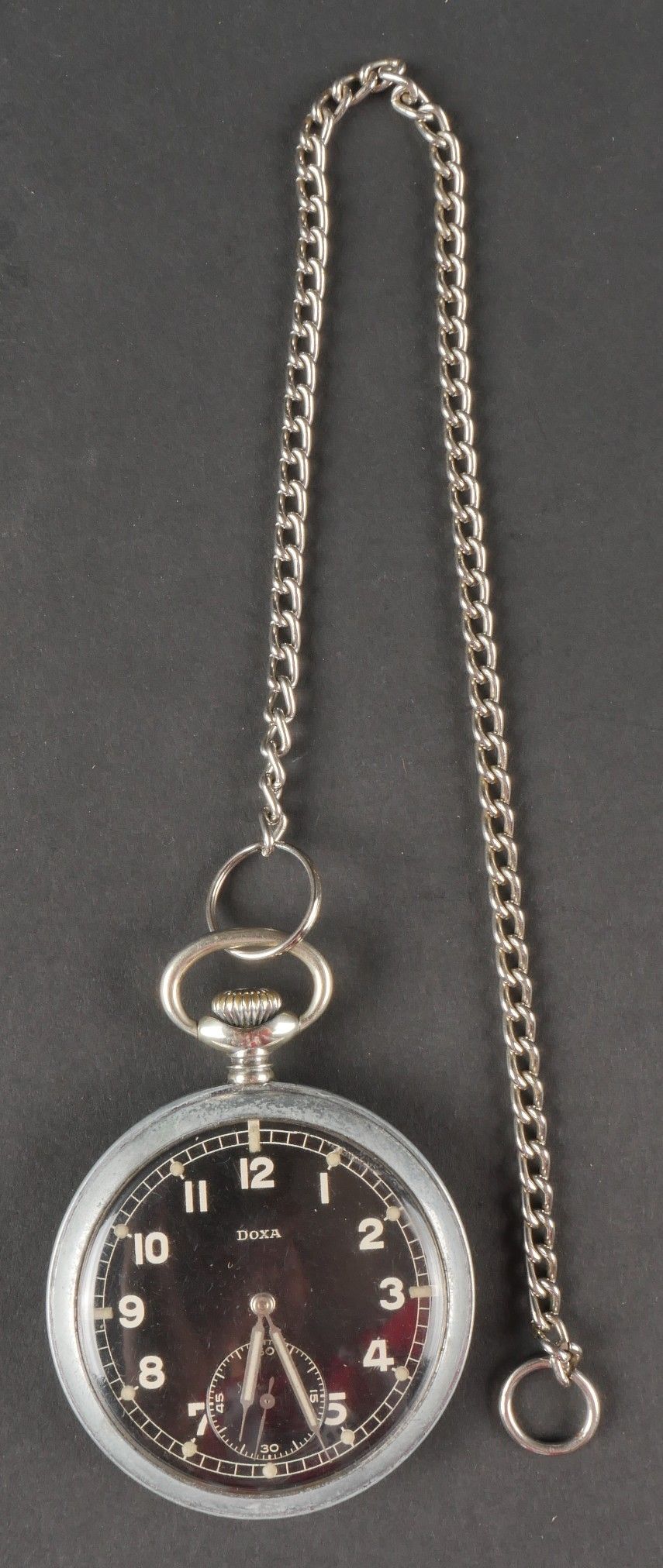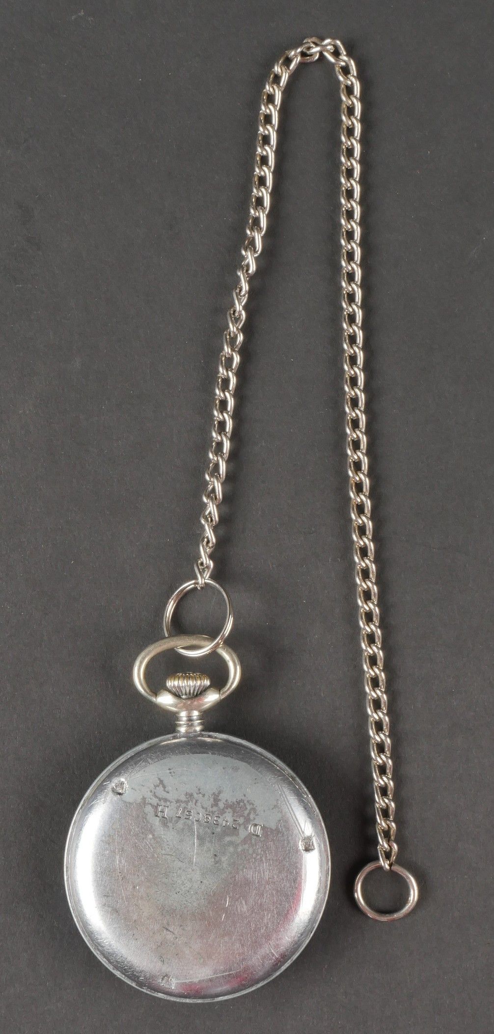 German watch. In silver-coloured metal. Full black dial. Glass in very good condition. Functional. Posterior chain. Markings D 2439067 H. The mechanism is not visible, as we do not have the necessary tools to open the case. Made by DOXA. Some wear and patina. Condition II+. German watch in silver-colored metal with complete black dial. Glass in very good condition. Functional. Rear chain attached. Marked D 2439067 H. Mechanism not inspected due to sealed case. Made by DOXA. Some wear and patina on the piece. Condition II+