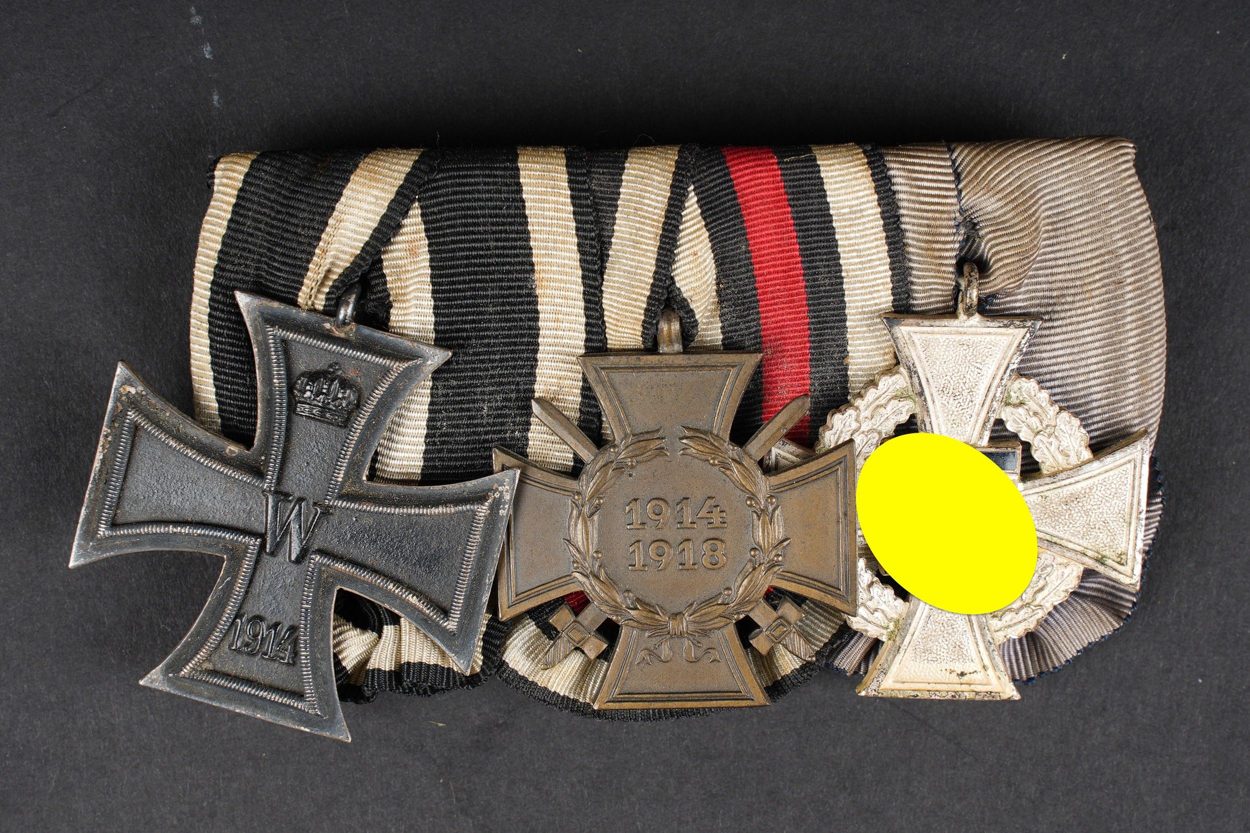 Decorative barrette. Model with hanging decorations. Comprising a 1914-1918 medal, made by RV Pforzheim 43. A Für Treue Dienst medal, heavily worn and sun-faded. An iron cross second class. Back lined with green cloth. Complete fastening. Some wear and patina to be noted. Condition II+. Decoration bar with suspended medals including a 1914-1918 medal by RV Pforzheim 43, a Für Treue Dienst medal heavily faded from sunlight, and an Iron Cross 2nd Class. Reverse backed with green cloth and complete pin. Some wear and patina on the piece. Condition II+